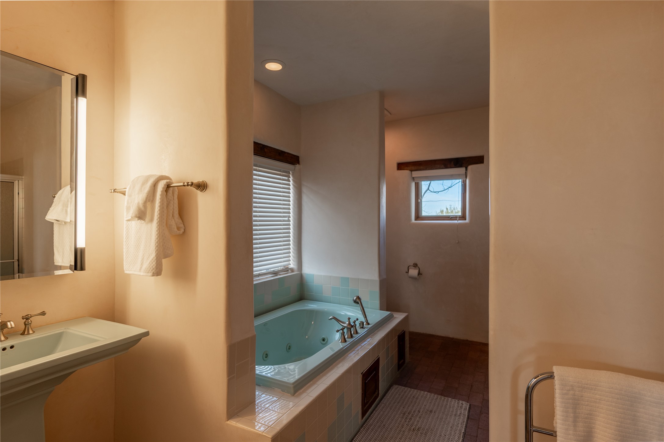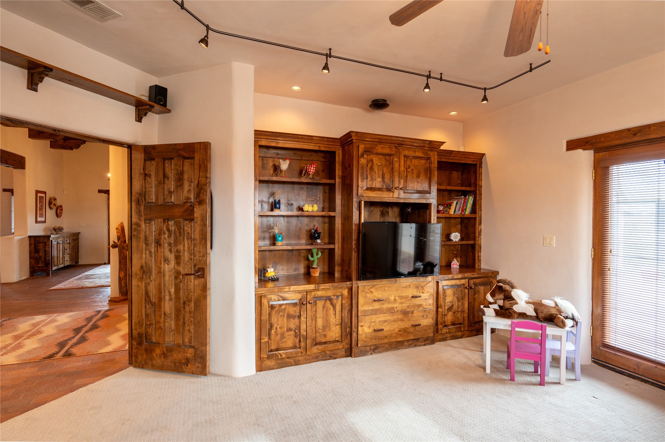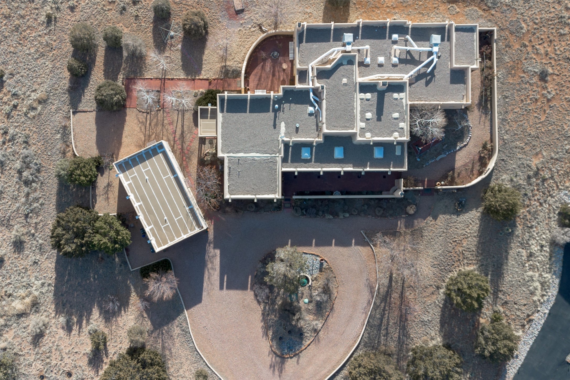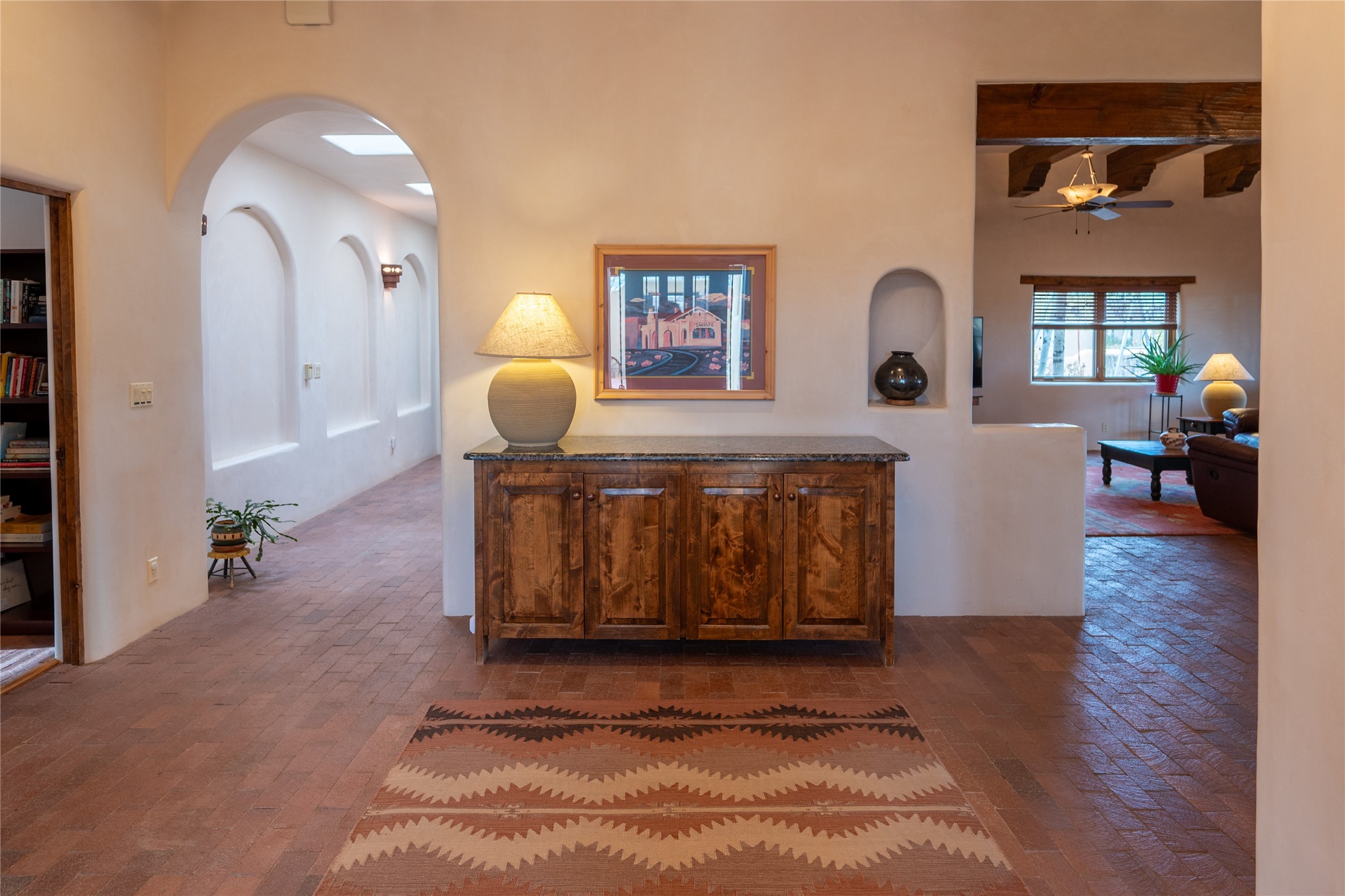 Near and Far. Within 10 minutes of shopping, airport, hospital, dining and more, but the rural environment feels far from town. An authentic adobe in a gated neighborhood, the 3814 square feet includes 595 square foot 1 bedroom guest apartment or amazing studio for artists and crafts people. A favorite feature is the master bedroom's 2 separated full baths each with their own walk in closets. The high beamed ceilings are simply elegant, as are the plaster walls, lovely wood finishes, and exquisit lit art coves . Bonuses include a den, an office, 5 fireplaces, a well appointed large kitchen, a 3 car garage plus workshop, mountain views, and privacy. The deep covered patio (portal) is perfect for all weather entertaining and relaxation. A easy commute to Los Alamos or Albuquerque. This is a must see home.