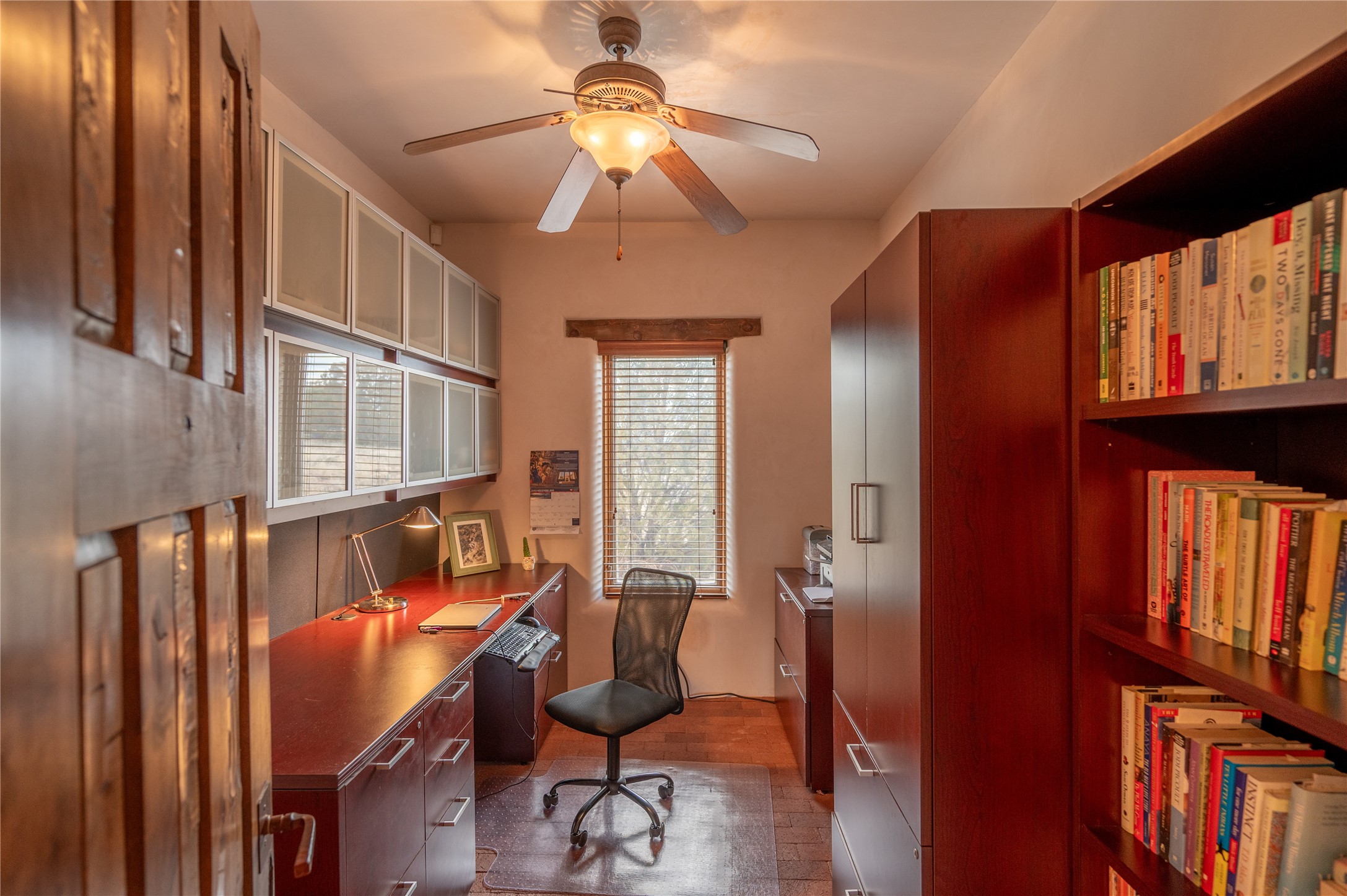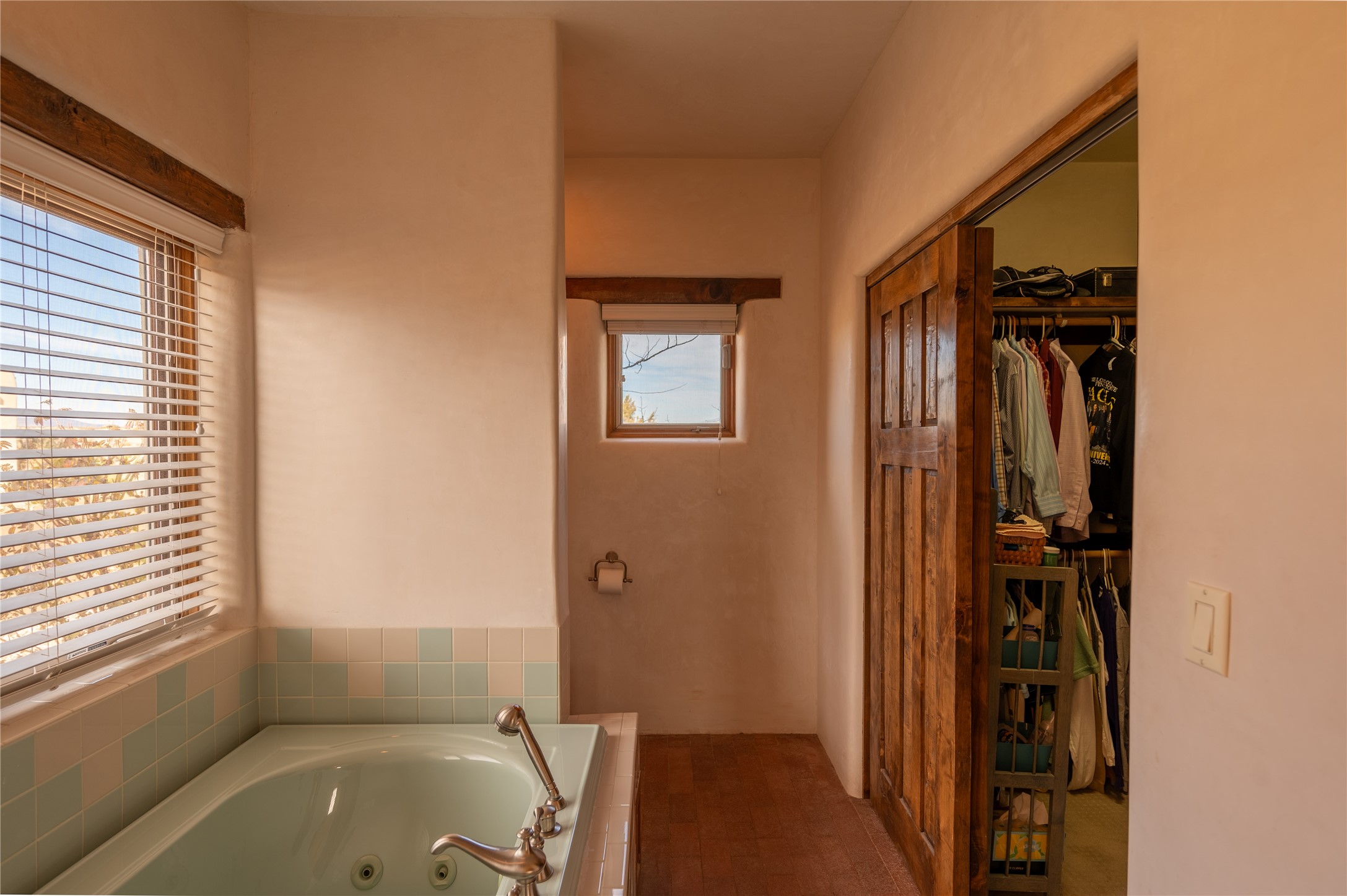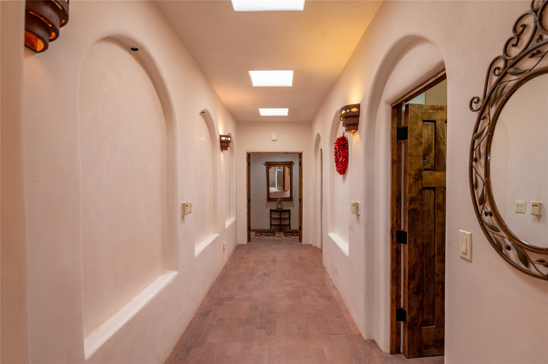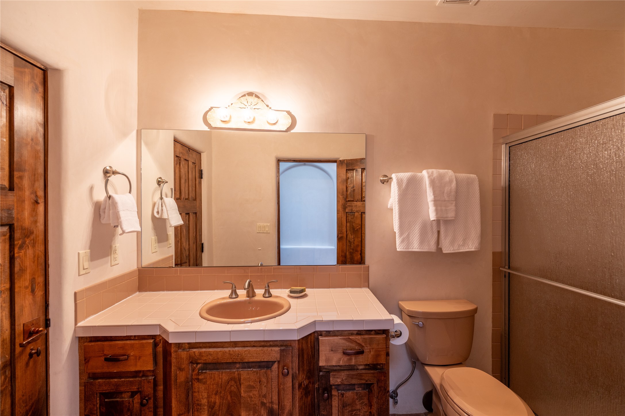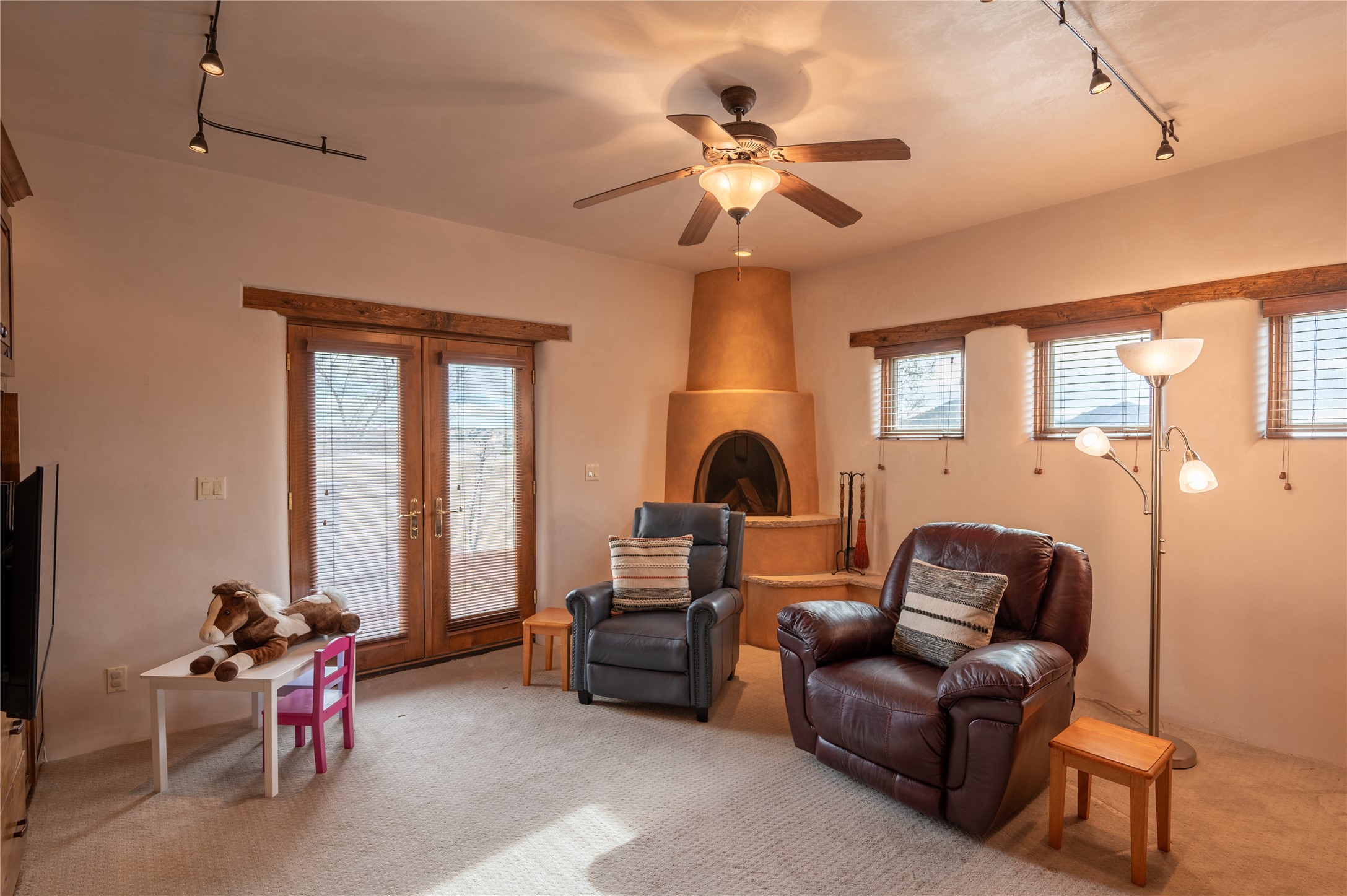 Near and Far. Within 10 minutes of shopping, airport, hospital, dining and more, but the rural environment feels far from town. An authentic adobe in a gated neighborhood, the 3814 square feet includes 595 square foot 1 bedroom guest apartment or amazing studio for artists and crafts people. A favorite feature is the master bedroom's 2 separated full baths each with their own walk in closets. The high beamed ceilings are simply elegant, as are the plaster walls, lovely wood finishes, and exquisit lit art coves . Bonuses include a den, an office, 5 fireplaces, a well appointed large kitchen, a 3 car garage plus workshop, mountain views, and privacy. The deep covered patio (portal) is perfect for all weather entertaining and relaxation. A easy commute to Los Alamos or Albuquerque. This is a must see home.