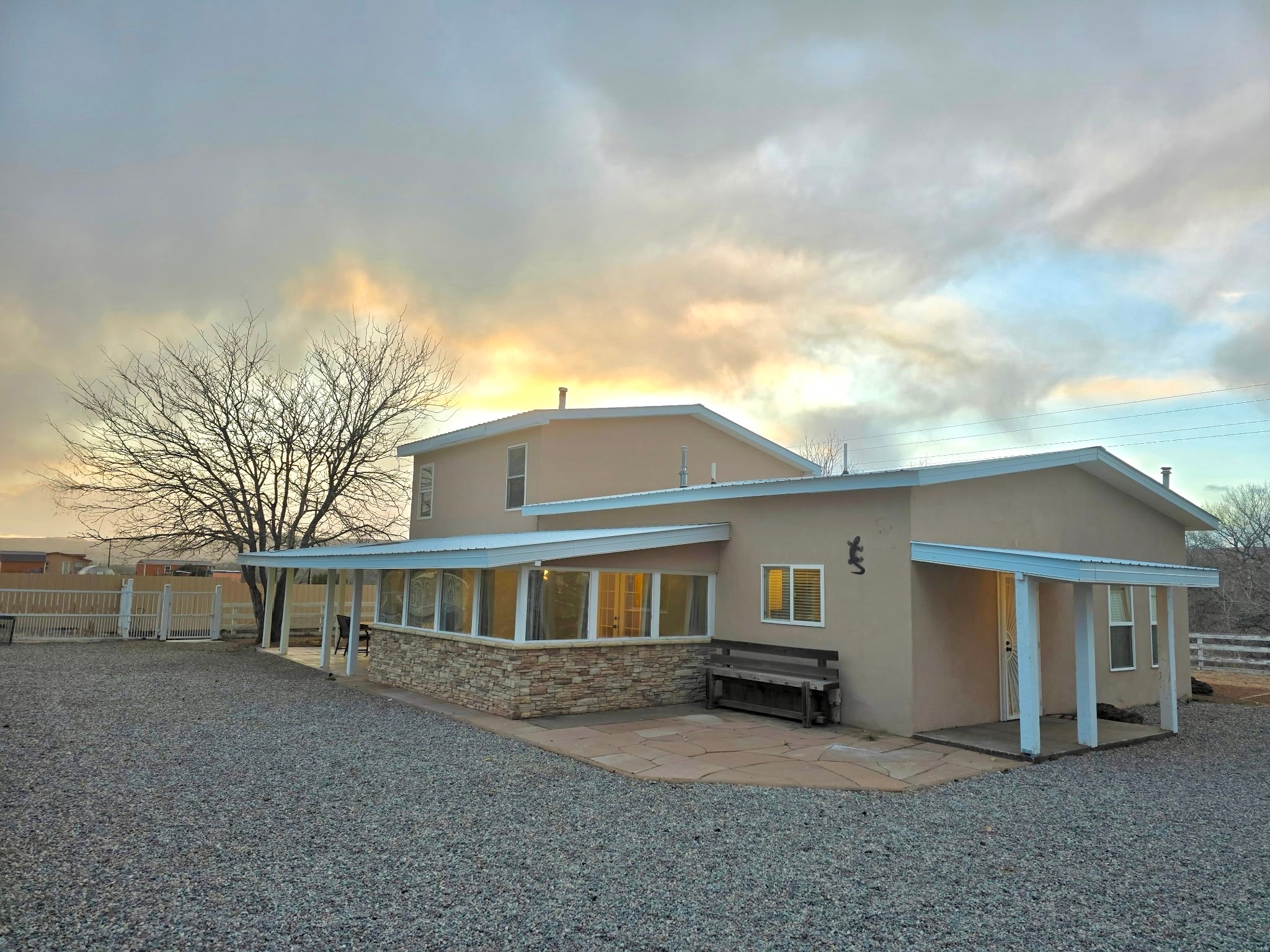 Motivated Seller! Tucked away at the peaceful southside of La Mesilla, this beautifully positioned property borders the tranquil Santa Clara tribes Bosque. The home features a spacious 3-bedroom, 2-bathroom design set on a full acre of land, complete with a barn with individual side access. The barn, situated at the edge of the bosque, features two horse stalls, divided pens, and three designated storage areas.The upstairs primary bedroom includes an ensuite bathroom and a private porch, perfectly placed to capture breathtaking views of Black Mesa and the surrounding bosque. The open living area is highlighted by a high-pitched ceiling, creating an inviting and airy space ideal for gatherings or quiet relaxation. For those seeking a private retreat in a serene setting bordered by mature trees, this property is a rare find you have been needing.