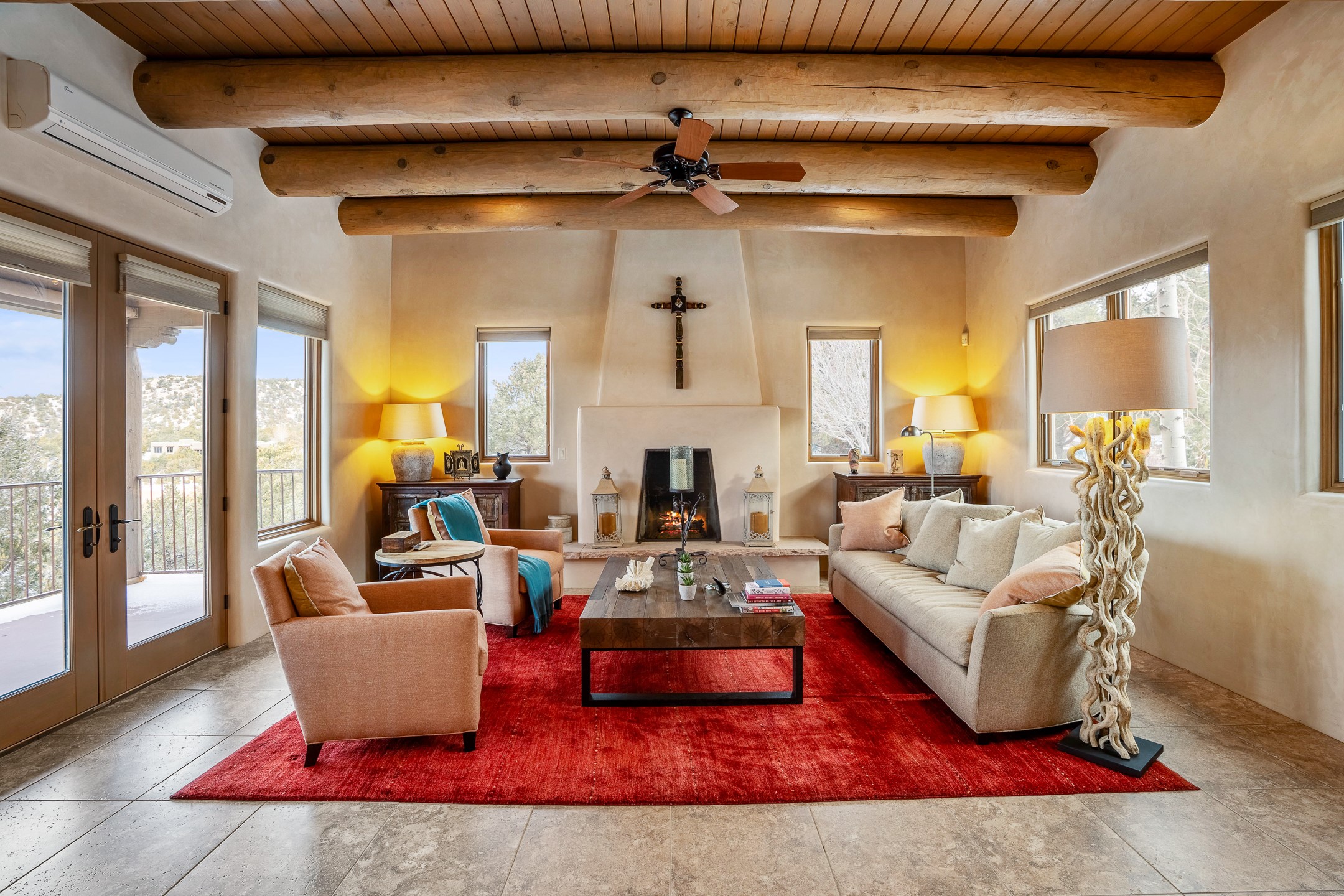 Discover Timeless Santa Fe Elegance at 2020 Senda De AndresNestled within the coveted Cerros Colorados community, this exquisite home perfectly blends traditional Santa Fe charm with modern luxury, offering breathtaking alpine views and a peaceful retreat. Designed for effortless mainly one-level living, this 3-bedroom, 3-bathroom residence embodies sophistication and comfort. The main level welcomes you with a light-filled living room featuring a grand kiva fireplace, authentic vigas and tongue-and-groove ceilings, and hand-troweled plaster walls that radiate warmth and character. The gourmet kitchen is a chef's dream, equipped with top-of-the-line Wolf and Sub-Zero appliances, a wine refrigerator, and custom cabinetry. It flows seamlessly into the dining and den areas, creating an ideal space for entertaining. The primary suite is a luxurious haven, offering a jetted corner tub, walk-in shower, dual closets, and its own kiva fireplace for ultimate relaxation. Step outside onto the expansive rear deck to soak in the panoramic mountain views, perfect for quiet mornings or evening gatherings. The lower level boasts two generously sized guest bedrooms and a full bathroom, ensuring comfort and privacy for family and guests. Refined details, such as porcelain tile flooring throughout, enhance the home's timeless elegance. New roof and stucco in 2024, new boiler and water heater added in 2025. Ideally located just minutes from Santa Fe's vibrant cultural attractions and outdoor adventures, this home is also perfectly positioned right down the hill from Ski Santa Fe, making it a dream for winter sports enthusiasts. 2020 Senda De Andres offers a lifestyle of tranquility, beauty, and sophistication. This exceptional property is more than a home--it's an experience. Schedule your showing today.