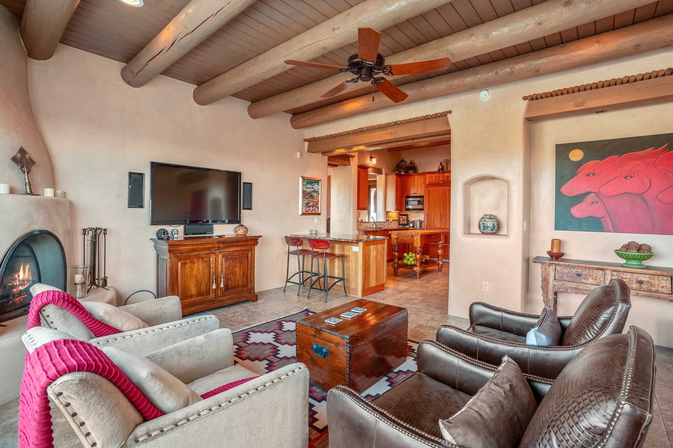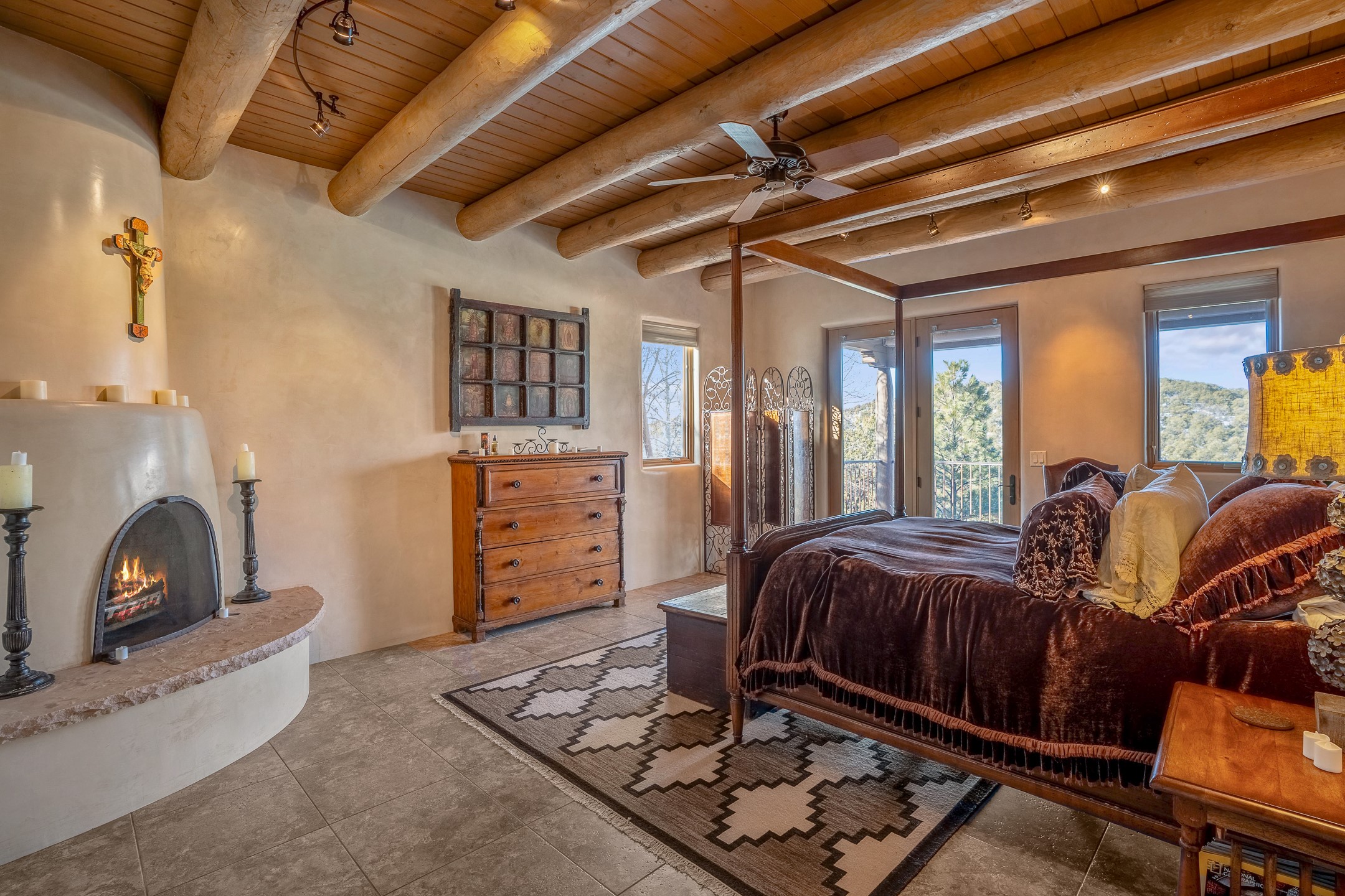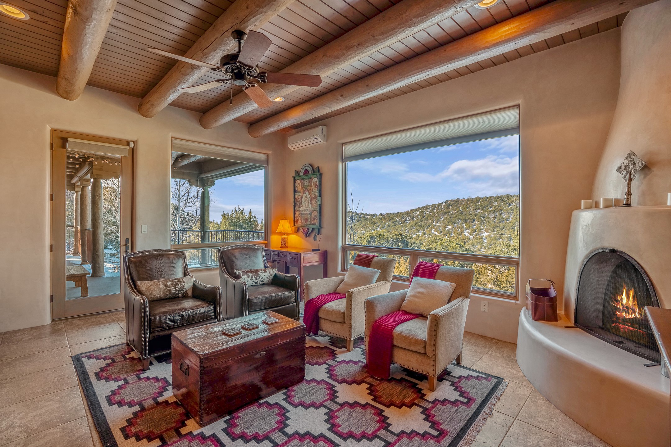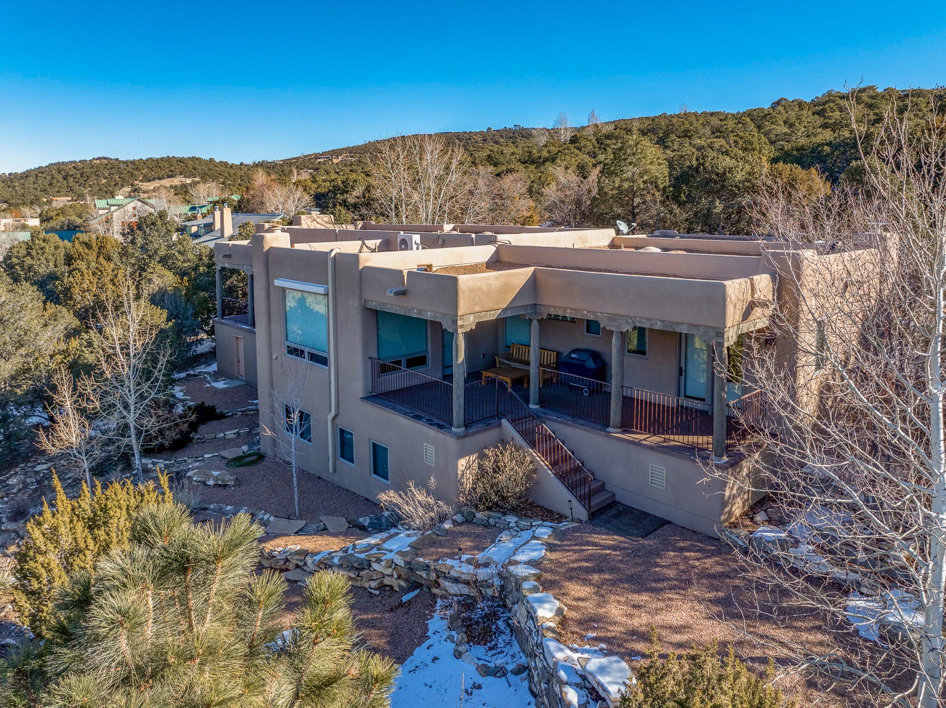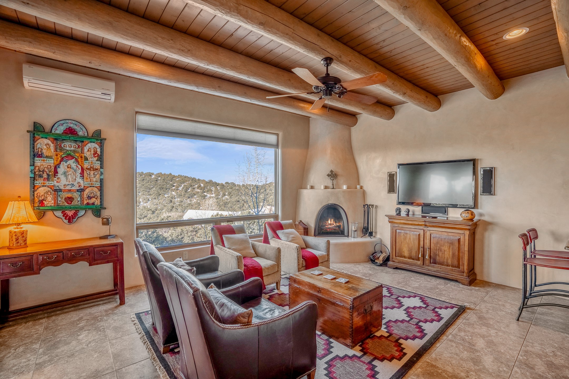 Discover Timeless Santa Fe Elegance at 2020 Senda De AndresNestled within the coveted Cerros Colorados community, this exquisite home perfectly blends traditional Santa Fe charm with modern luxury, offering breathtaking alpine views and a peaceful retreat. Designed for effortless mainly one-level living, this 3-bedroom, 3-bathroom residence embodies sophistication and comfort. The main level welcomes you with a light-filled living room featuring a grand kiva fireplace, authentic vigas and tongue-and-groove ceilings, and hand-troweled plaster walls that radiate warmth and character. The gourmet kitchen is a chef's dream, equipped with top-of-the-line Wolf and Sub-Zero appliances, a wine refrigerator, and custom cabinetry. It flows seamlessly into the dining and den areas, creating an ideal space for entertaining. The primary suite is a luxurious haven, offering a jetted corner tub, walk-in shower, dual closets, and its own kiva fireplace for ultimate relaxation. Step outside onto the expansive rear deck to soak in the panoramic mountain views, perfect for quiet mornings or evening gatherings. The lower level boasts two generously sized guest bedrooms and a full bathroom, ensuring comfort and privacy for family and guests. Refined details, such as porcelain tile flooring throughout, enhance the home's timeless elegance. New roof and stucco in 2024, new boiler and water heater added in 2025. Ideally located just minutes from Santa Fe's vibrant cultural attractions and outdoor adventures, this home is also perfectly positioned right down the hill from Ski Santa Fe, making it a dream for winter sports enthusiasts. 2020 Senda De Andres offers a lifestyle of tranquility, beauty, and sophistication. This exceptional property is more than a home--it's an experience. Schedule your showing today.