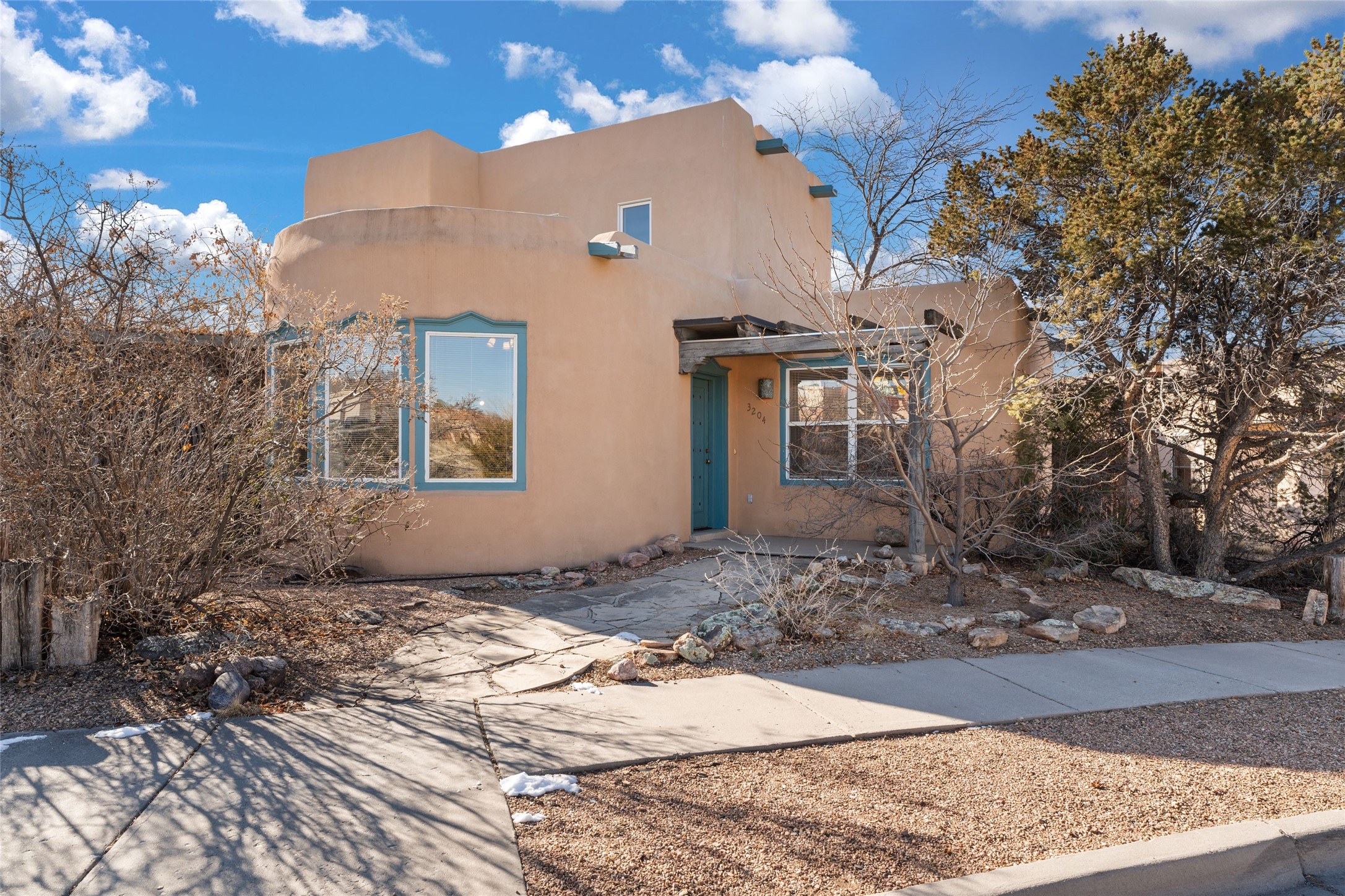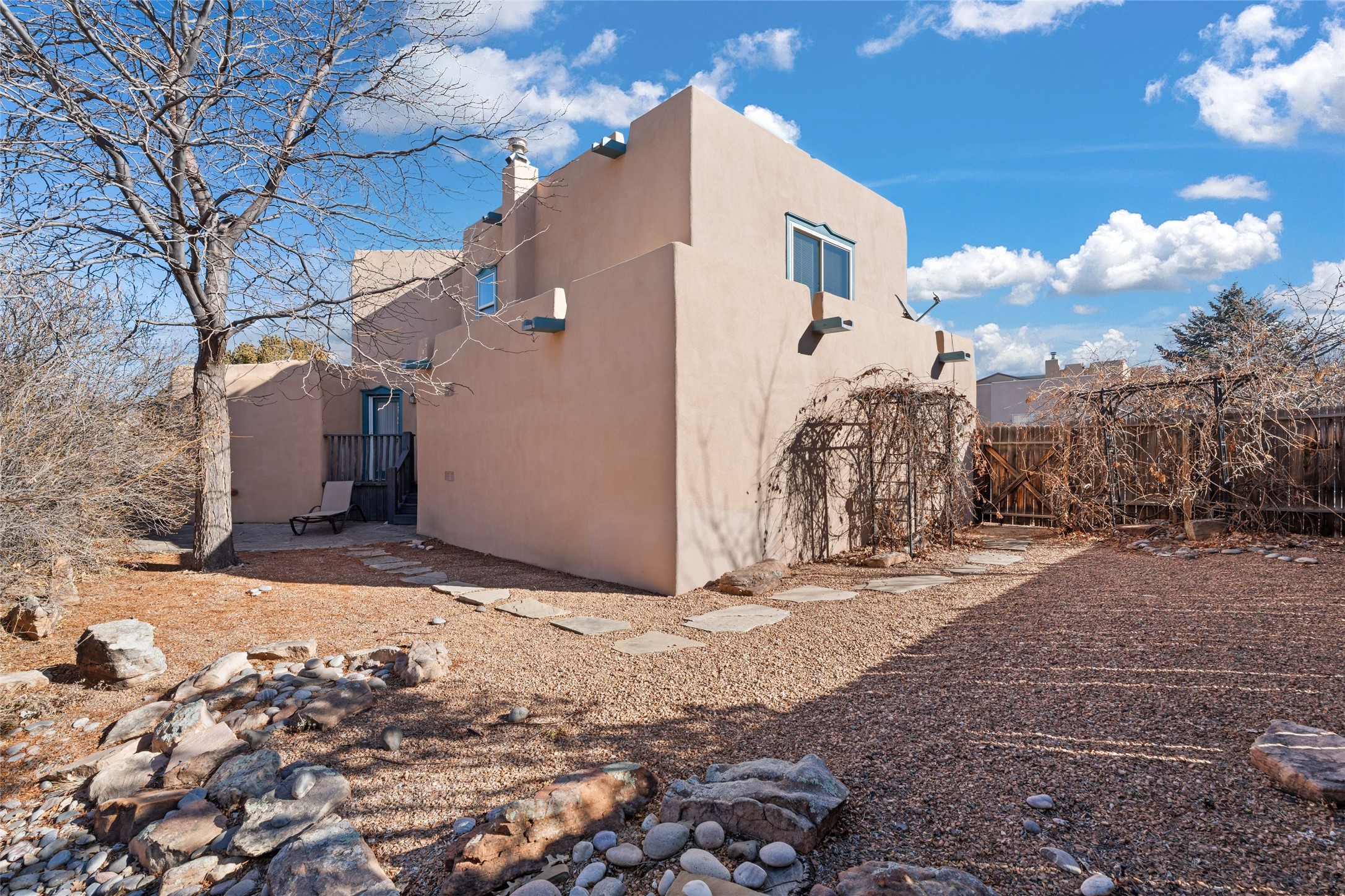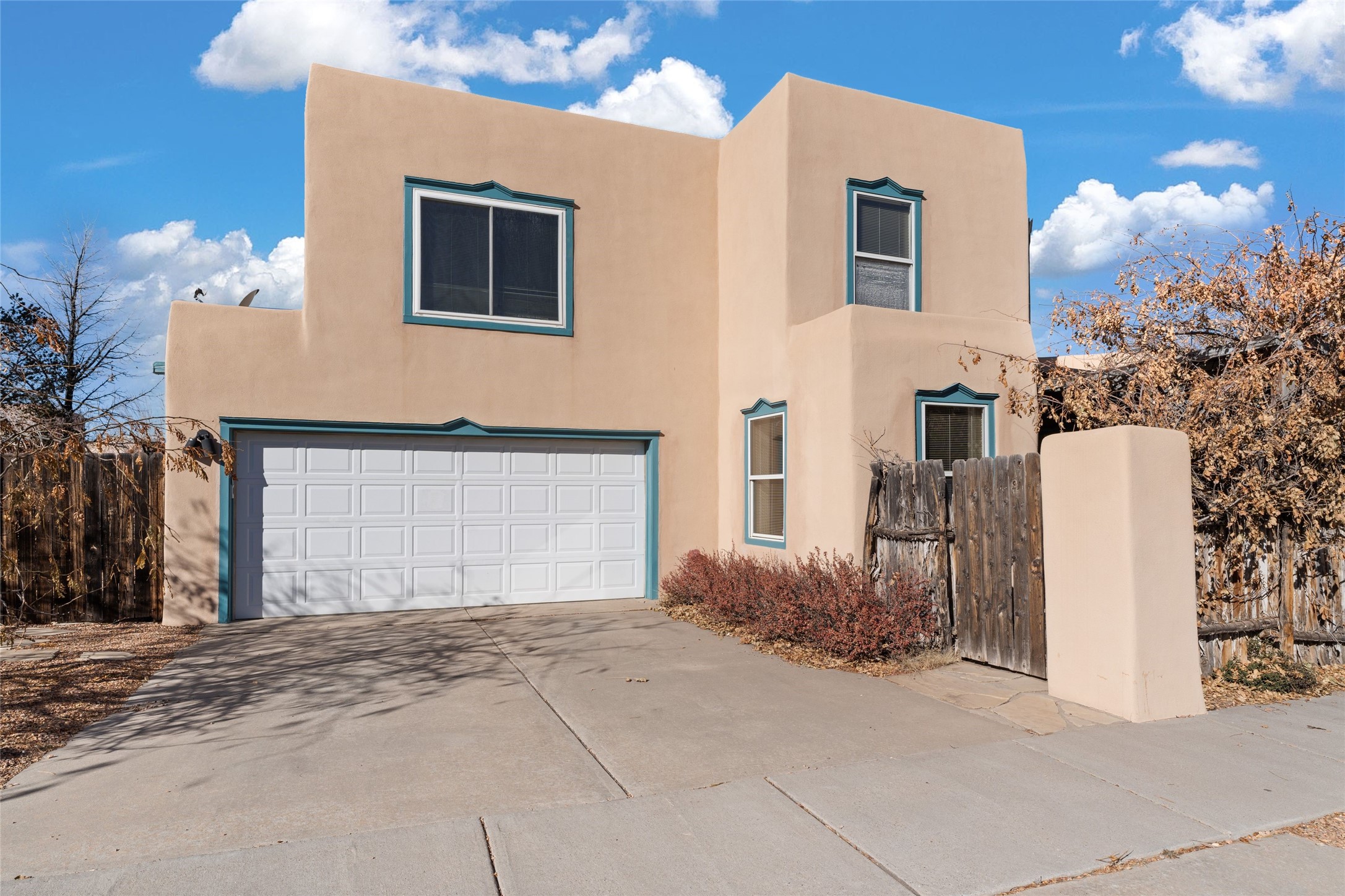 This meticulously maintained reflection of adobe and frame construction built by the revered 'Adobe Master' Hap Crawford in the quiet Pueblos Del Sol subdivision is centrally located close to shopping and expansive walking trails. This 1,810 +/- sq.ft., two-story home not only has has great separation of space, but an easy and livable floor plan with an oversized2-car garage for additional storage. The open-concept living room, dining room and kitchen have several large windows which bathe the space in warm light. A private pergola with trumpet vine and wisteria is accessible from the dining area for al fresco dining and entertaining. The large corner lot has a fenced back yard with additional privacy. The primary suite is located downstairs separated from two other bedrooms and a full bathroom upstairs with Sangre De Cristo mountain views. Lovely architectural details include a kiva, wood-burning fireplace and vigas in the living area, expressive tinwork on the kitchen cabinets, and detailed framework around the windows and doors. Tile, wood, and carpeted floors in the bedrooms make this warm and beautiful home an exceptional gem in the city of Santa Fe.