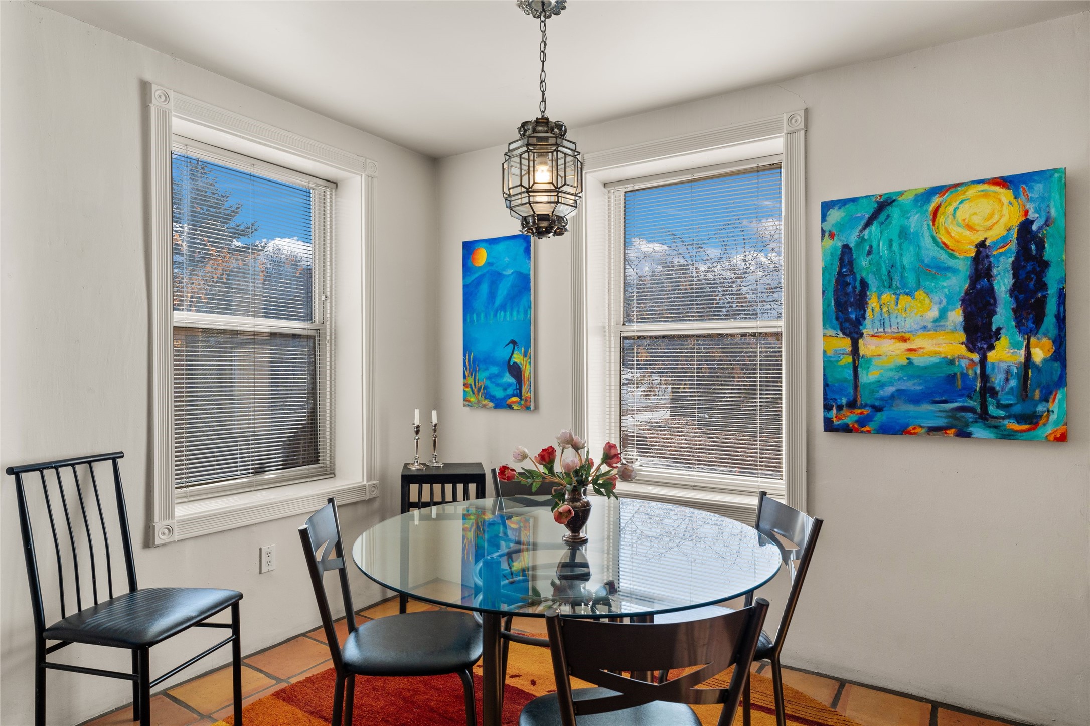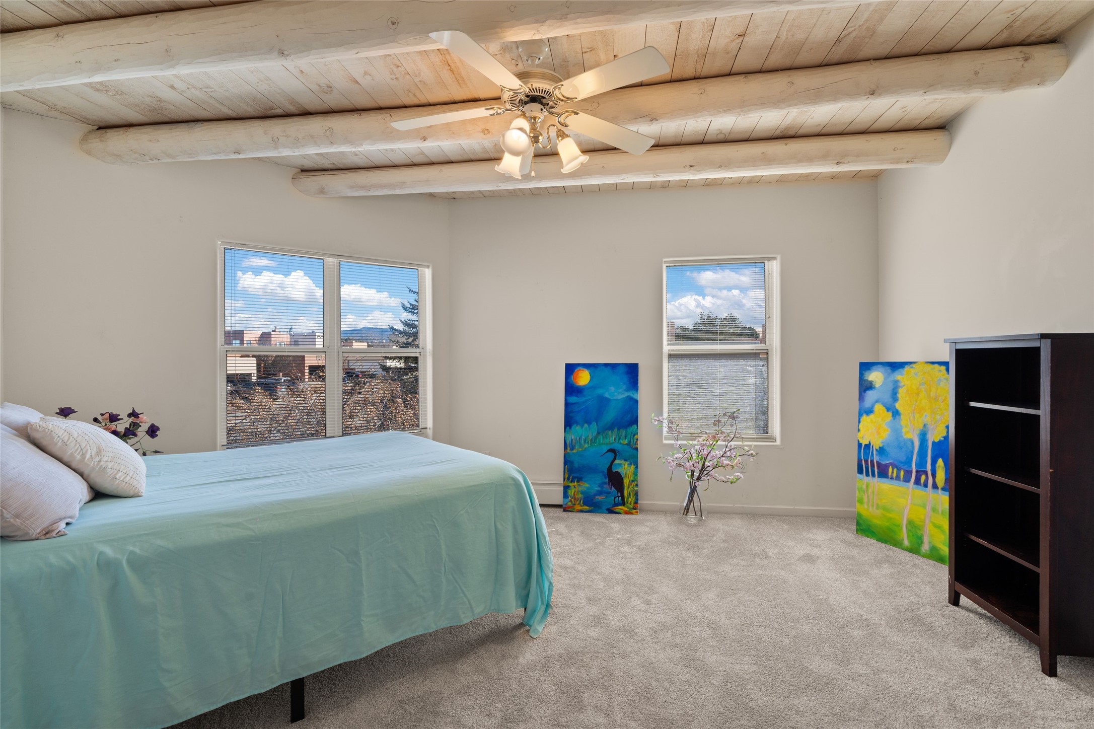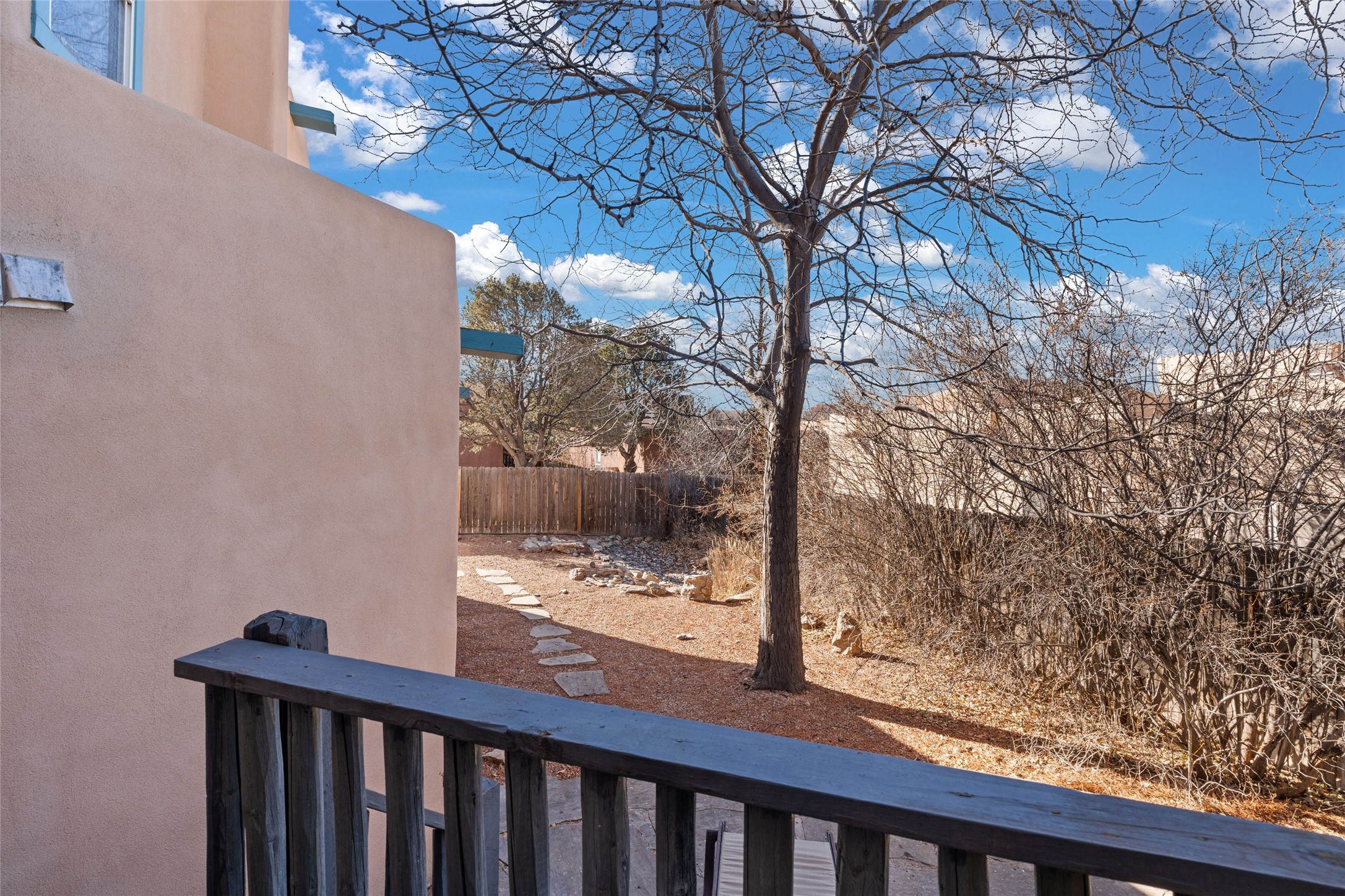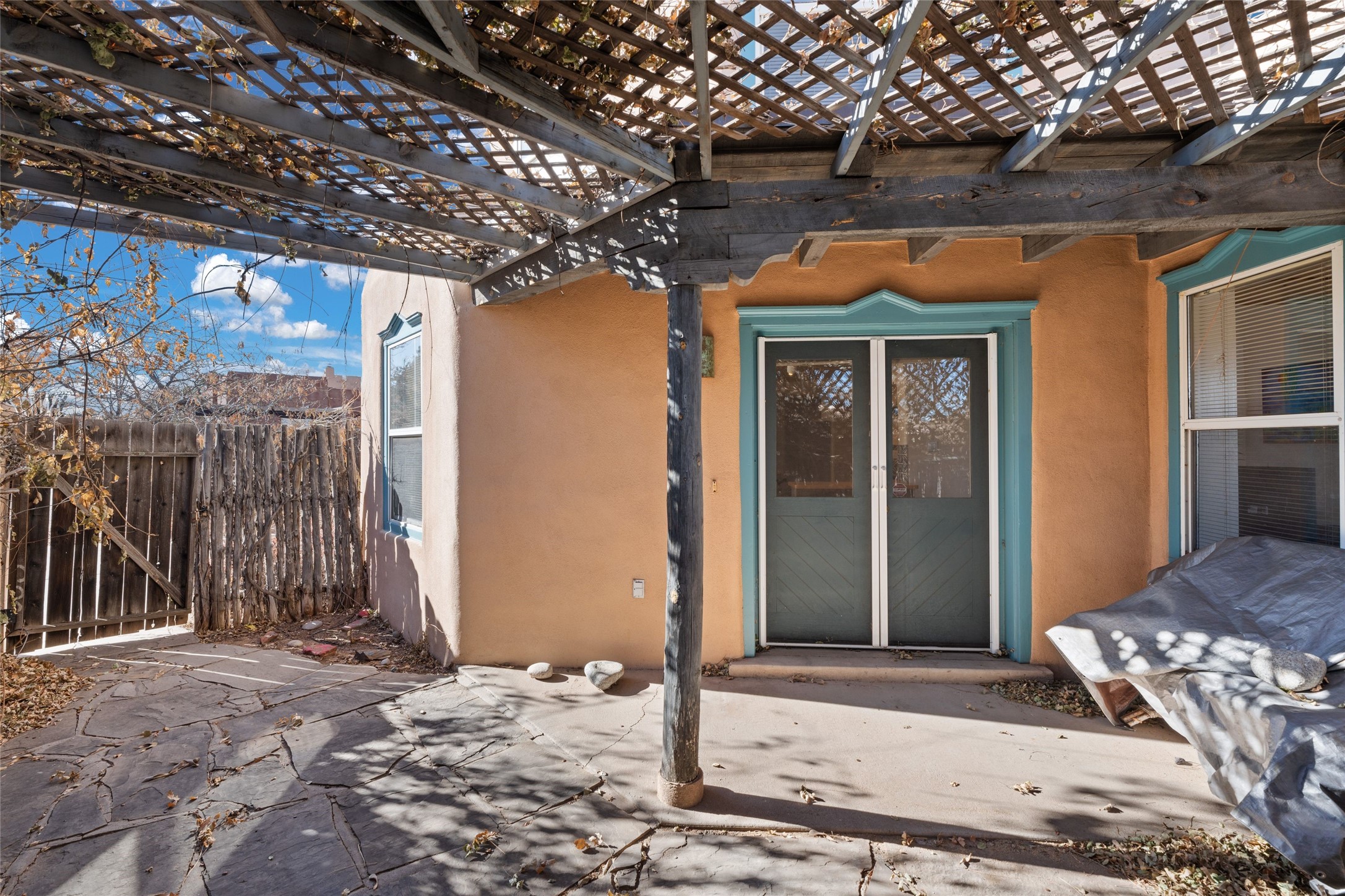 This meticulously maintained reflection of adobe and frame construction built by the revered 'Adobe Master' Hap Crawford in the quiet Pueblos Del Sol subdivision is centrally located close to shopping and expansive walking trails. This 1,810 +/- sq.ft., two-story home not only has has great separation of space, but an easy and livable floor plan with an oversized2-car garage for additional storage. The open-concept living room, dining room and kitchen have several large windows which bathe the space in warm light. A private pergola with trumpet vine and wisteria is accessible from the dining area for al fresco dining and entertaining. The large corner lot has a fenced back yard with additional privacy. The primary suite is located downstairs separated from two other bedrooms and a full bathroom upstairs with Sangre De Cristo mountain views. Lovely architectural details include a kiva, wood-burning fireplace and vigas in the living area, expressive tinwork on the kitchen cabinets, and detailed framework around the windows and doors. Tile, wood, and carpeted floors in the bedrooms make this warm and beautiful home an exceptional gem in the city of Santa Fe.