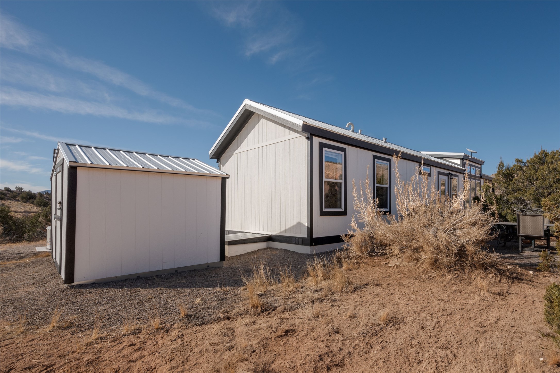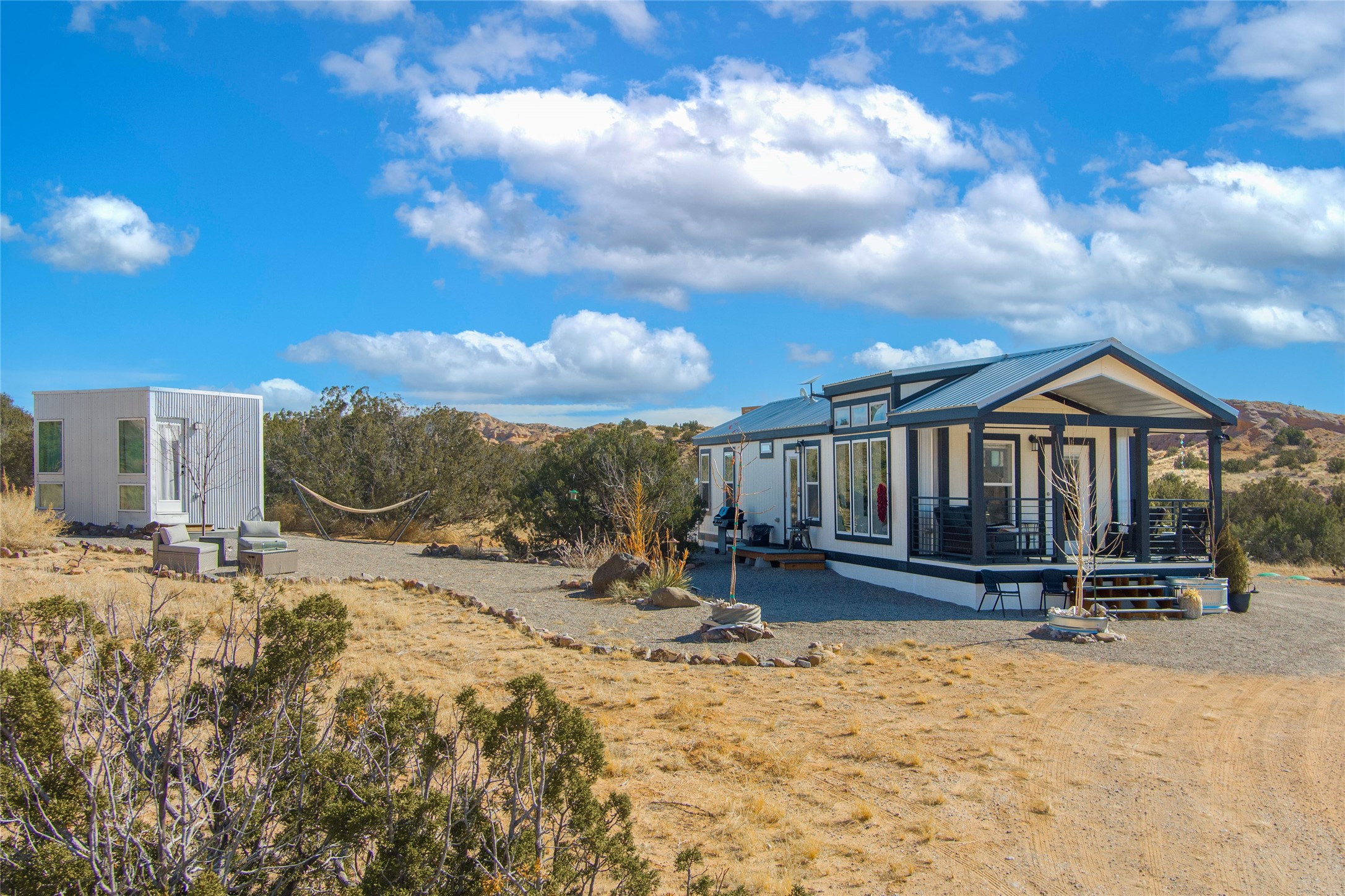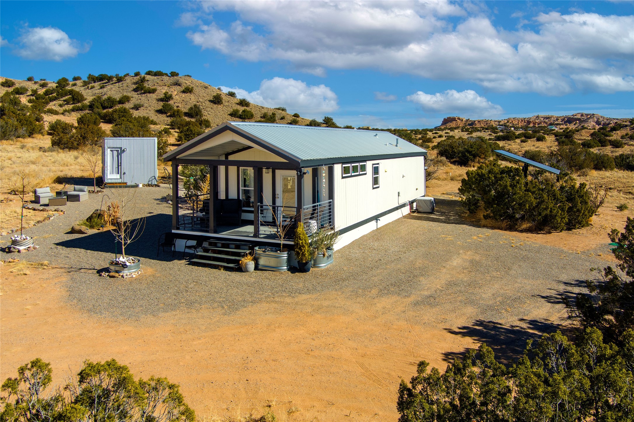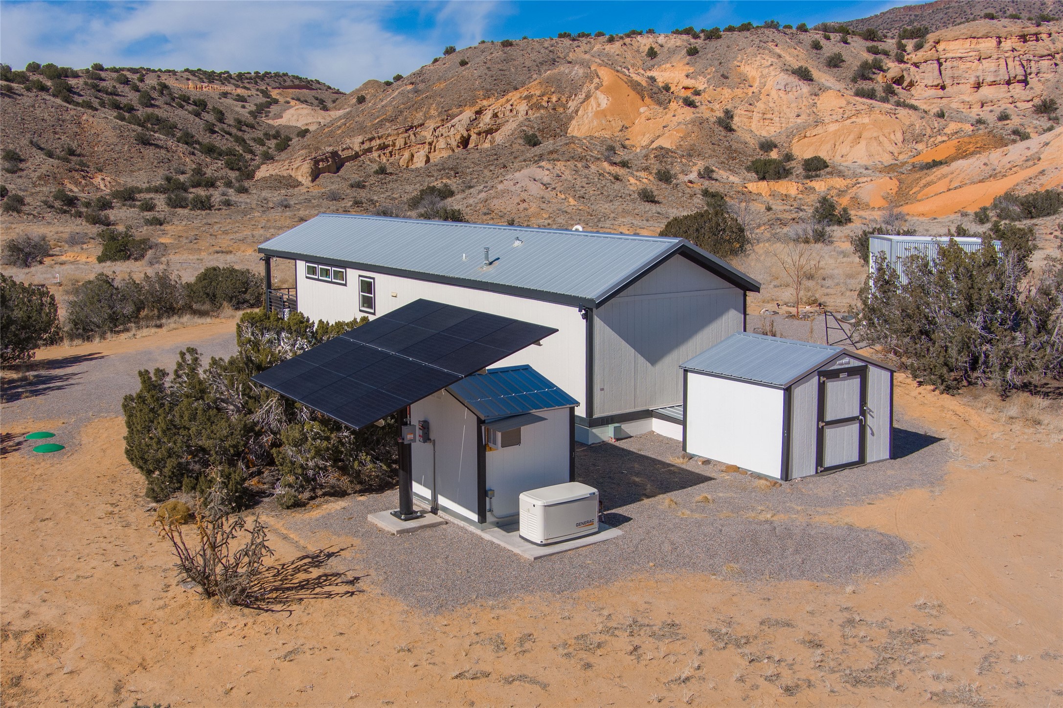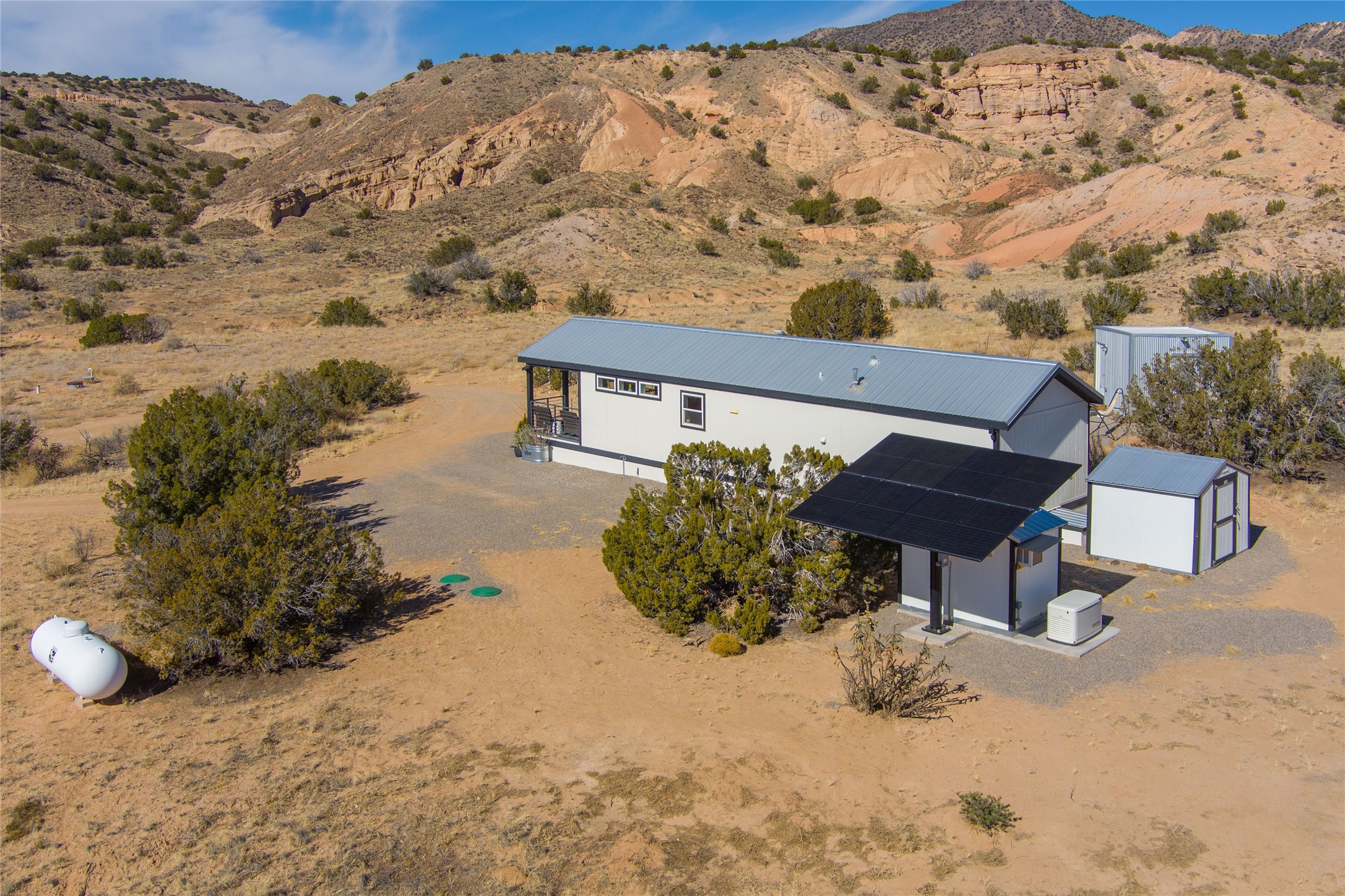 Tucked away at the end of a private, gated road, this turnkey, charming, and modern off-grid manufactured home offers the perfect blend of comfort and sustainability. Situated on over 10 pristine acres and nestled near the base of Sierra Negra, enjoy breathtaking views of red sandstone cliffs and the Jemez Mountains. This bright, light-filled home is newly built and placed on a permanent foundation in 2022. Enjoy high ceilings and a modern kitchen in this thoughtfully designed home with a pitched pro-panel roof and forced air heating and cooling for year-round comfort. The detached studio/guesthouse with a mini-split system provides the perfect space for guests, a home office, or creative pursuits.The property is fully equipped for off-grid living with owned solar panels, lithium batteries, a climate-controlled solar shed, and a Generac propane generator for peace of mind. A private well equipped with a 2500-gallon cistern ensures a reliable water source and a 500-gallon propane tank completes the picture. The generous TuffShed storage provides additional convenience, and the expansive acreage is perfect for horse enthusiasts with plenty of room to ride out.Enjoy a tranquil, sustainable lifestyle with easy access off NM 554 without compromising on modern comforts. Convenient to Abiquiu, Espanola, Los Alamos, and Santa Fe. Don't miss out on this unique property! Please schedule in ShowingTime and wait for confirmation.