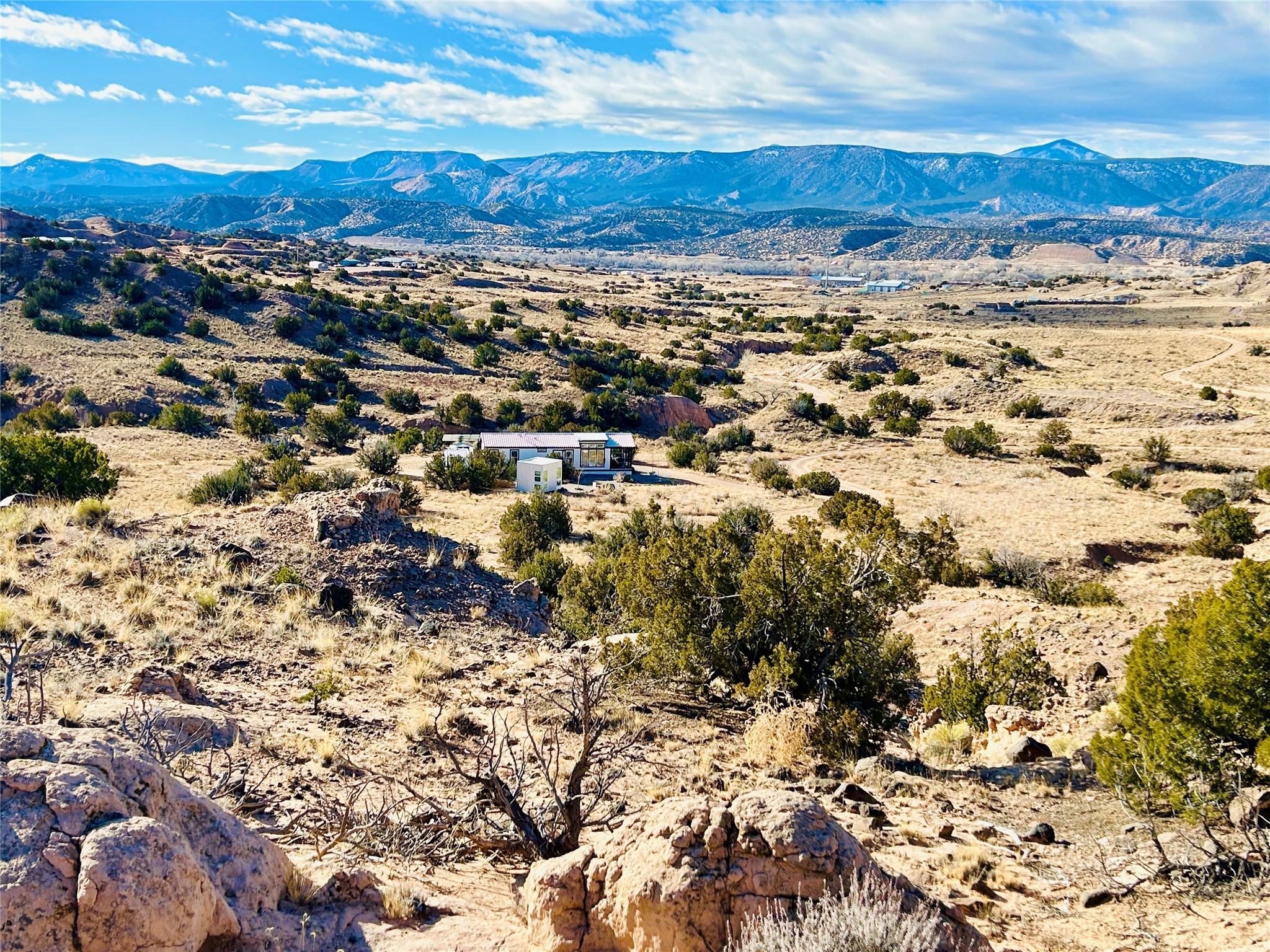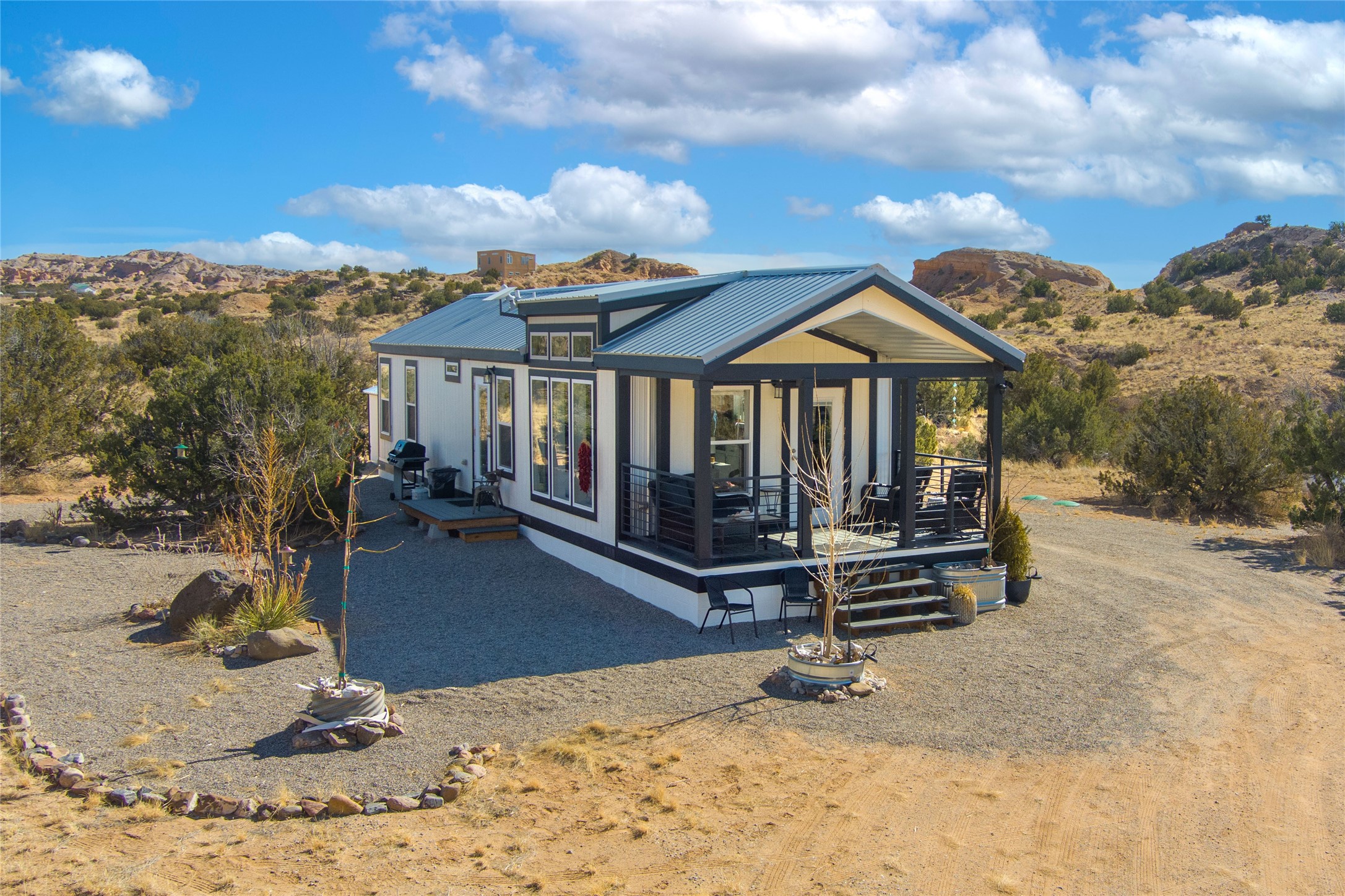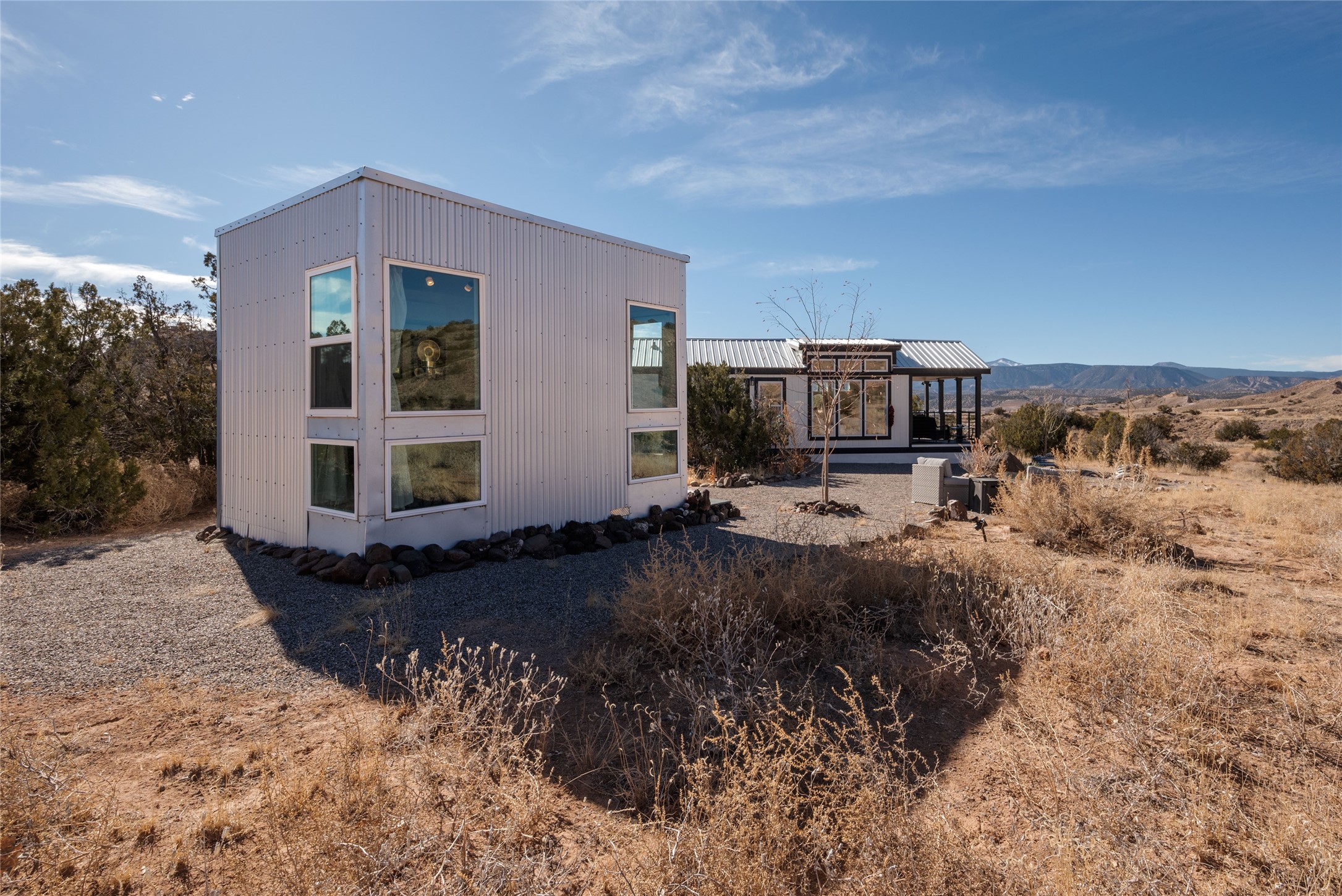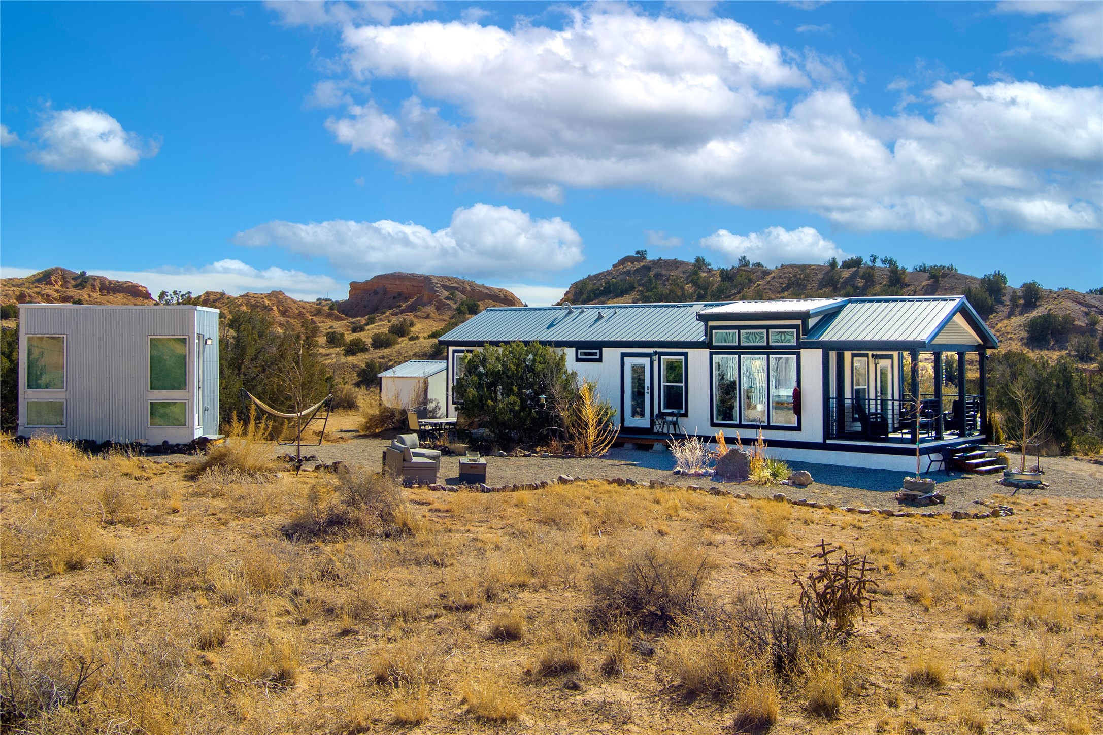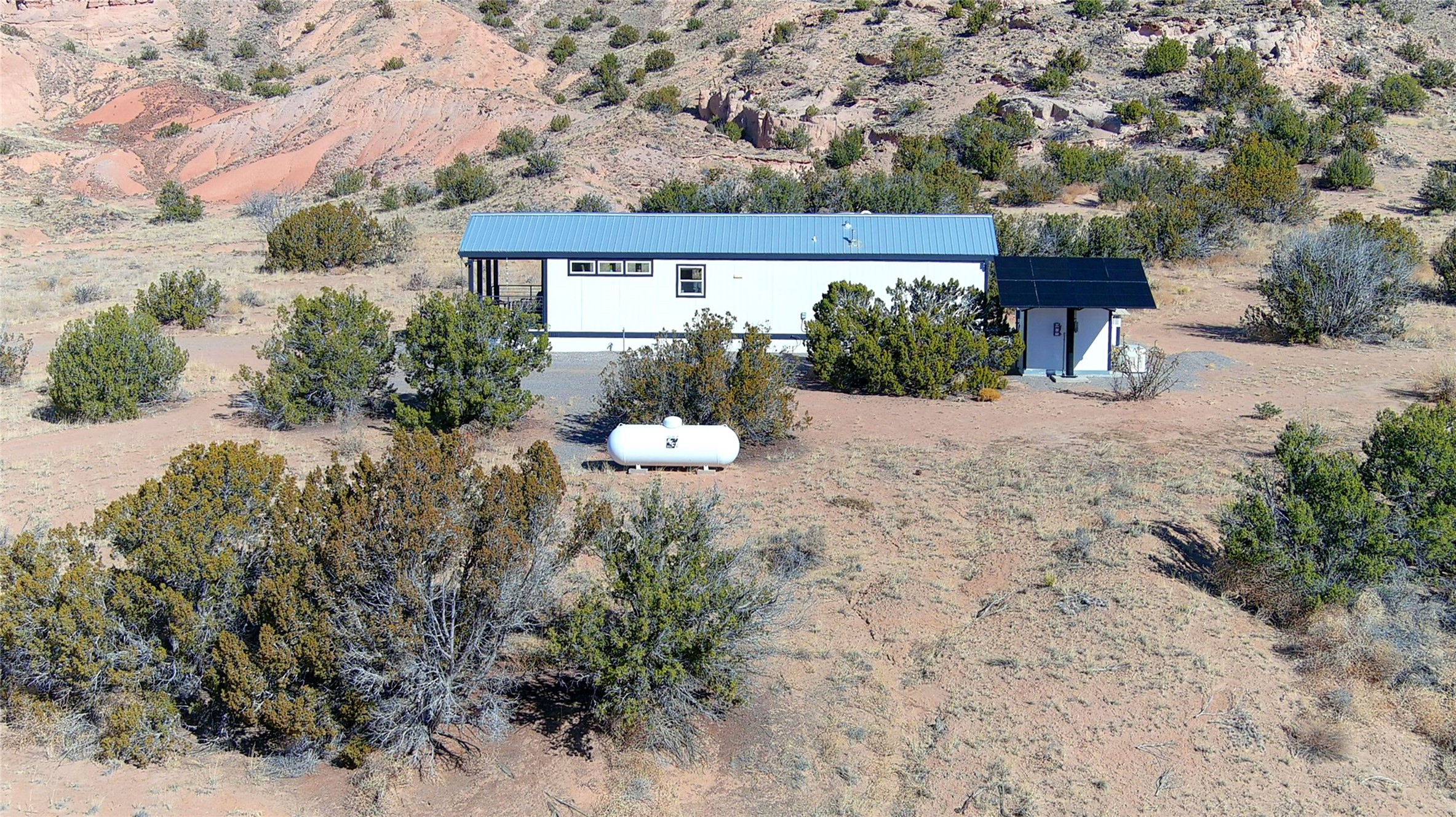 Tucked away at the end of a private, gated road, this turnkey, charming, and modern off-grid manufactured home offers the perfect blend of comfort and sustainability. Situated on over 10 pristine acres and nestled near the base of Sierra Negra, enjoy breathtaking views of red sandstone cliffs and the Jemez Mountains. This bright, light-filled home is newly built and placed on a permanent foundation in 2022. Enjoy high ceilings and a modern kitchen in this thoughtfully designed home with a pitched pro-panel roof and forced air heating and cooling for year-round comfort. The detached studio/guesthouse with a mini-split system provides the perfect space for guests, a home office, or creative pursuits.The property is fully equipped for off-grid living with owned solar panels, lithium batteries, a climate-controlled solar shed, and a Generac propane generator for peace of mind. A private well equipped with a 2500-gallon cistern ensures a reliable water source and a 500-gallon propane tank completes the picture. The generous TuffShed storage provides additional convenience, and the expansive acreage is perfect for horse enthusiasts with plenty of room to ride out.Enjoy a tranquil, sustainable lifestyle with easy access off NM 554 without compromising on modern comforts. Convenient to Abiquiu, Espanola, Los Alamos, and Santa Fe. Don't miss out on this unique property! Please schedule in ShowingTime and wait for confirmation.