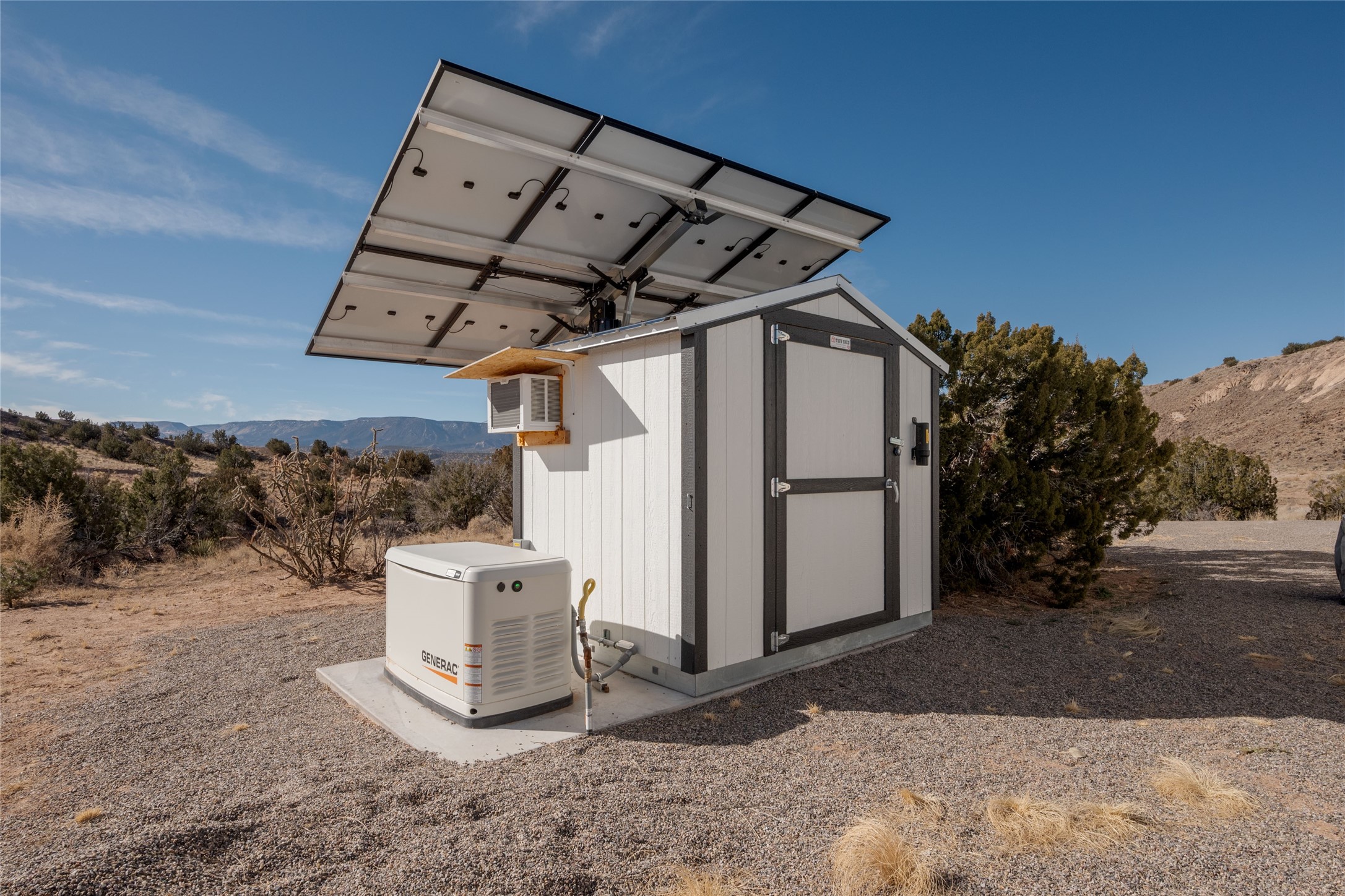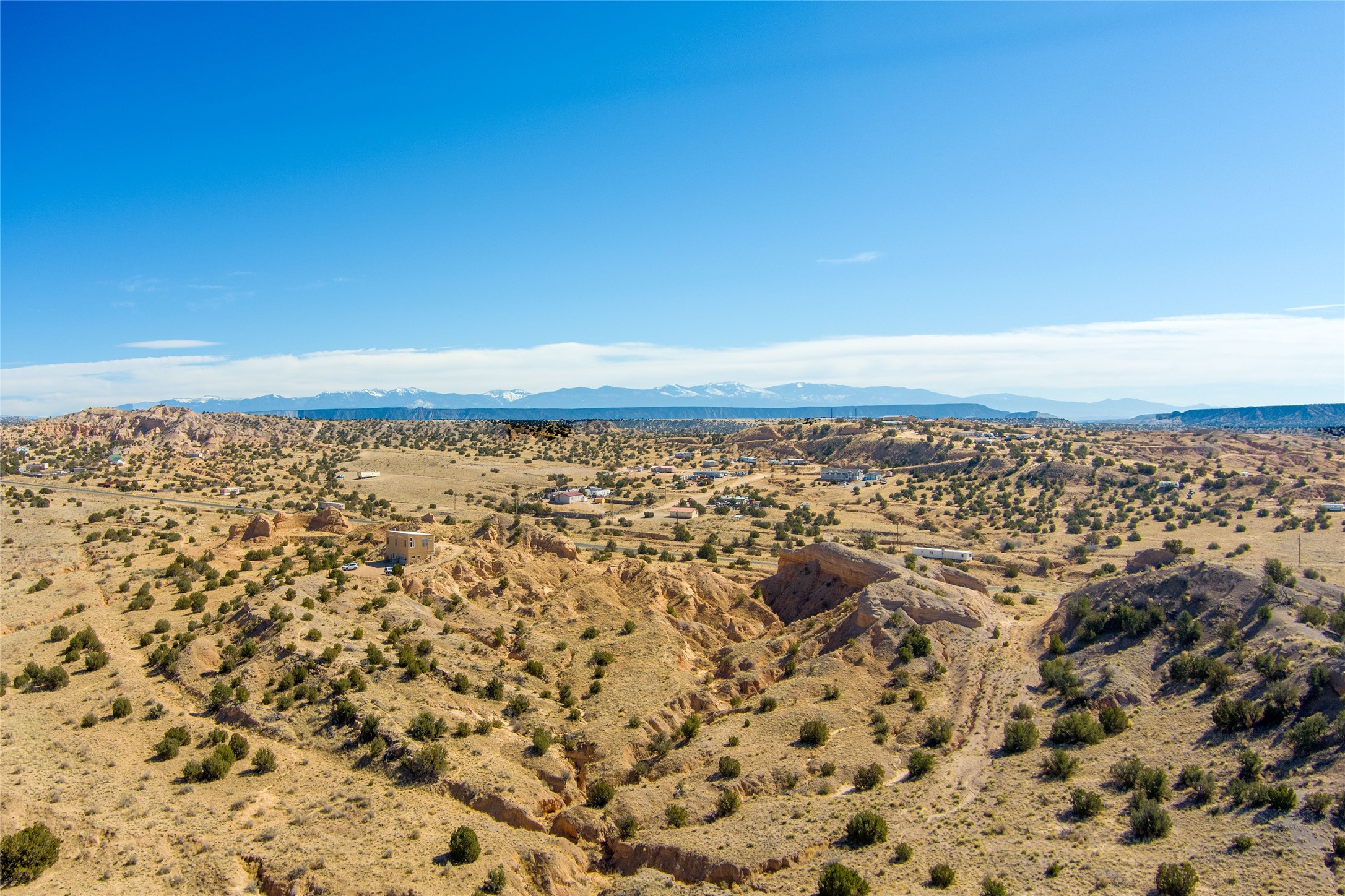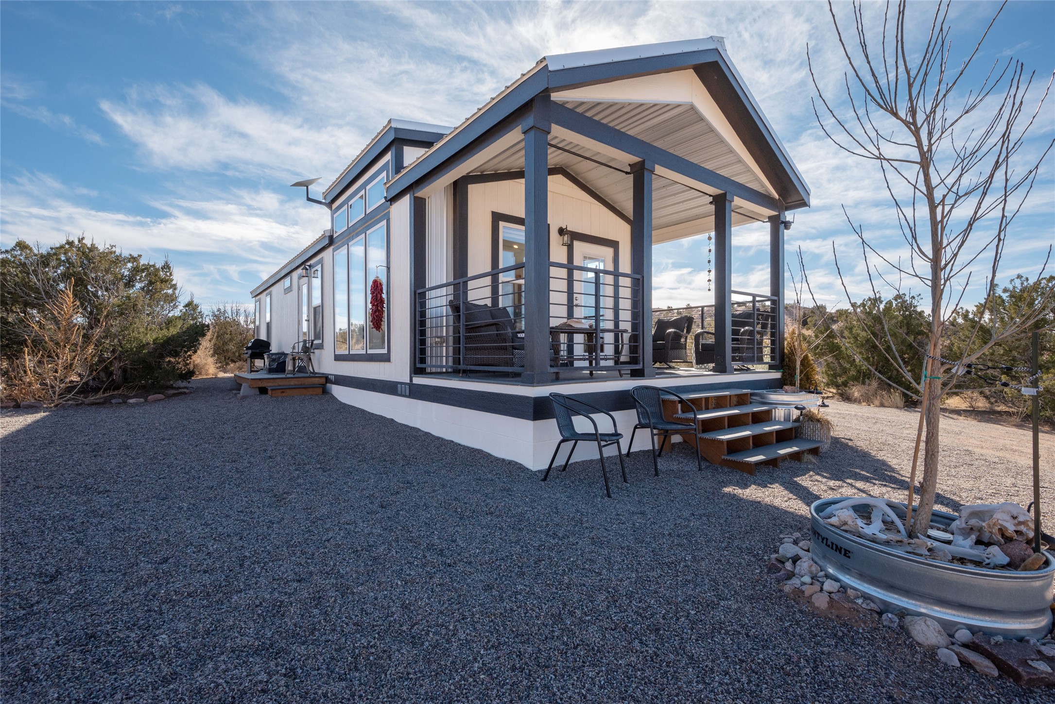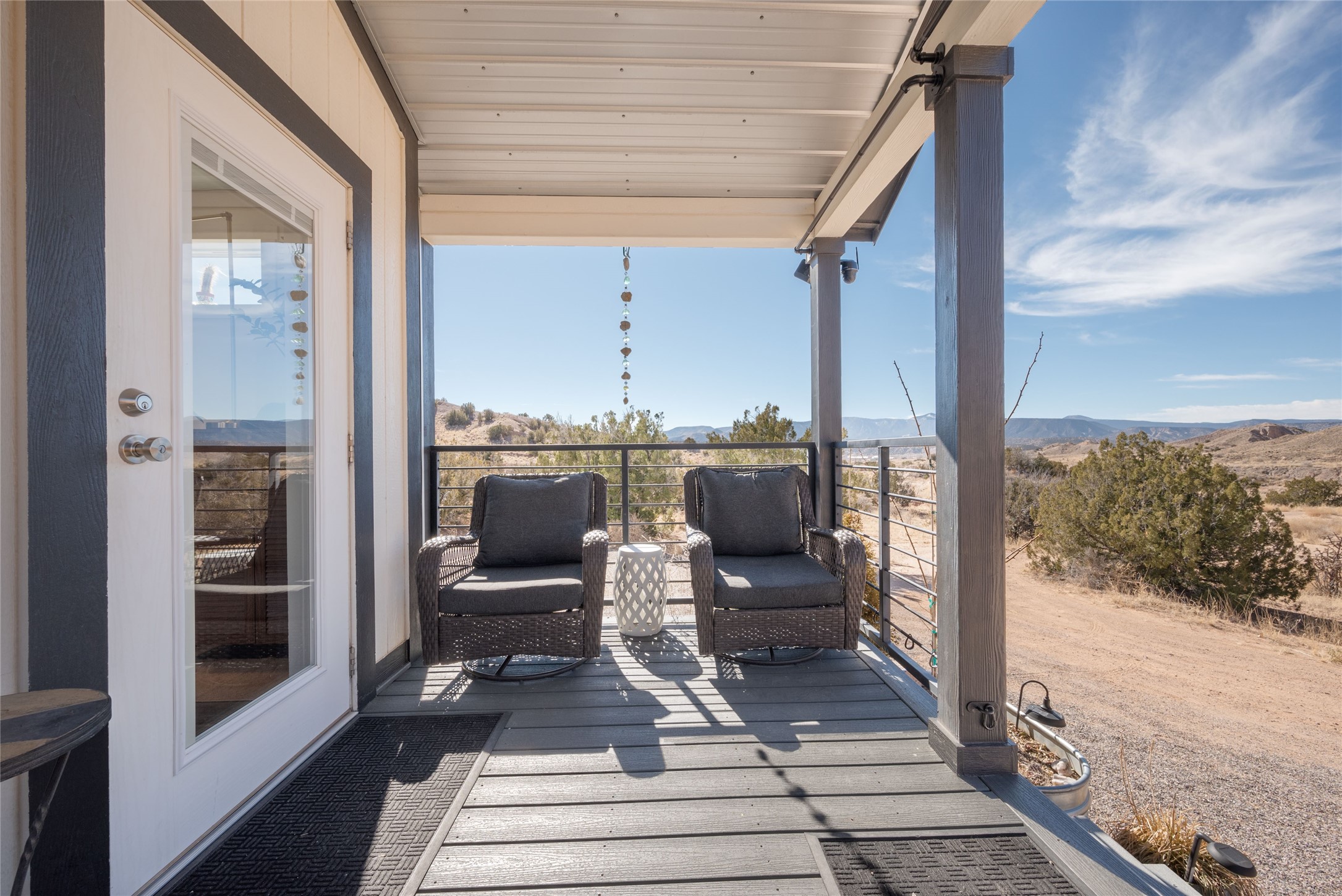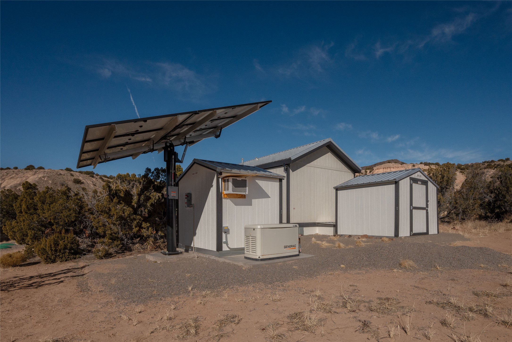 Tucked away at the end of a private, gated road, this turnkey, charming, and modern off-grid manufactured home offers the perfect blend of comfort and sustainability. Situated on over 10 pristine acres and nestled near the base of Sierra Negra, enjoy breathtaking views of red sandstone cliffs and the Jemez Mountains. This bright, light-filled home is newly built and placed on a permanent foundation in 2022. Enjoy high ceilings and a modern kitchen in this thoughtfully designed home with a pitched pro-panel roof and forced air heating and cooling for year-round comfort. The detached studio/guesthouse with a mini-split system provides the perfect space for guests, a home office, or creative pursuits.The property is fully equipped for off-grid living with owned solar panels, lithium batteries, a climate-controlled solar shed, and a Generac propane generator for peace of mind. A private well equipped with a 2500-gallon cistern ensures a reliable water source and a 500-gallon propane tank completes the picture. The generous TuffShed storage provides additional convenience, and the expansive acreage is perfect for horse enthusiasts with plenty of room to ride out.Enjoy a tranquil, sustainable lifestyle with easy access off NM 554 without compromising on modern comforts. Convenient to Abiquiu, Espanola, Los Alamos, and Santa Fe. Don't miss out on this unique property! Please schedule in ShowingTime and wait for confirmation.