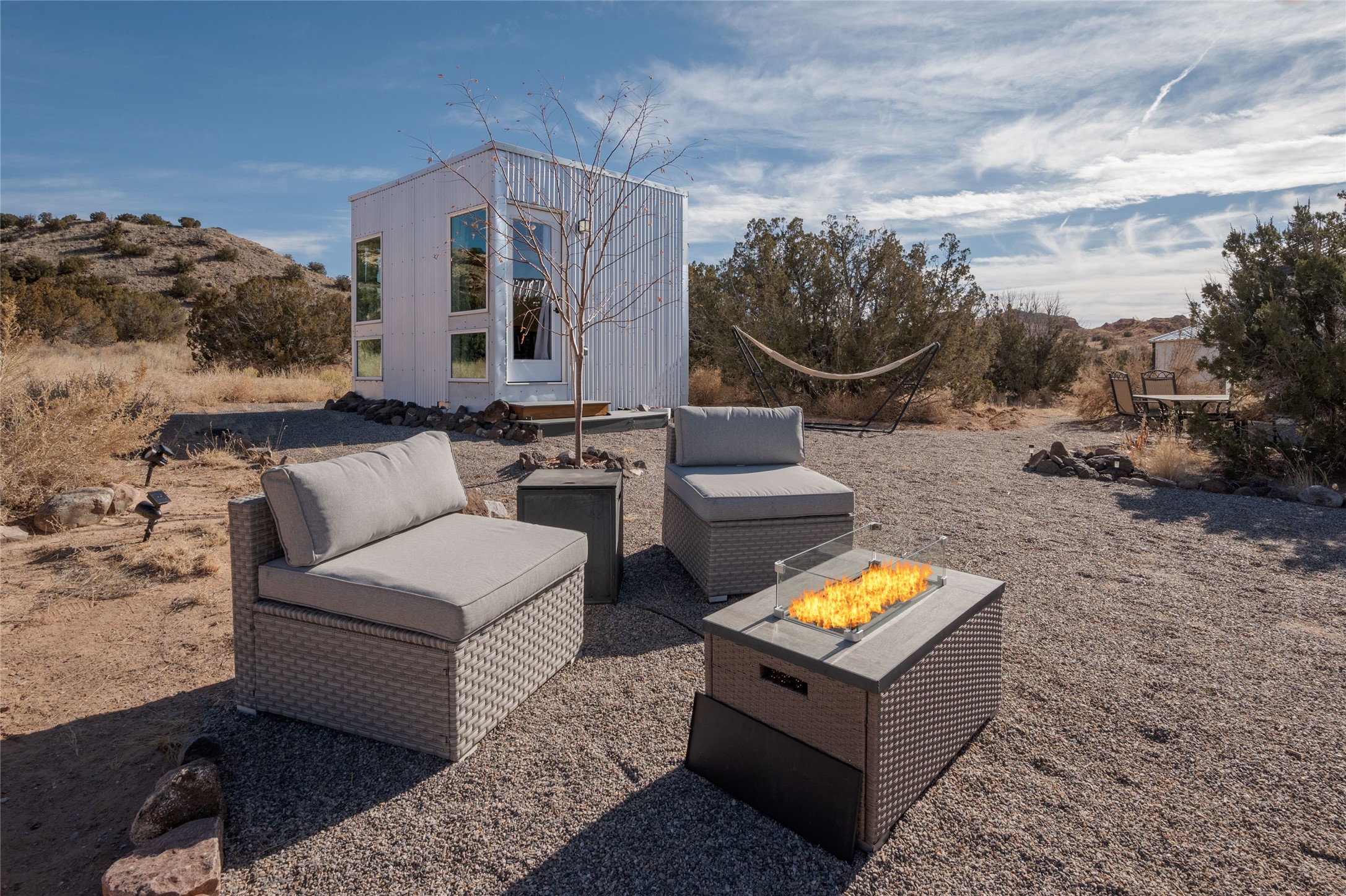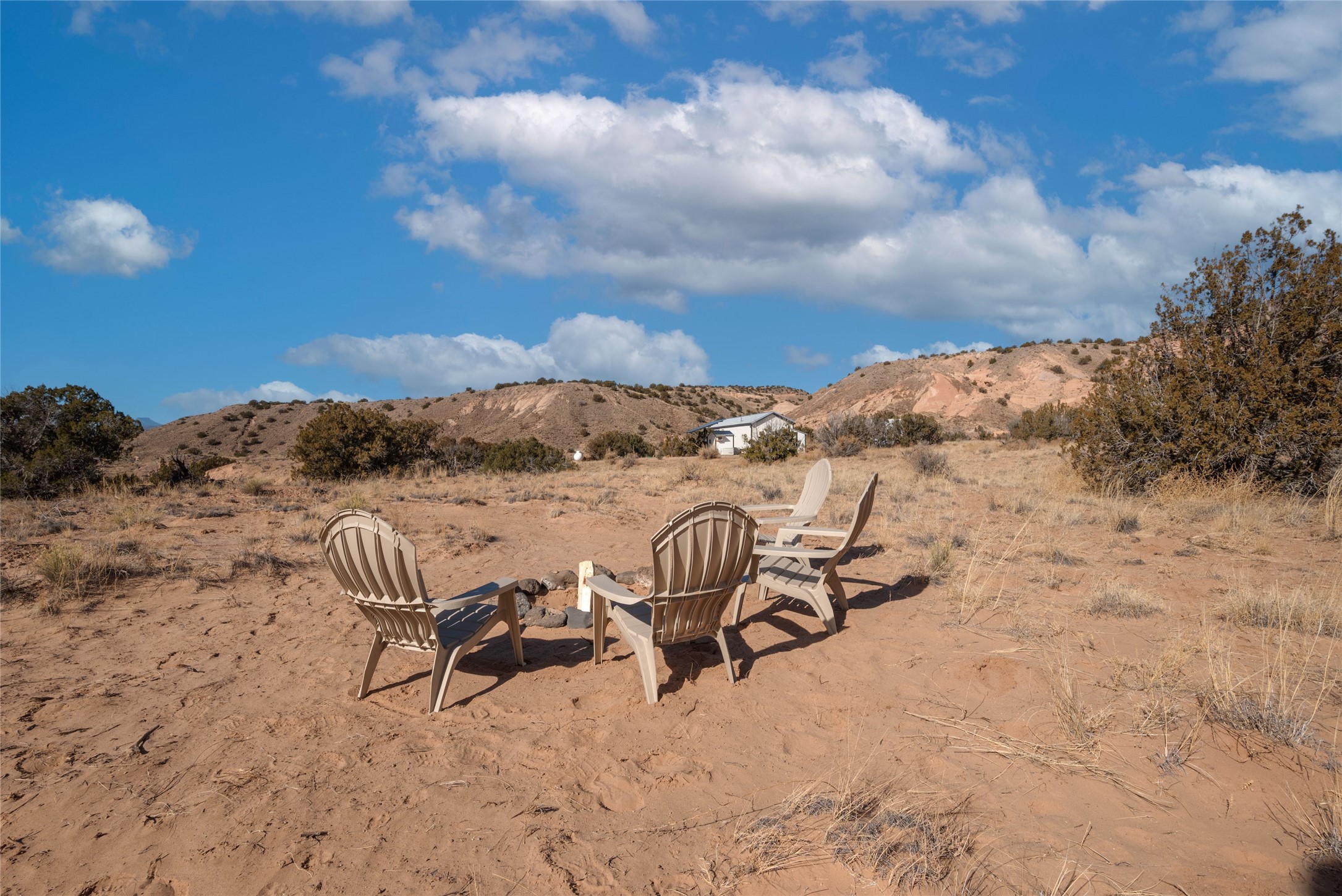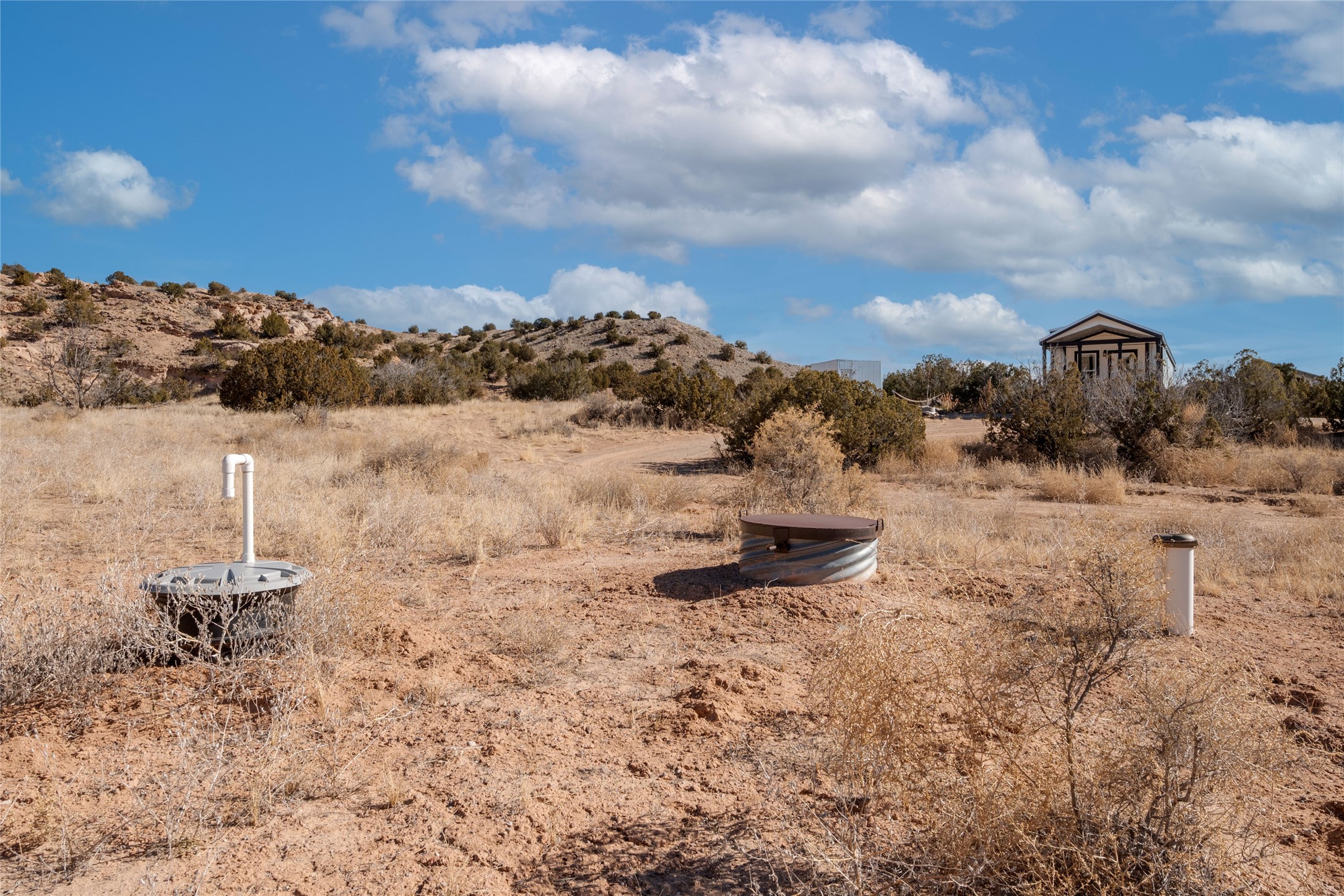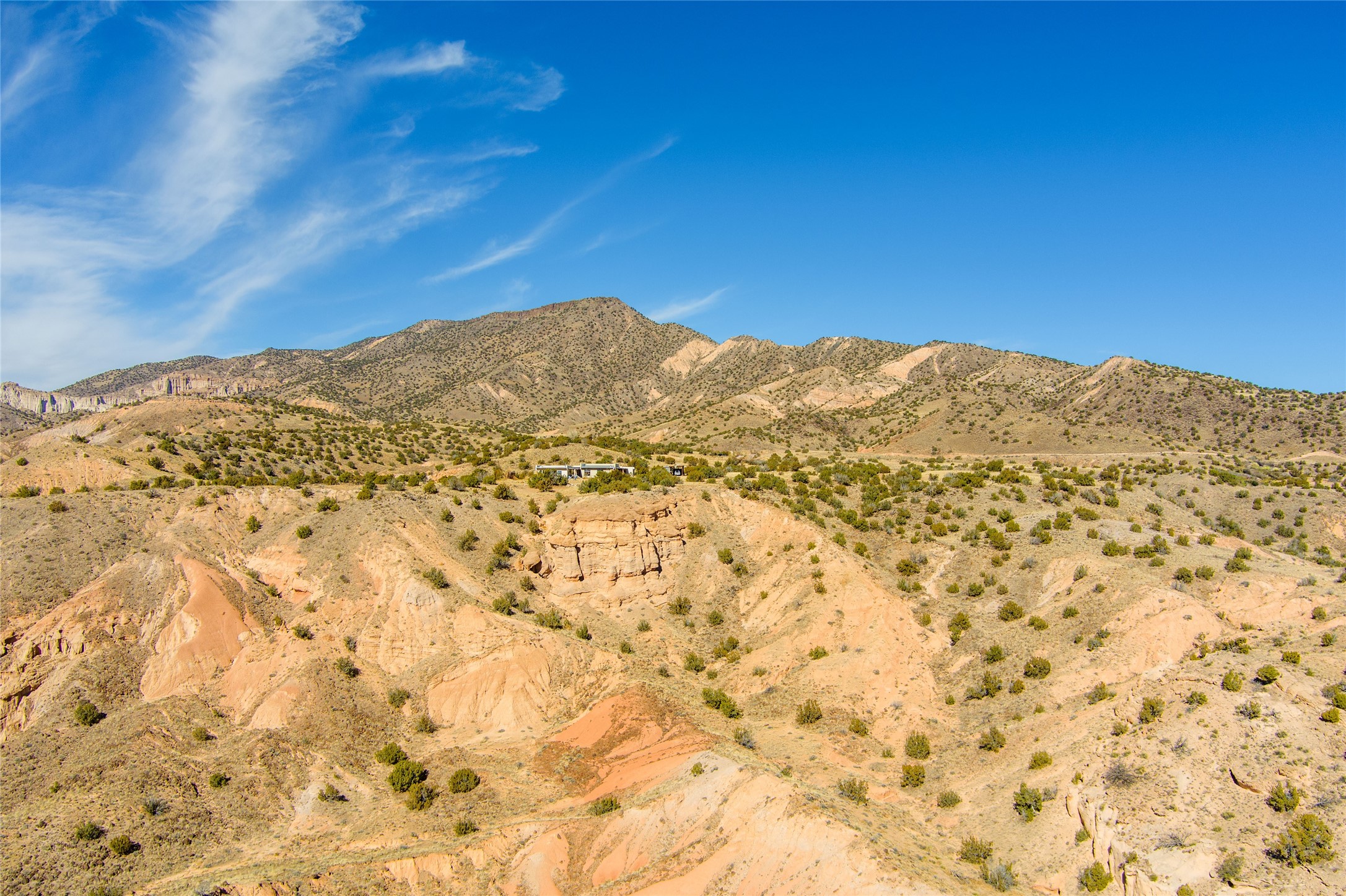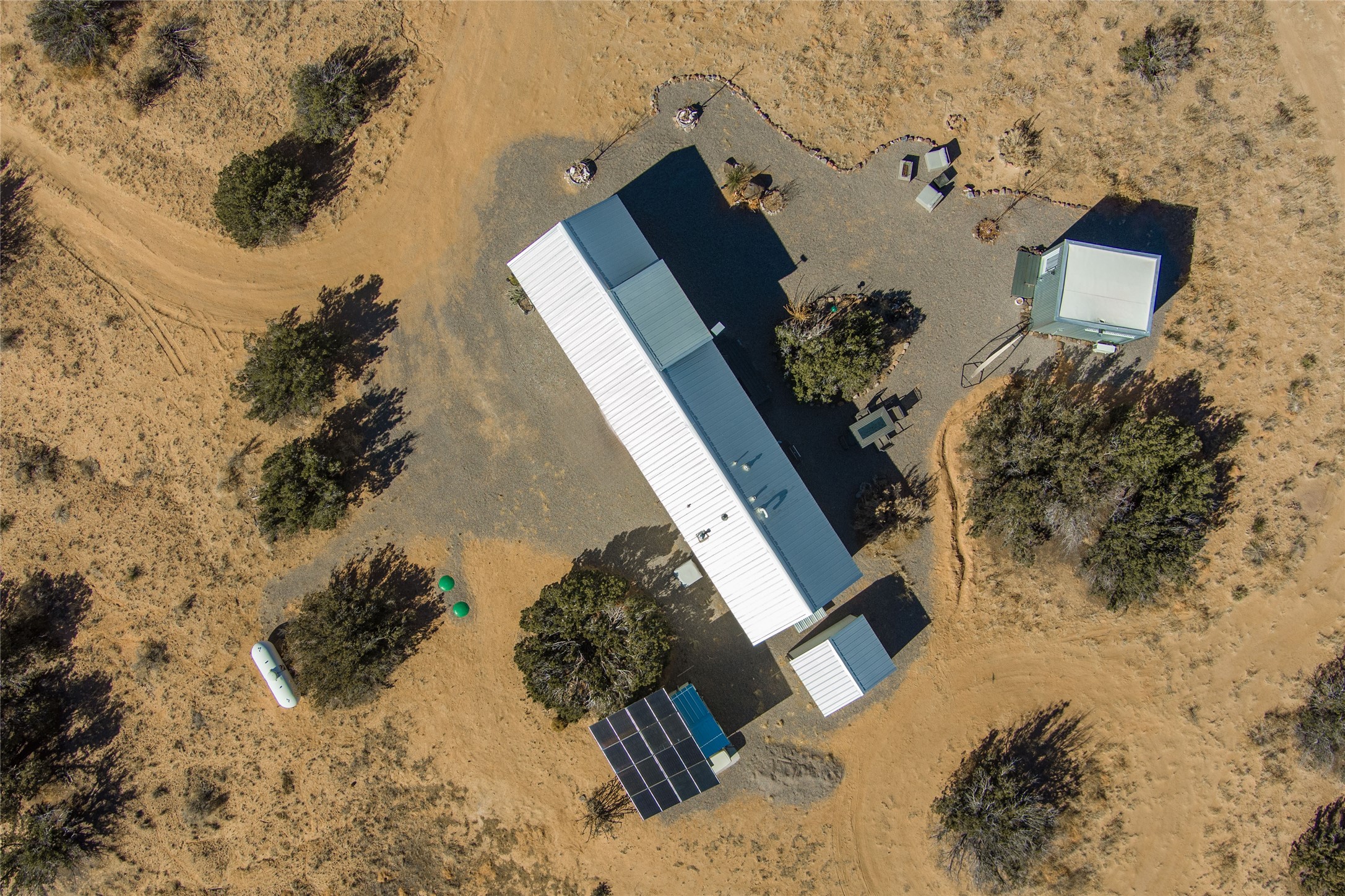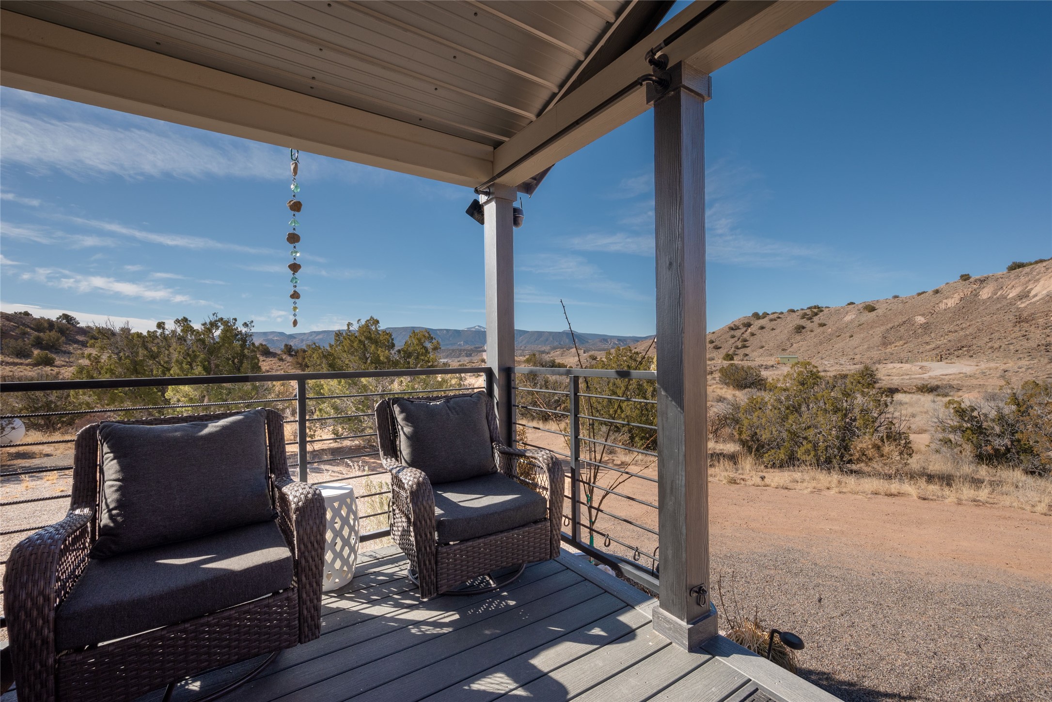 Tucked away at the end of a private, gated road, this turnkey, charming, and modern off-grid manufactured home offers the perfect blend of comfort and sustainability. Situated on over 10 pristine acres and nestled near the base of Sierra Negra, enjoy breathtaking views of red sandstone cliffs and the Jemez Mountains. This bright, light-filled home is newly built and placed on a permanent foundation in 2022. Enjoy high ceilings and a modern kitchen in this thoughtfully designed home with a pitched pro-panel roof and forced air heating and cooling for year-round comfort. The detached studio/guesthouse with a mini-split system provides the perfect space for guests, a home office, or creative pursuits.The property is fully equipped for off-grid living with owned solar panels, lithium batteries, a climate-controlled solar shed, and a Generac propane generator for peace of mind. A private well equipped with a 2500-gallon cistern ensures a reliable water source and a 500-gallon propane tank completes the picture. The generous TuffShed storage provides additional convenience, and the expansive acreage is perfect for horse enthusiasts with plenty of room to ride out.Enjoy a tranquil, sustainable lifestyle with easy access off NM 554 without compromising on modern comforts. Convenient to Abiquiu, Espanola, Los Alamos, and Santa Fe. Don't miss out on this unique property! Please schedule in ShowingTime and wait for confirmation.
