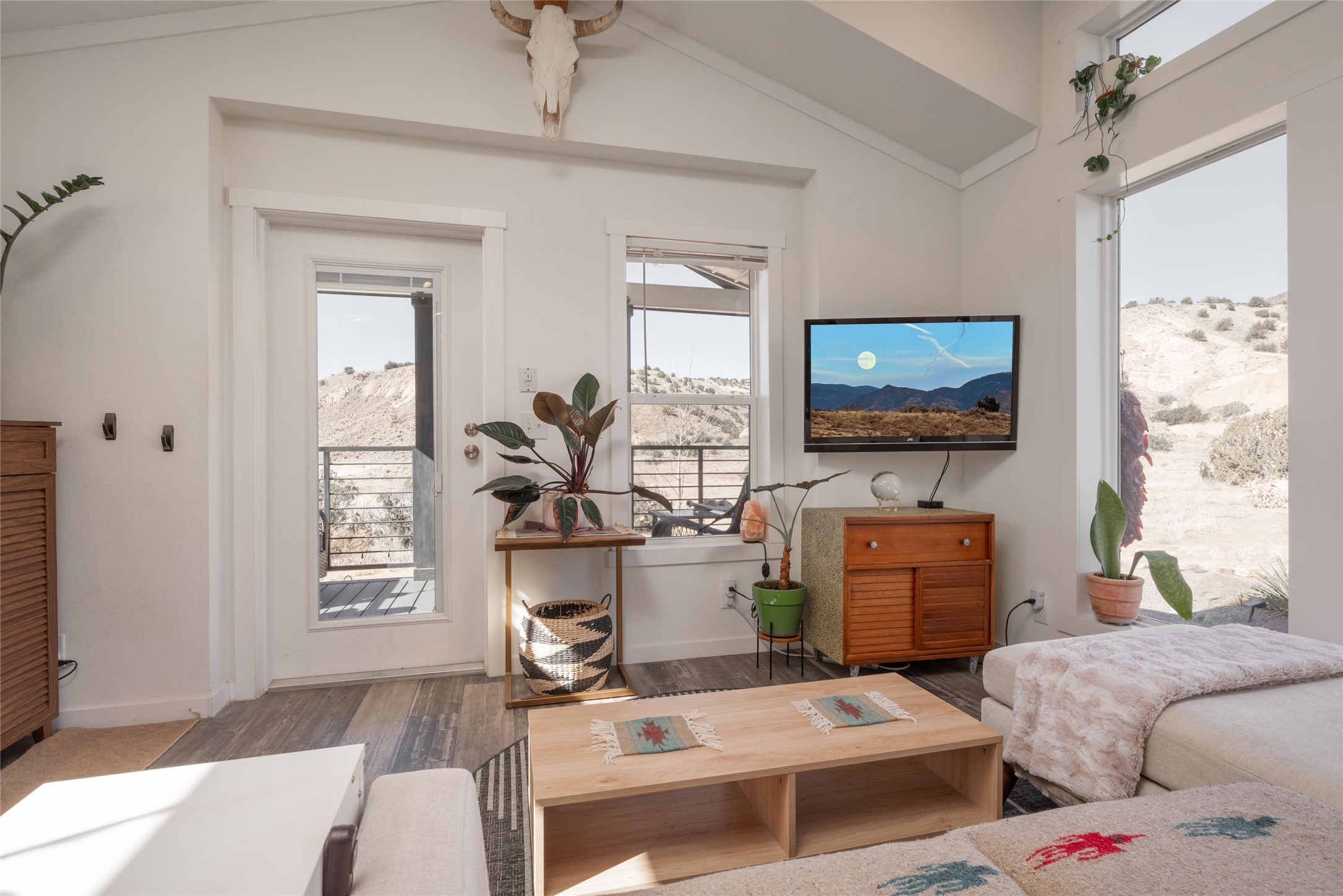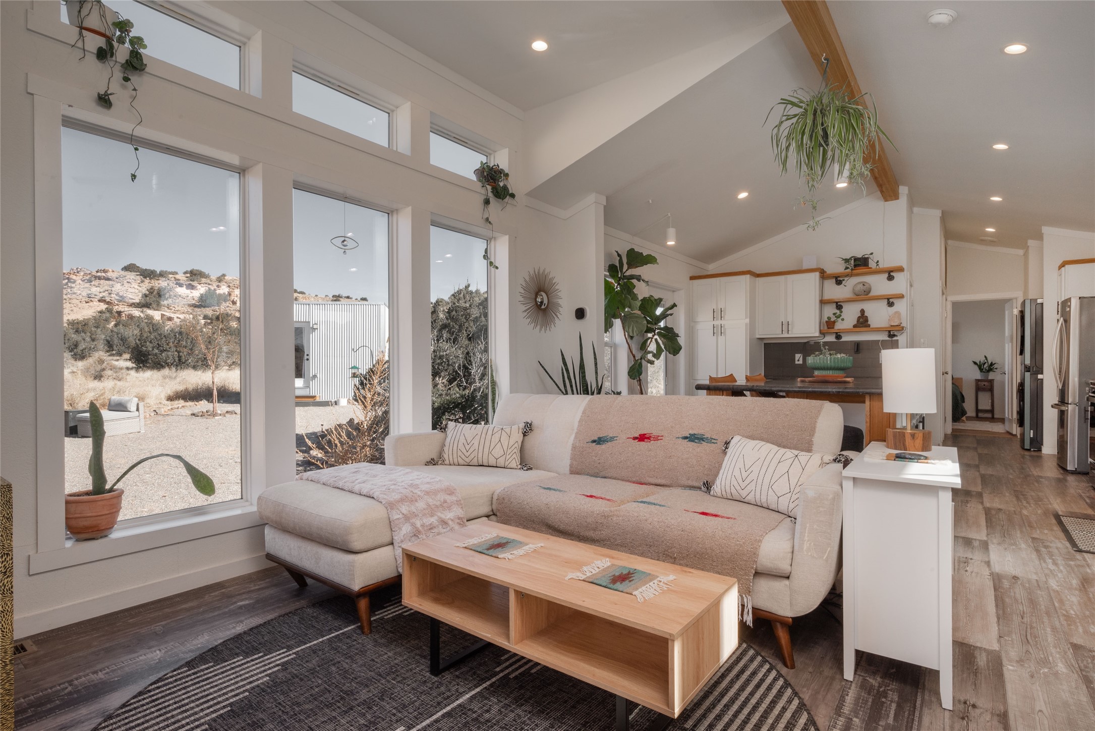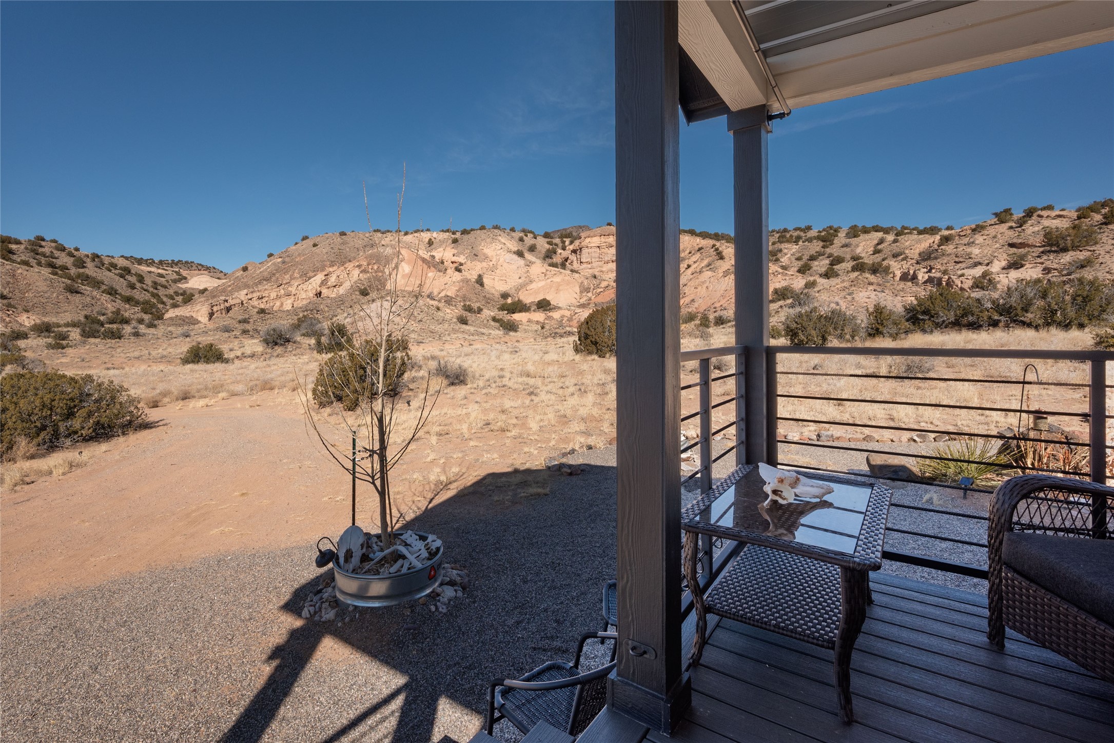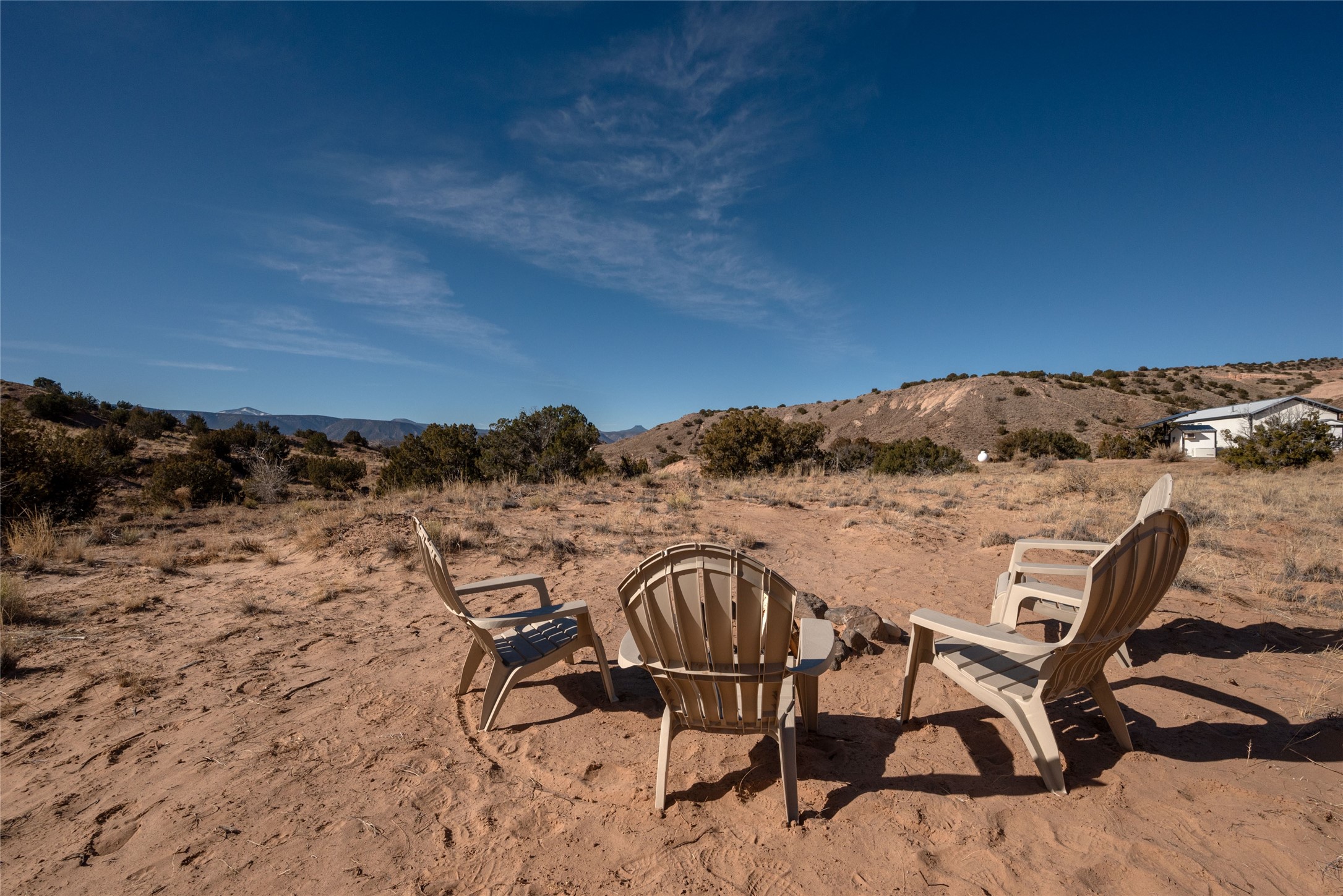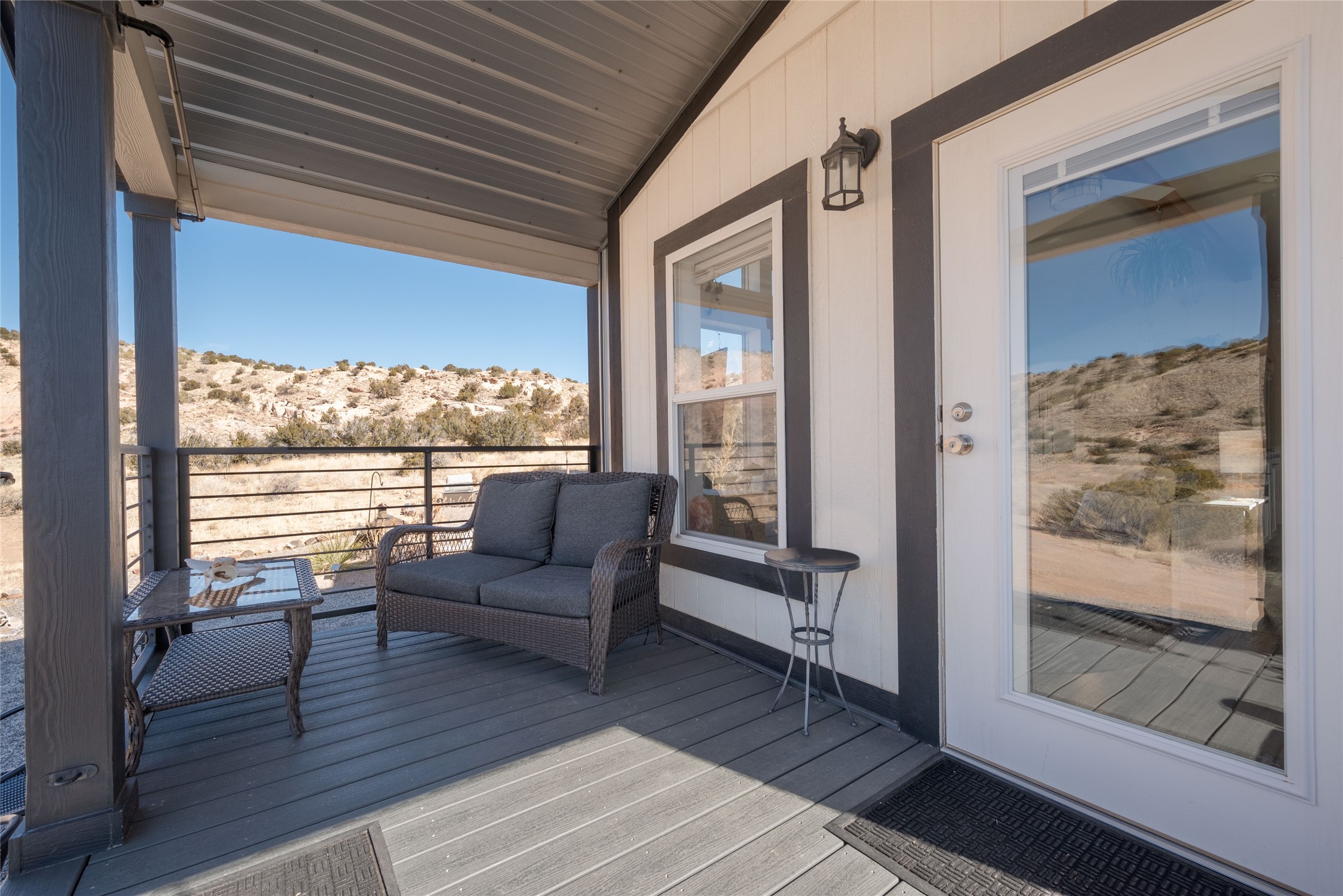 Tucked away at the end of a private, gated road, this turnkey, charming, and modern off-grid manufactured home offers the perfect blend of comfort and sustainability. Situated on over 10 pristine acres and nestled near the base of Sierra Negra, enjoy breathtaking views of red sandstone cliffs and the Jemez Mountains. This bright, light-filled home is newly built and placed on a permanent foundation in 2022. Enjoy high ceilings and a modern kitchen in this thoughtfully designed home with a pitched pro-panel roof and forced air heating and cooling for year-round comfort. The detached studio/guesthouse with a mini-split system provides the perfect space for guests, a home office, or creative pursuits.The property is fully equipped for off-grid living with owned solar panels, lithium batteries, a climate-controlled solar shed, and a Generac propane generator for peace of mind. A private well equipped with a 2500-gallon cistern ensures a reliable water source and a 500-gallon propane tank completes the picture. The generous TuffShed storage provides additional convenience, and the expansive acreage is perfect for horse enthusiasts with plenty of room to ride out.Enjoy a tranquil, sustainable lifestyle with easy access off NM 554 without compromising on modern comforts. Convenient to Abiquiu, Espanola, Los Alamos, and Santa Fe. Don't miss out on this unique property! Please schedule in ShowingTime and wait for confirmation.