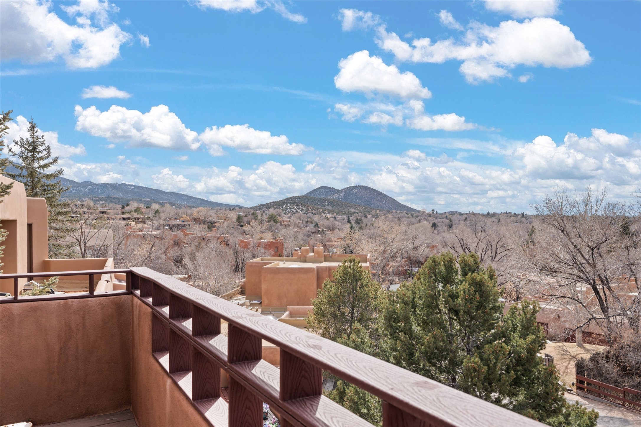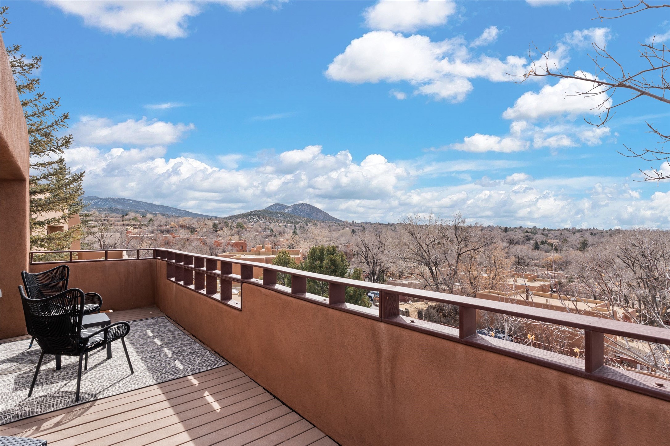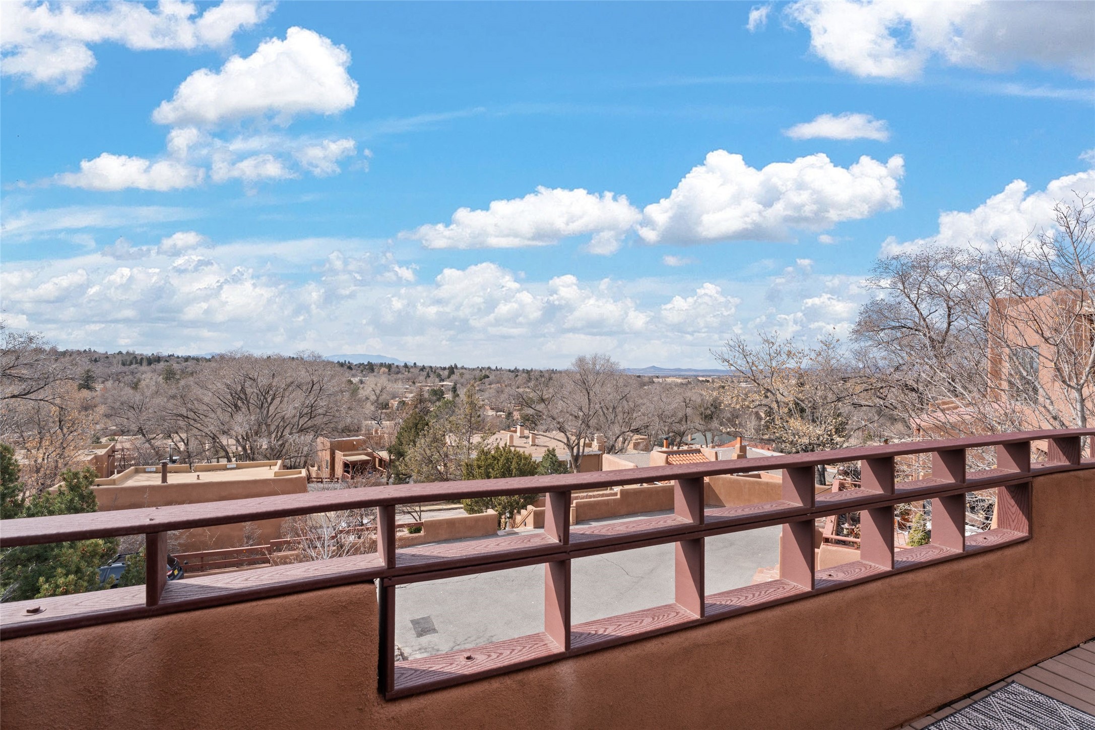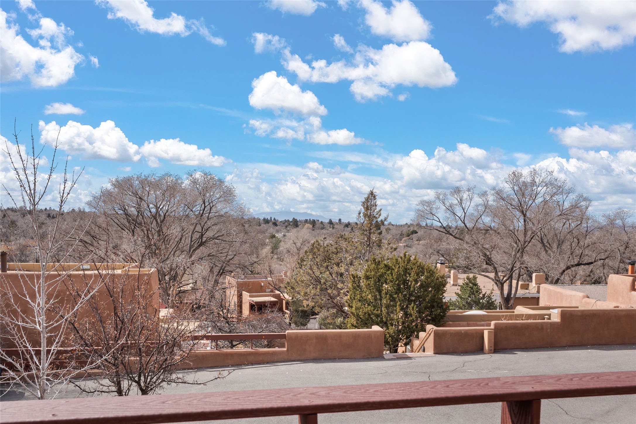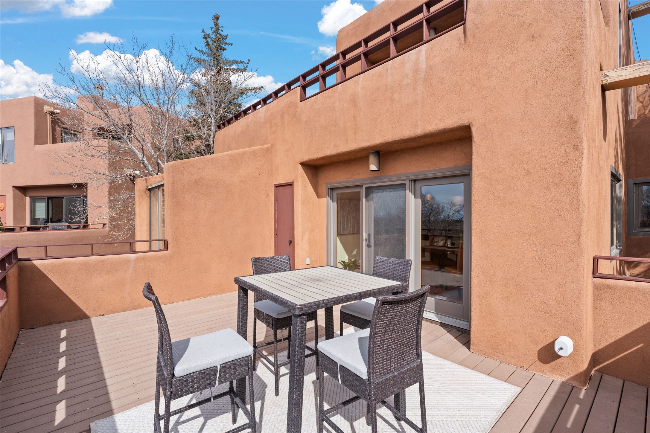 Glorious Views, Downtown Location, Move In Condition Condominium in the popular & established La Vereda Compound. A short ride, stroll, or walk to Canyon Road, the location is ideal for those wishing modern spaces to return to after leisurely days in our Ancient City. Located on the East Side of Downtown Santa Fe, this property has City and Sunset Views, living, kitchen areas, plus 1 Ensuite bedroom on Entry Level with 3/4 bath, attached two car garage, lots of Natural Light throughout, and plenty of storage nooks and room for guests. View deck off the dining area offers easy entertaining options close to the kitchen. Upstairs are two more Spacious bedrooms with ensuite baths, French Doors that lead out onto an oversized deck for relaxing and taking in the views. Updated features include: Gourmet Kitchen with two wall ovens, upgraded cabinetry & appliances, flooring, shelving, and paint- mid 2000s. New Stucco & Deck Railings (2023). Fresh air circulates easily to cool rooms in the Summer. Additional oversized Storage Room in garage area - could be perfect Wine Storage and more. *With the forced air heating system (ducted), Central AC Could Be Seamlessly Added by Future Owners*
