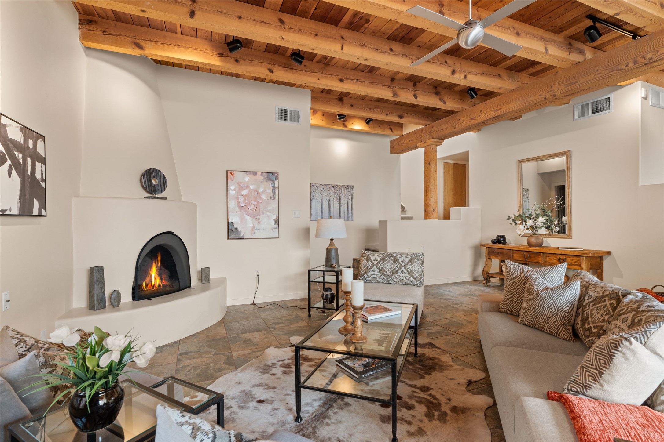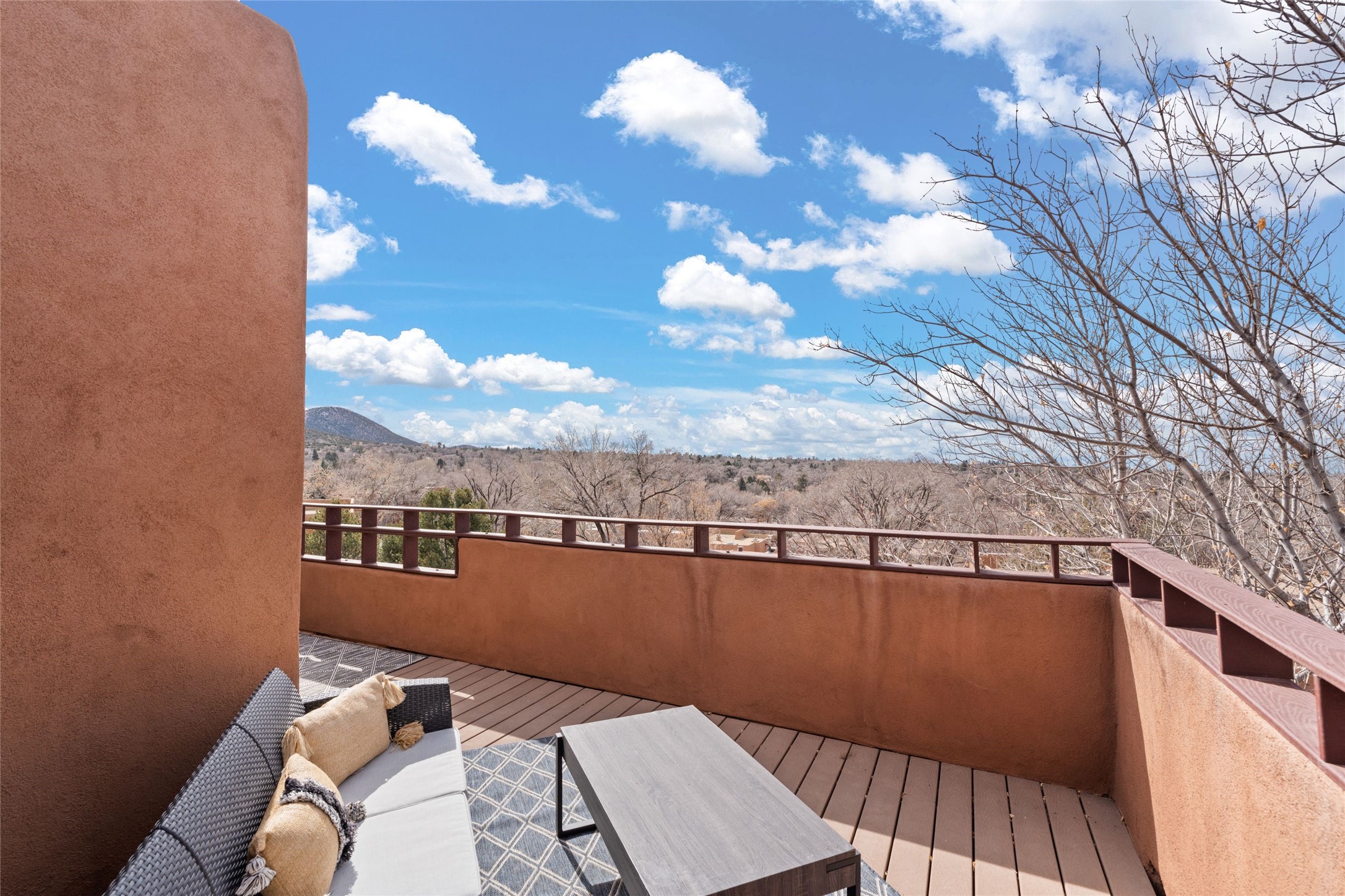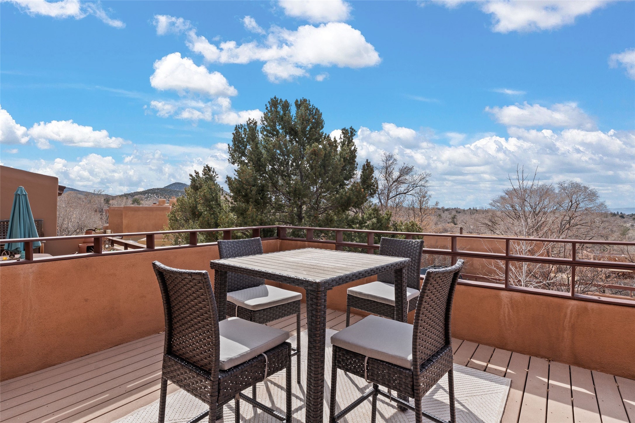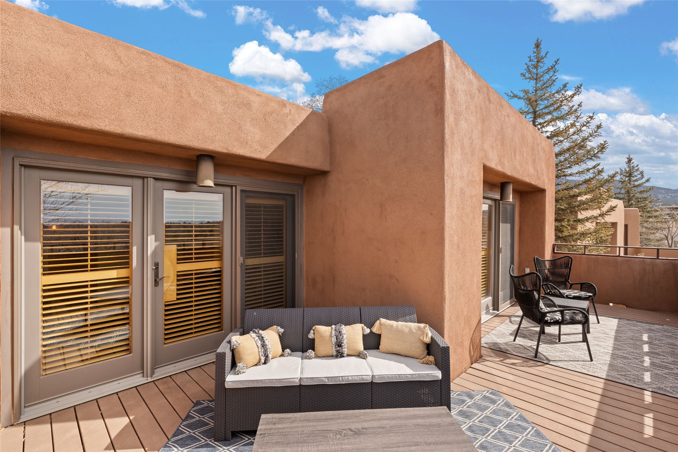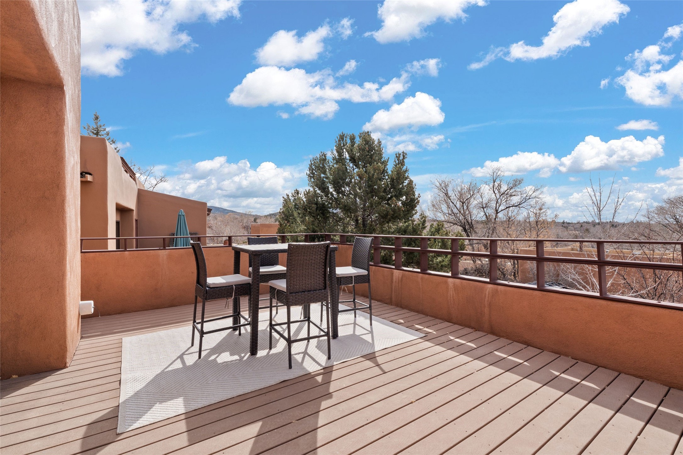 Glorious Views, Downtown Location, Move In Condition Condominium in the popular & established La Vereda Compound. A short ride, stroll, or walk to Canyon Road, the location is ideal for those wishing modern spaces to return to after leisurely days in our Ancient City. Located on the East Side of Downtown Santa Fe, this property has City and Sunset Views, living, kitchen areas, plus 1 Ensuite bedroom on Entry Level with 3/4 bath, attached two car garage, lots of Natural Light throughout, and plenty of storage nooks and room for guests. View deck off the dining area offers easy entertaining options close to the kitchen. Upstairs are two more Spacious bedrooms with ensuite baths, French Doors that lead out onto an oversized deck for relaxing and taking in the views. Updated features include: Gourmet Kitchen with two wall ovens, upgraded cabinetry & appliances, flooring, shelving, and paint- mid 2000s. New Stucco & Deck Railings (2023). Fresh air circulates easily to cool rooms in the Summer. Additional oversized Storage Room in garage area - could be perfect Wine Storage and more. *With the forced air heating system (ducted), Central AC Could Be Seamlessly Added by Future Owners*