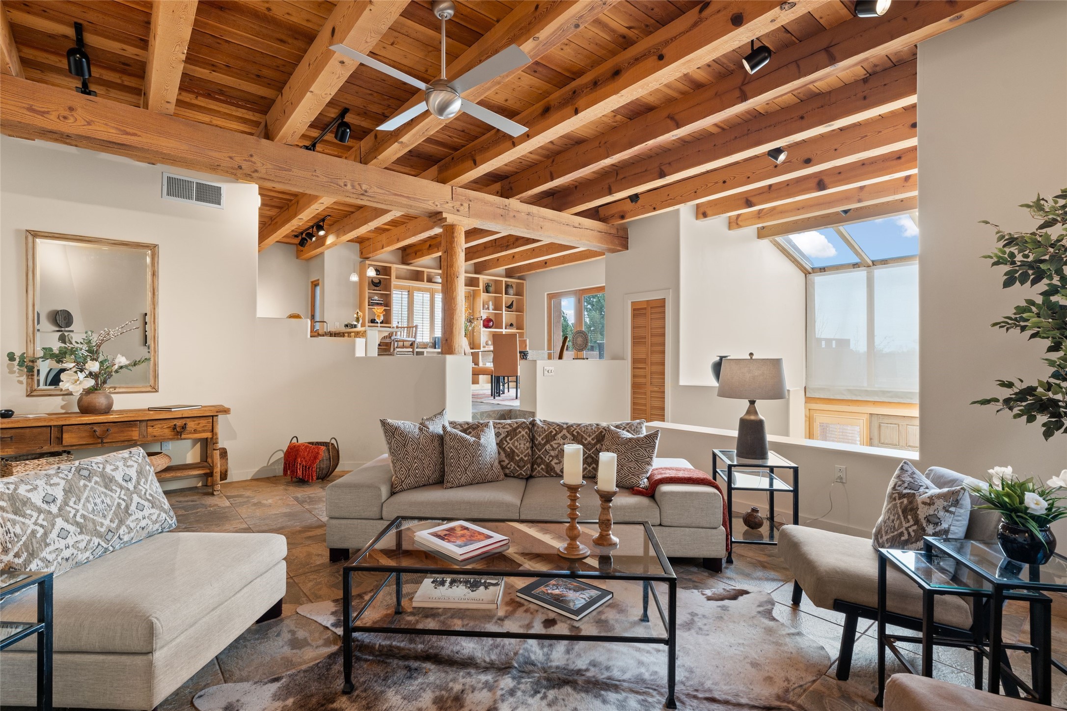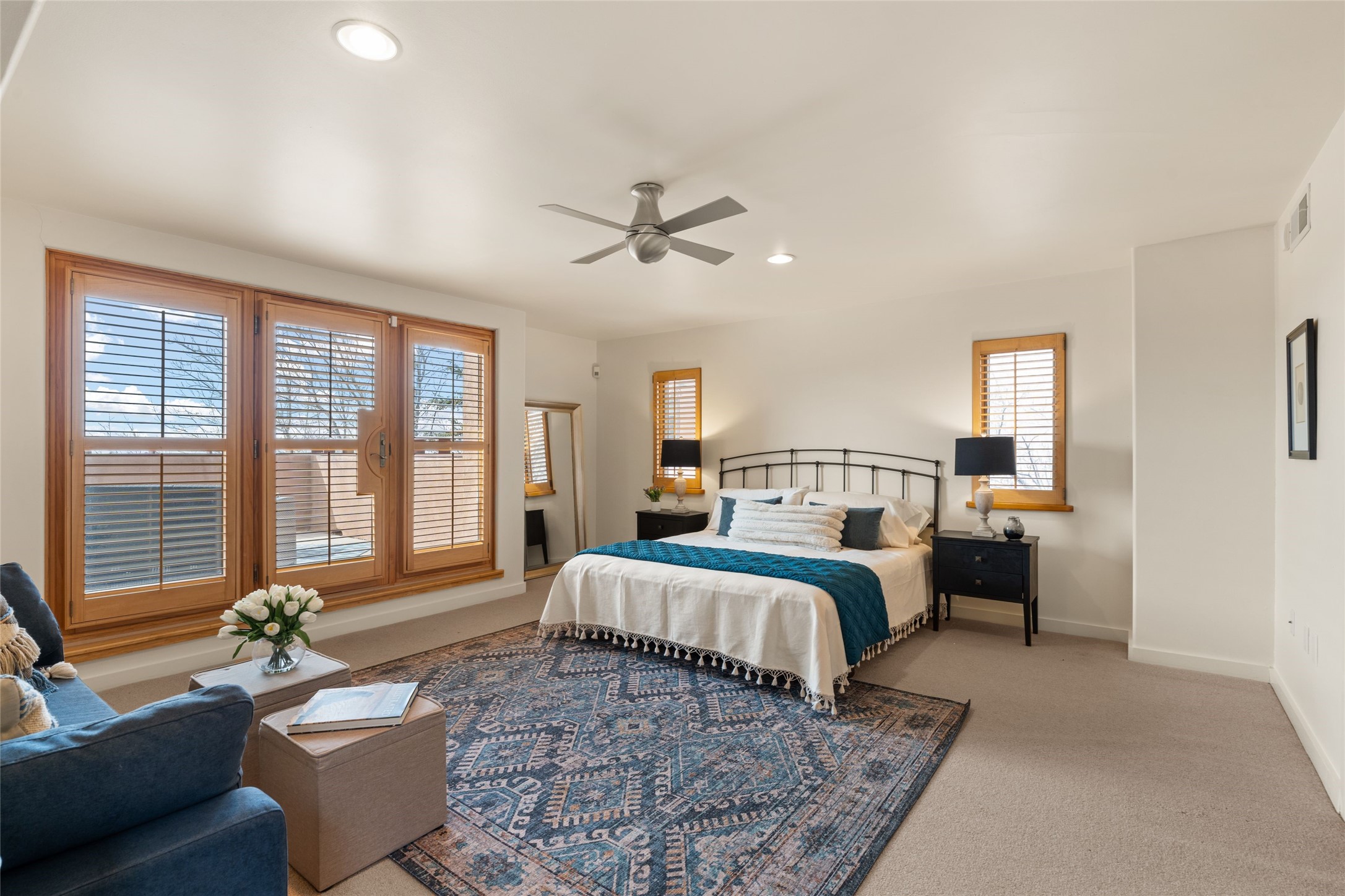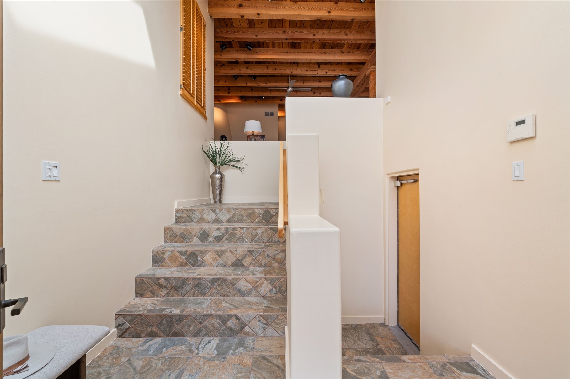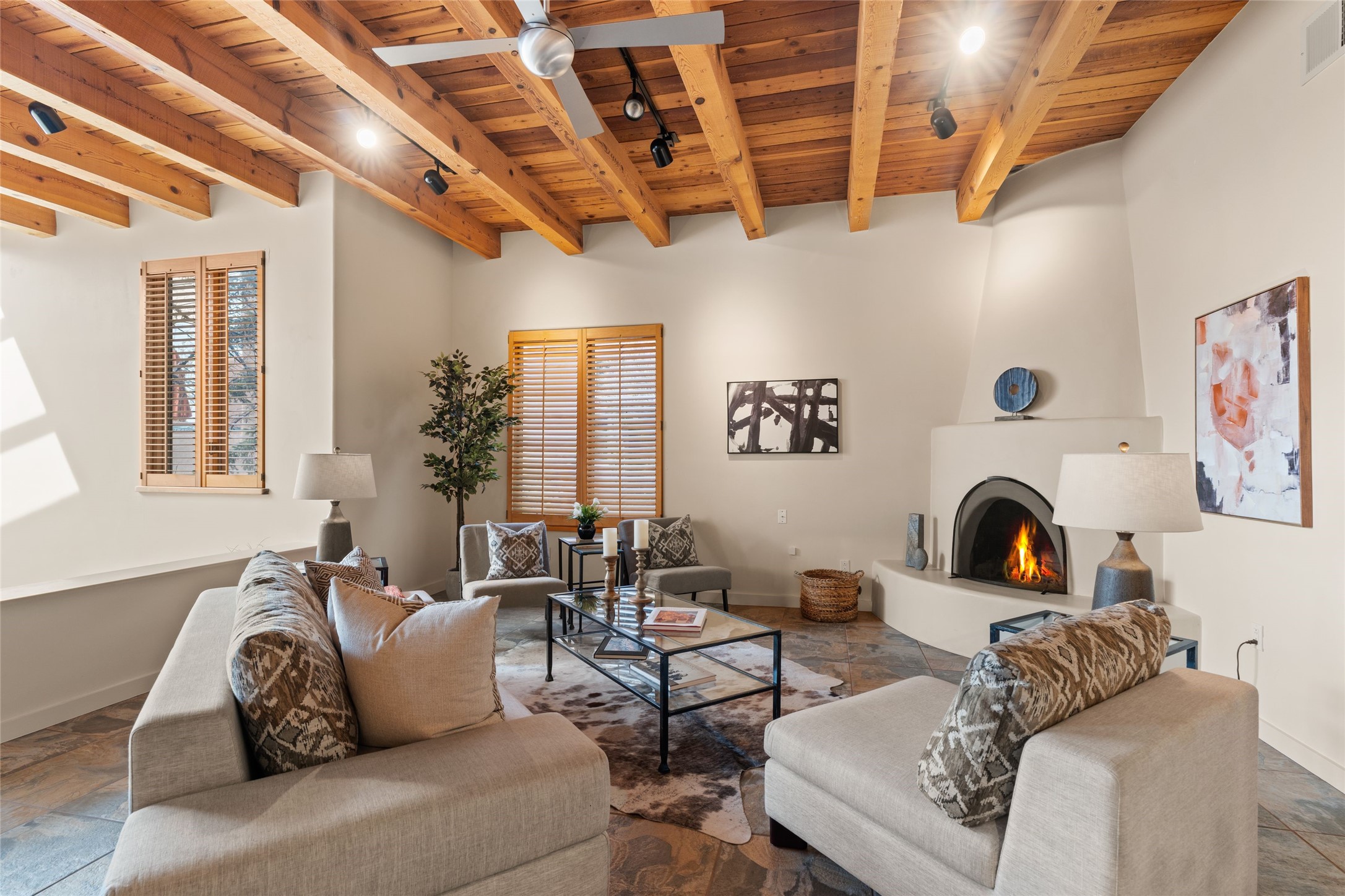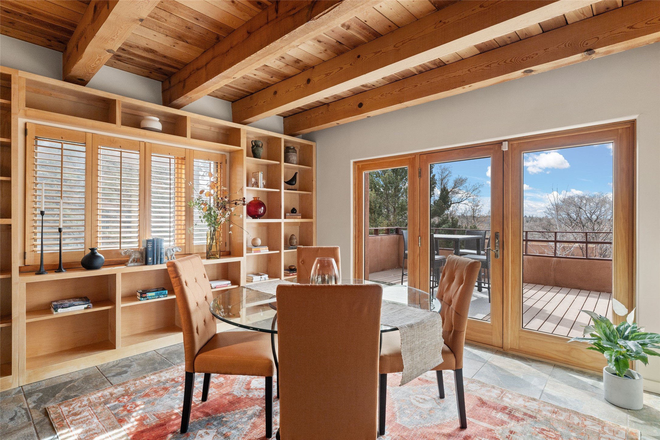 Glorious Views, Downtown Location, Move In Condition Condominium in the popular & established La Vereda Compound. A short ride, stroll, or walk to Canyon Road, the location is ideal for those wishing modern spaces to return to after leisurely days in our Ancient City. Located on the East Side of Downtown Santa Fe, this property has City and Sunset Views, living, kitchen areas, plus 1 Ensuite bedroom on Entry Level with 3/4 bath, attached two car garage, lots of Natural Light throughout, and plenty of storage nooks and room for guests. View deck off the dining area offers easy entertaining options close to the kitchen. Upstairs are two more Spacious bedrooms with ensuite baths, French Doors that lead out onto an oversized deck for relaxing and taking in the views. Updated features include: Gourmet Kitchen with two wall ovens, upgraded cabinetry & appliances, flooring, shelving, and paint- mid 2000s. New Stucco & Deck Railings (2023). Fresh air circulates easily to cool rooms in the Summer. Additional oversized Storage Room in garage area - could be perfect Wine Storage and more. *With the forced air heating system (ducted), Central AC Could Be Seamlessly Added by Future Owners*