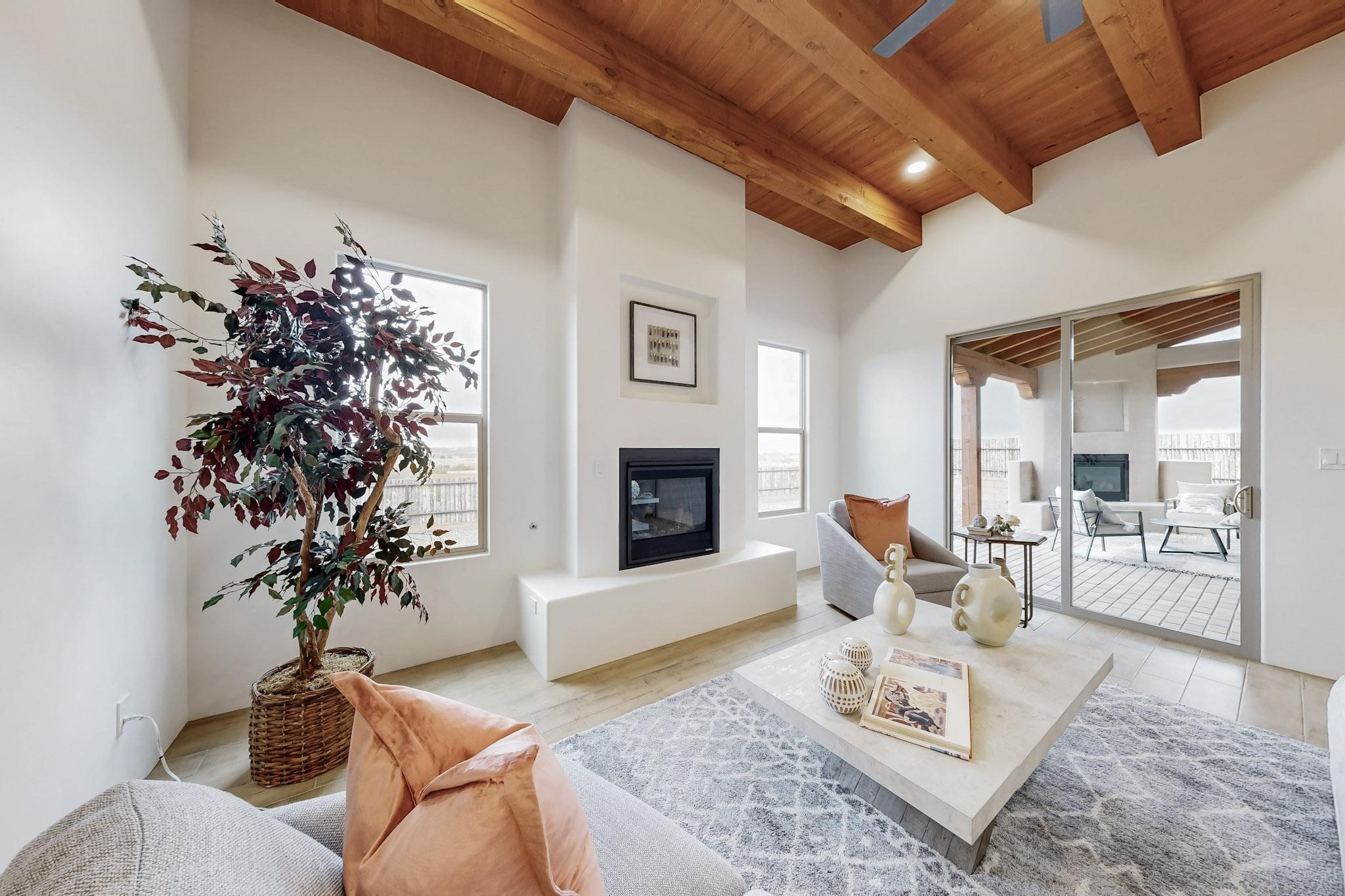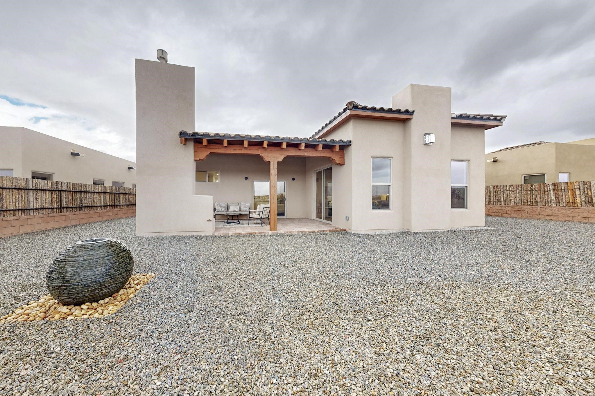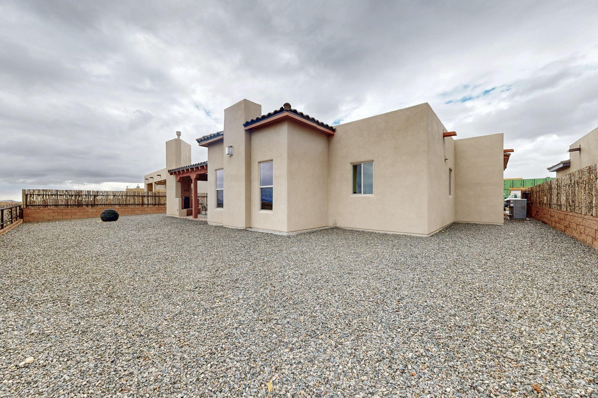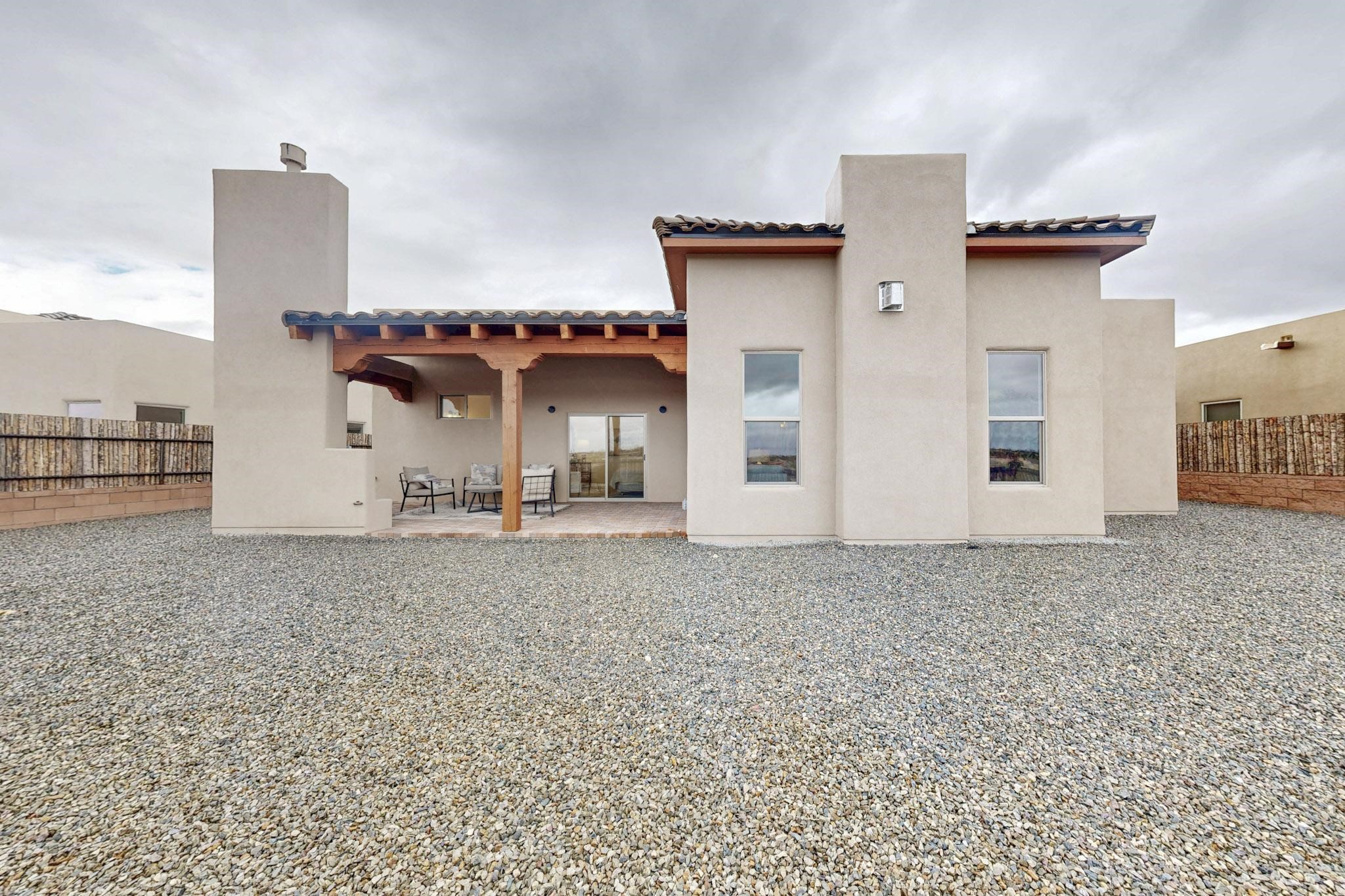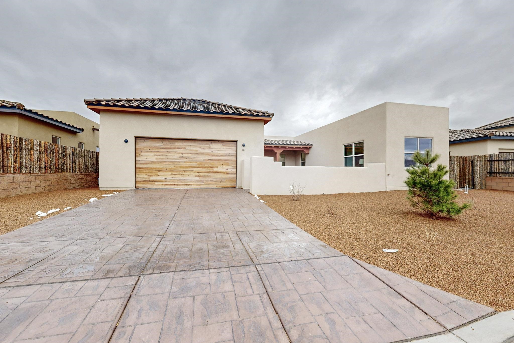 With a gated front courtyard wall and spectacular views to the south, this SanAntonio Plan consists of 2260 sq. ft., 3 bedrooms and 2 baths. Located at 30 LaPradera in the La Pradera Subdivision, the exterior is a pitched roof Spanishdesign with clay-like tile roofs and covered portals with heavy wood beams andbrick pavers. The 2-car driveway is a colored stamped- concrete design. Thehome is entered through an 8 ft. high door to a foyer with a boveda ceiling andbeige, wood-like porcelain floor tiles. To the left is a powder room and to theright is a hallway with a nicho-accented wall leading to the two (2) guestbedrooms. The foyer leads into the living/dining room which has a 12-foot-highceiling with cedar-stained wood beams and T & G trim and a gas fireplace. Theliving room and the owner's suite open out to a covered portal with brick paversand a gas-fired fireplace. The open kitchen has cream-colored cabinets. Anexceptionally large pantry is directly off the kitchen. The utility room is thenaccessed from the pantry and has ample cabinets, skylight, and a sink.The owner's bath has a large walk-in shower with euro-style shower fixturesand an overhead rain shower head. There is also an exceptionally large walk-incloset. The insulated garage includes a storage room and an epoxy-coated floor.