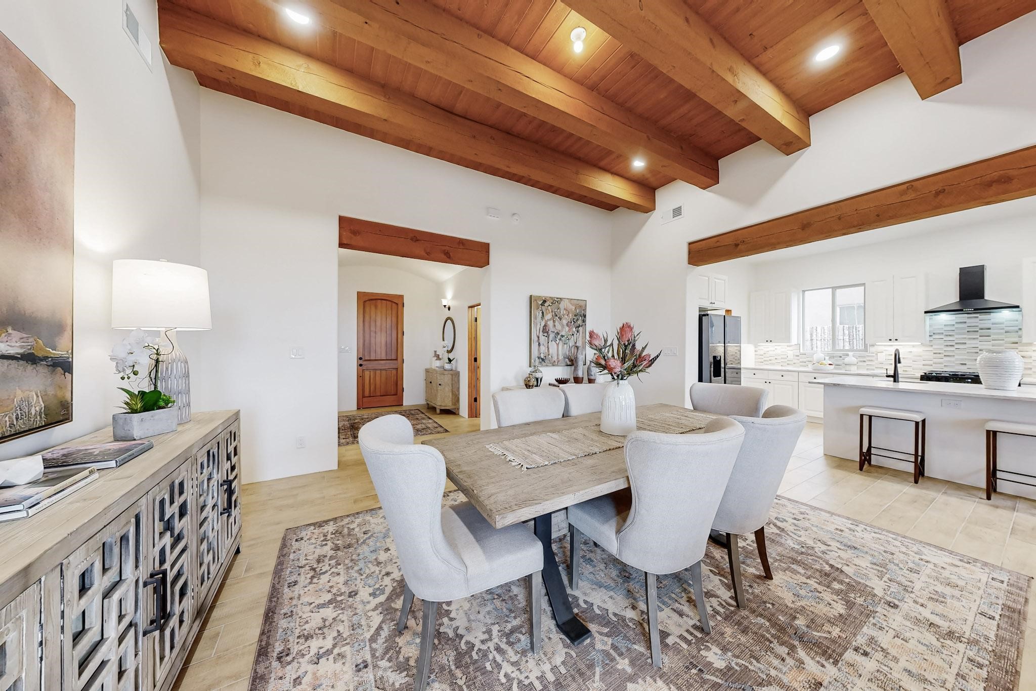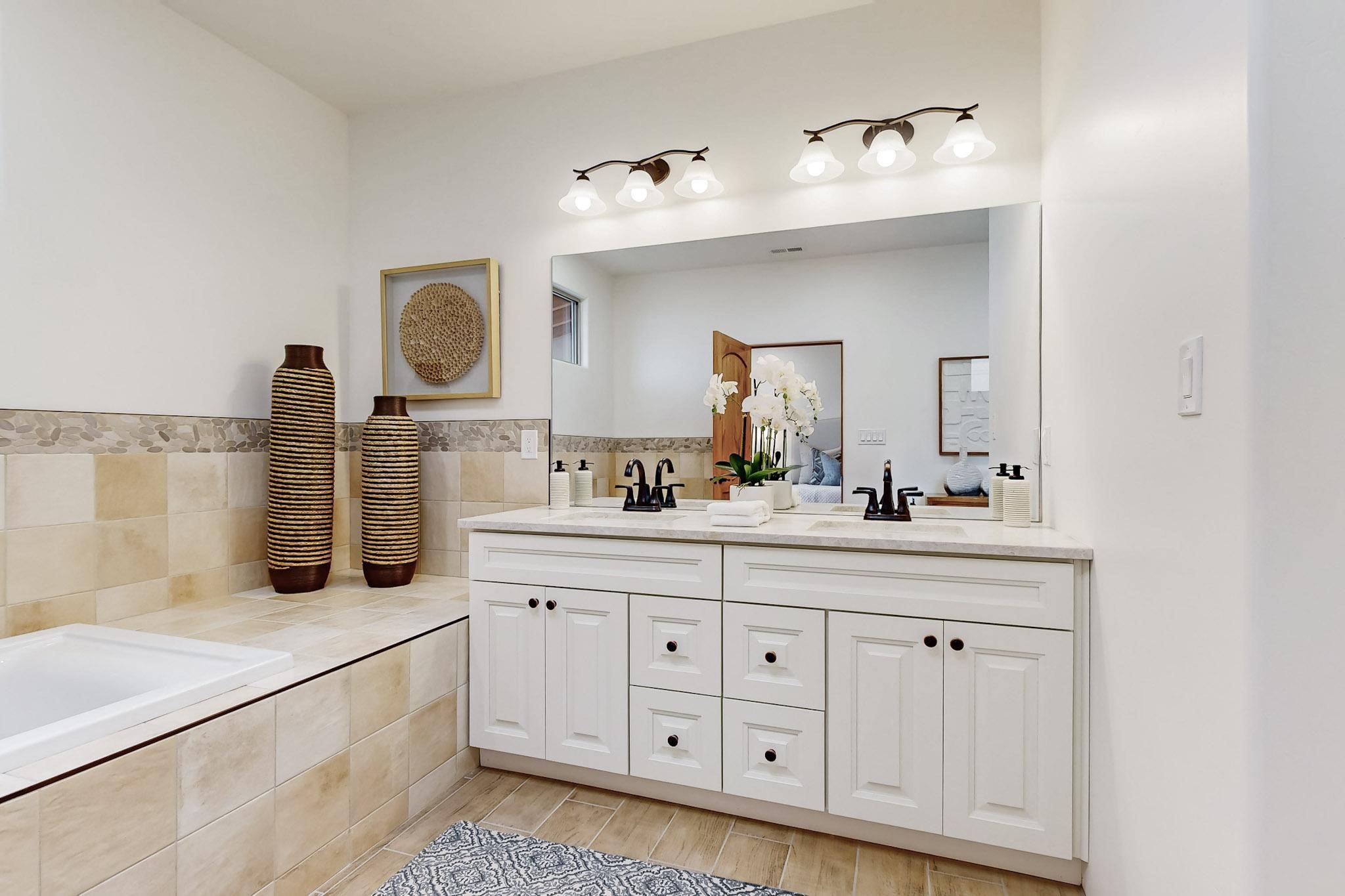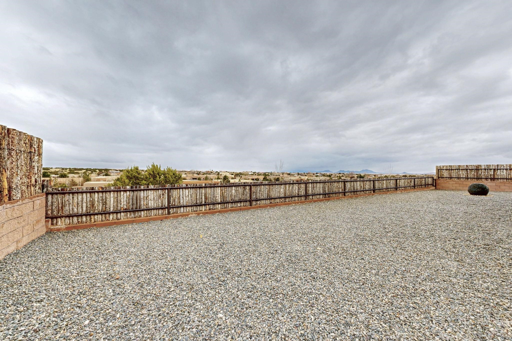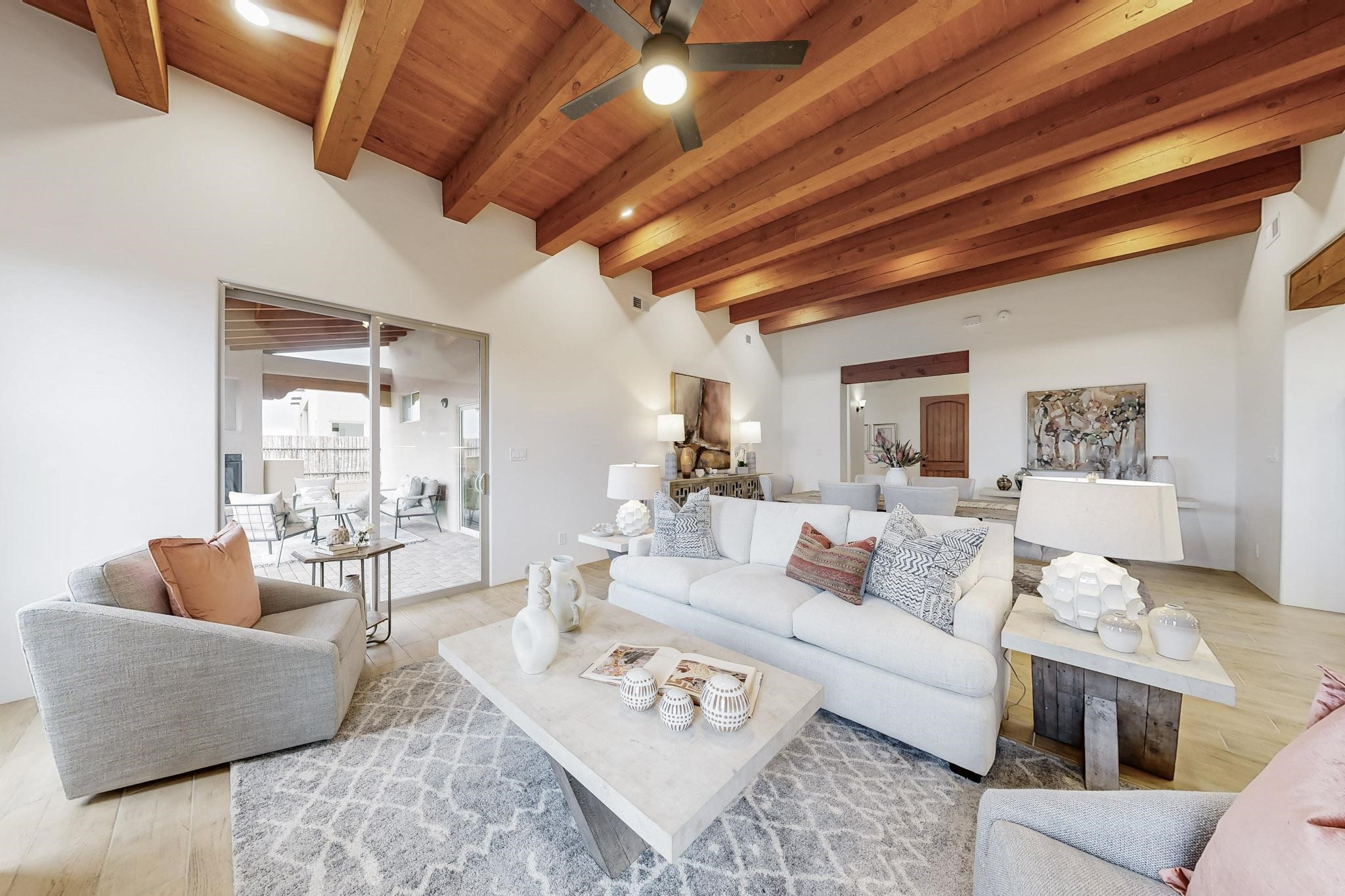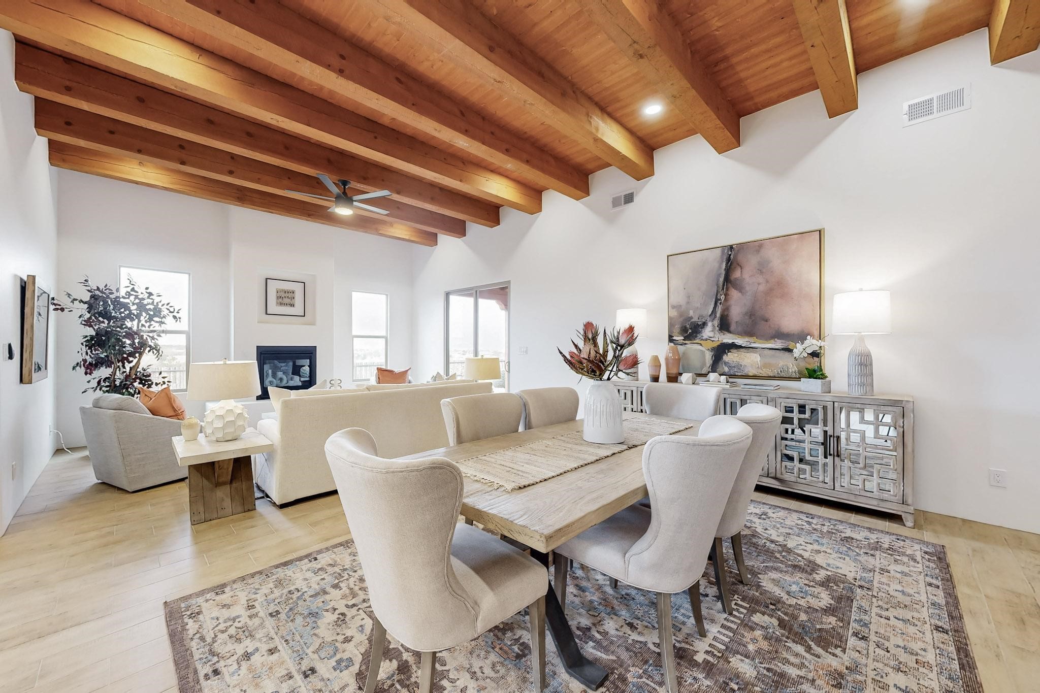 With a gated front courtyard wall and spectacular views to the south, this SanAntonio Plan consists of 2260 sq. ft., 3 bedrooms and 2 baths. Located at 30 LaPradera in the La Pradera Subdivision, the exterior is a pitched roof Spanishdesign with clay-like tile roofs and covered portals with heavy wood beams andbrick pavers. The 2-car driveway is a colored stamped- concrete design. Thehome is entered through an 8 ft. high door to a foyer with a boveda ceiling andbeige, wood-like porcelain floor tiles. To the left is a powder room and to theright is a hallway with a nicho-accented wall leading to the two (2) guestbedrooms. The foyer leads into the living/dining room which has a 12-foot-highceiling with cedar-stained wood beams and T & G trim and a gas fireplace. Theliving room and the owner's suite open out to a covered portal with brick paversand a gas-fired fireplace. The open kitchen has cream-colored cabinets. Anexceptionally large pantry is directly off the kitchen. The utility room is thenaccessed from the pantry and has ample cabinets, skylight, and a sink.The owner's bath has a large walk-in shower with euro-style shower fixturesand an overhead rain shower head. There is also an exceptionally large walk-incloset. The insulated garage includes a storage room and an epoxy-coated floor.