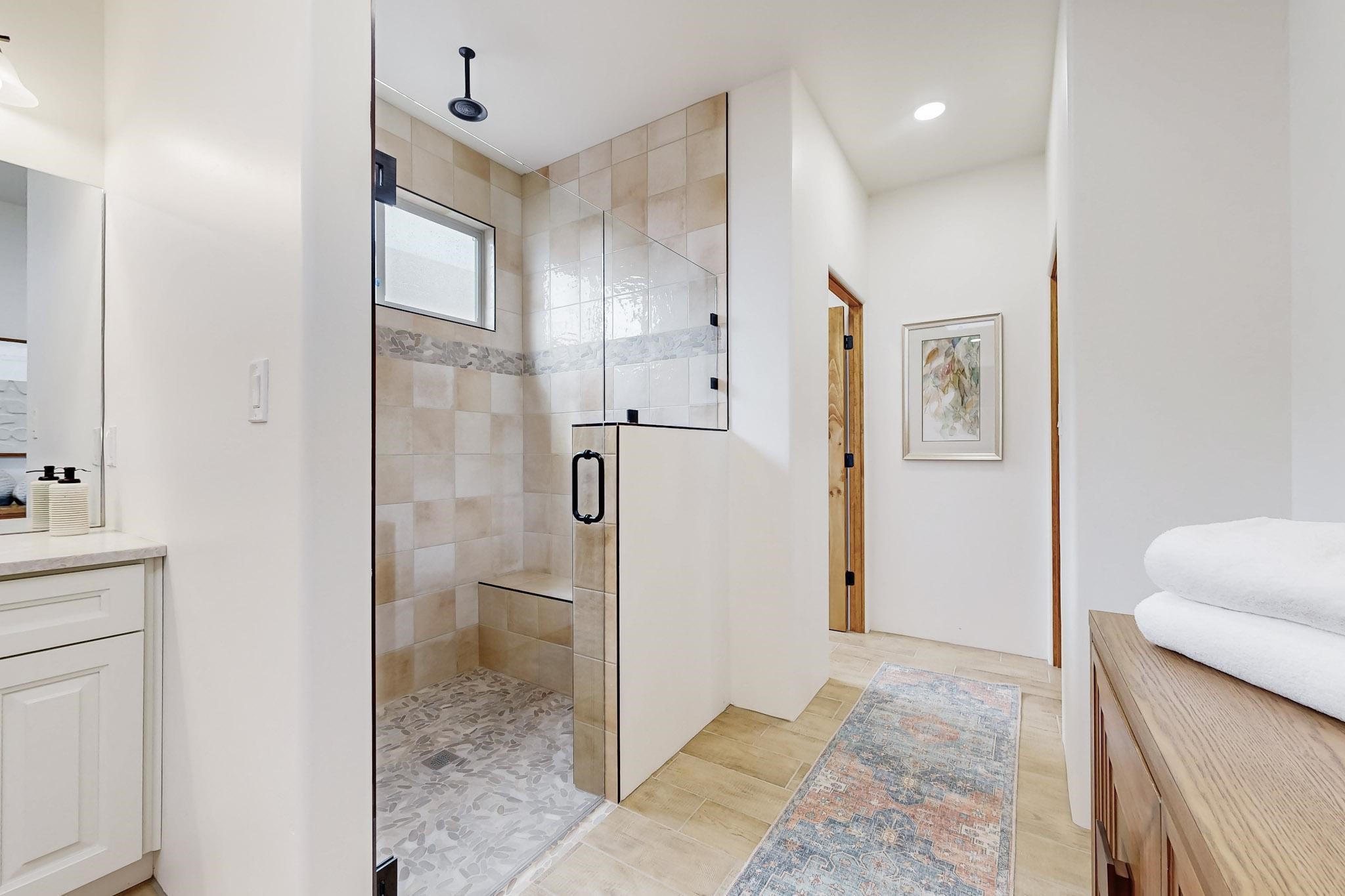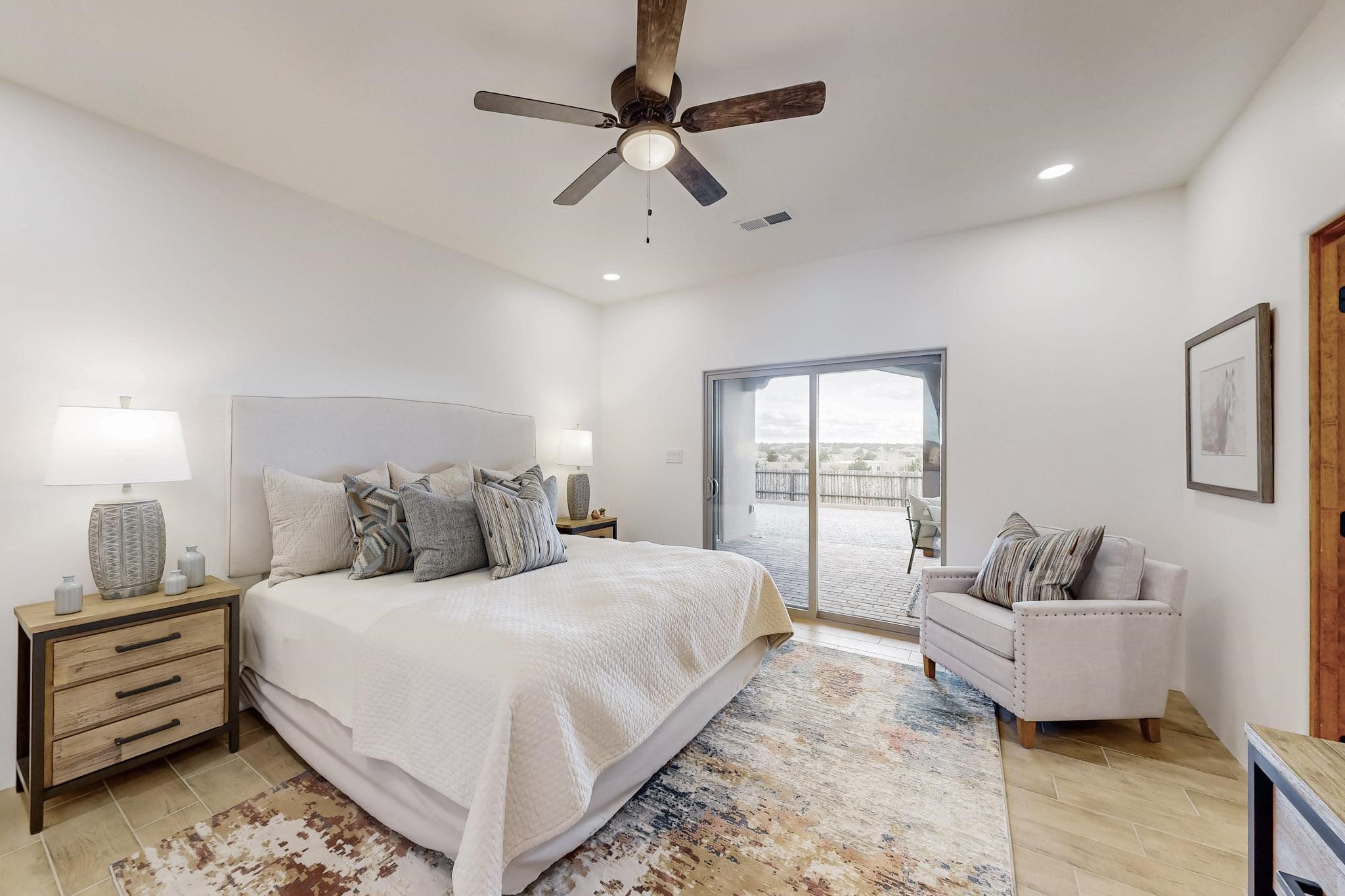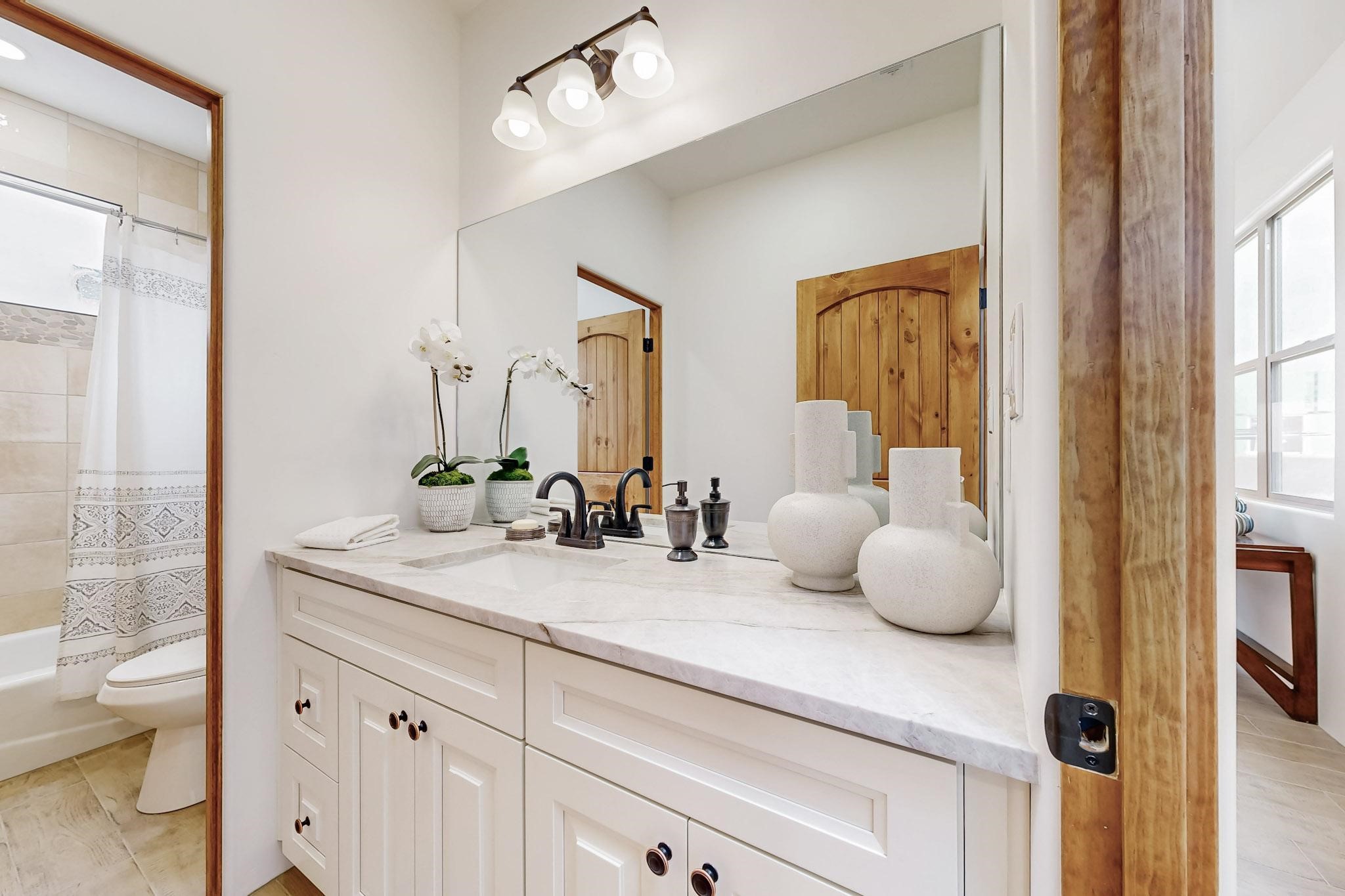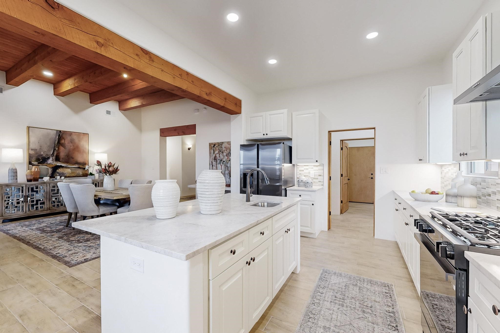 With a gated front courtyard wall and spectacular views to the south, this SanAntonio Plan consists of 2260 sq. ft., 3 bedrooms and 2 baths. Located at 30 LaPradera in the La Pradera Subdivision, the exterior is a pitched roof Spanishdesign with clay-like tile roofs and covered portals with heavy wood beams andbrick pavers. The 2-car driveway is a colored stamped- concrete design. Thehome is entered through an 8 ft. high door to a foyer with a boveda ceiling andbeige, wood-like porcelain floor tiles. To the left is a powder room and to theright is a hallway with a nicho-accented wall leading to the two (2) guestbedrooms. The foyer leads into the living/dining room which has a 12-foot-highceiling with cedar-stained wood beams and T & G trim and a gas fireplace. Theliving room and the owner's suite open out to a covered portal with brick paversand a gas-fired fireplace. The open kitchen has cream-colored cabinets. Anexceptionally large pantry is directly off the kitchen. The utility room is thenaccessed from the pantry and has ample cabinets, skylight, and a sink.The owner's bath has a large walk-in shower with euro-style shower fixturesand an overhead rain shower head. There is also an exceptionally large walk-incloset. The insulated garage includes a storage room and an epoxy-coated floor.