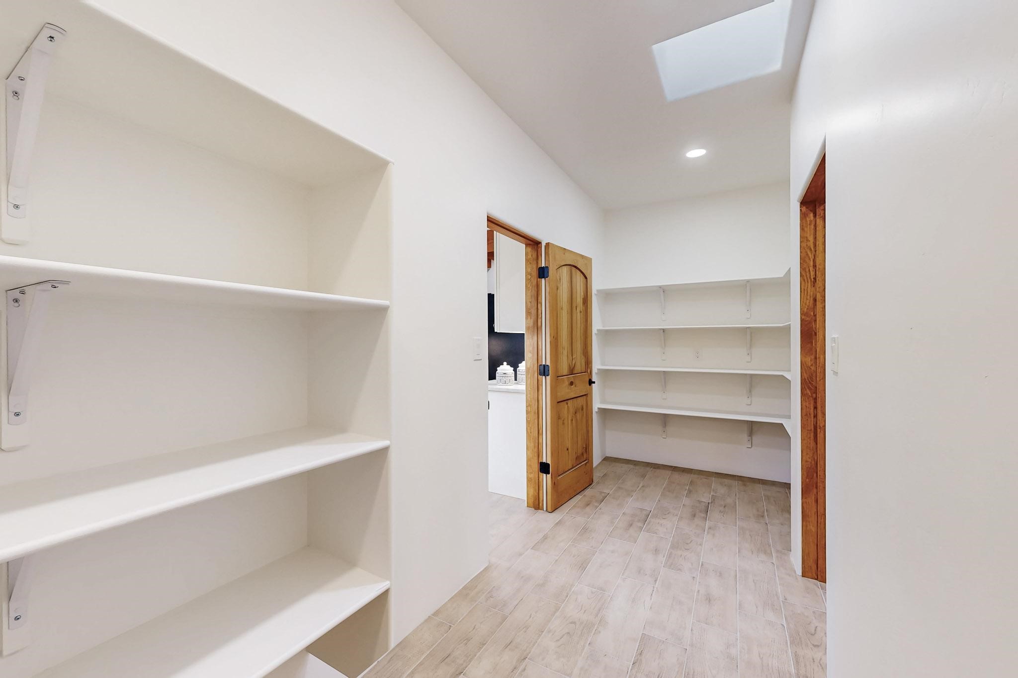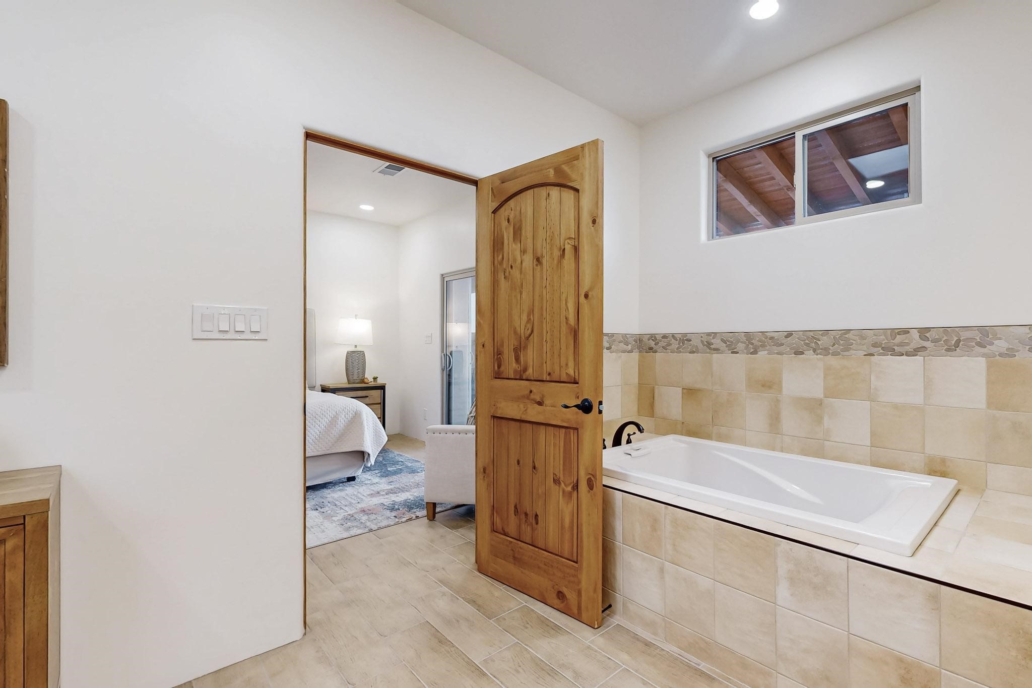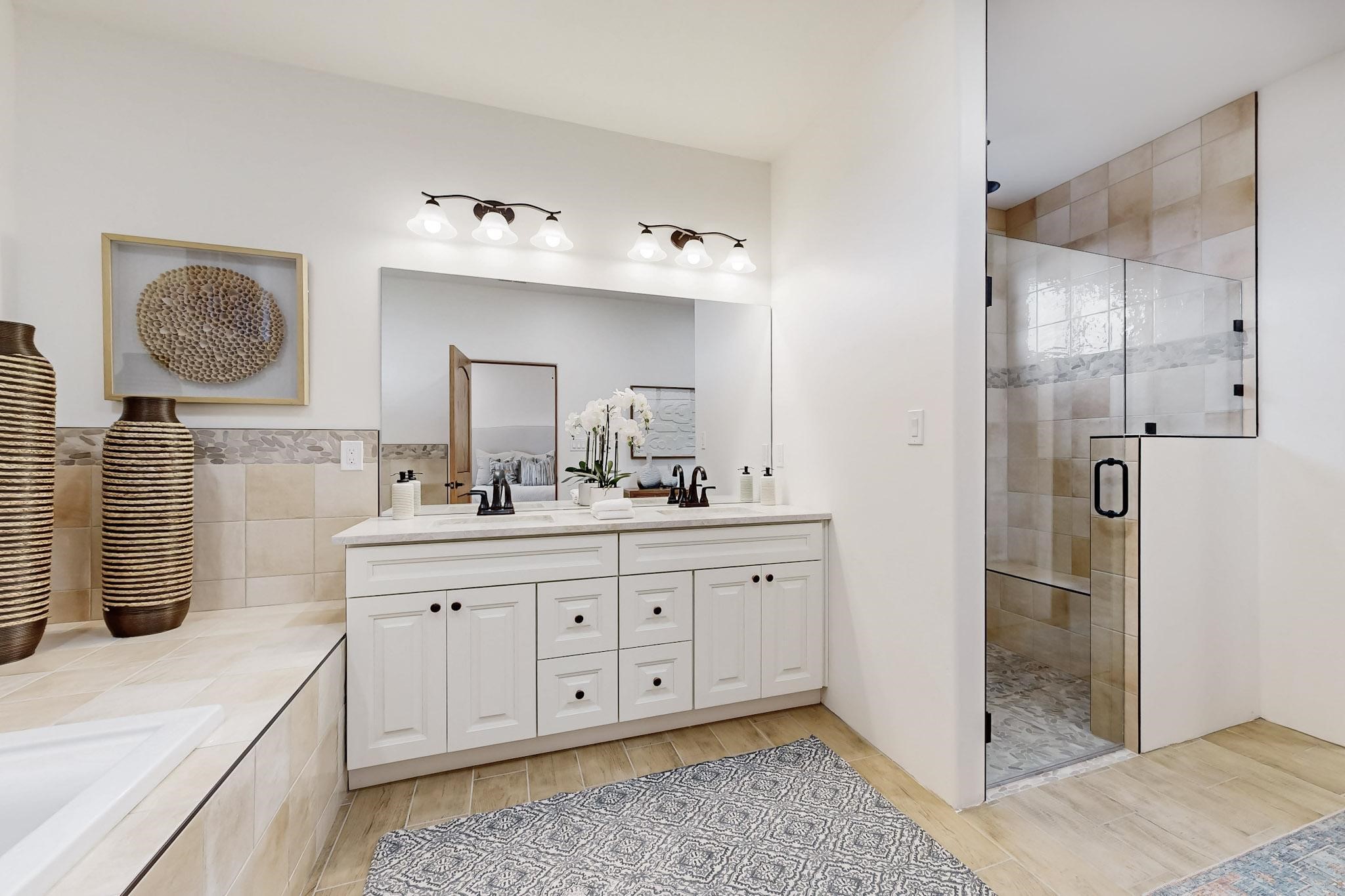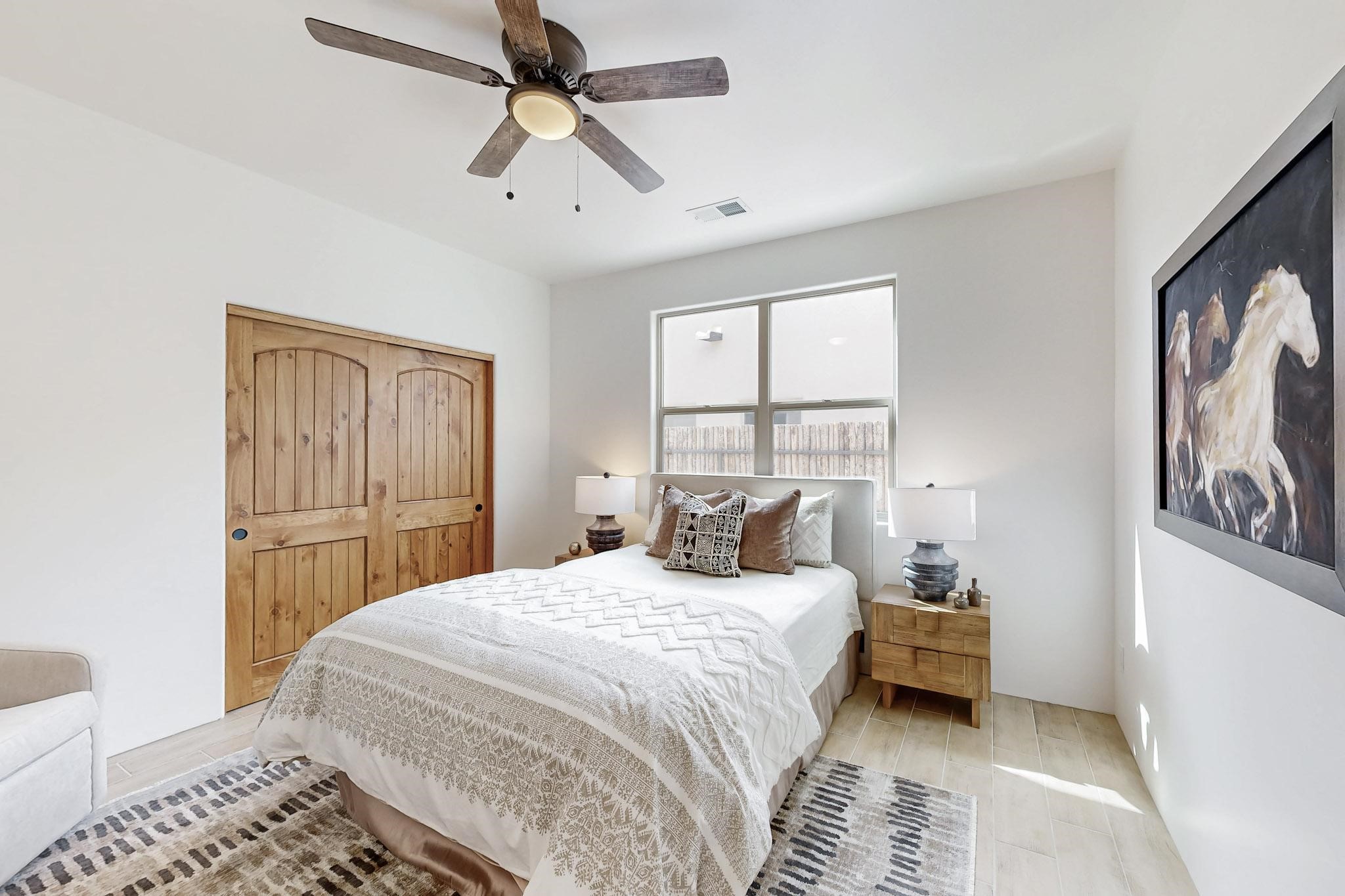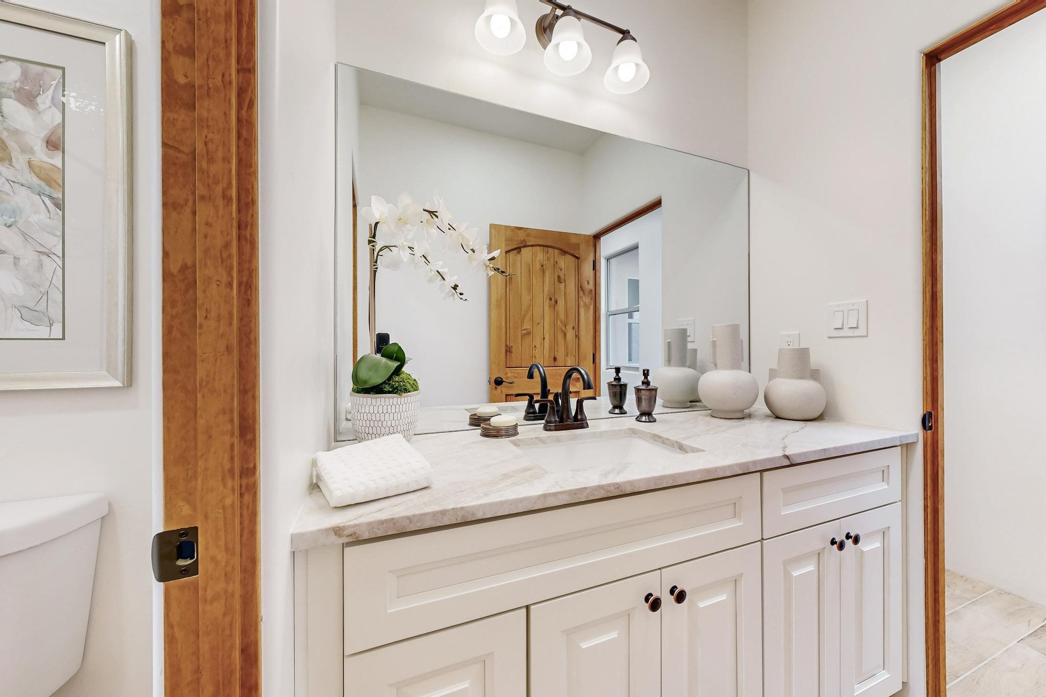 With a gated front courtyard wall and spectacular views to the south, this SanAntonio Plan consists of 2260 sq. ft., 3 bedrooms and 2 baths. Located at 30 LaPradera in the La Pradera Subdivision, the exterior is a pitched roof Spanishdesign with clay-like tile roofs and covered portals with heavy wood beams andbrick pavers. The 2-car driveway is a colored stamped- concrete design. Thehome is entered through an 8 ft. high door to a foyer with a boveda ceiling andbeige, wood-like porcelain floor tiles. To the left is a powder room and to theright is a hallway with a nicho-accented wall leading to the two (2) guestbedrooms. The foyer leads into the living/dining room which has a 12-foot-highceiling with cedar-stained wood beams and T & G trim and a gas fireplace. Theliving room and the owner's suite open out to a covered portal with brick paversand a gas-fired fireplace. The open kitchen has cream-colored cabinets. Anexceptionally large pantry is directly off the kitchen. The utility room is thenaccessed from the pantry and has ample cabinets, skylight, and a sink.The owner's bath has a large walk-in shower with euro-style shower fixturesand an overhead rain shower head. There is also an exceptionally large walk-incloset. The insulated garage includes a storage room and an epoxy-coated floor.