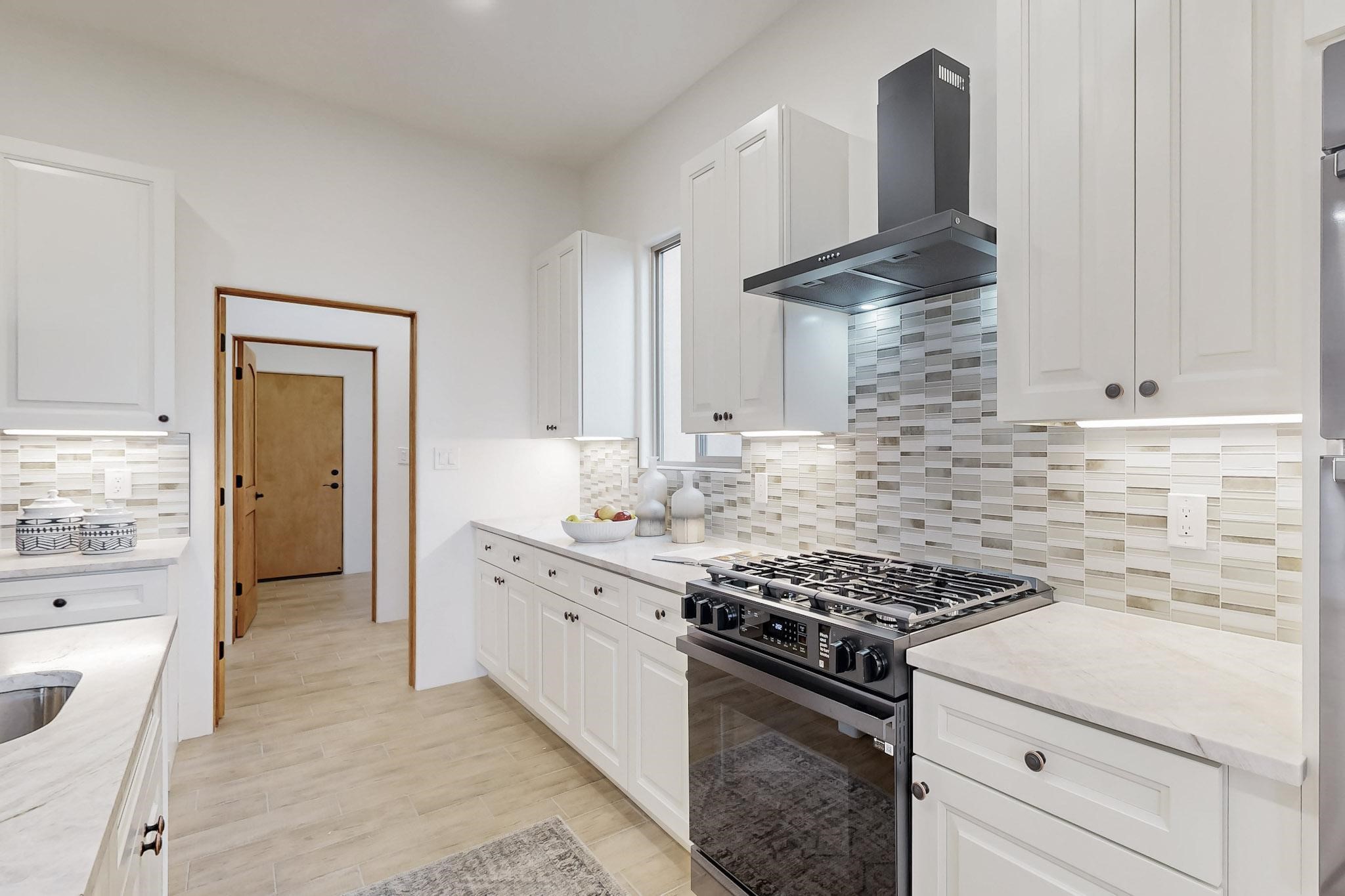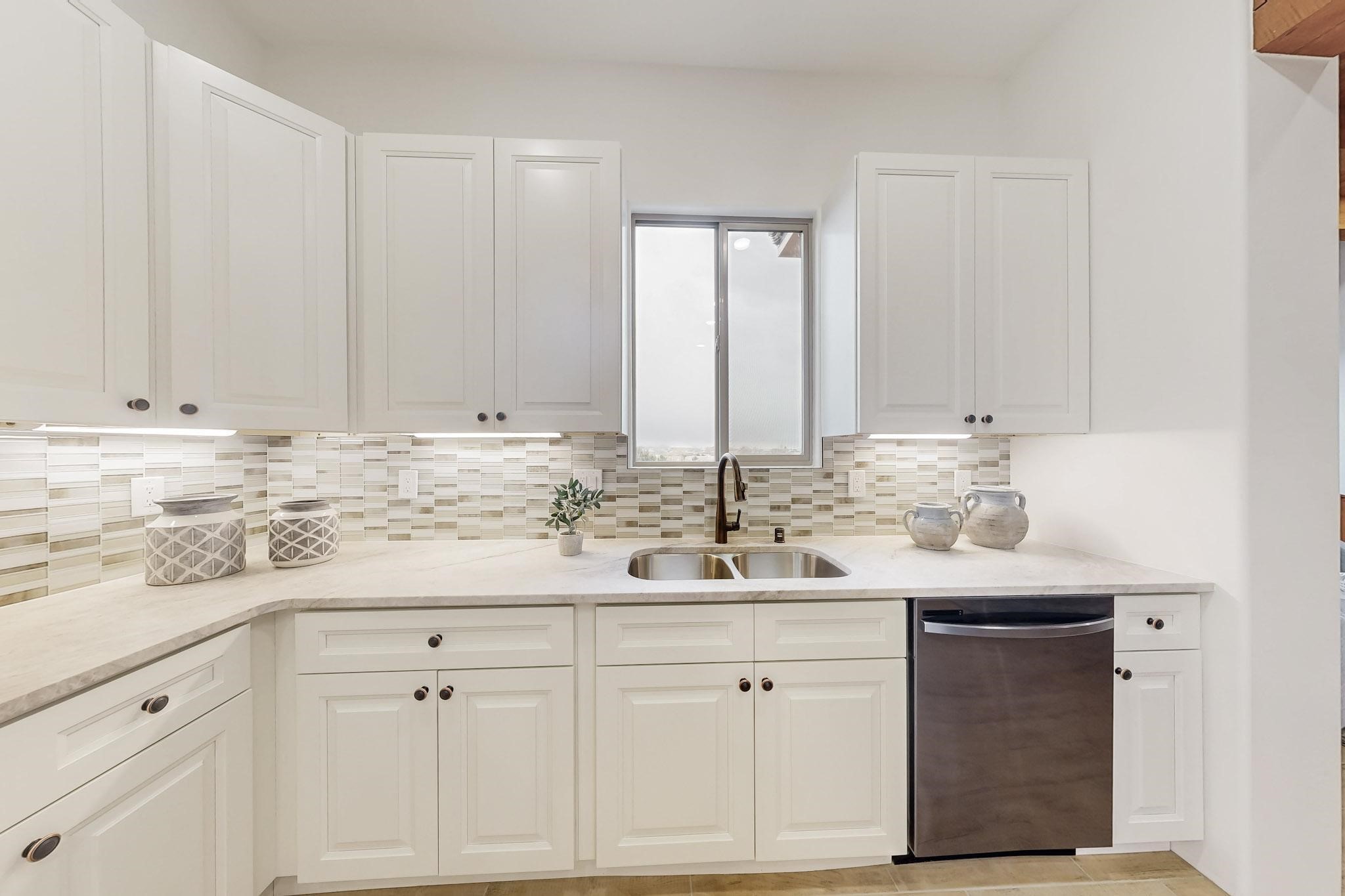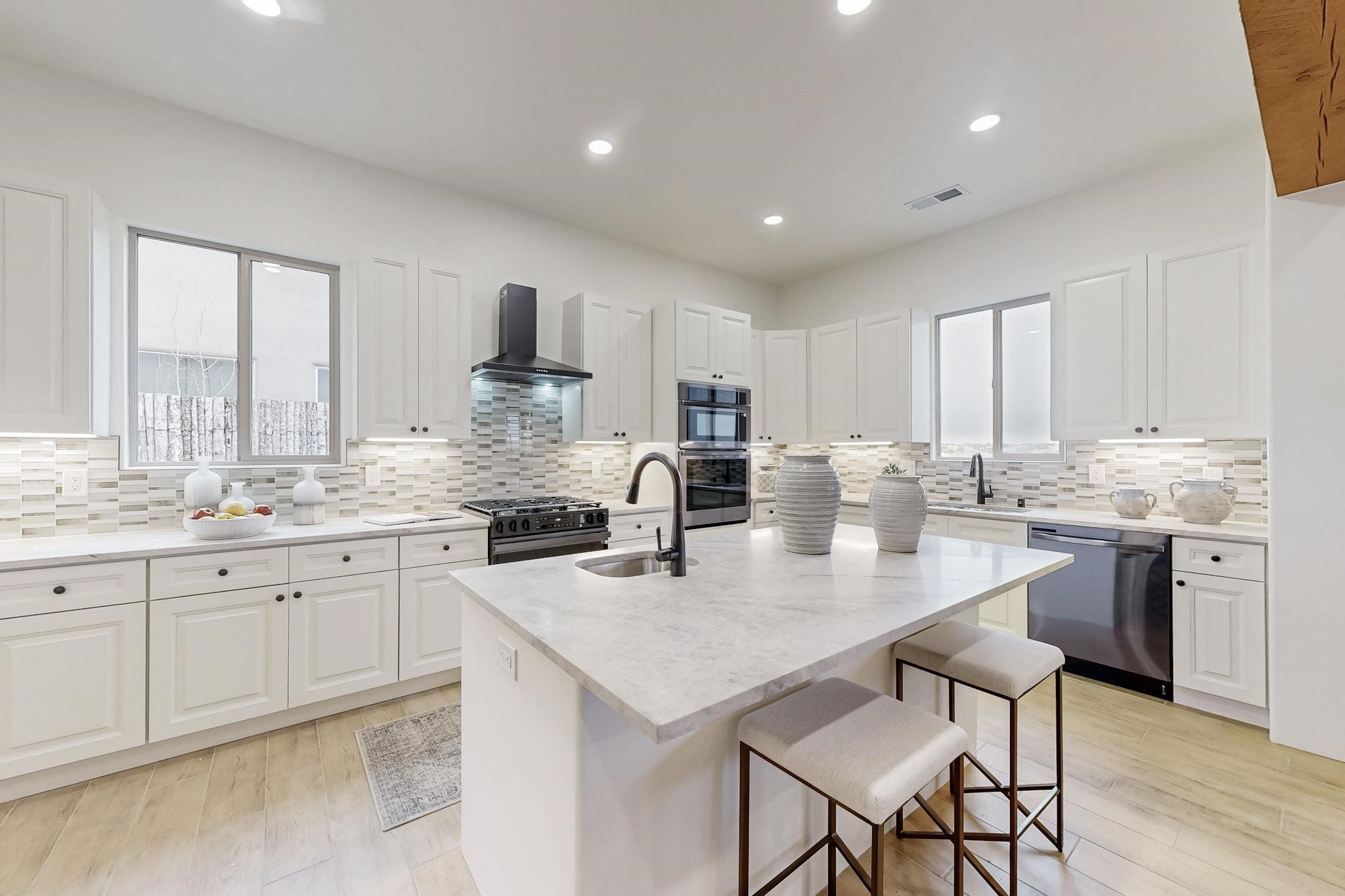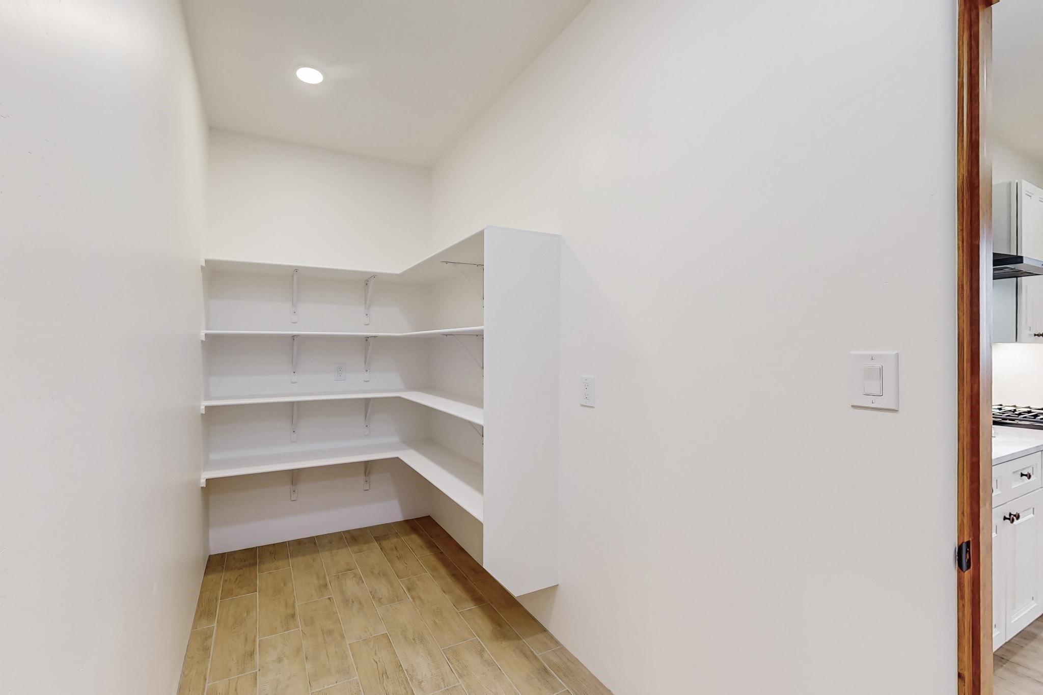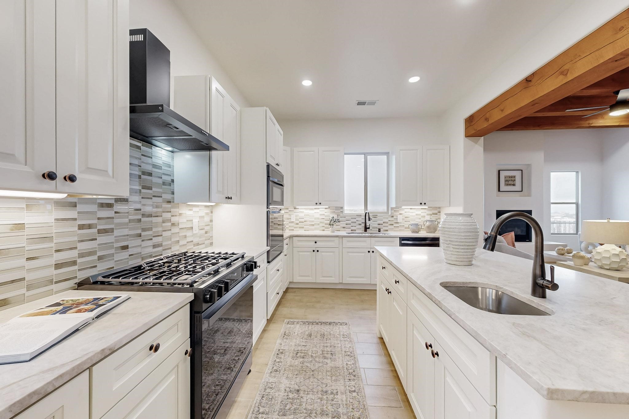 With a gated front courtyard wall and spectacular views to the south, this SanAntonio Plan consists of 2260 sq. ft., 3 bedrooms and 2 baths. Located at 30 LaPradera in the La Pradera Subdivision, the exterior is a pitched roof Spanishdesign with clay-like tile roofs and covered portals with heavy wood beams andbrick pavers. The 2-car driveway is a colored stamped- concrete design. Thehome is entered through an 8 ft. high door to a foyer with a boveda ceiling andbeige, wood-like porcelain floor tiles. To the left is a powder room and to theright is a hallway with a nicho-accented wall leading to the two (2) guestbedrooms. The foyer leads into the living/dining room which has a 12-foot-highceiling with cedar-stained wood beams and T & G trim and a gas fireplace. Theliving room and the owner's suite open out to a covered portal with brick paversand a gas-fired fireplace. The open kitchen has cream-colored cabinets. Anexceptionally large pantry is directly off the kitchen. The utility room is thenaccessed from the pantry and has ample cabinets, skylight, and a sink.The owner's bath has a large walk-in shower with euro-style shower fixturesand an overhead rain shower head. There is also an exceptionally large walk-incloset. The insulated garage includes a storage room and an epoxy-coated floor.