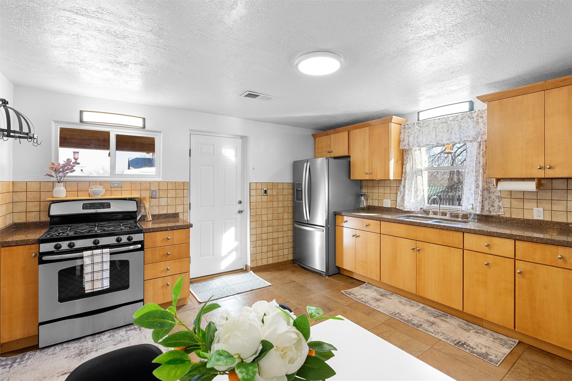 Tucked into the heart of El Rancho, this warm and welcoming adobe home offers the perfect balance of peace, privacy, and possibility. Set on nearly half an acre backing onto open pueblo land, the property enjoys sweeping mountain views and a deep sense of quiet--a true retreat, yet only 20 minutes from Los Alamos, Santa Fe, or Espaola.Inside, you'll find two bedrooms, one and a half bathrooms, and two spacious living areas, including a back den that easily doubles as a third bedroom, home office, creative studio, or flex space. Tongue-and-groove wood walls and ceilings add rustic character throughout, while thick adobe construction and a cozy wood stove help keep the home naturally temperate year-round. The largest bedroom features a hand-carved, built-in wardrobe--an artisan touch that echoes the home's heritage.The updated kitchen includes quartz countertops and newer appliances, blending traditional style with modern function. Outdoors, a 12'x20' pergola with stamped concrete flooring, overhead lighting, and a metal roof with a fan extends your living space and sets the stage for slow mornings, sunset dinners, and weekend gatherings.Additional spaces include a tandem two-car garage with 240V power, a 22'x22' detached workshop with a loft, electricity, and plumbing rough-ins--ideal for hobbyists or creatives--and an 8'x20' shed with electricity. The renovated Laredo 5th Wheel RV is hooked up to water, electricity, and septic, and has served as a guest space or income-producing rental. It is available for purchase separately. High-speed Starlink internet service transfers with the home, keeping you connected while enjoying the best of rural Northern New Mexico.Whether you're craving a quiet homestead, space for artistic pursuits, or a place to live and work close to nature, this property offers room to dream. Experience the lifestyle of Northern New Mexico--relaxed, rooted, and richly connected to the land.
