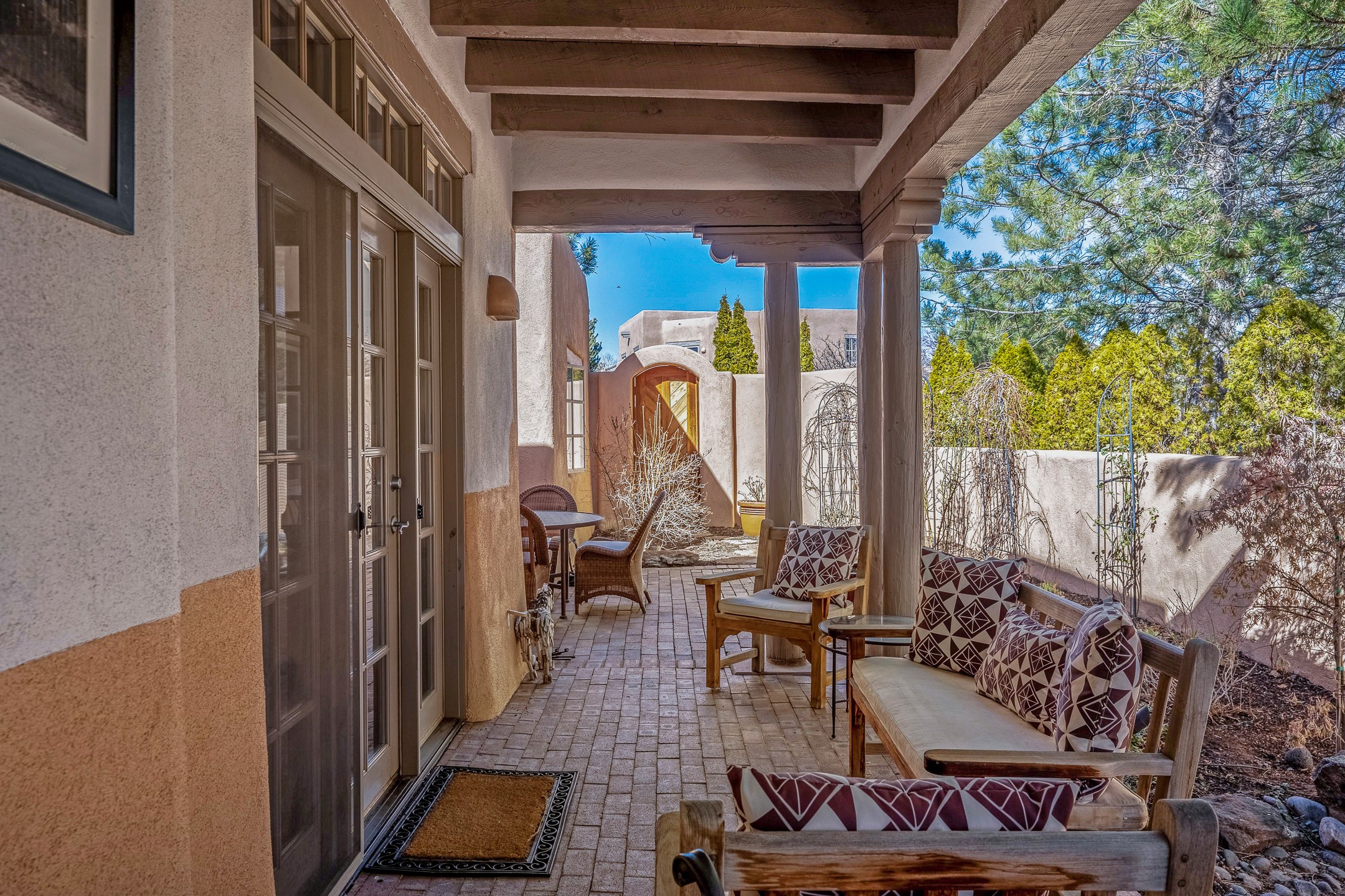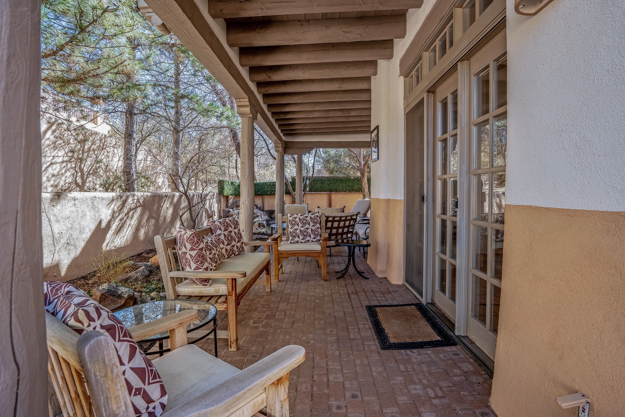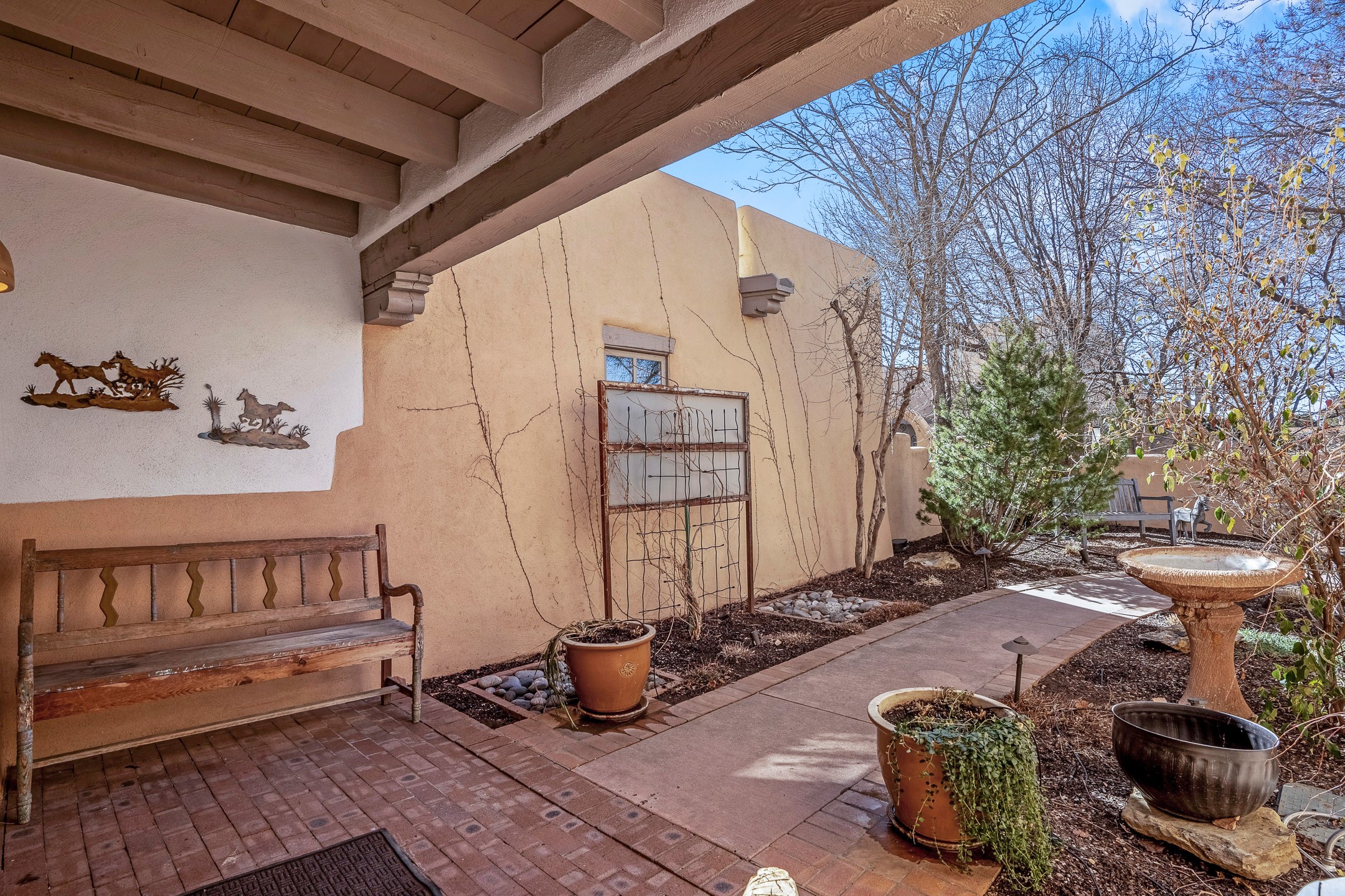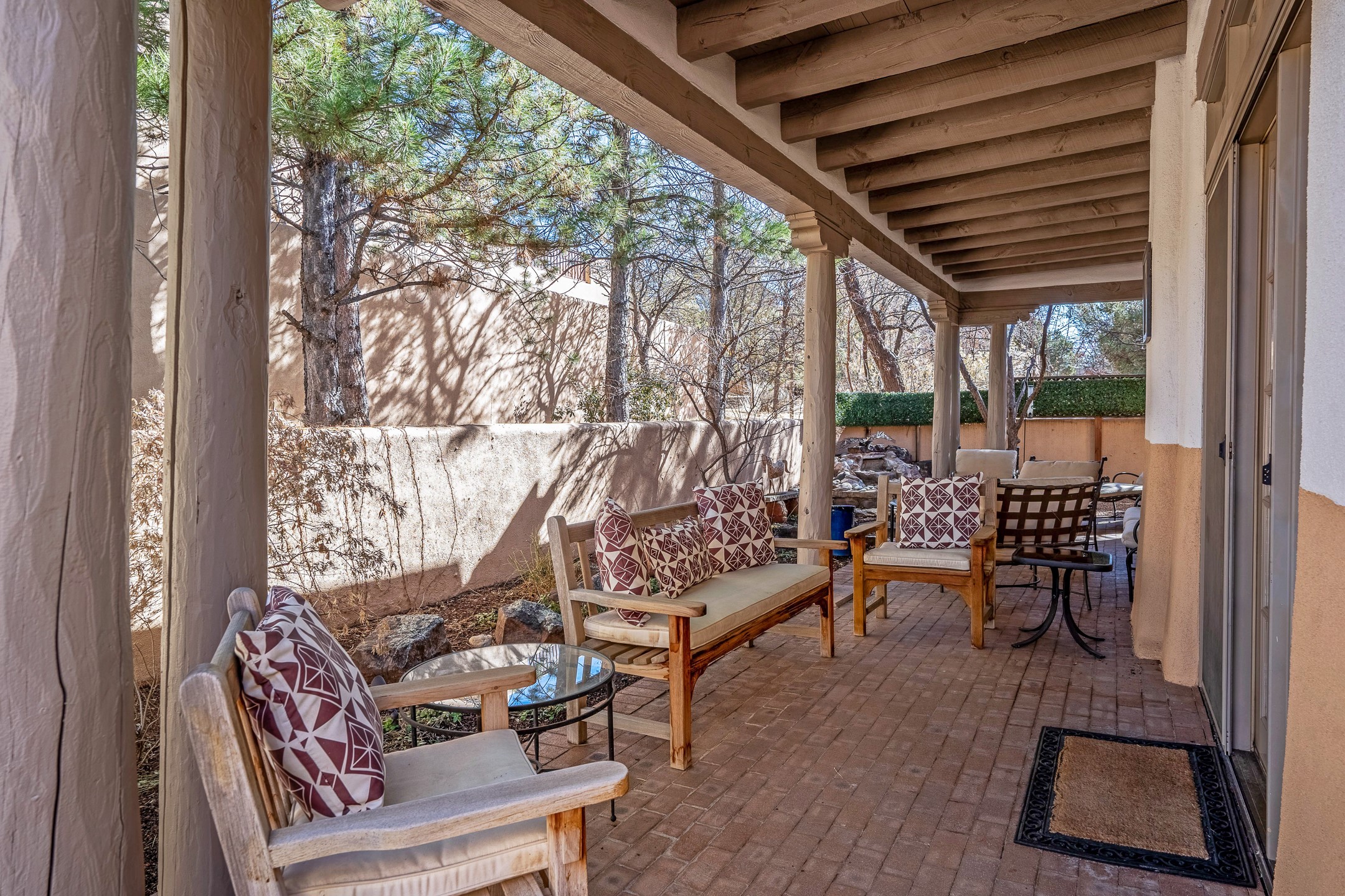Discover the essence of Santa Fe living in this elegant Pinon B floor plan, offering 1640 Sq Ft of beautifully designed space within the coveted Quail Run Community. From the moment you step through the expansive front courtyard, you'll be welcomed by classic Southwestern warmth and character. Inside, rich Santa Fe influences abound, including viga ceilings, kiva fireplaces and saltillo tile floors, creating a timeless and inviting atmosphere. The well-appointed kitchen and open living area flow effortlessly to the private back portal, a serene retreat perfect for outdoor relaxation or entertaining. Beyond the condos appeal, Quail Run offers unparalleled amenities, just minutes from Santa Fe's vibrant Plaza and Canyon Road.