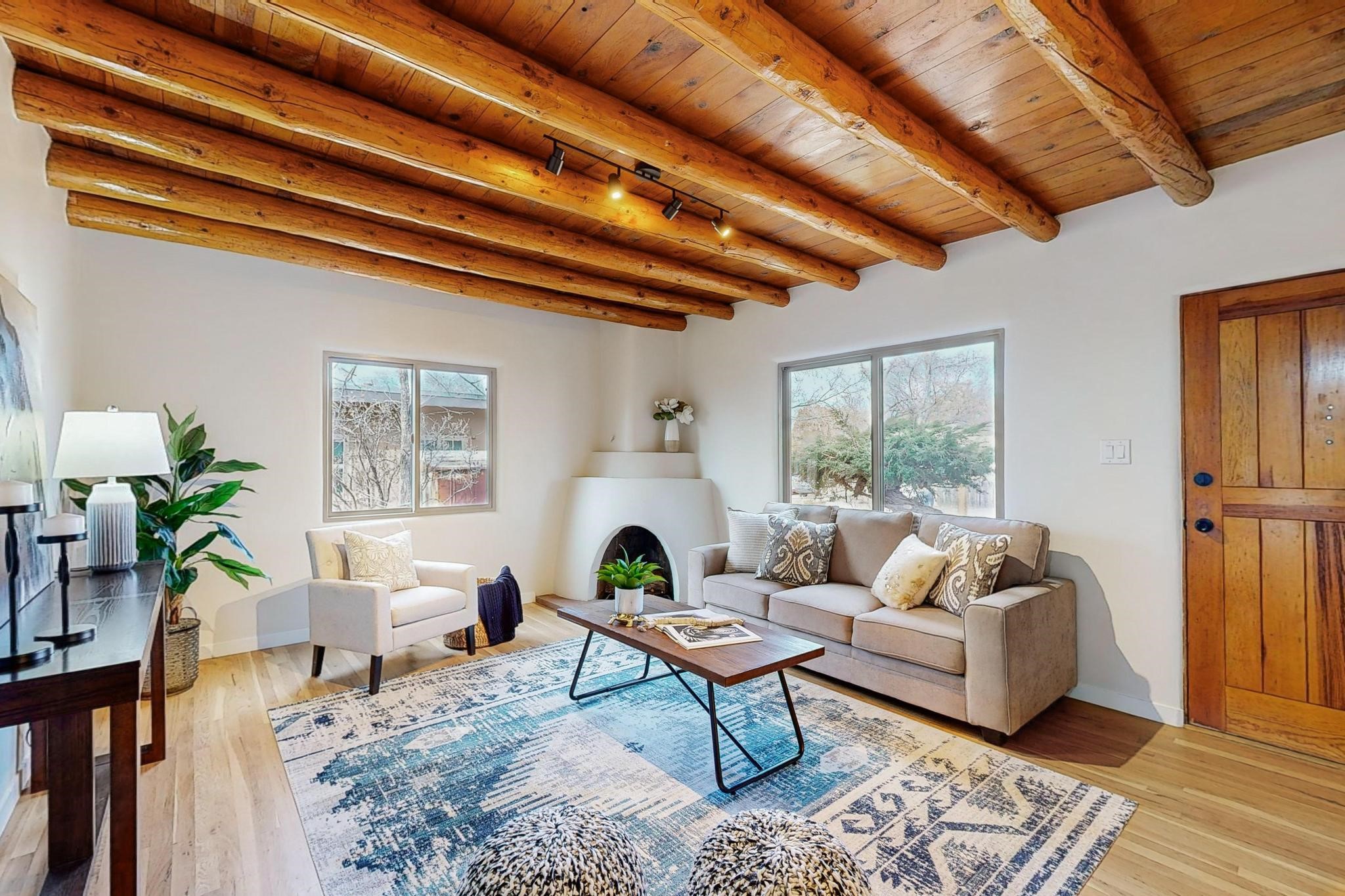 Discover the perfect balance of classic Santa Fe charm and contemporary living in this beautiful 3 bedroom, 2 bath Allen Stamm home, nestled in the highly sought-after Casa Alegre neighborhood. This home showcases hallmark Stamm features including exposed vigas, original hardwood floors, and two stunning fireplaces- a cozy Kiva and a traditional wood-burning hearth- that infuse warmth and character throughout. Enjoy the flexibility of two living spaces. The chef's kitchen is both stylish and functional, boasting quartz countertops, updated appliances, & an expansive 8-foot island with a built-in beverage fridge, ideal for casual gatherings or culinary creations. A bonus office space with a private entrance offers flexibility for remote work, creative pursuits, or a peaceful retreat. The primary bathroom invites relaxation with a large soaking tub, perfect for unwinding after a busy day. Outside is a spacious backyard designed for entertaining, gardening, or simply savoring serene Santa Fe sunsets. A convenient wash station off the back door makes cleanup after outdoor activities a breeze. With new windows, ample parking, and a central location close to Santa Fe's vibrant amenities, this home offers the perfect blend of comfort, charm, and convenience in one of the city's most desirable neighborhoods. Schedule your showing today!
