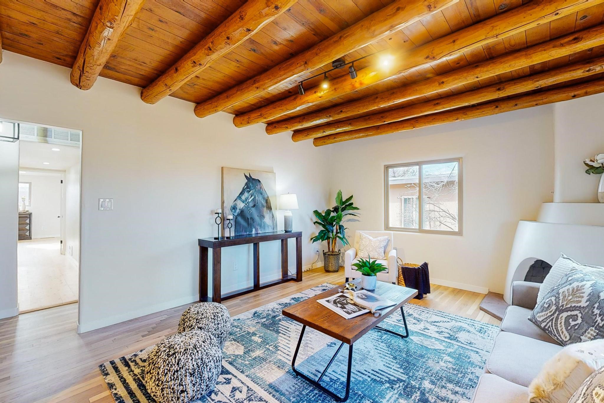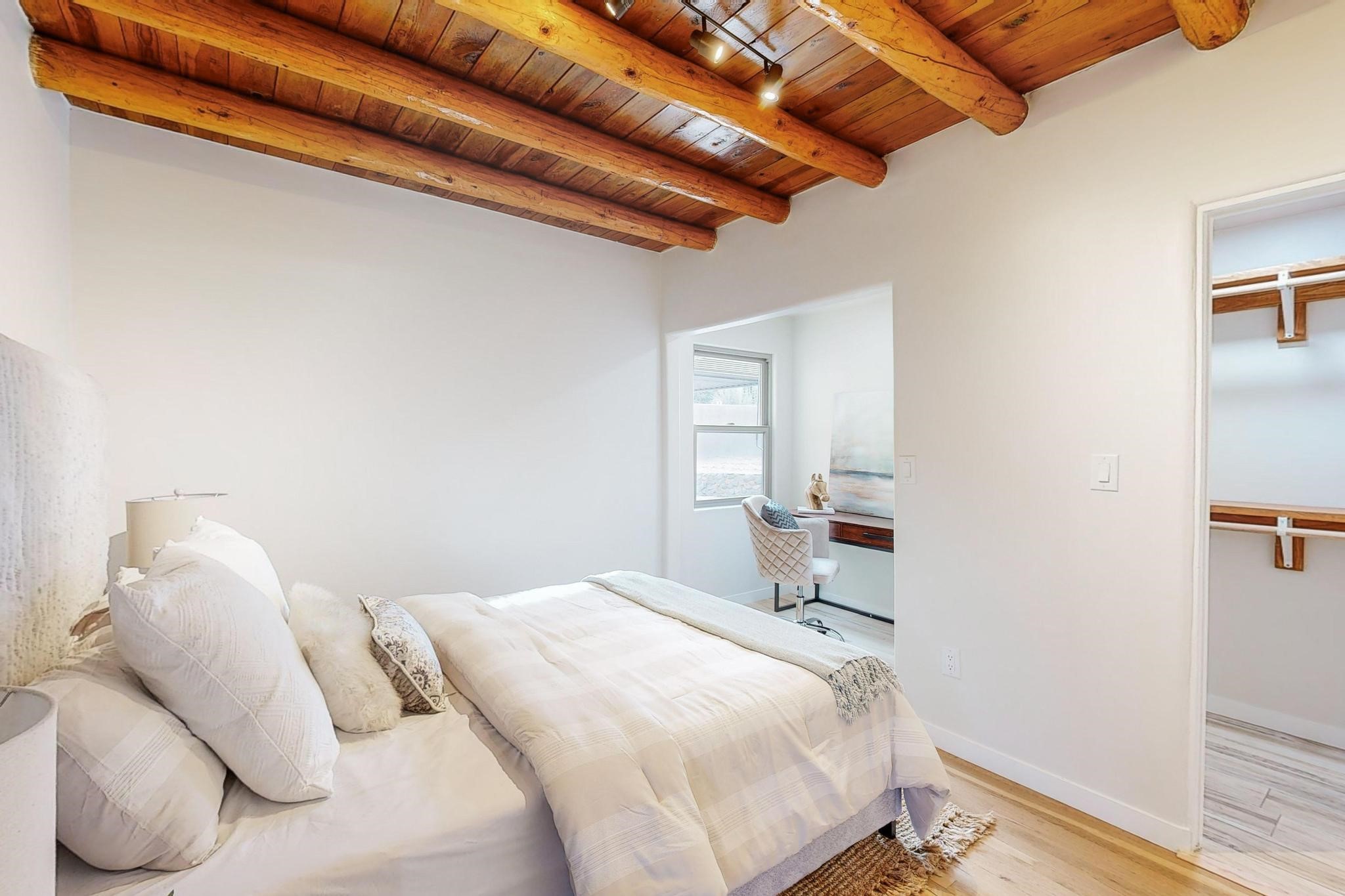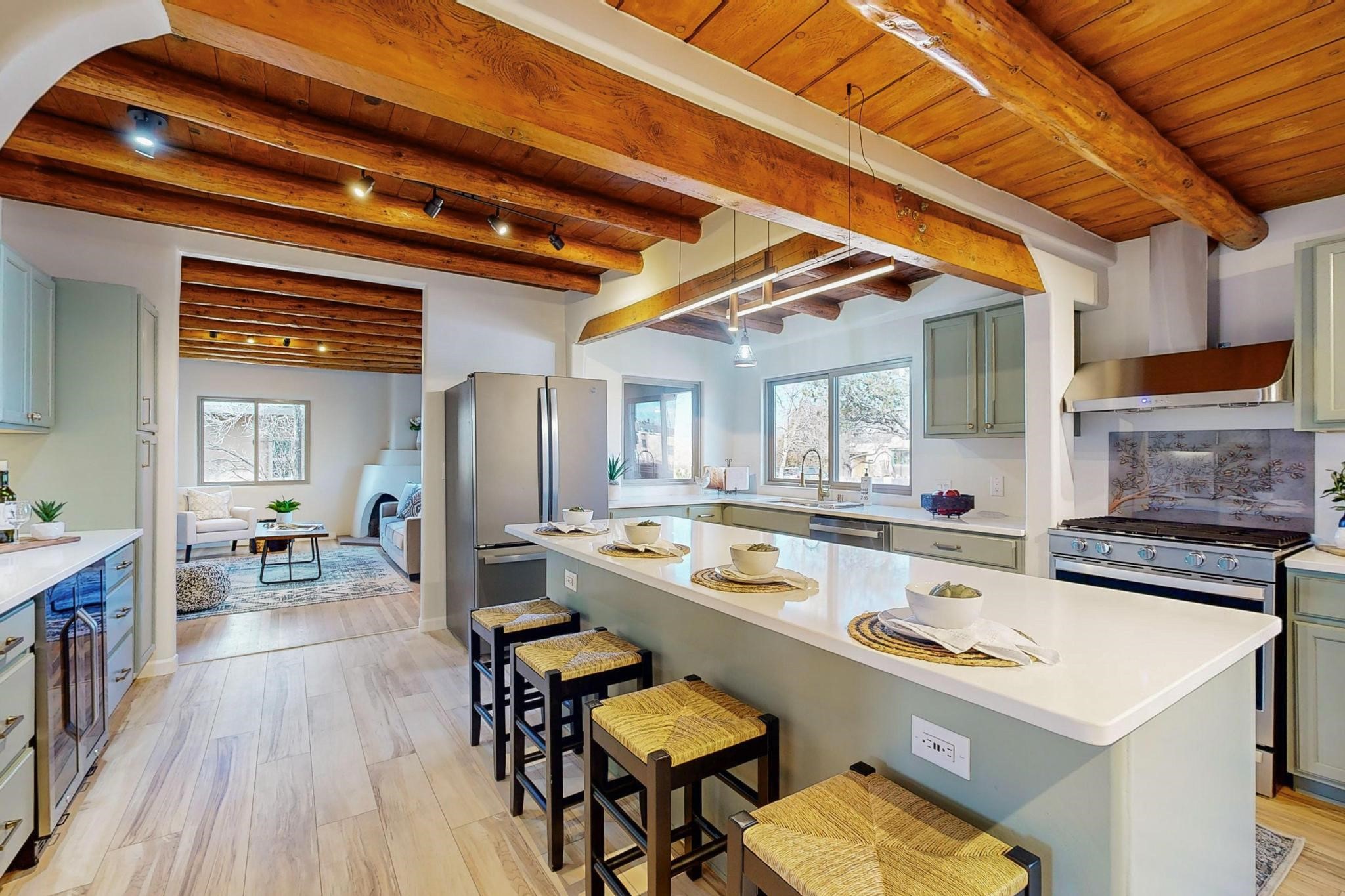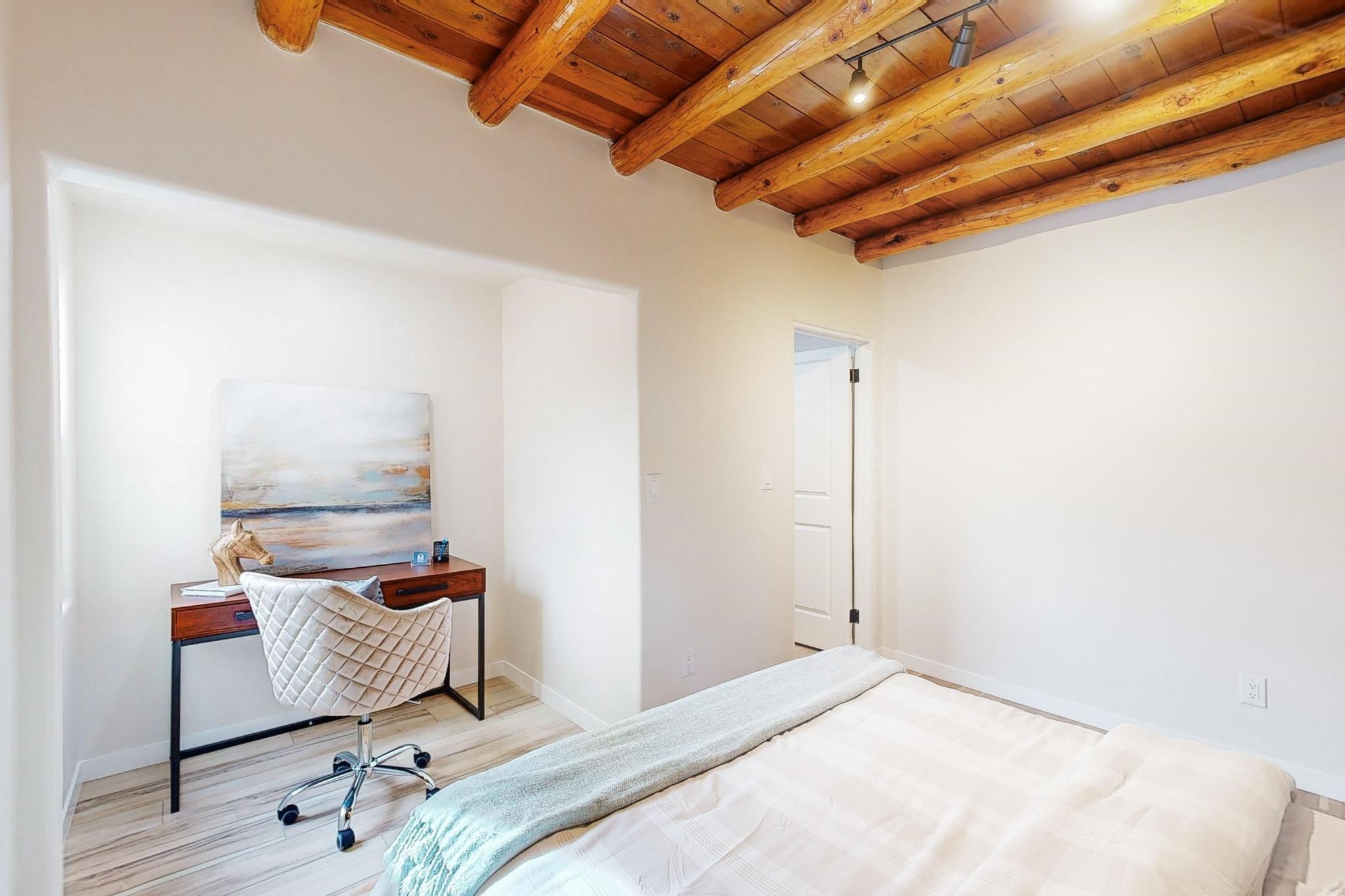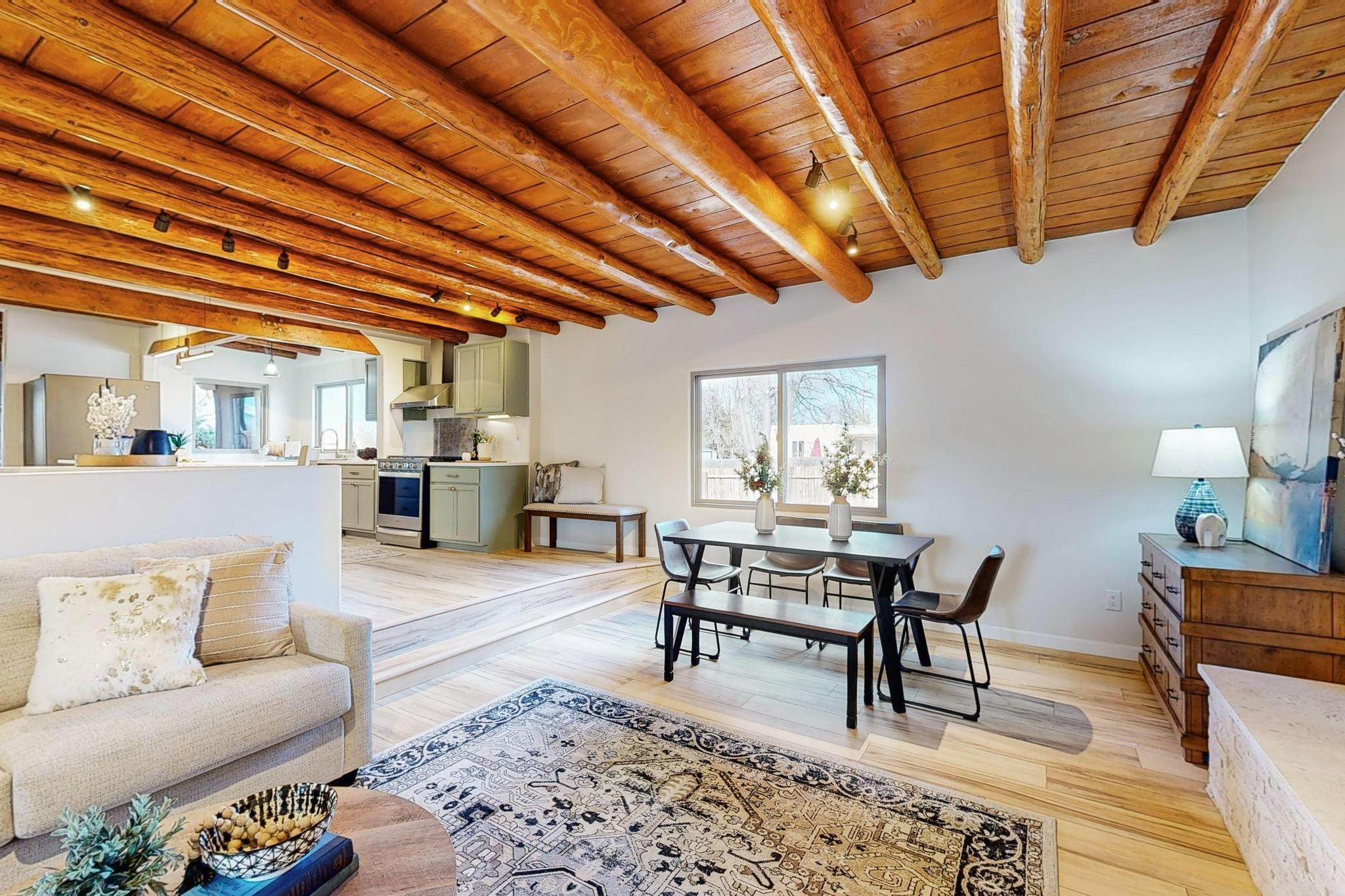 Discover the perfect balance of classic Santa Fe charm and contemporary living in this beautiful 3 bedroom, 2 bath Allen Stamm home, nestled in the highly sought-after Casa Alegre neighborhood. This home showcases hallmark Stamm features including exposed vigas, original hardwood floors, and two stunning fireplaces- a cozy Kiva and a traditional wood-burning hearth- that infuse warmth and character throughout. Enjoy the flexibility of two living spaces. The chef's kitchen is both stylish and functional, boasting quartz countertops, updated appliances, & an expansive 8-foot island with a built-in beverage fridge, ideal for casual gatherings or culinary creations. A bonus office space with a private entrance offers flexibility for remote work, creative pursuits, or a peaceful retreat. The primary bathroom invites relaxation with a large soaking tub, perfect for unwinding after a busy day. Outside is a spacious backyard designed for entertaining, gardening, or simply savoring serene Santa Fe sunsets. A convenient wash station off the back door makes cleanup after outdoor activities a breeze. With new windows, ample parking, and a central location close to Santa Fe's vibrant amenities, this home offers the perfect blend of comfort, charm, and convenience in one of the city's most desirable neighborhoods. Schedule your showing today!