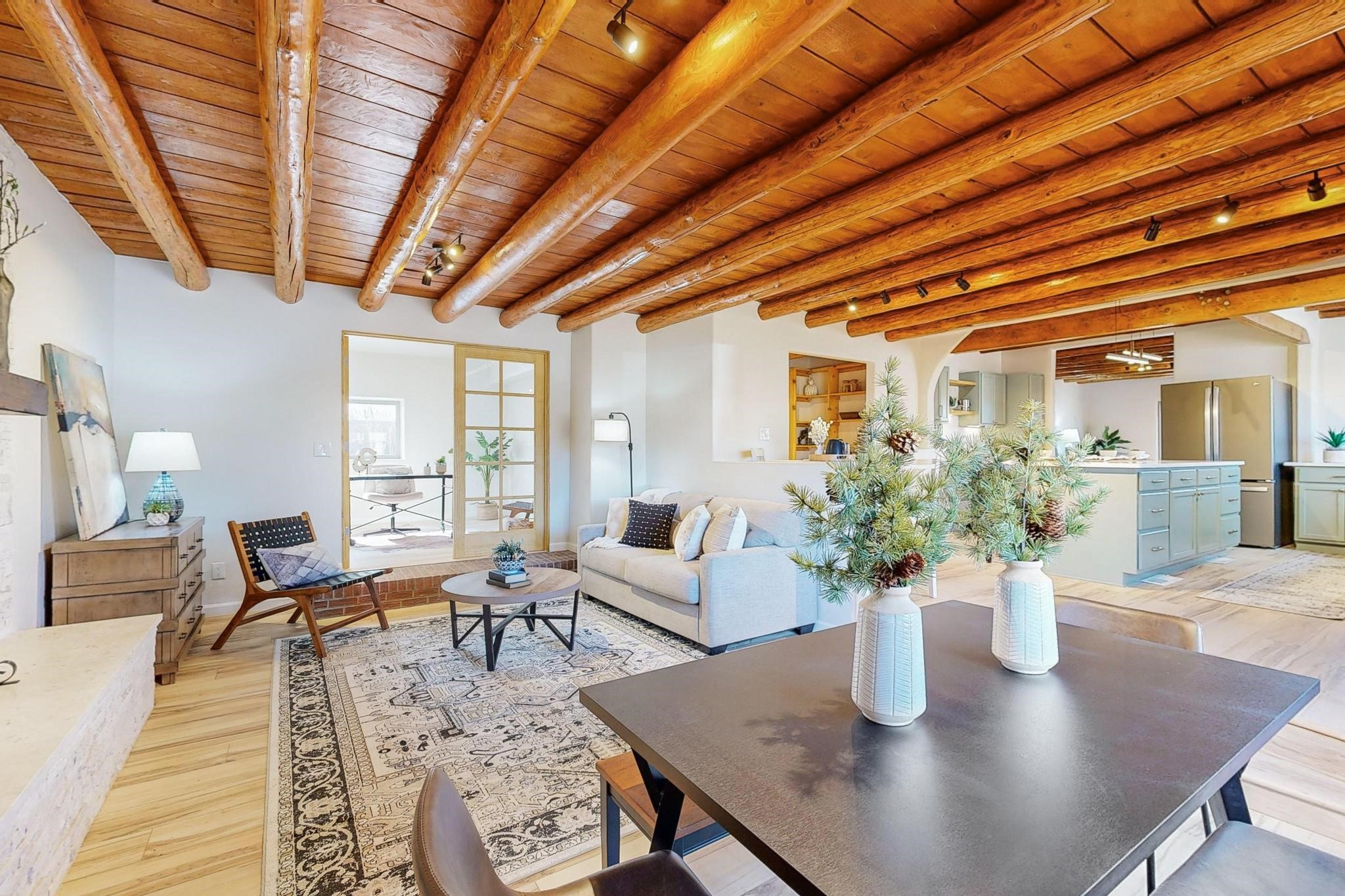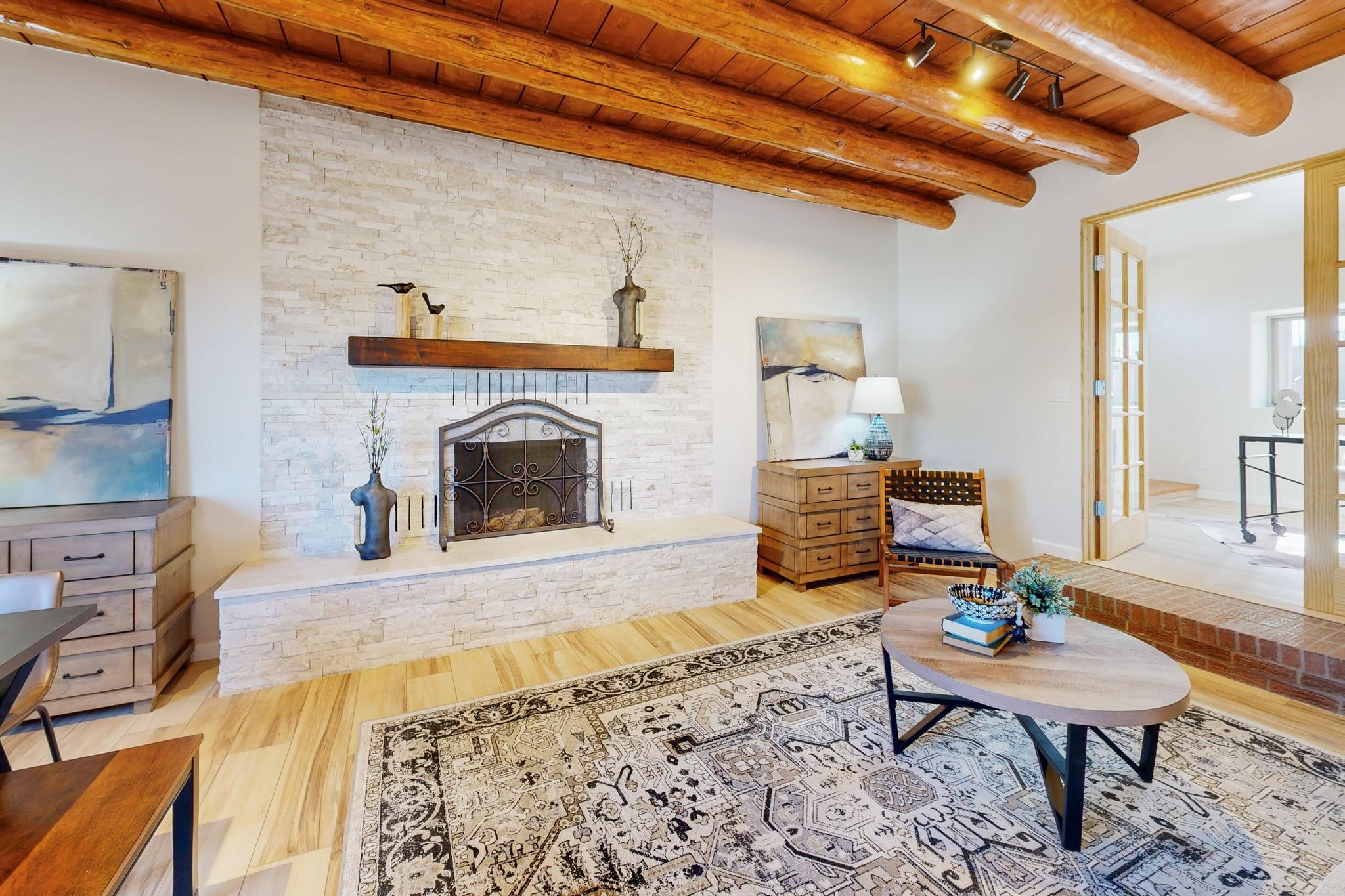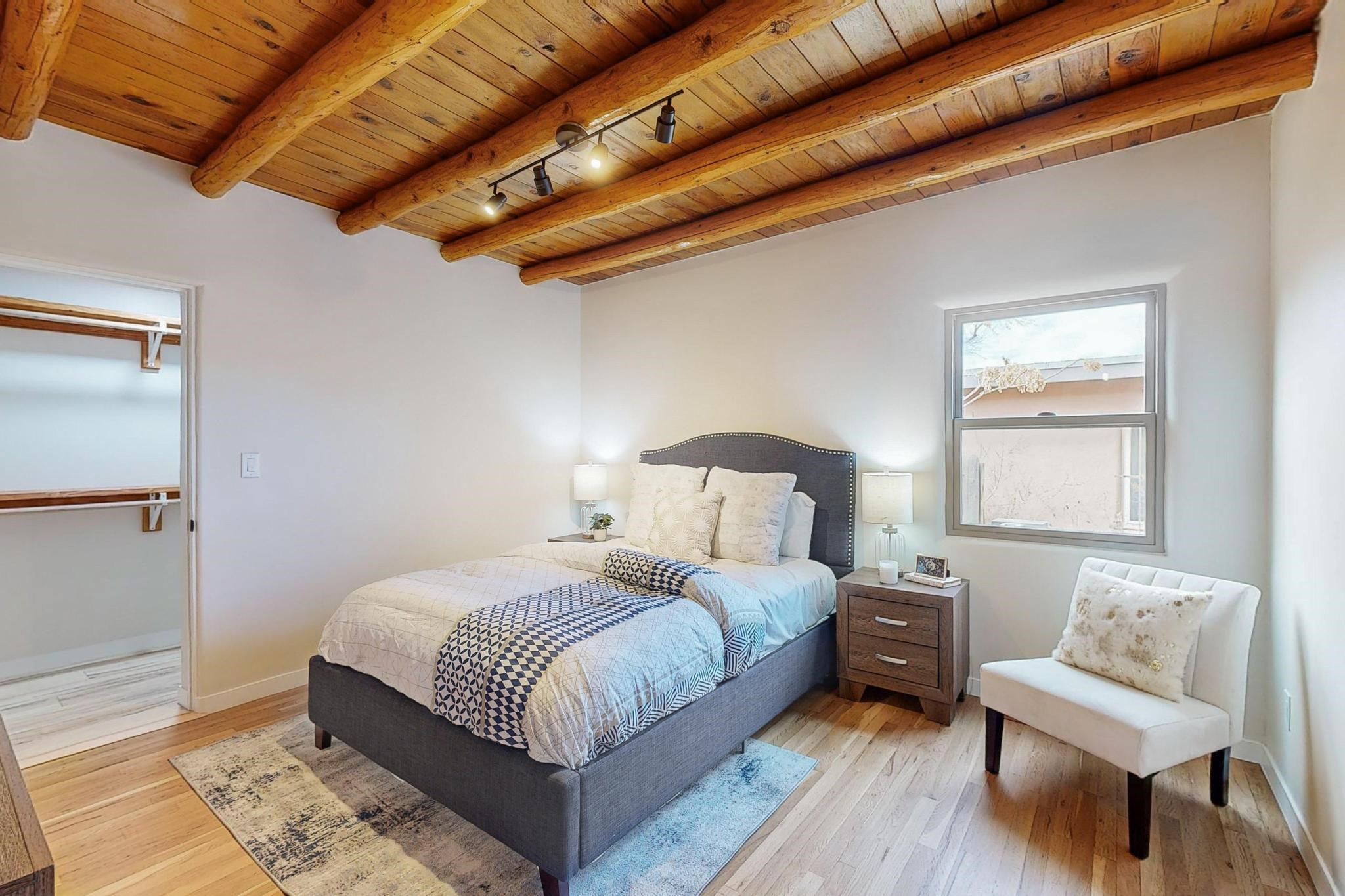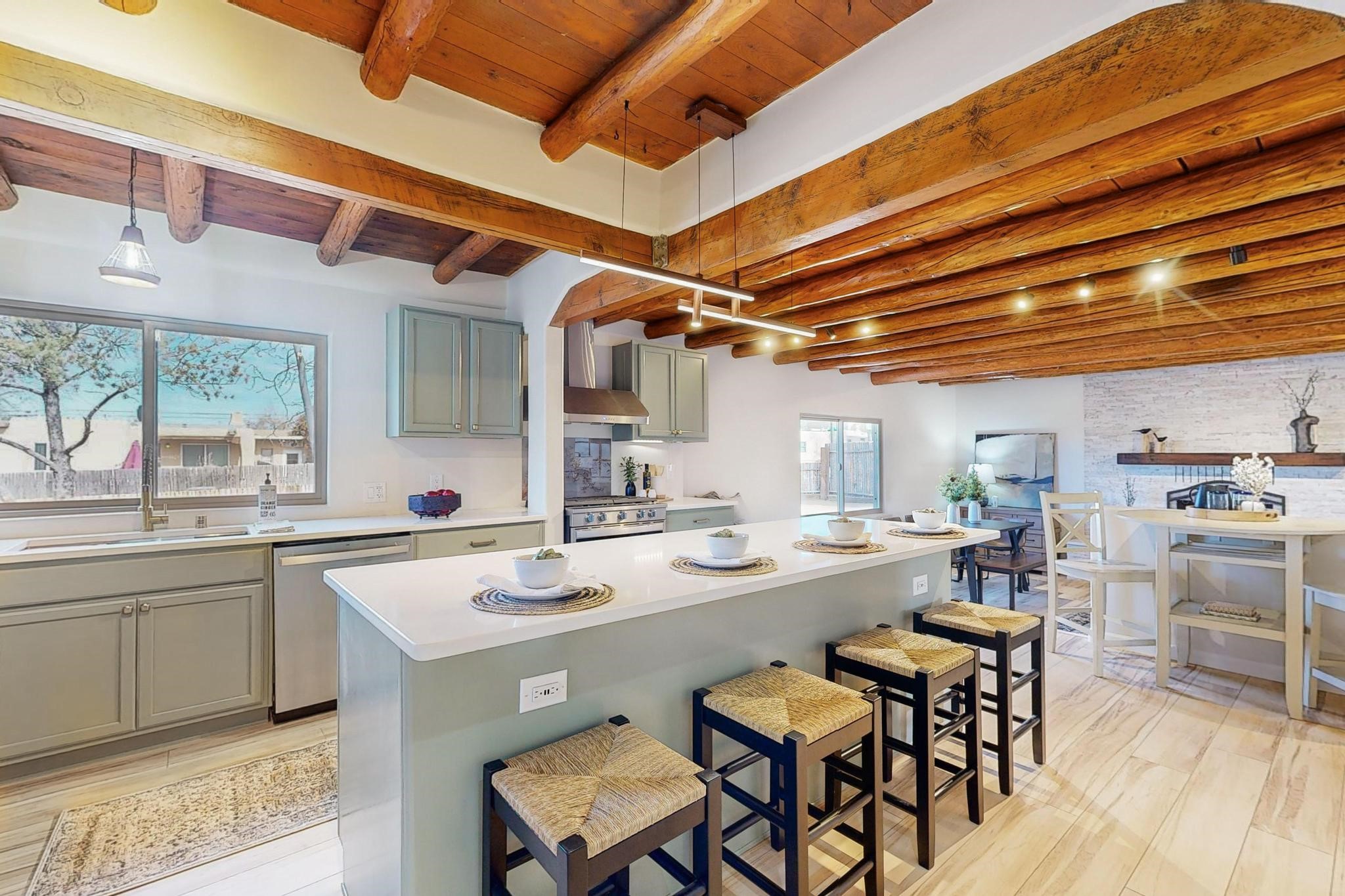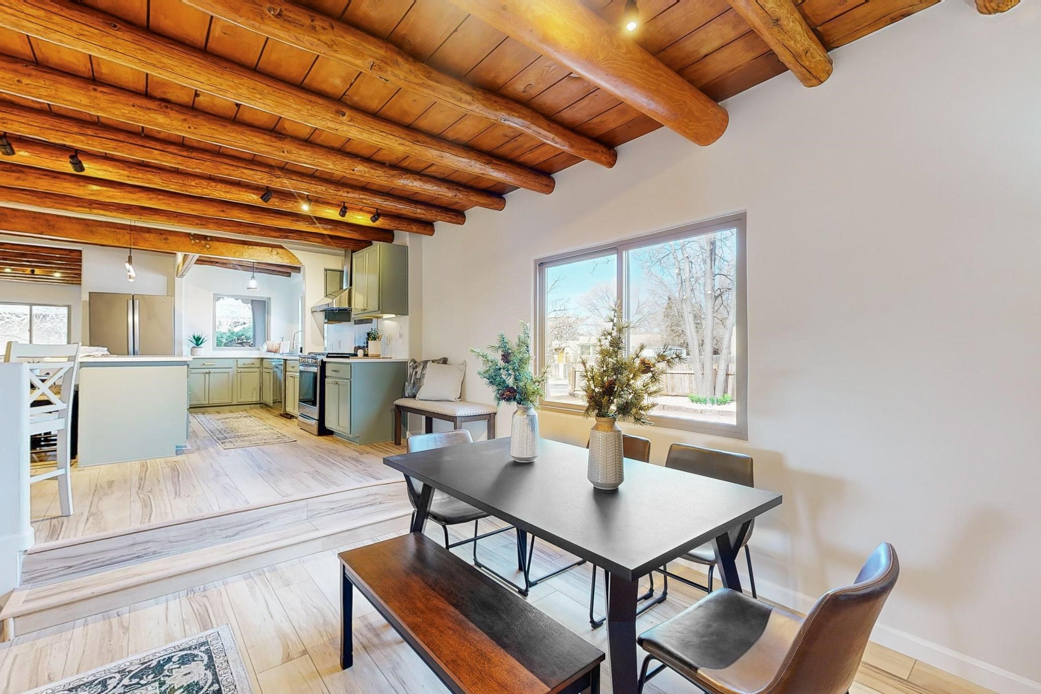 Discover the perfect balance of classic Santa Fe charm and contemporary living in this beautiful 3 bedroom, 2 bath Allen Stamm home, nestled in the highly sought-after Casa Alegre neighborhood. This home showcases hallmark Stamm features including exposed vigas, original hardwood floors, and two stunning fireplaces- a cozy Kiva and a traditional wood-burning hearth- that infuse warmth and character throughout. Enjoy the flexibility of two living spaces. The chef's kitchen is both stylish and functional, boasting quartz countertops, updated appliances, & an expansive 8-foot island with a built-in beverage fridge, ideal for casual gatherings or culinary creations. A bonus office space with a private entrance offers flexibility for remote work, creative pursuits, or a peaceful retreat. The primary bathroom invites relaxation with a large soaking tub, perfect for unwinding after a busy day. Outside is a spacious backyard designed for entertaining, gardening, or simply savoring serene Santa Fe sunsets. A convenient wash station off the back door makes cleanup after outdoor activities a breeze. With new windows, ample parking, and a central location close to Santa Fe's vibrant amenities, this home offers the perfect blend of comfort, charm, and convenience in one of the city's most desirable neighborhoods. Schedule your showing today!