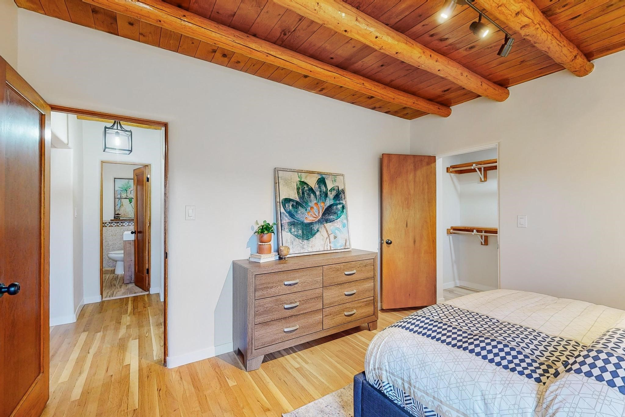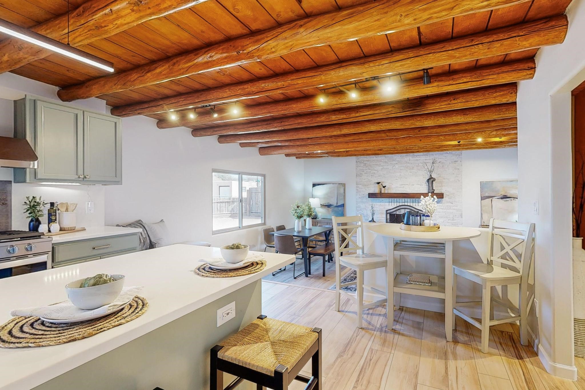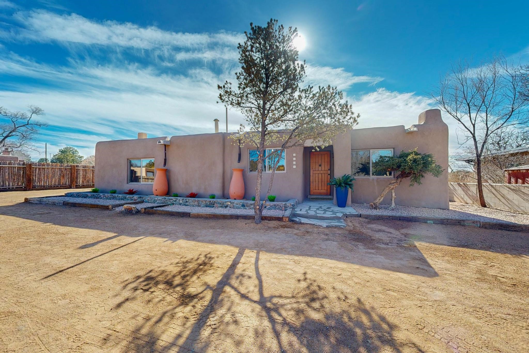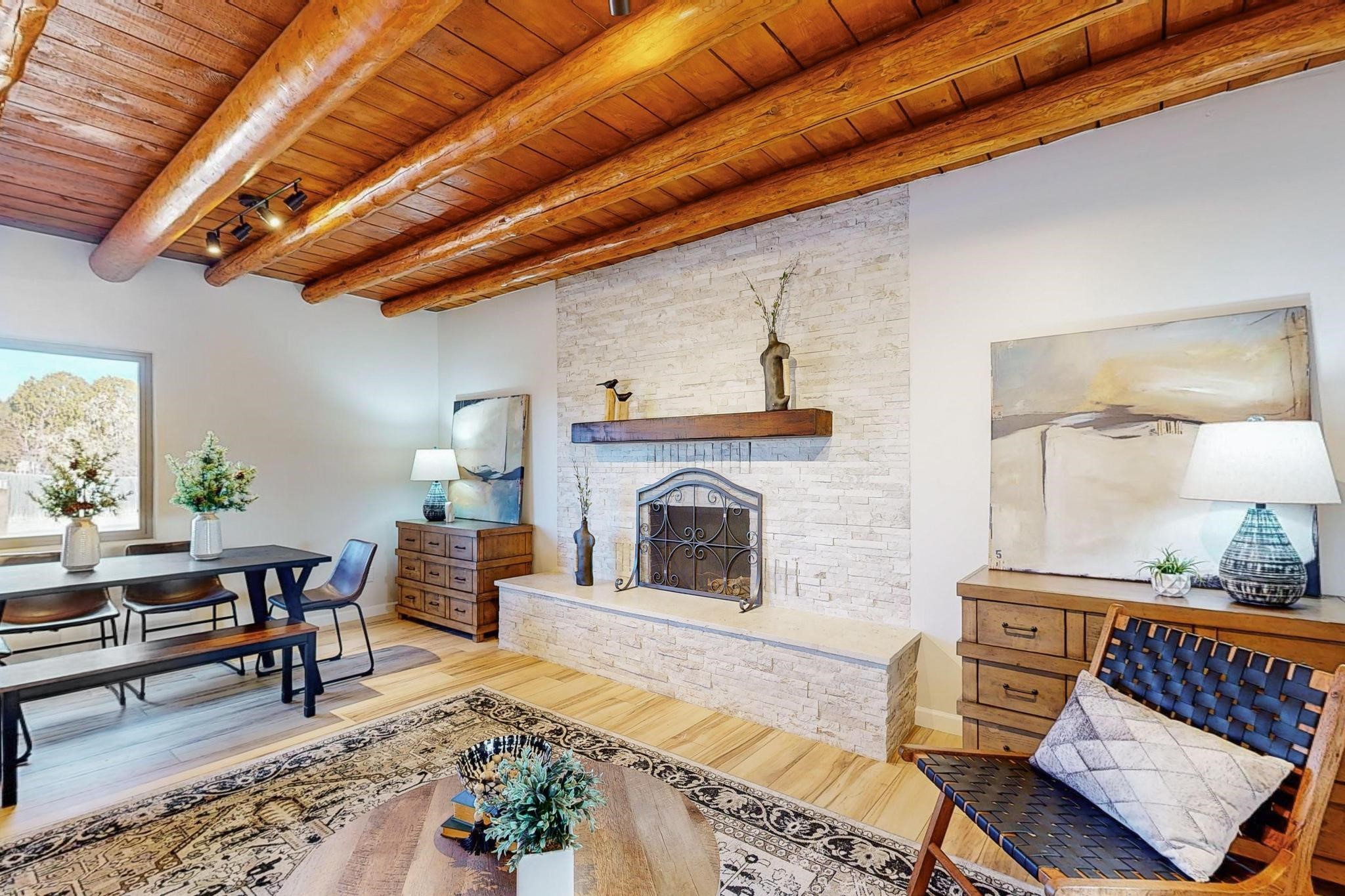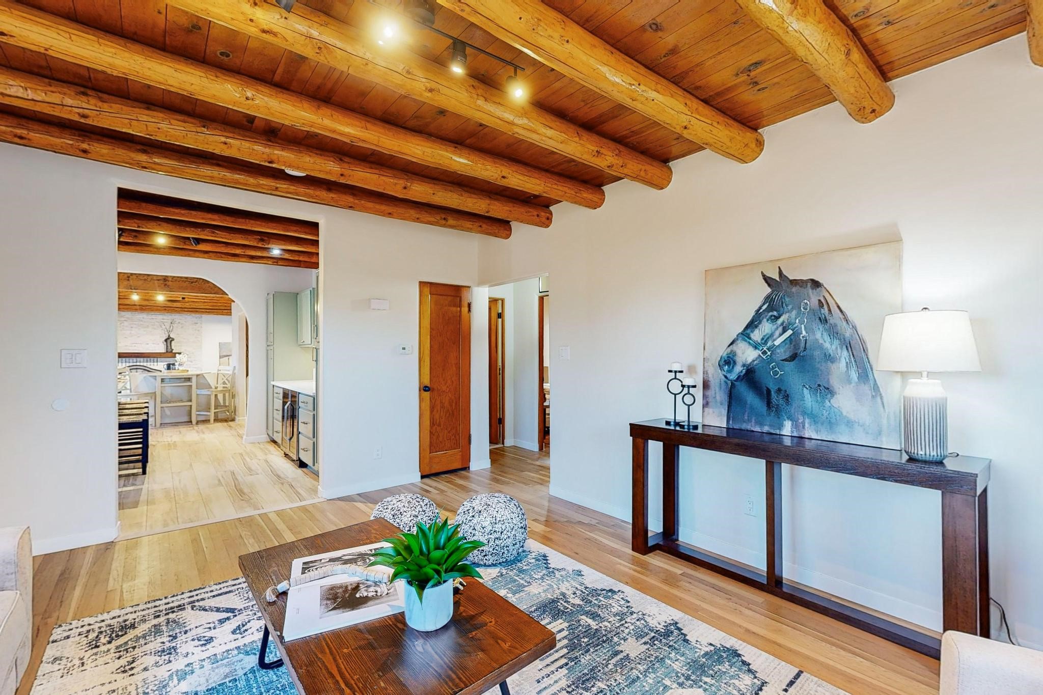 Discover the perfect balance of classic Santa Fe charm and contemporary living in this beautiful 3 bedroom, 2 bath Allen Stamm home, nestled in the highly sought-after Casa Alegre neighborhood. This home showcases hallmark Stamm features including exposed vigas, original hardwood floors, and two stunning fireplaces- a cozy Kiva and a traditional wood-burning hearth- that infuse warmth and character throughout. Enjoy the flexibility of two living spaces. The chef's kitchen is both stylish and functional, boasting quartz countertops, updated appliances, & an expansive 8-foot island with a built-in beverage fridge, ideal for casual gatherings or culinary creations. A bonus office space with a private entrance offers flexibility for remote work, creative pursuits, or a peaceful retreat. The primary bathroom invites relaxation with a large soaking tub, perfect for unwinding after a busy day. Outside is a spacious backyard designed for entertaining, gardening, or simply savoring serene Santa Fe sunsets. A convenient wash station off the back door makes cleanup after outdoor activities a breeze. With new windows, ample parking, and a central location close to Santa Fe's vibrant amenities, this home offers the perfect blend of comfort, charm, and convenience in one of the city's most desirable neighborhoods. Schedule your showing today!