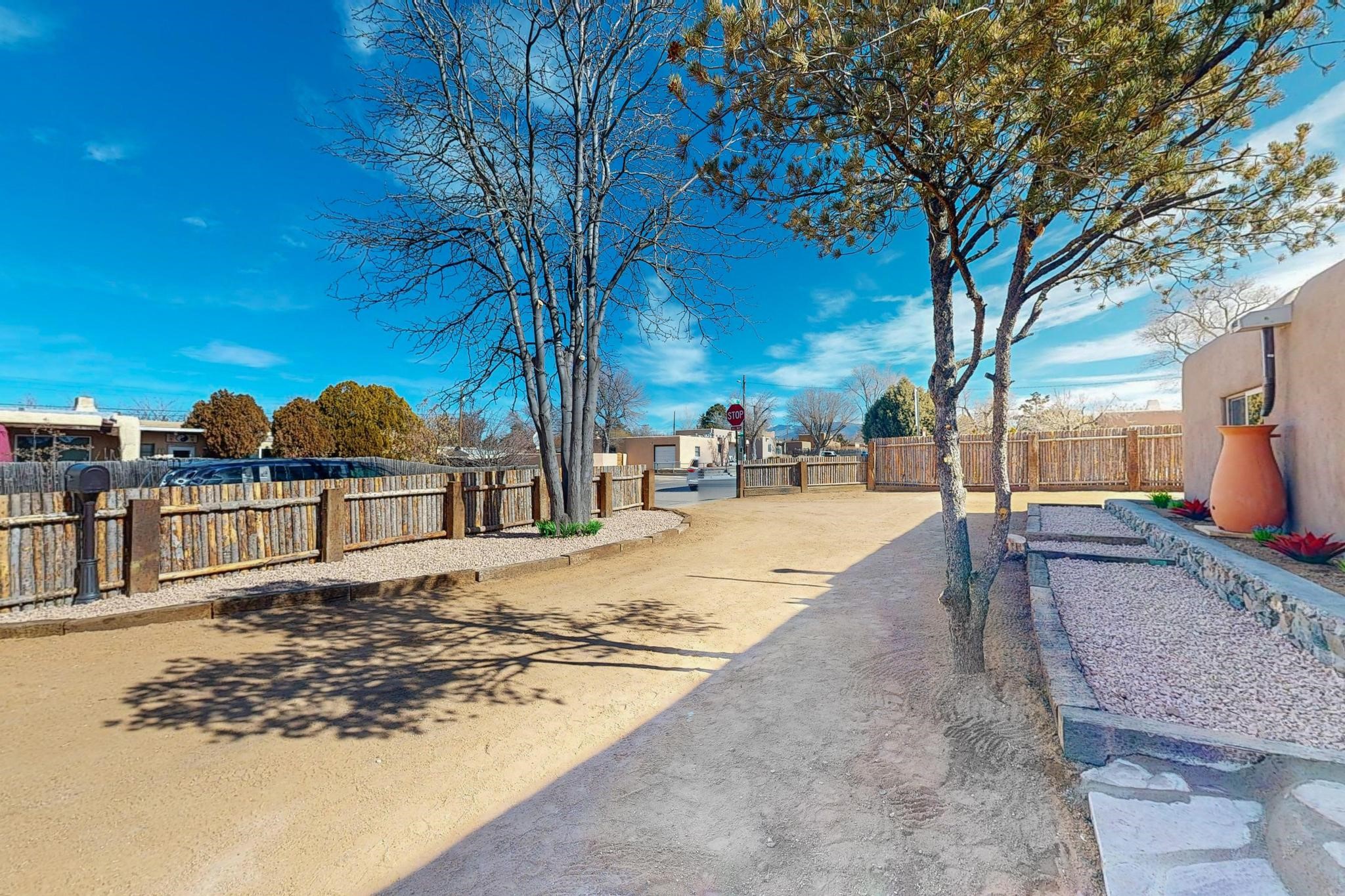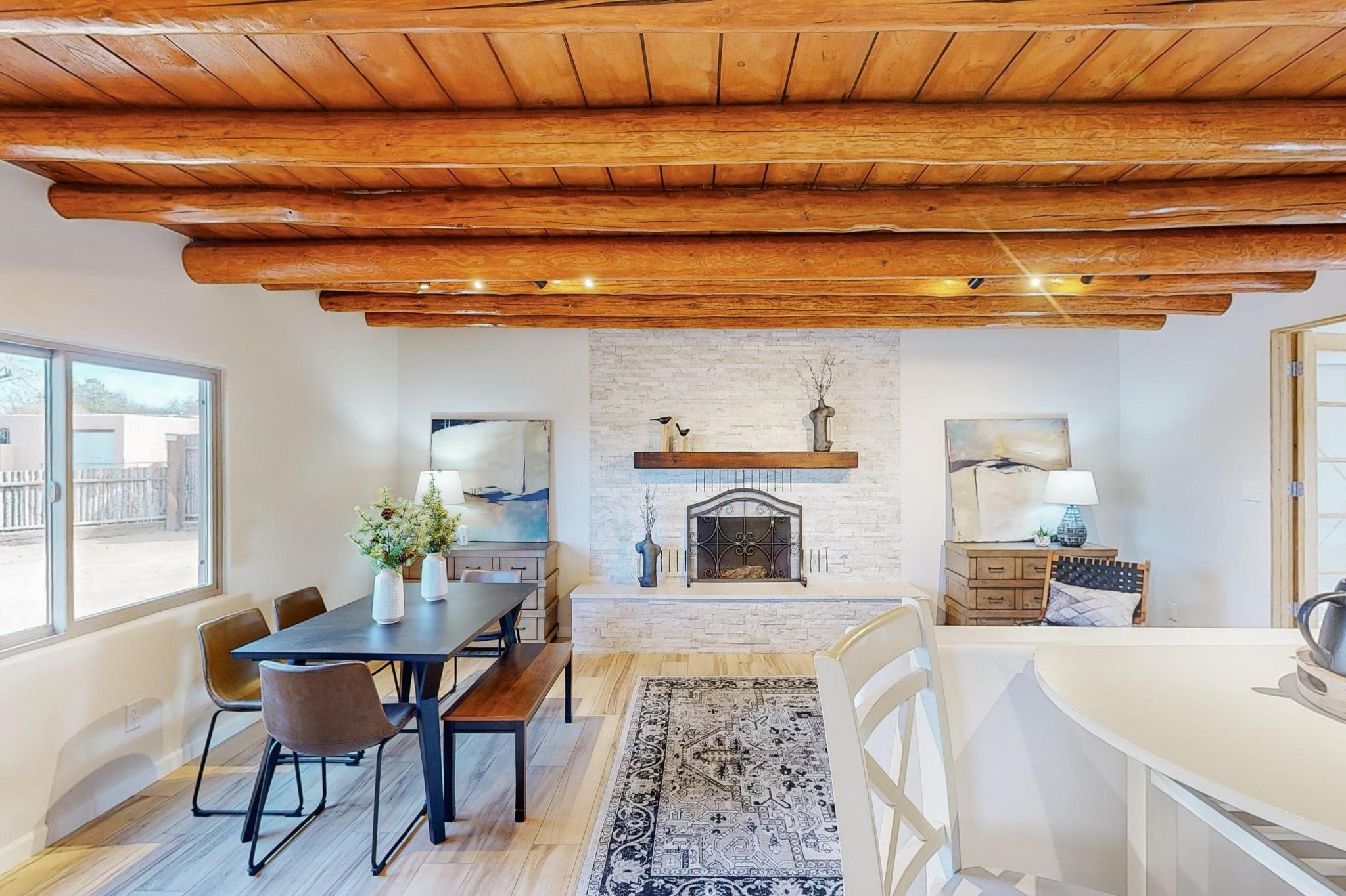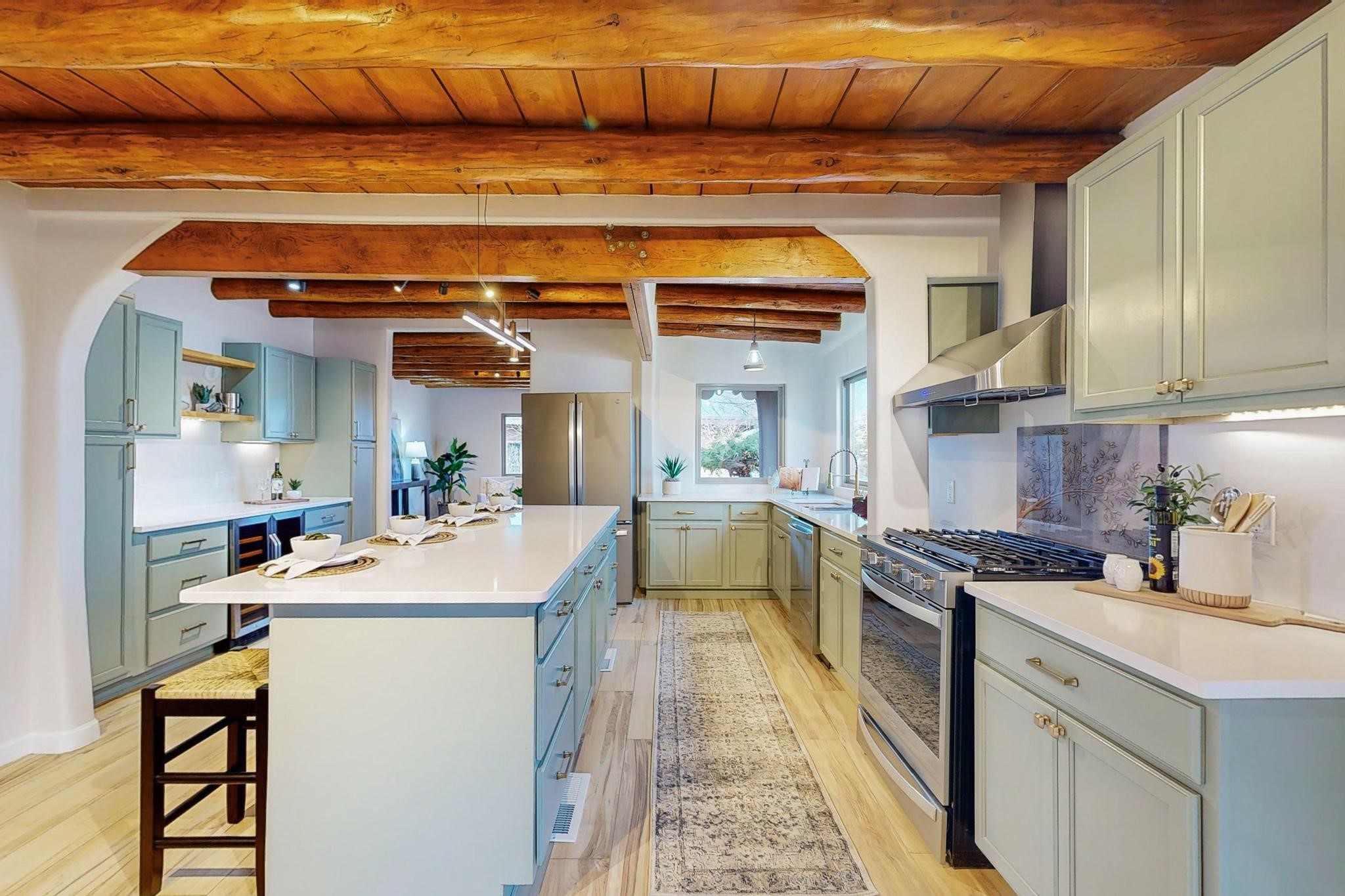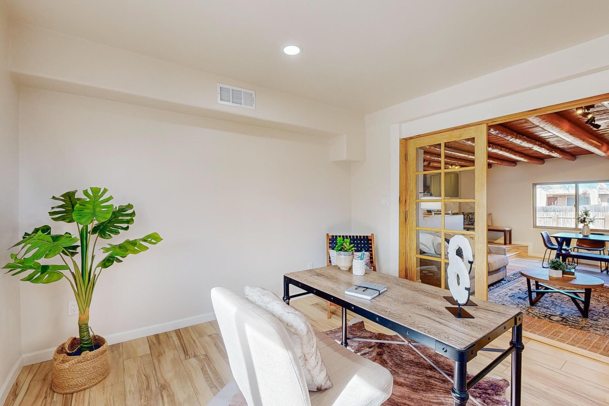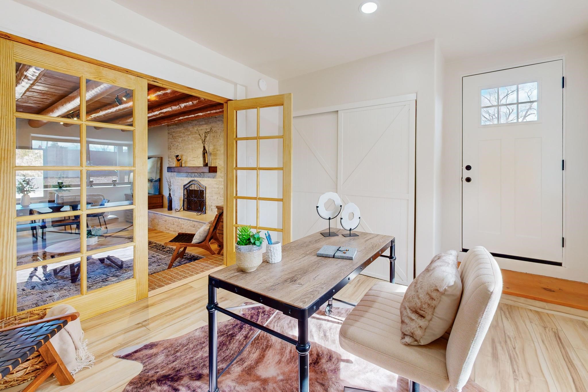 Discover the perfect balance of classic Santa Fe charm and contemporary living in this beautiful 3 bedroom, 2 bath Allen Stamm home, nestled in the highly sought-after Casa Alegre neighborhood. This home showcases hallmark Stamm features including exposed vigas, original hardwood floors, and two stunning fireplaces- a cozy Kiva and a traditional wood-burning hearth- that infuse warmth and character throughout. Enjoy the flexibility of two living spaces. The chef's kitchen is both stylish and functional, boasting quartz countertops, updated appliances, & an expansive 8-foot island with a built-in beverage fridge, ideal for casual gatherings or culinary creations. A bonus office space with a private entrance offers flexibility for remote work, creative pursuits, or a peaceful retreat. The primary bathroom invites relaxation with a large soaking tub, perfect for unwinding after a busy day. Outside is a spacious backyard designed for entertaining, gardening, or simply savoring serene Santa Fe sunsets. A convenient wash station off the back door makes cleanup after outdoor activities a breeze. With new windows, ample parking, and a central location close to Santa Fe's vibrant amenities, this home offers the perfect blend of comfort, charm, and convenience in one of the city's most desirable neighborhoods. Schedule your showing today!
