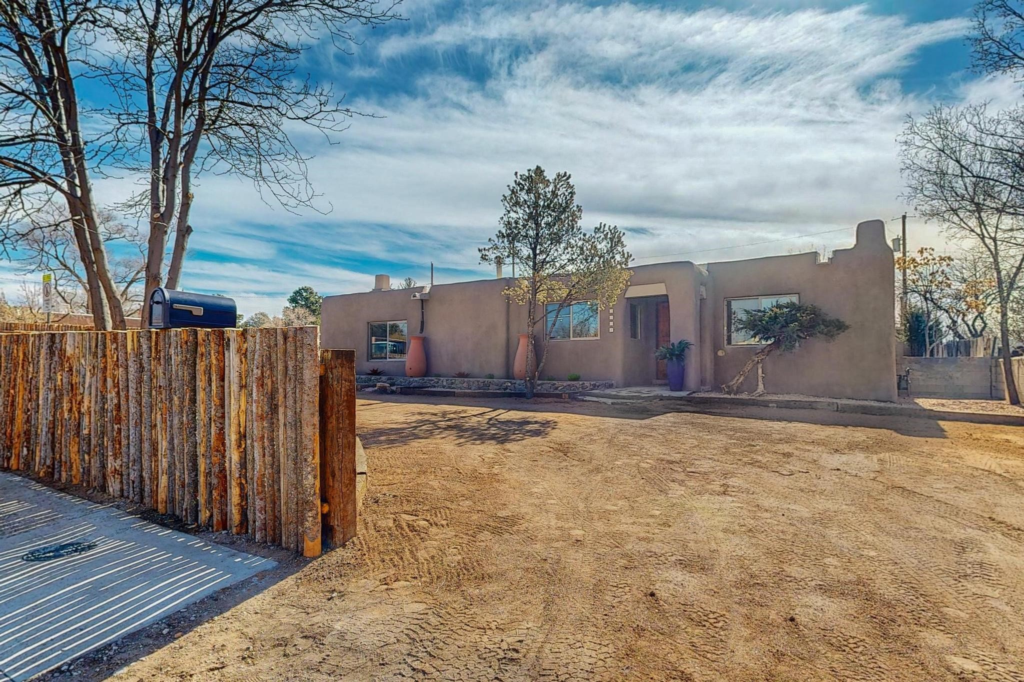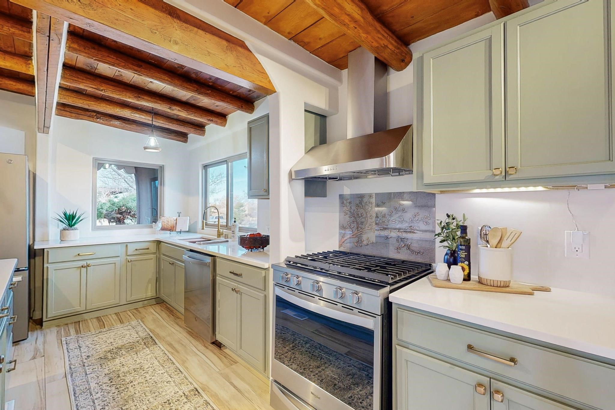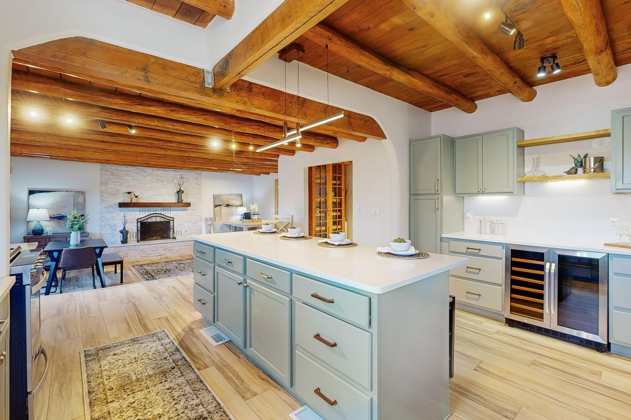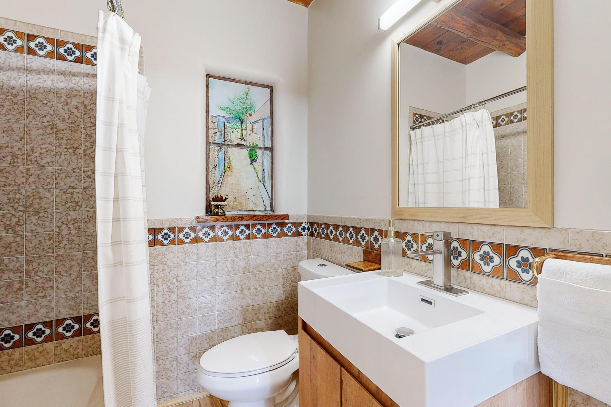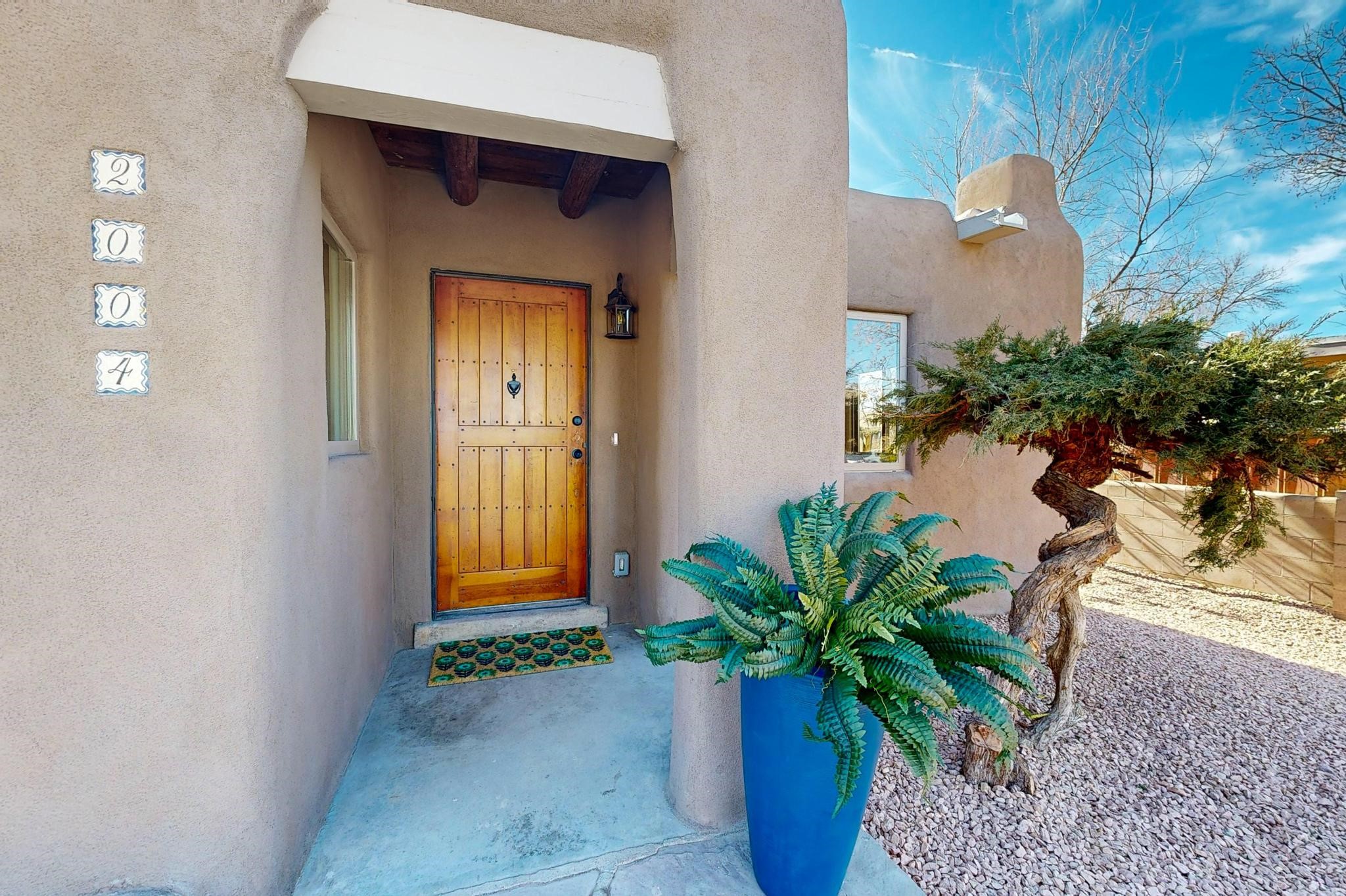 Discover the perfect balance of classic Santa Fe charm and contemporary living in this beautiful 3 bedroom, 2 bath Allen Stamm home, nestled in the highly sought-after Casa Alegre neighborhood. This home showcases hallmark Stamm features including exposed vigas, original hardwood floors, and two stunning fireplaces- a cozy Kiva and a traditional wood-burning hearth- that infuse warmth and character throughout. Enjoy the flexibility of two living spaces. The chef's kitchen is both stylish and functional, boasting quartz countertops, updated appliances, & an expansive 8-foot island with a built-in beverage fridge, ideal for casual gatherings or culinary creations. A bonus office space with a private entrance offers flexibility for remote work, creative pursuits, or a peaceful retreat. The primary bathroom invites relaxation with a large soaking tub, perfect for unwinding after a busy day. Outside is a spacious backyard designed for entertaining, gardening, or simply savoring serene Santa Fe sunsets. A convenient wash station off the back door makes cleanup after outdoor activities a breeze. With new windows, ample parking, and a central location close to Santa Fe's vibrant amenities, this home offers the perfect blend of comfort, charm, and convenience in one of the city's most desirable neighborhoods. Schedule your showing today!