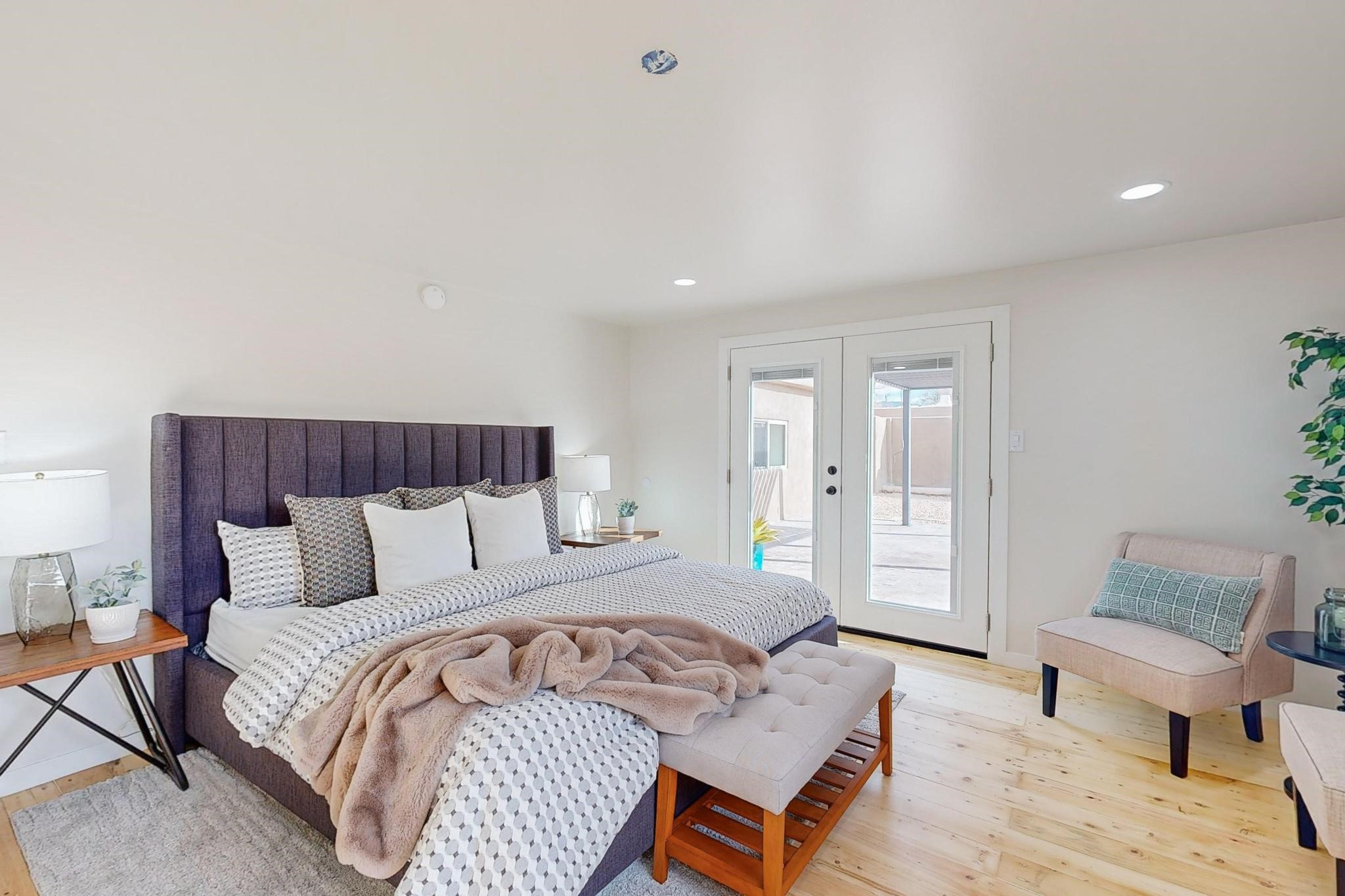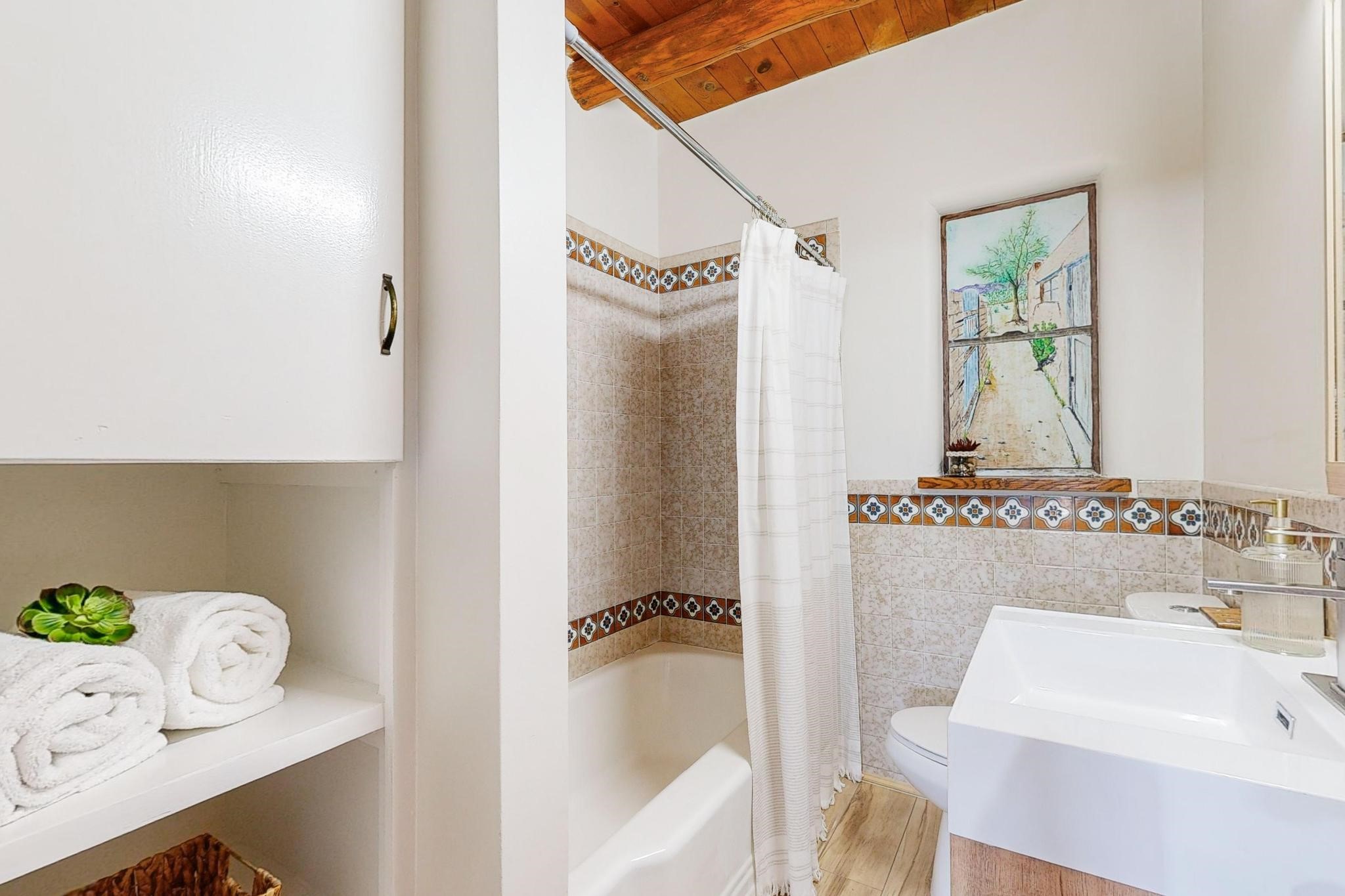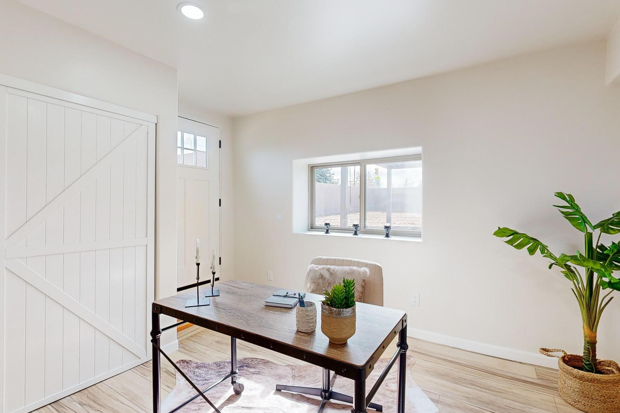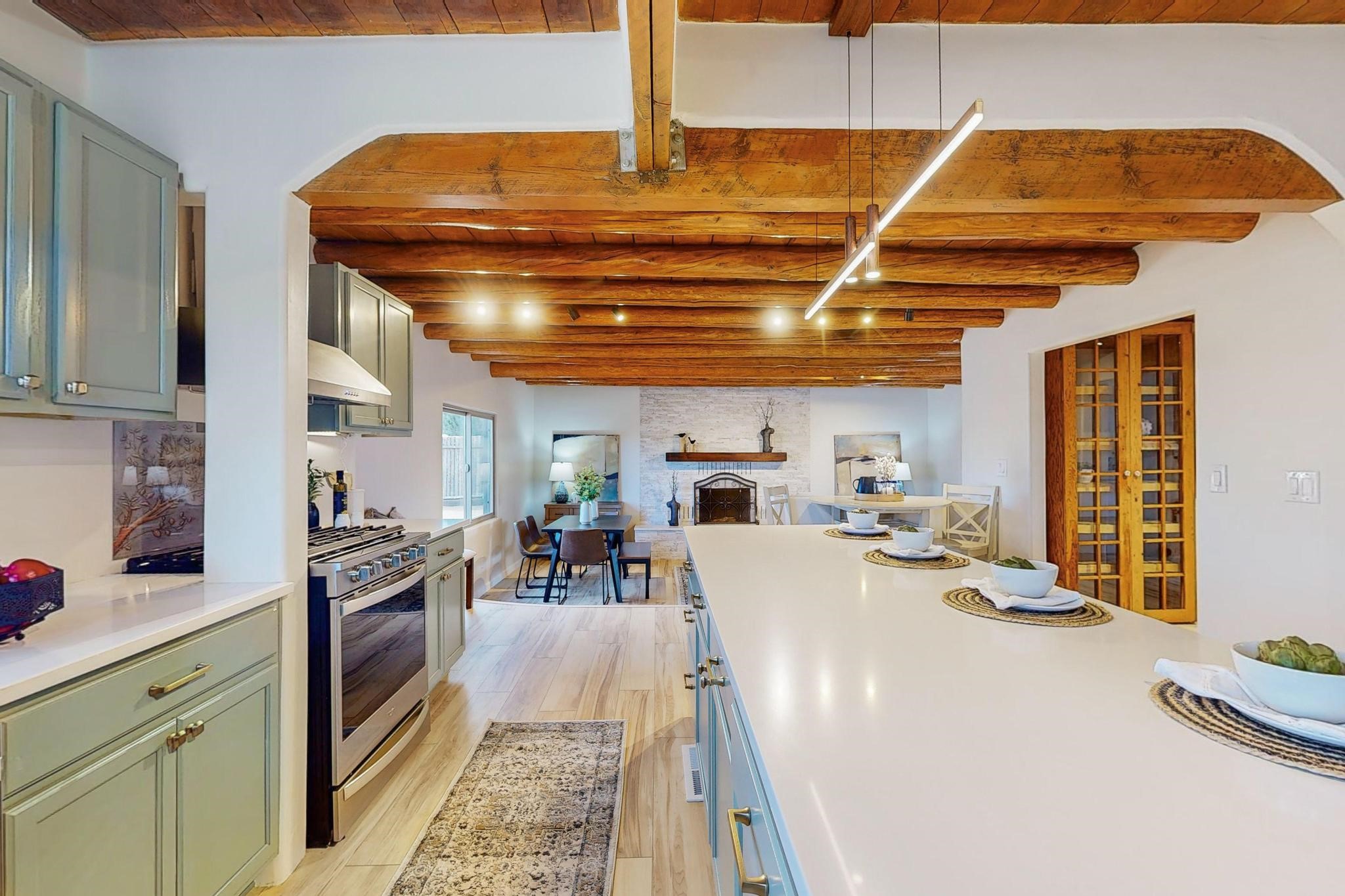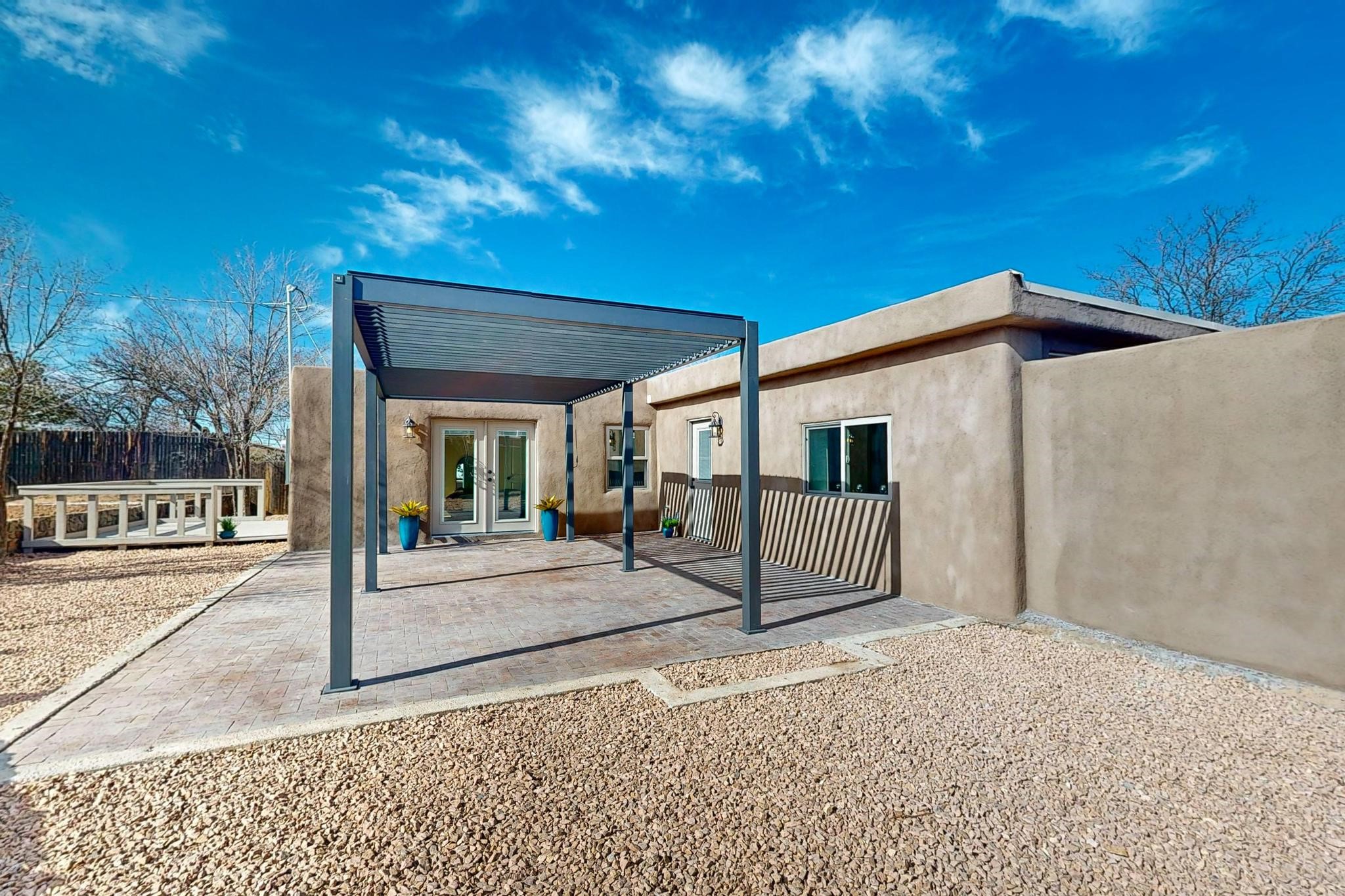 Discover the perfect balance of classic Santa Fe charm and contemporary living in this beautiful 3 bedroom, 2 bath Allen Stamm home, nestled in the highly sought-after Casa Alegre neighborhood. This home showcases hallmark Stamm features including exposed vigas, original hardwood floors, and two stunning fireplaces- a cozy Kiva and a traditional wood-burning hearth- that infuse warmth and character throughout. Enjoy the flexibility of two living spaces. The chef's kitchen is both stylish and functional, boasting quartz countertops, updated appliances, & an expansive 8-foot island with a built-in beverage fridge, ideal for casual gatherings or culinary creations. A bonus office space with a private entrance offers flexibility for remote work, creative pursuits, or a peaceful retreat. The primary bathroom invites relaxation with a large soaking tub, perfect for unwinding after a busy day. Outside is a spacious backyard designed for entertaining, gardening, or simply savoring serene Santa Fe sunsets. A convenient wash station off the back door makes cleanup after outdoor activities a breeze. With new windows, ample parking, and a central location close to Santa Fe's vibrant amenities, this home offers the perfect blend of comfort, charm, and convenience in one of the city's most desirable neighborhoods. Schedule your showing today!