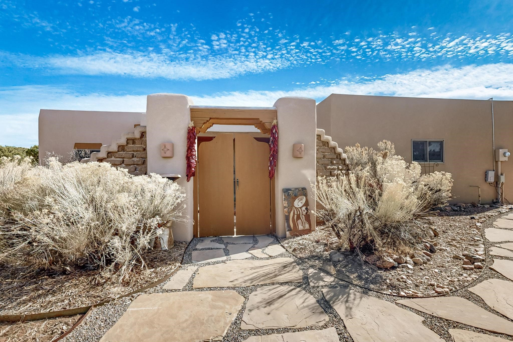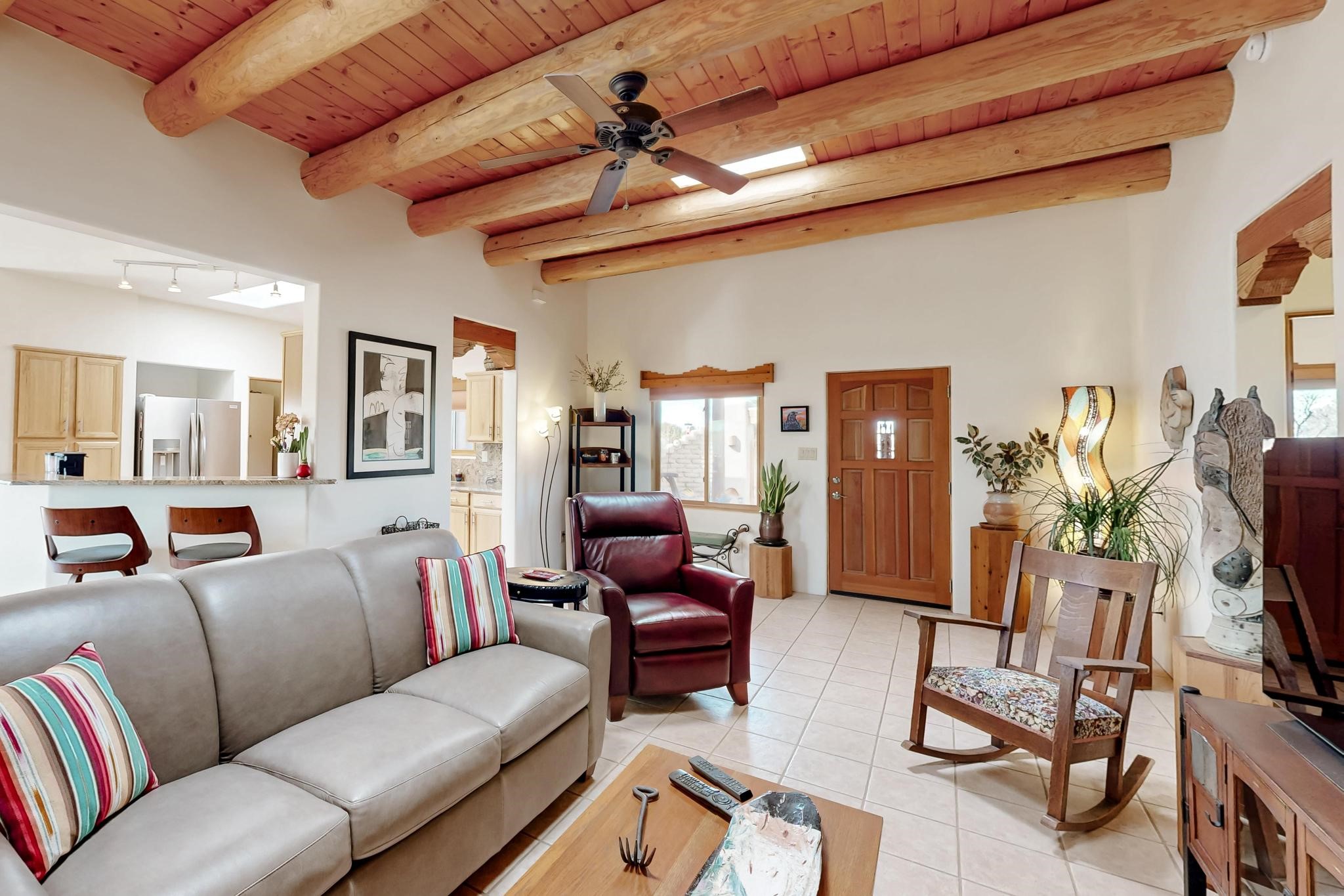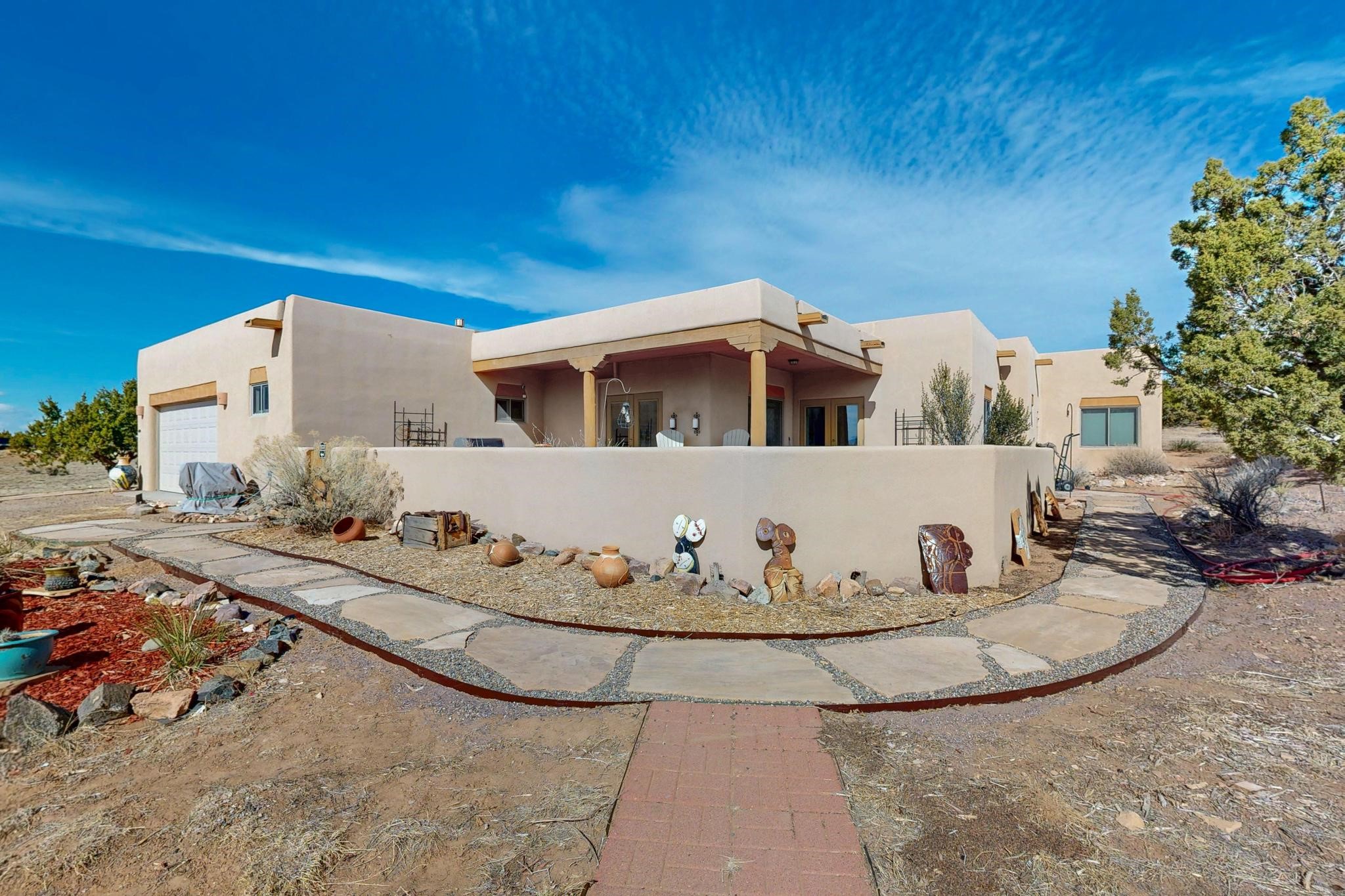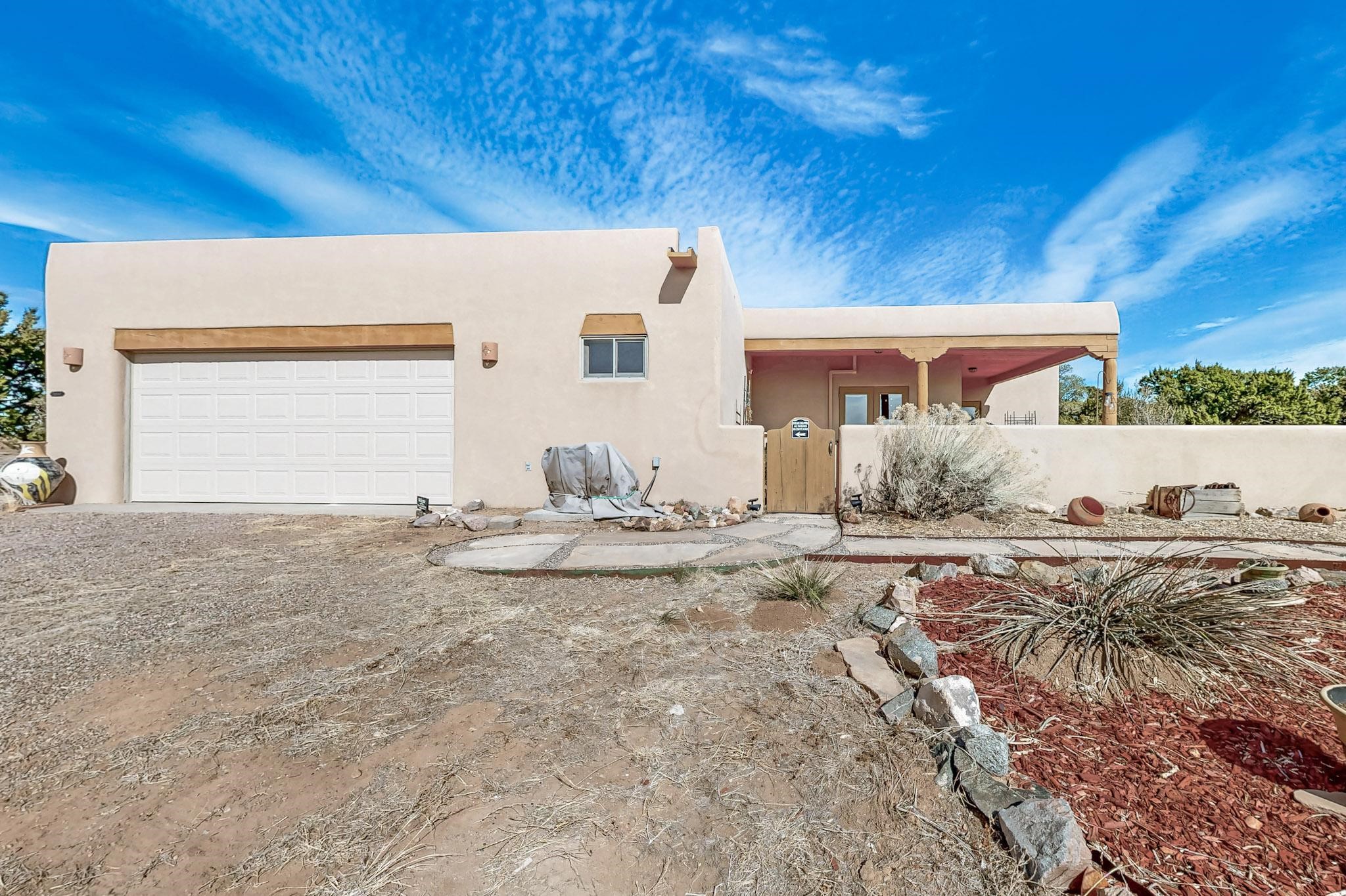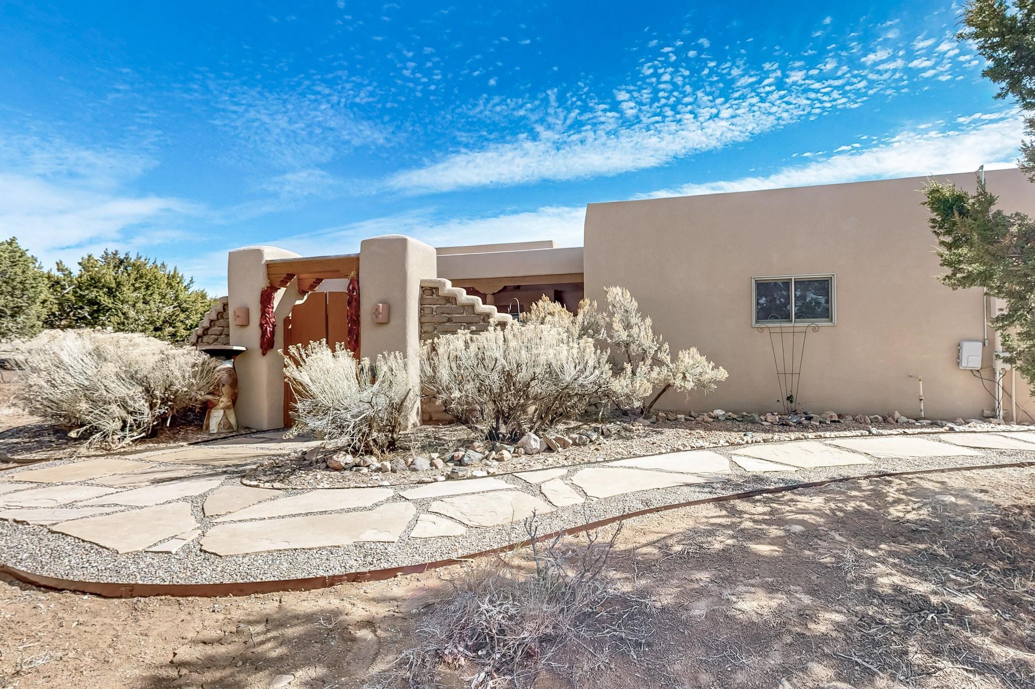 A gracious walled courtyard entry leads to this delightfully light, open plan popular design built by Casas de Suenos. High viga ceilings, tile floors, large Low E windows and a corner kiva fireplace in the living room. The spacious kitchen and dining area with patio doors to the sunset portal are ideal for entertaining. There is an extra playroom or large den and private owners suite totally separate from the guest wing. 3 minisplits have been installed as back up heating and airconditioning. New vinyl flooring has been installed in the main and guest bedrooms and the home has been re painted throughout. 220 has been added in the oversized garage for charging. The home sits on a large 2.1acre corner lot close to the Rail Trail and in the middle of Eldorado with easy access to all the amenities, local shopping and only minutes into Santa Fe