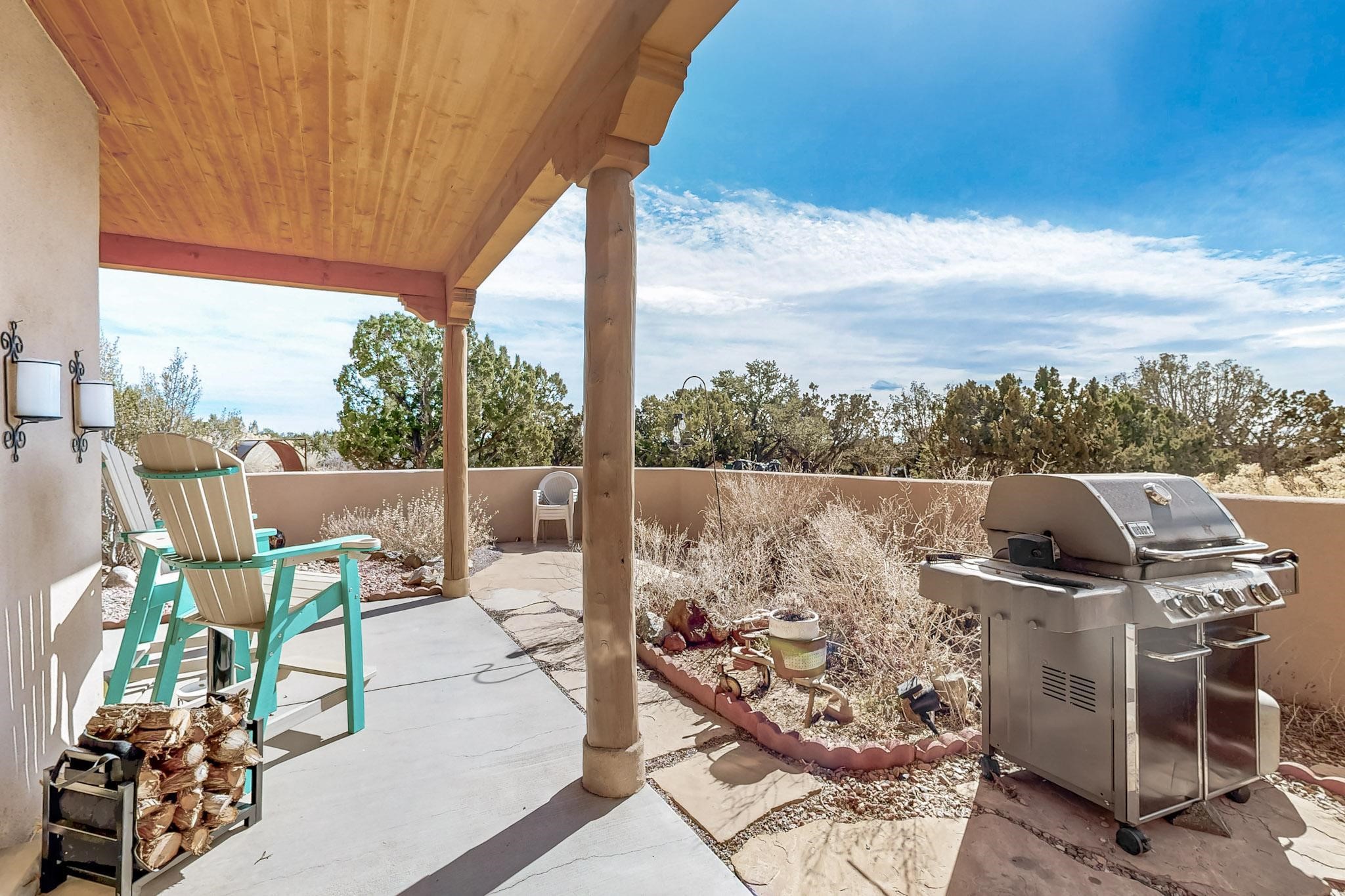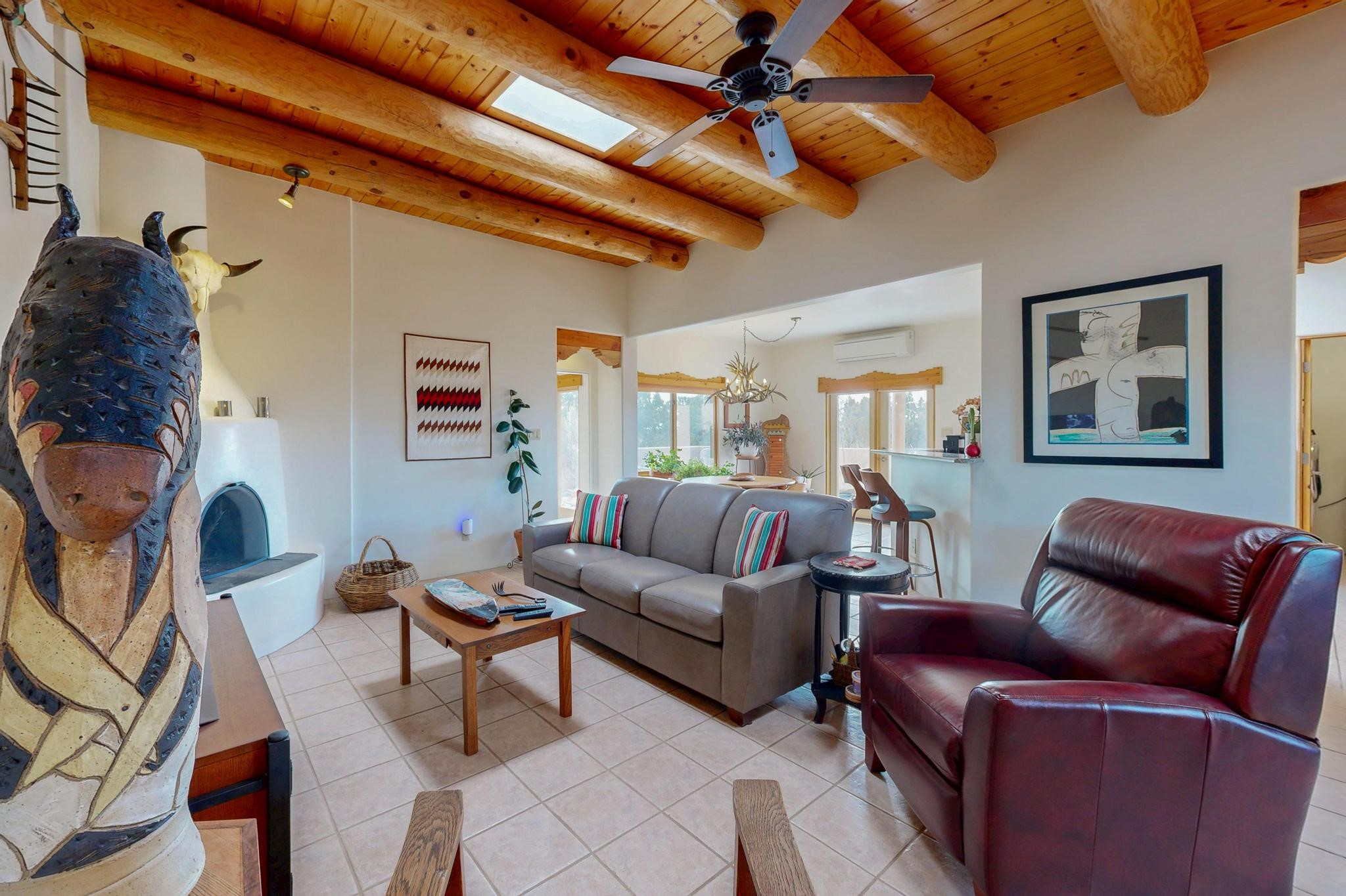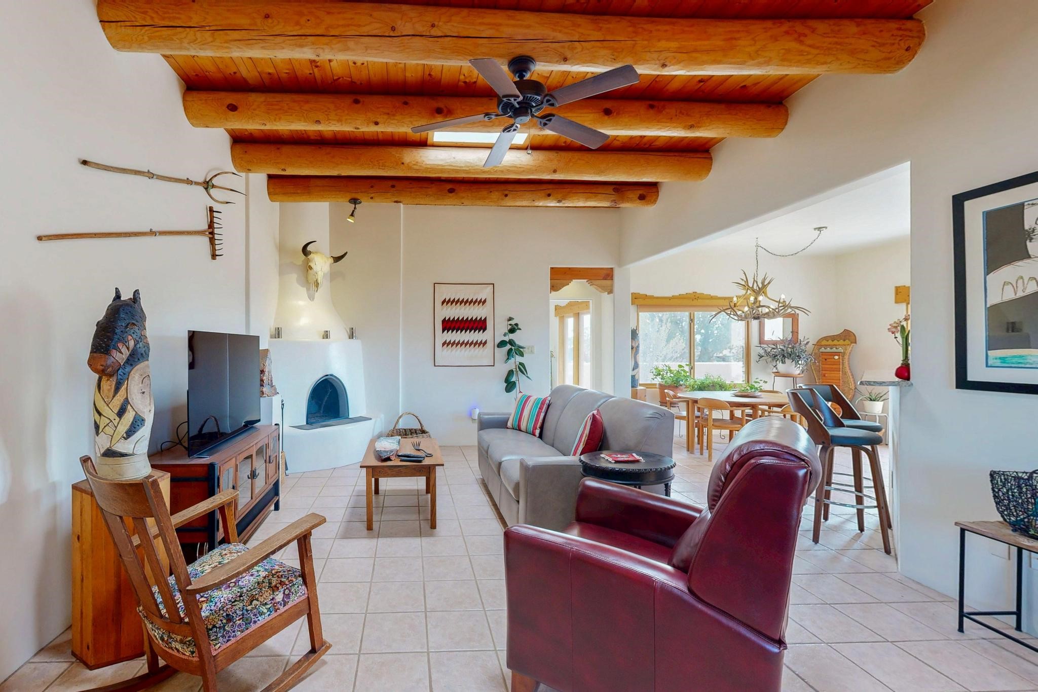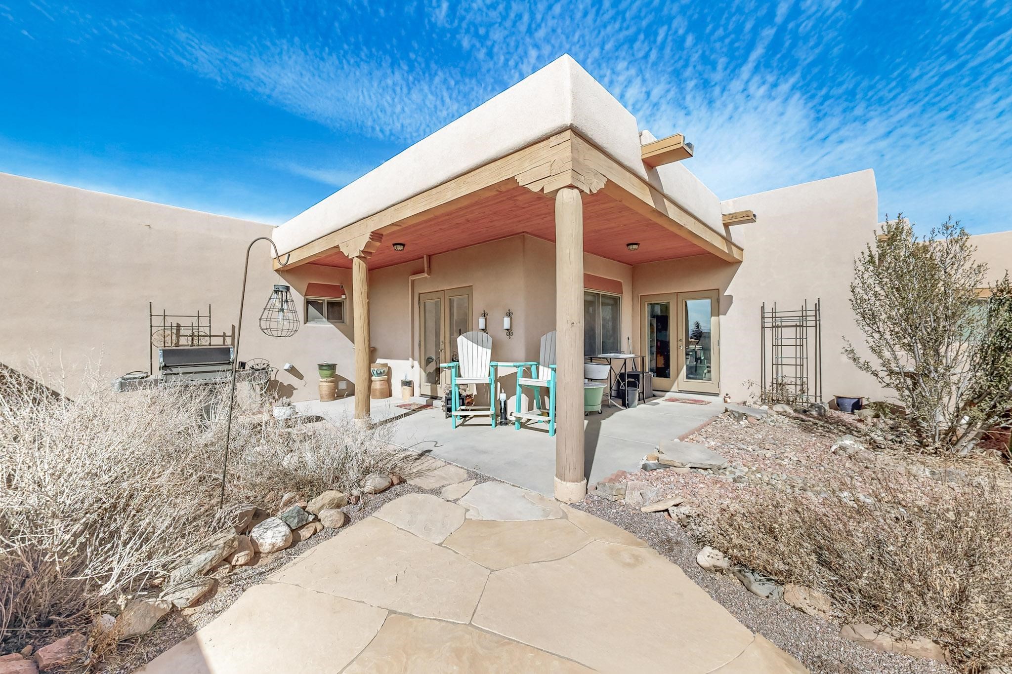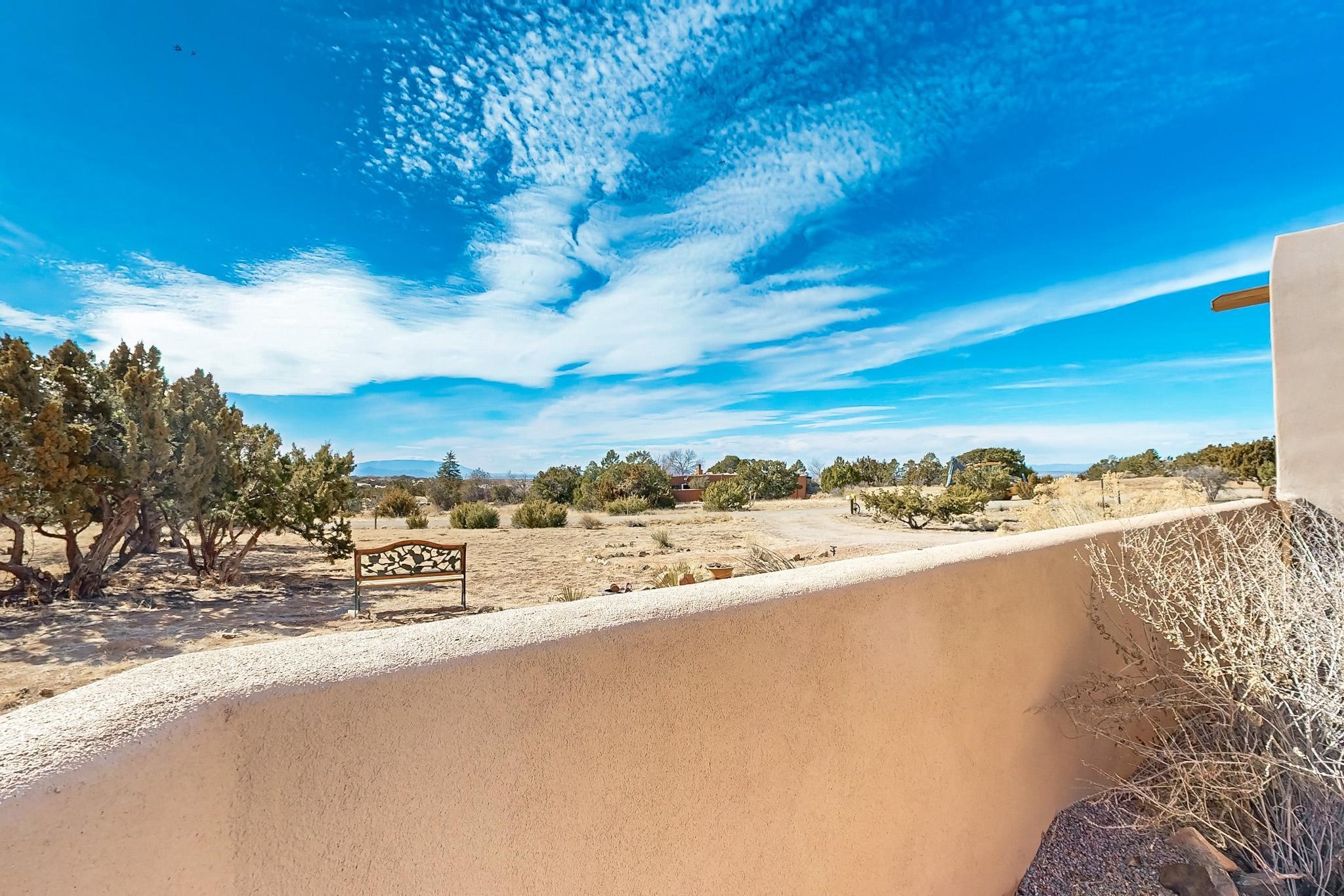 A gracious walled courtyard entry leads to this delightfully light, open plan popular design built by Casas de Suenos. High viga ceilings, tile floors, large Low E windows and a corner kiva fireplace in the living room. The spacious kitchen and dining area with patio doors to the sunset portal are ideal for entertaining. There is an extra playroom or large den and private owners suite totally separate from the guest wing. 3 minisplits have been installed as back up heating and airconditioning. New vinyl flooring has been installed in the main and guest bedrooms and the home has been re painted throughout. 220 has been added in the oversized garage for charging. The home sits on a large 2.1acre corner lot close to the Rail Trail and in the middle of Eldorado with easy access to all the amenities, local shopping and only minutes into Santa Fe