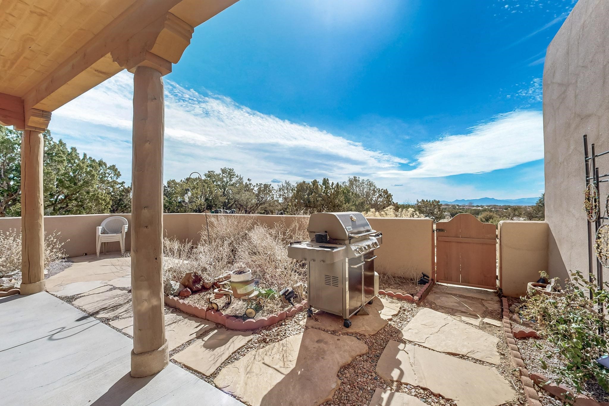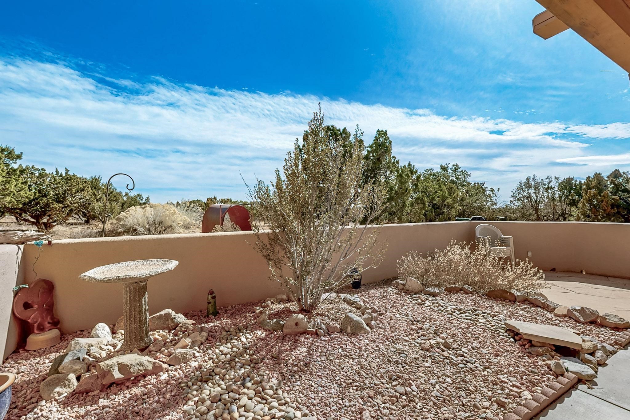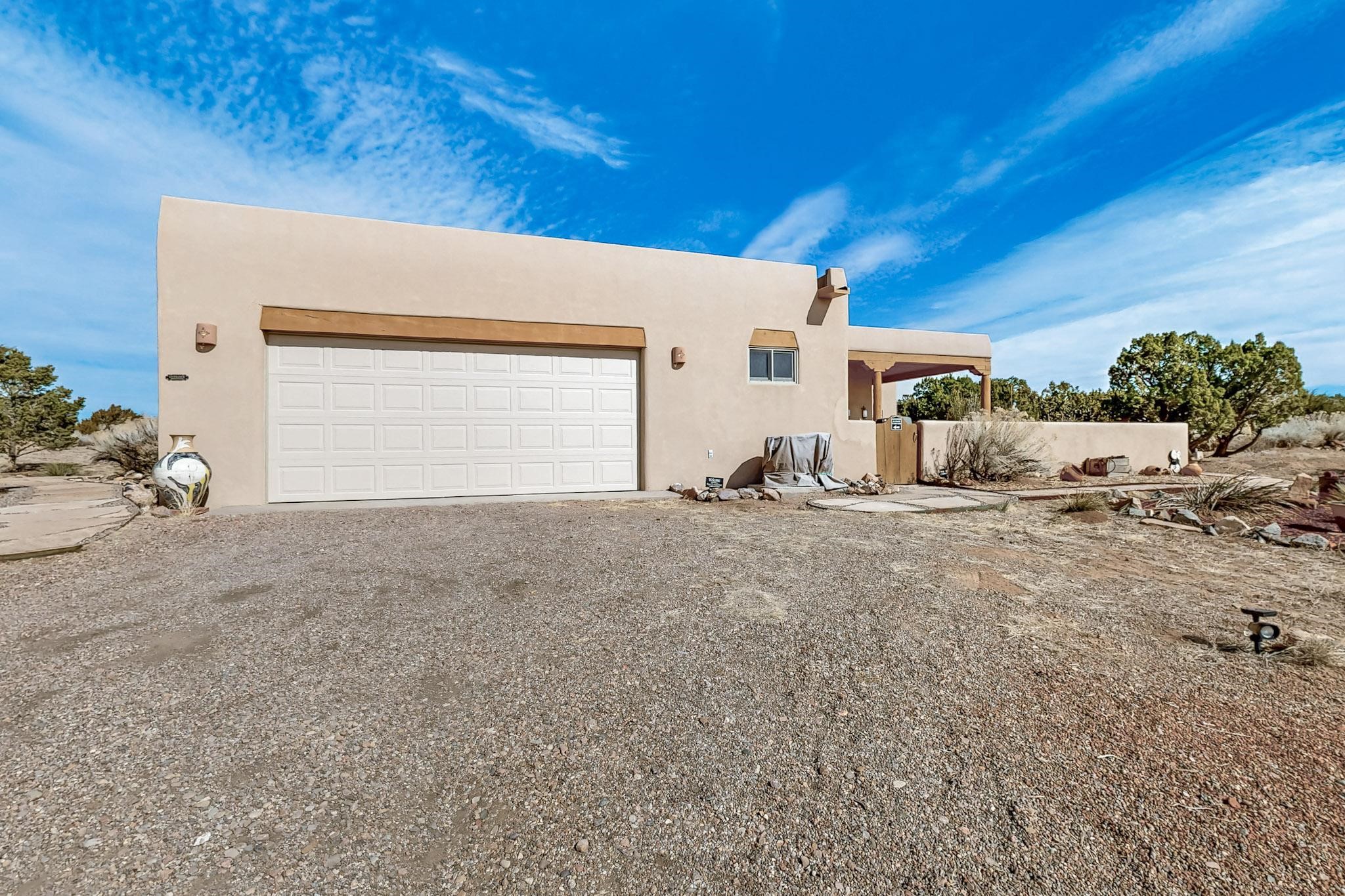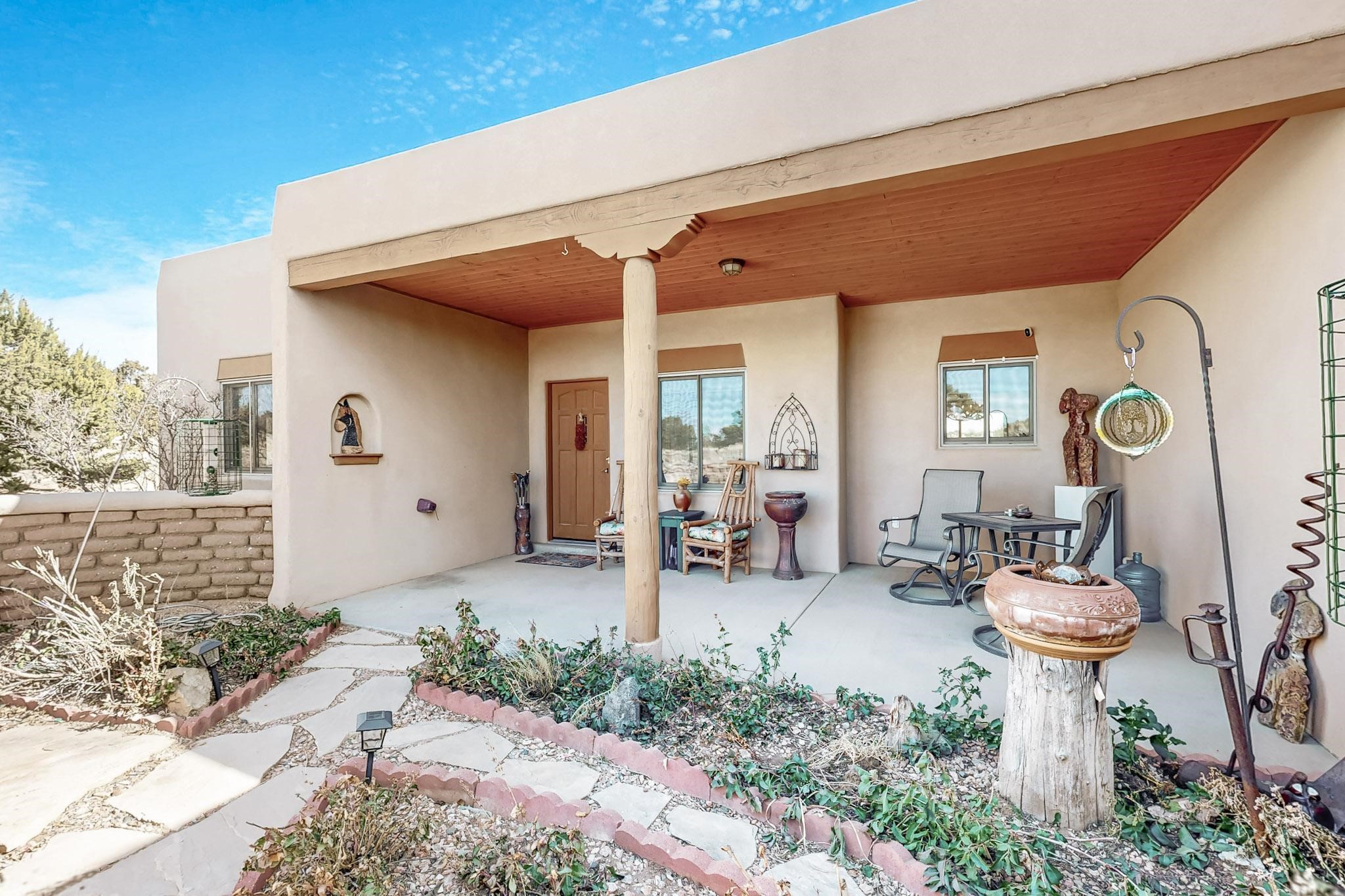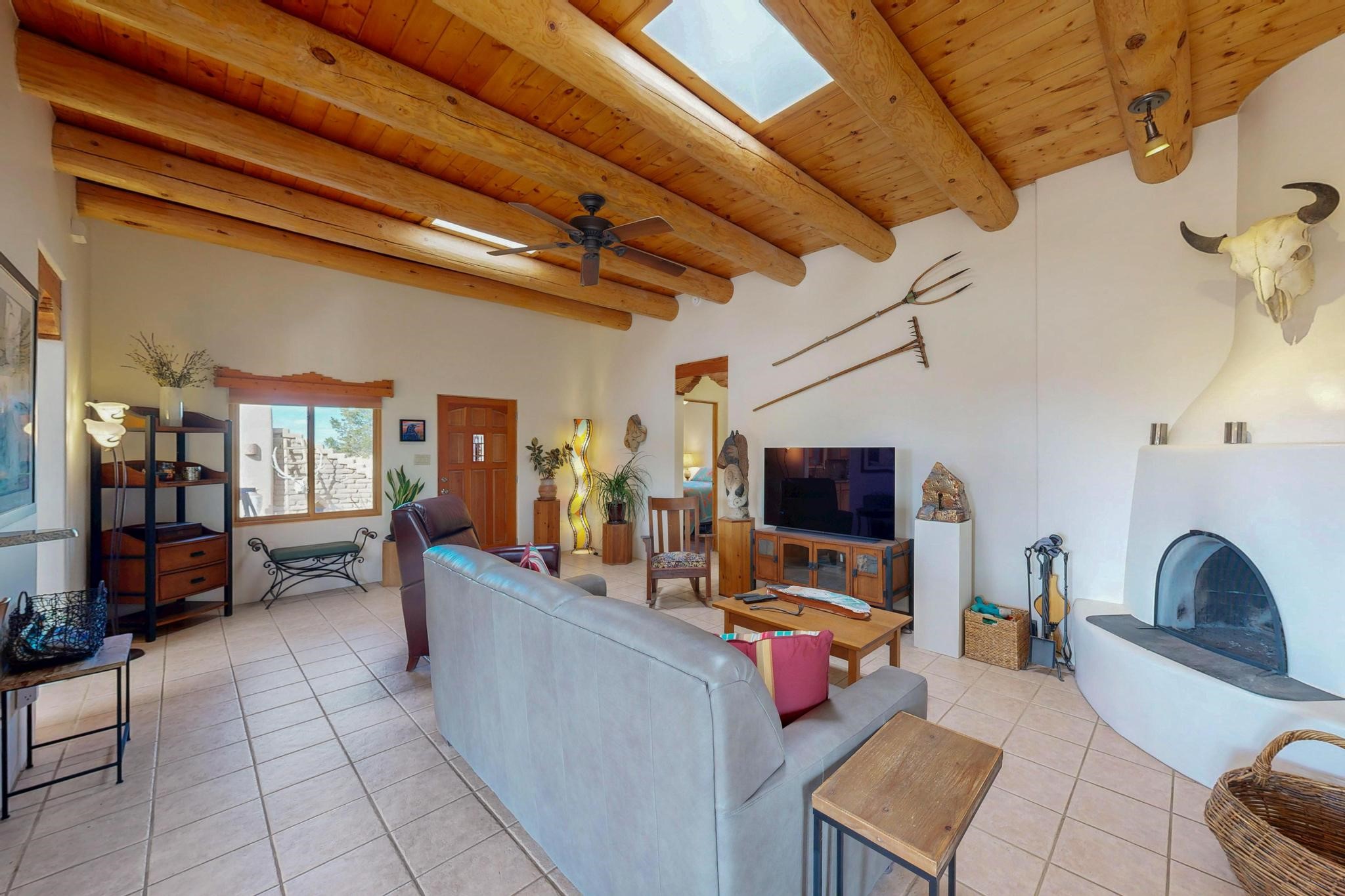 A gracious walled courtyard entry leads to this delightfully light, open plan popular design built by Casas de Suenos. High viga ceilings, tile floors, large Low E windows and a corner kiva fireplace in the living room. The spacious kitchen and dining area with patio doors to the sunset portal are ideal for entertaining. There is an extra playroom or large den and private owners suite totally separate from the guest wing. 3 minisplits have been installed as back up heating and airconditioning. New vinyl flooring has been installed in the main and guest bedrooms and the home has been re painted throughout. 220 has been added in the oversized garage for charging. The home sits on a large 2.1acre corner lot close to the Rail Trail and in the middle of Eldorado with easy access to all the amenities, local shopping and only minutes into Santa Fe