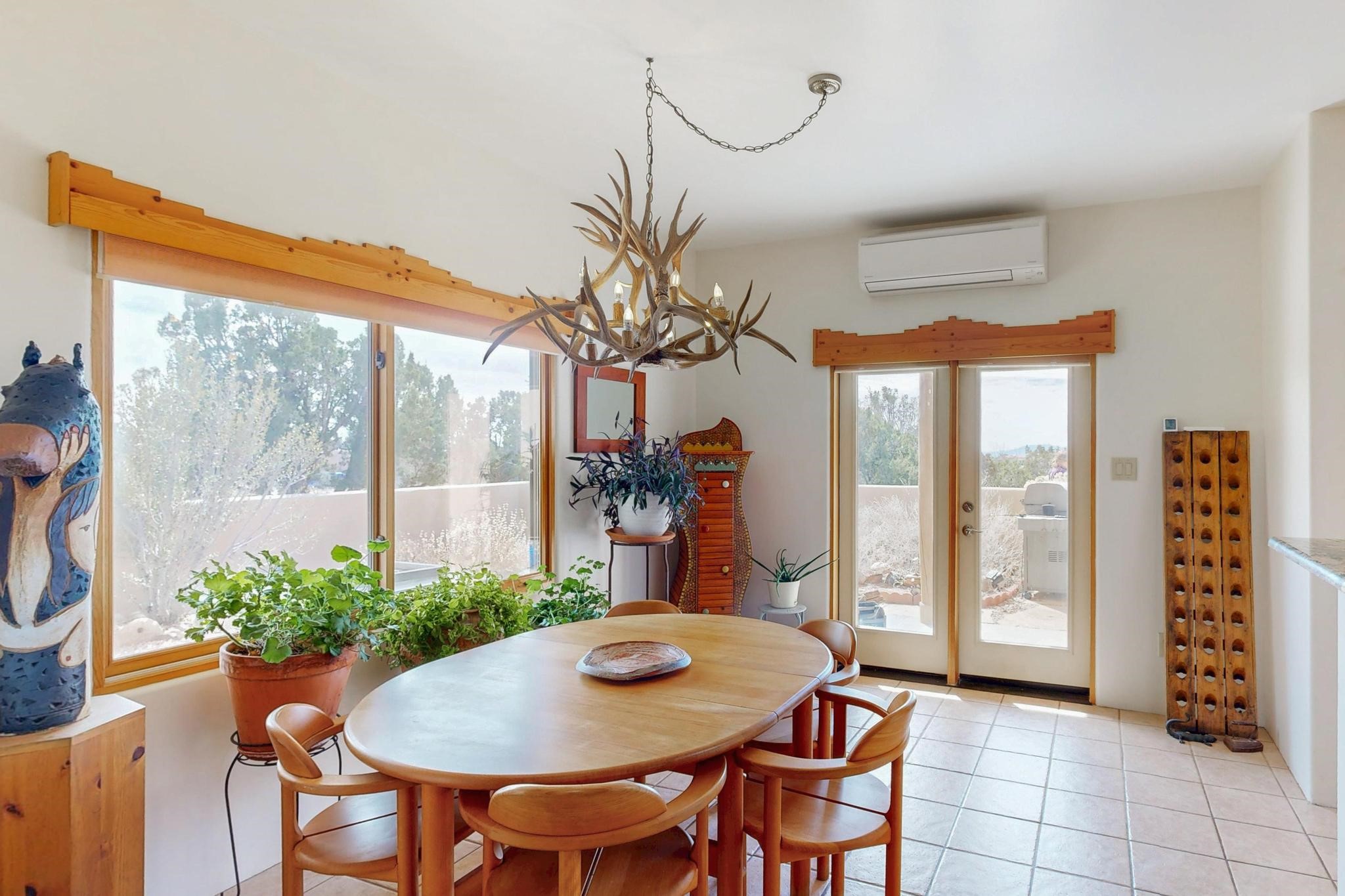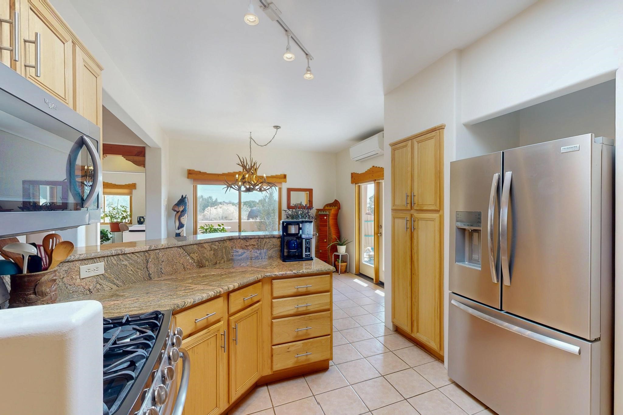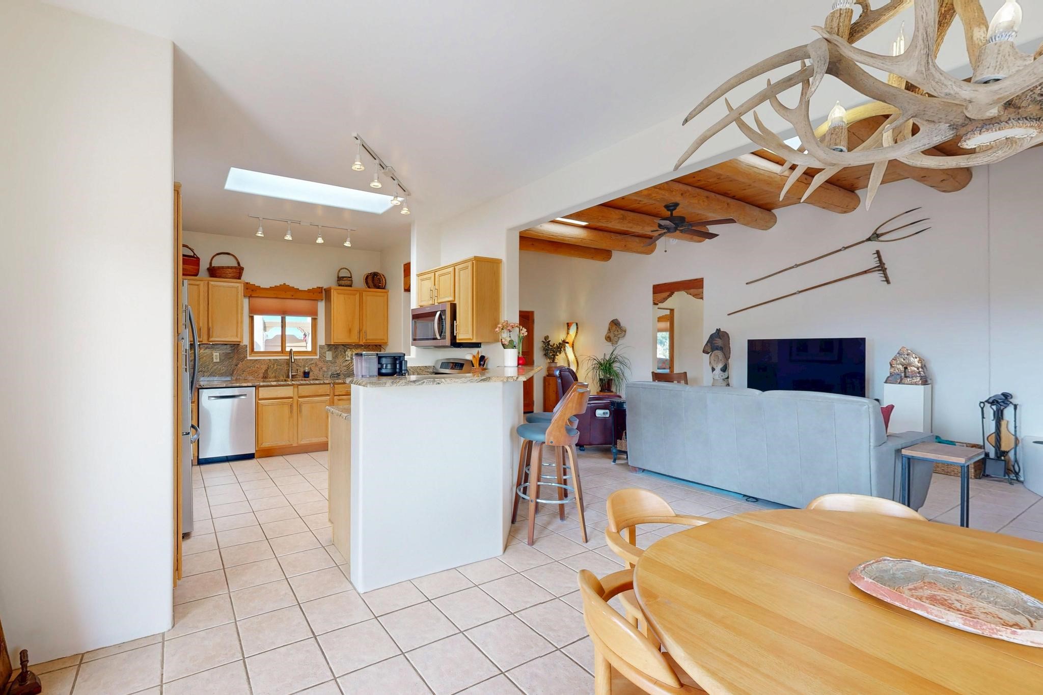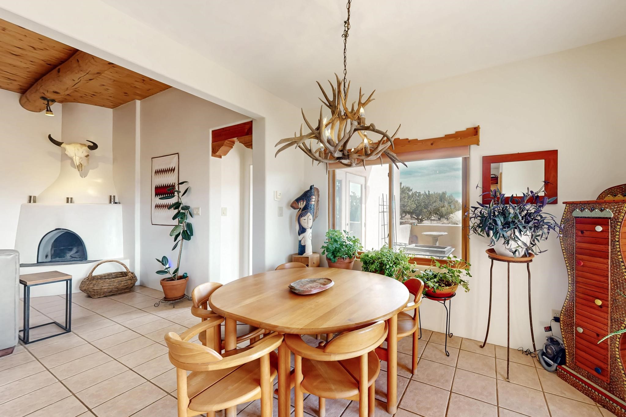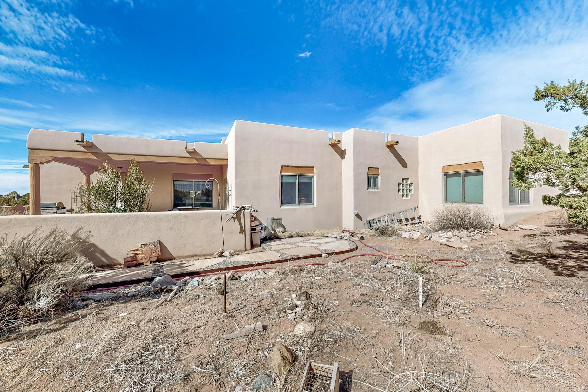 A gracious walled courtyard entry leads to this delightfully light, open plan popular design built by Casas de Suenos. High viga ceilings, tile floors, large Low E windows and a corner kiva fireplace in the living room. The spacious kitchen and dining area with patio doors to the sunset portal are ideal for entertaining. There is an extra playroom or large den and private owners suite totally separate from the guest wing. 3 minisplits have been installed as back up heating and airconditioning. New vinyl flooring has been installed in the main and guest bedrooms and the home has been re painted throughout. 220 has been added in the oversized garage for charging. The home sits on a large 2.1acre corner lot close to the Rail Trail and in the middle of Eldorado with easy access to all the amenities, local shopping and only minutes into Santa Fe