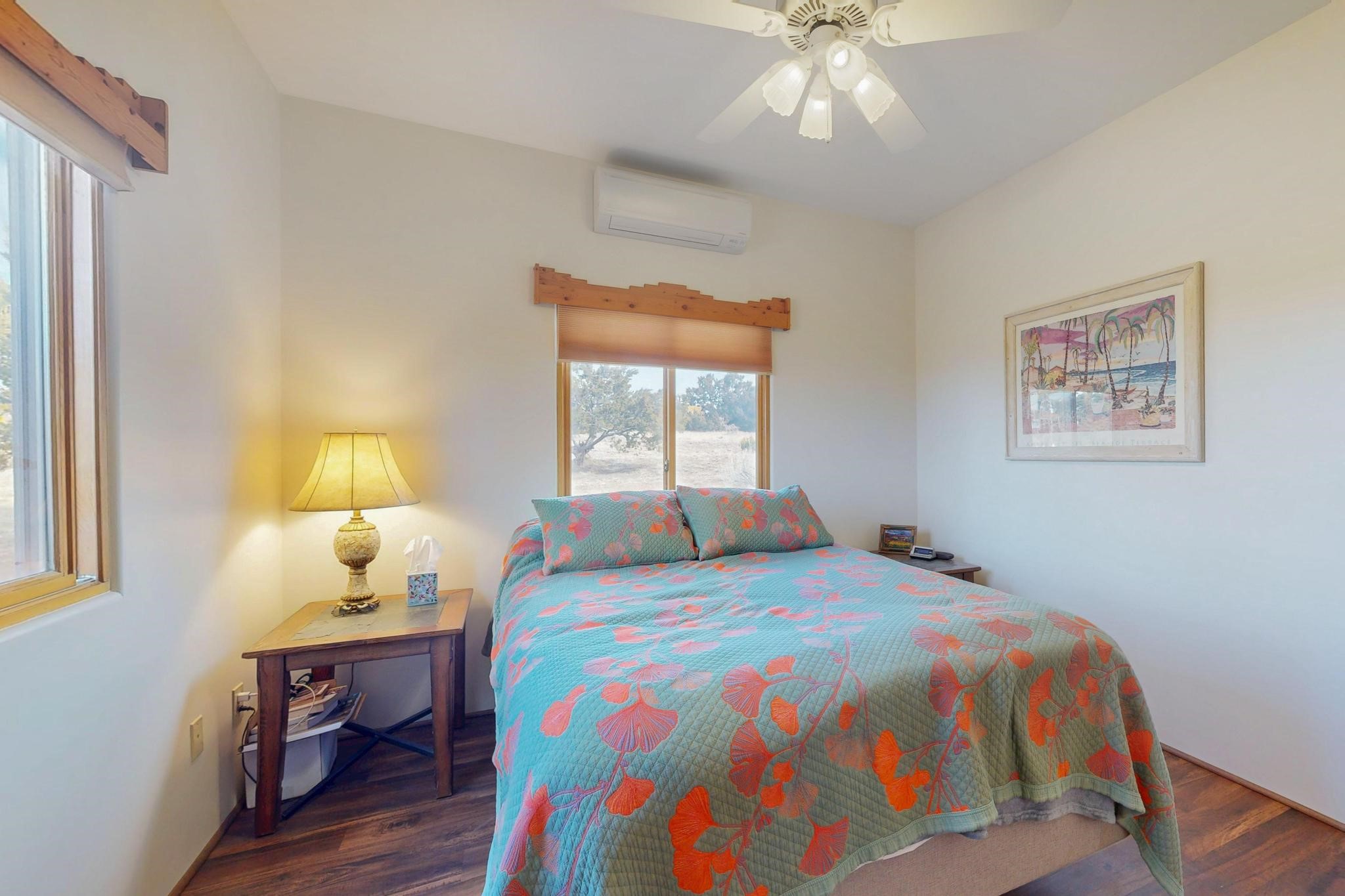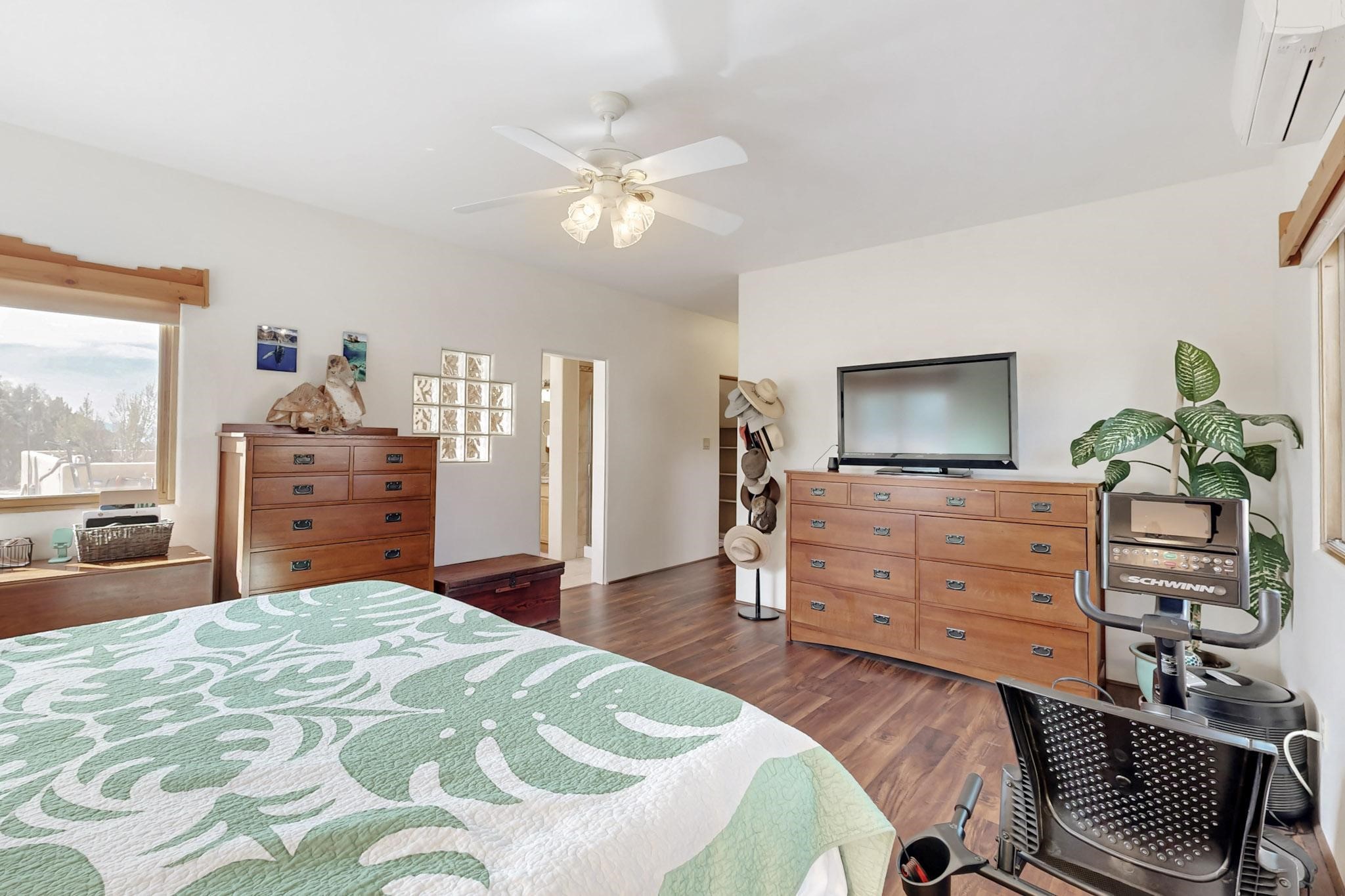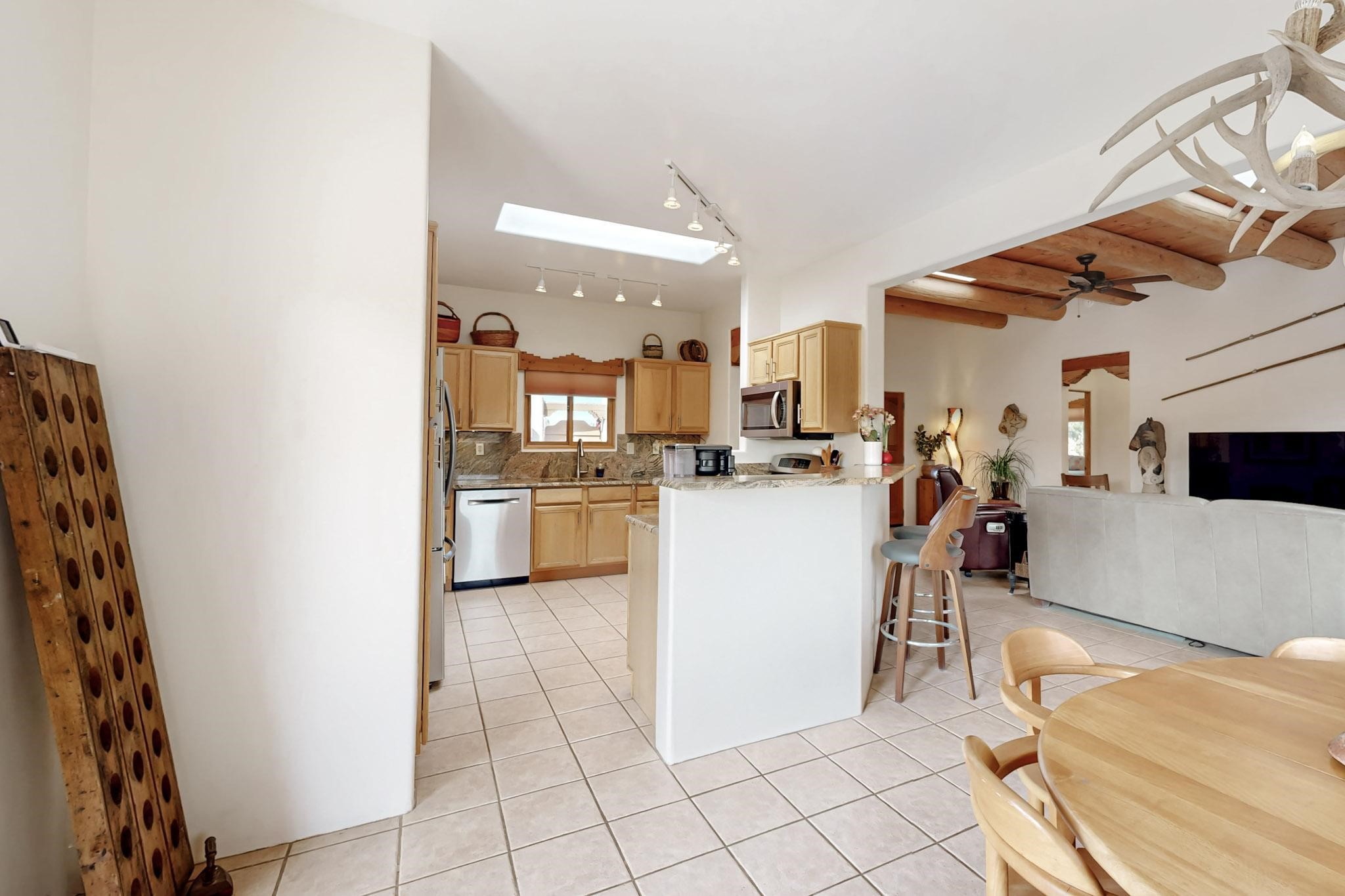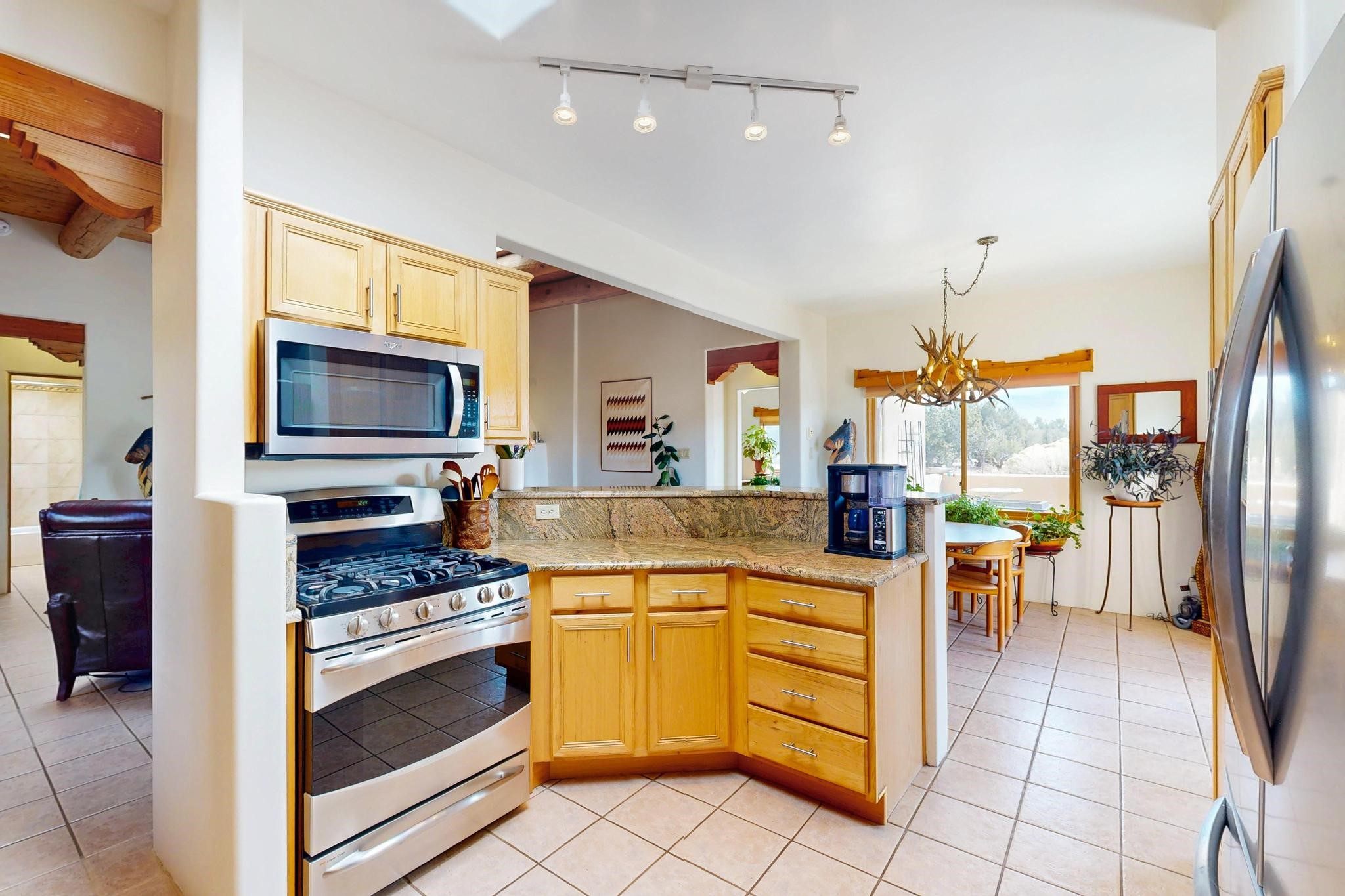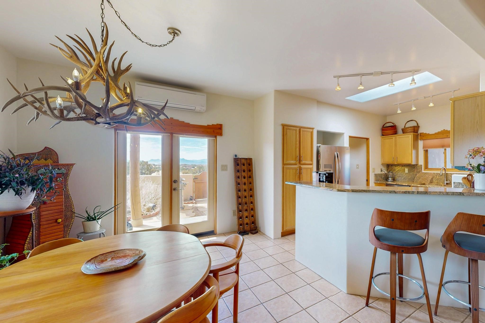 A gracious walled courtyard entry leads to this delightfully light, open plan popular design built by Casas de Suenos. High viga ceilings, tile floors, large Low E windows and a corner kiva fireplace in the living room. The spacious kitchen and dining area with patio doors to the sunset portal are ideal for entertaining. There is an extra playroom or large den and private owners suite totally separate from the guest wing. 3 minisplits have been installed as back up heating and airconditioning. New vinyl flooring has been installed in the main and guest bedrooms and the home has been re painted throughout. 220 has been added in the oversized garage for charging. The home sits on a large 2.1acre corner lot close to the Rail Trail and in the middle of Eldorado with easy access to all the amenities, local shopping and only minutes into Santa Fe