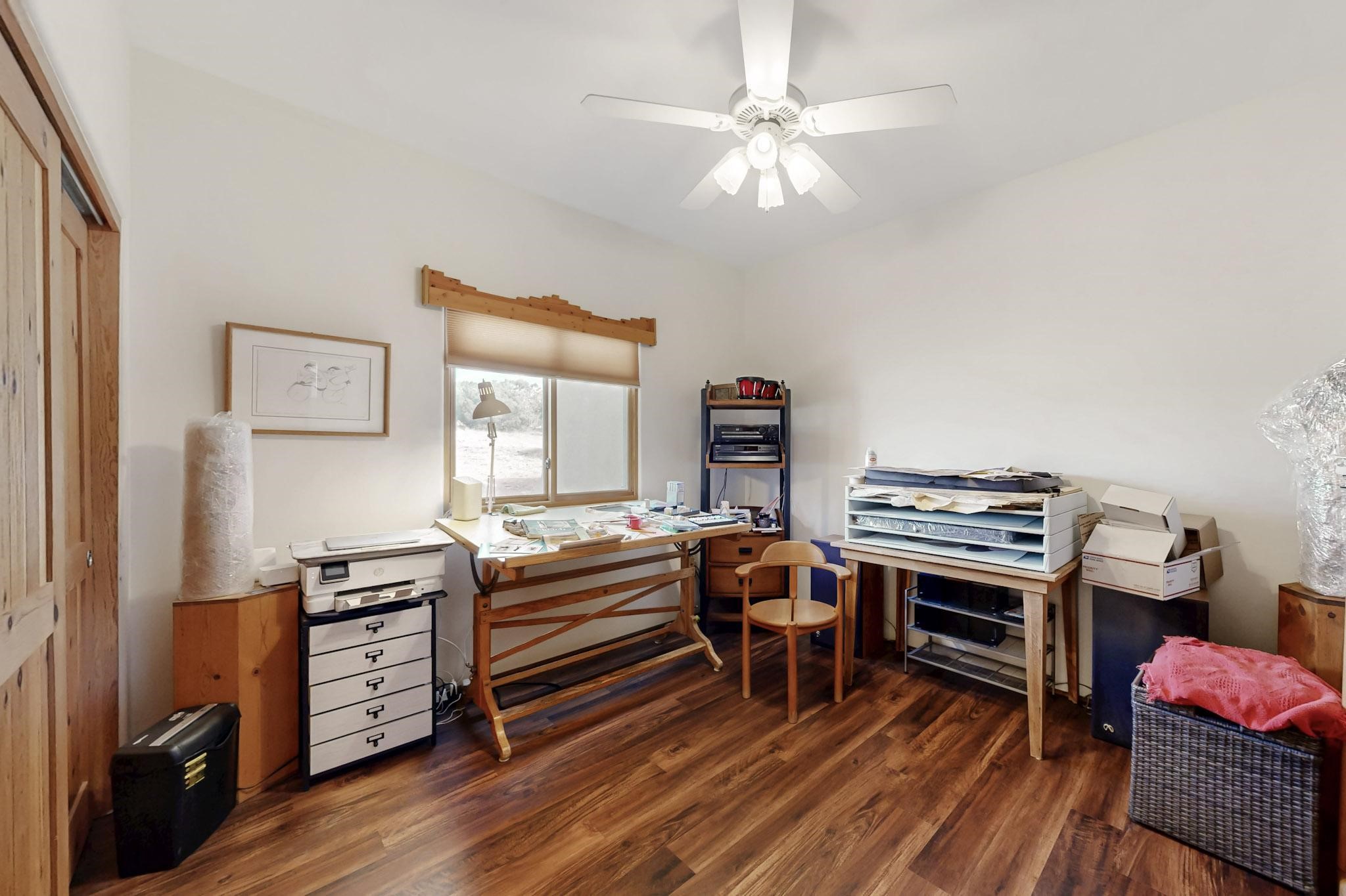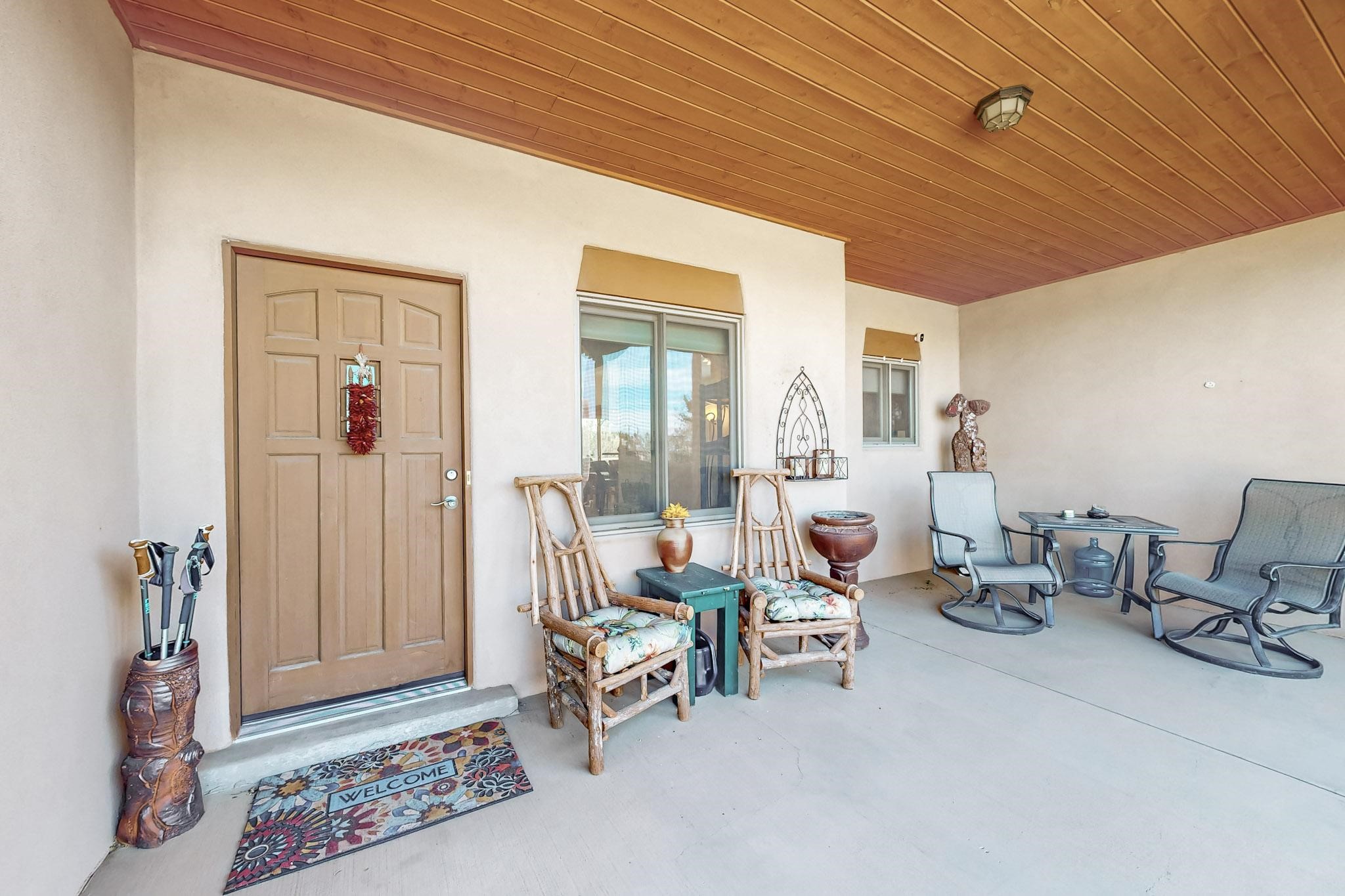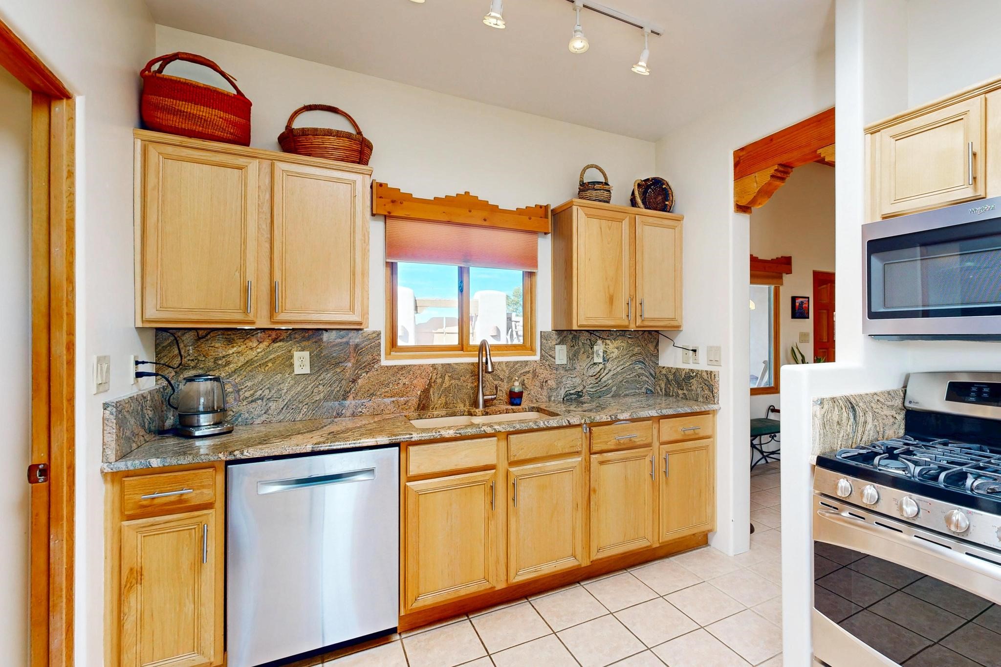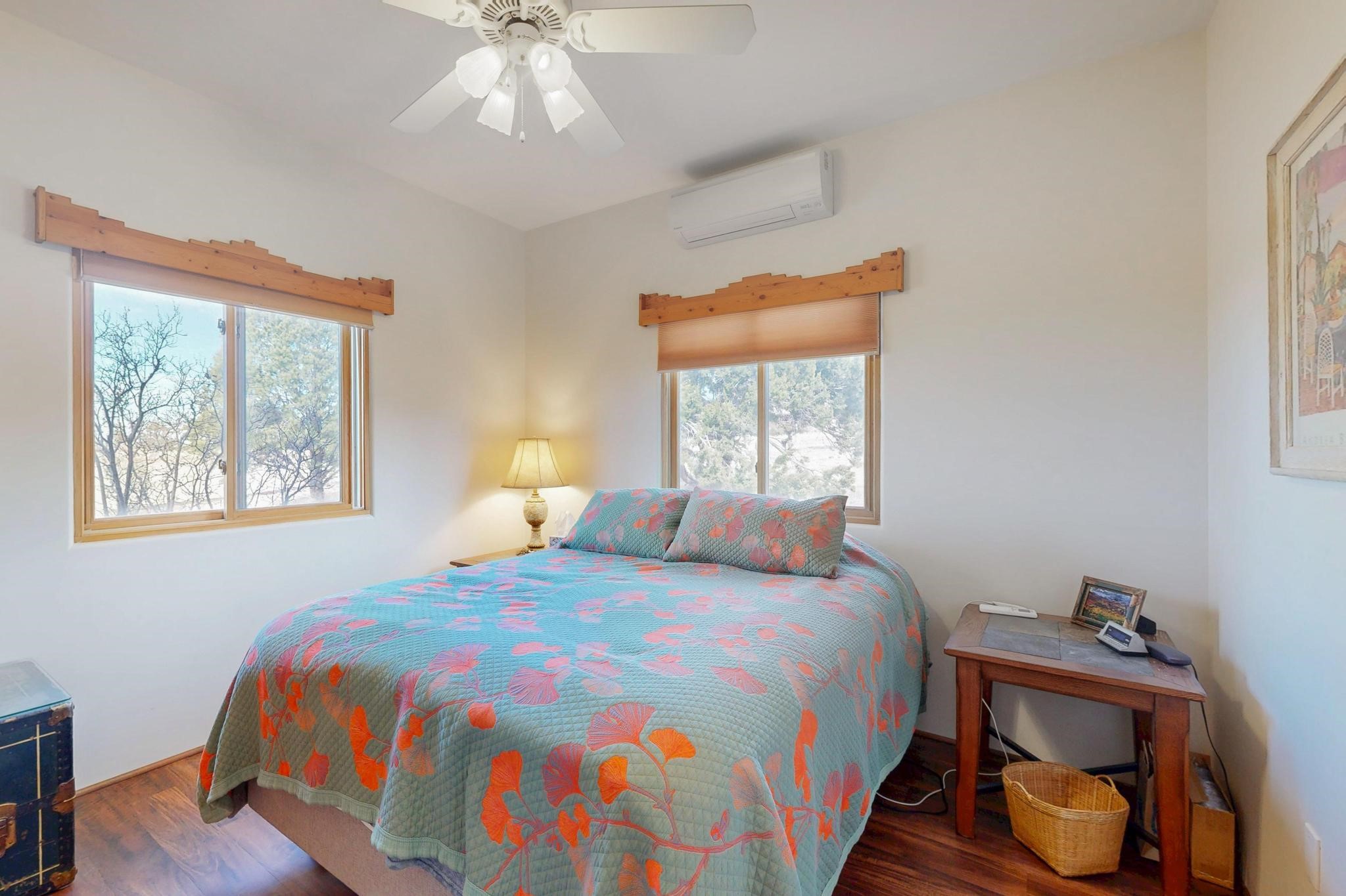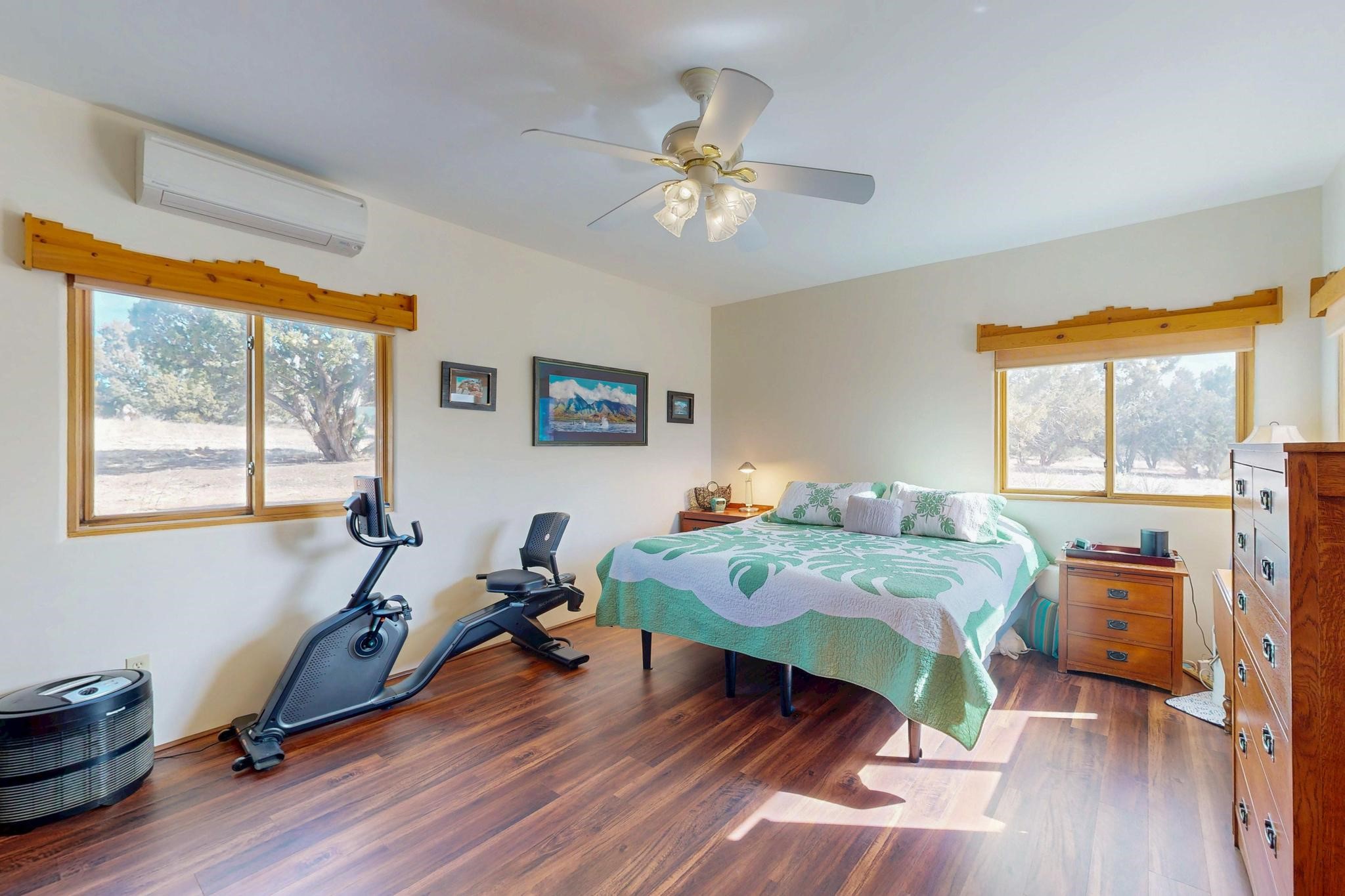 A gracious walled courtyard entry leads to this delightfully light, open plan popular design built by Casas de Suenos. High viga ceilings, tile floors, large Low E windows and a corner kiva fireplace in the living room. The spacious kitchen and dining area with patio doors to the sunset portal are ideal for entertaining. There is an extra playroom or large den and private owners suite totally separate from the guest wing. 3 minisplits have been installed as back up heating and airconditioning. New vinyl flooring has been installed in the main and guest bedrooms and the home has been re painted throughout. 220 has been added in the oversized garage for charging. The home sits on a large 2.1acre corner lot close to the Rail Trail and in the middle of Eldorado with easy access to all the amenities, local shopping and only minutes into Santa Fe