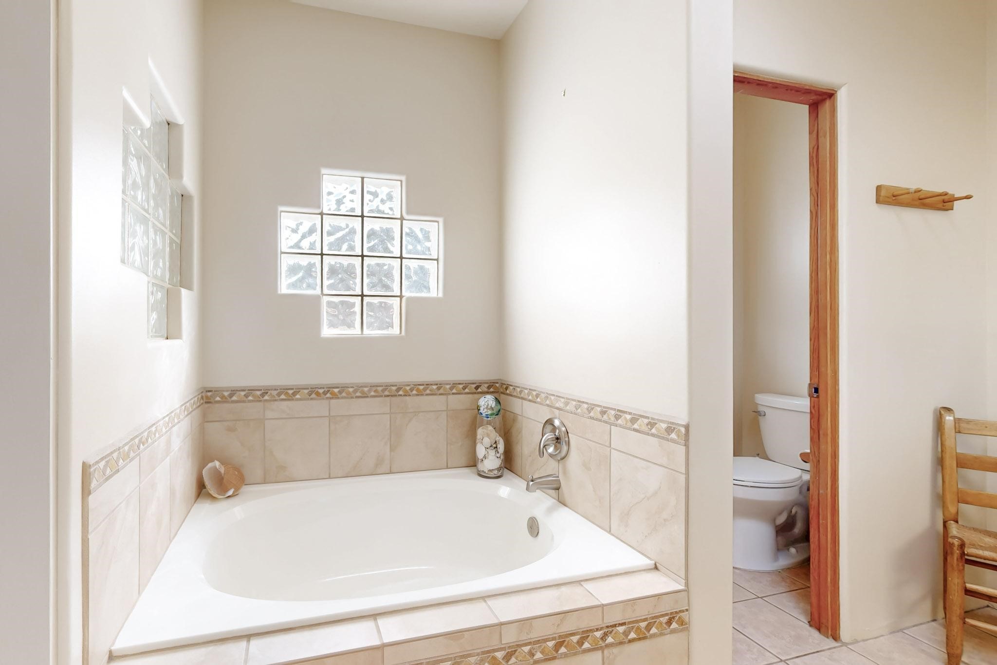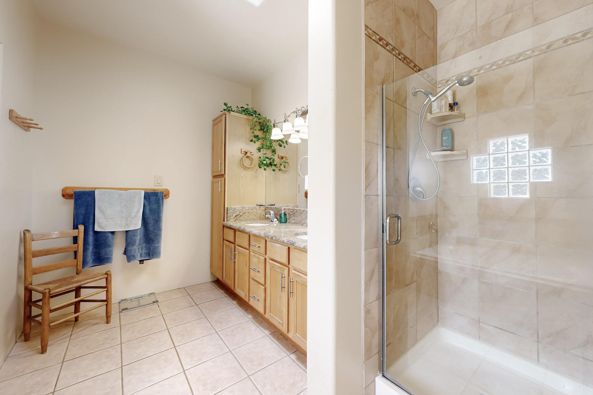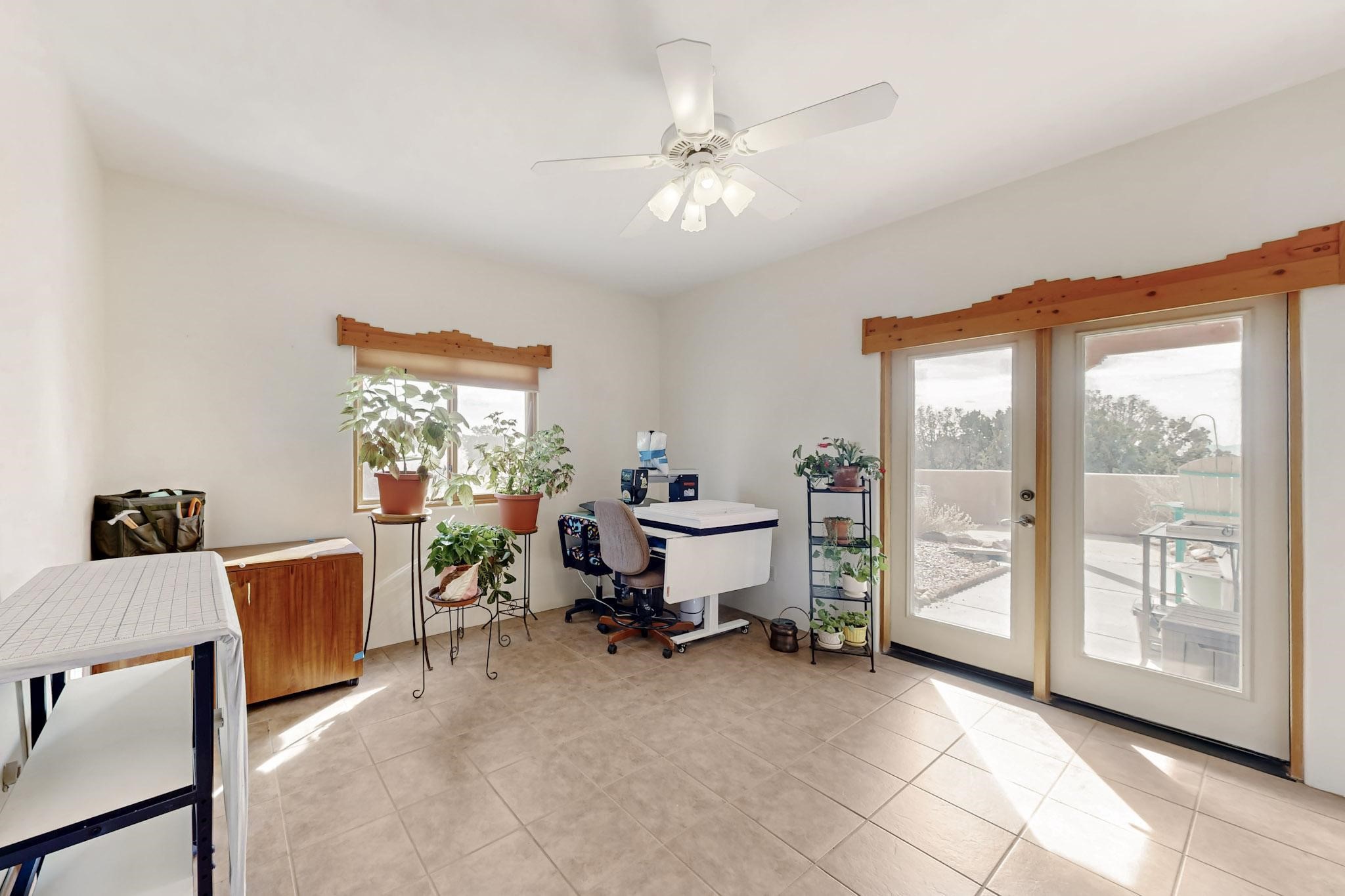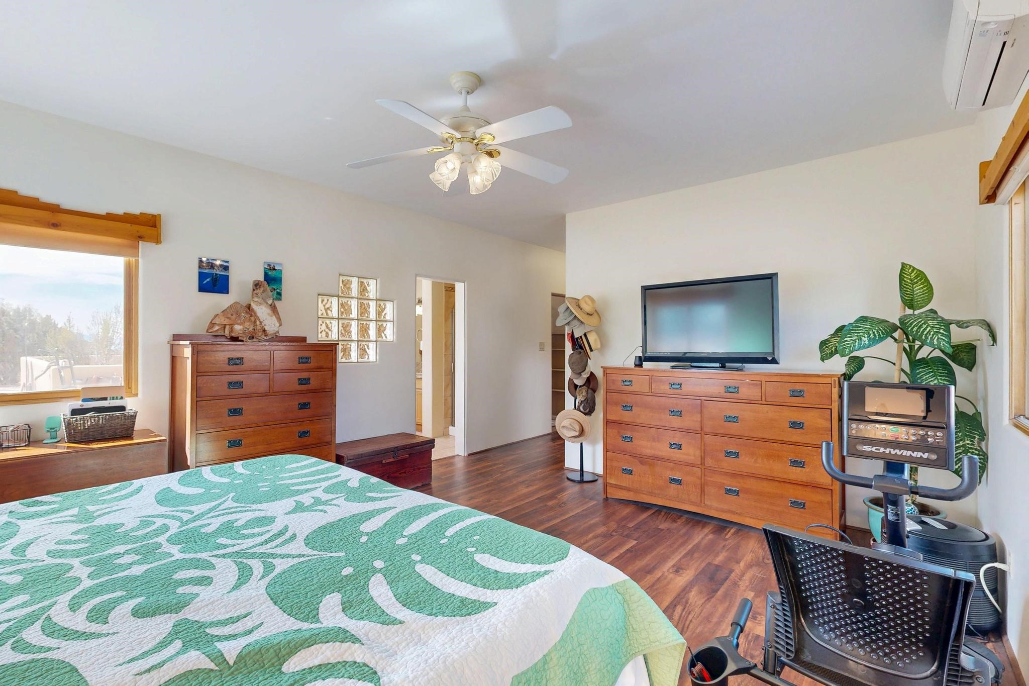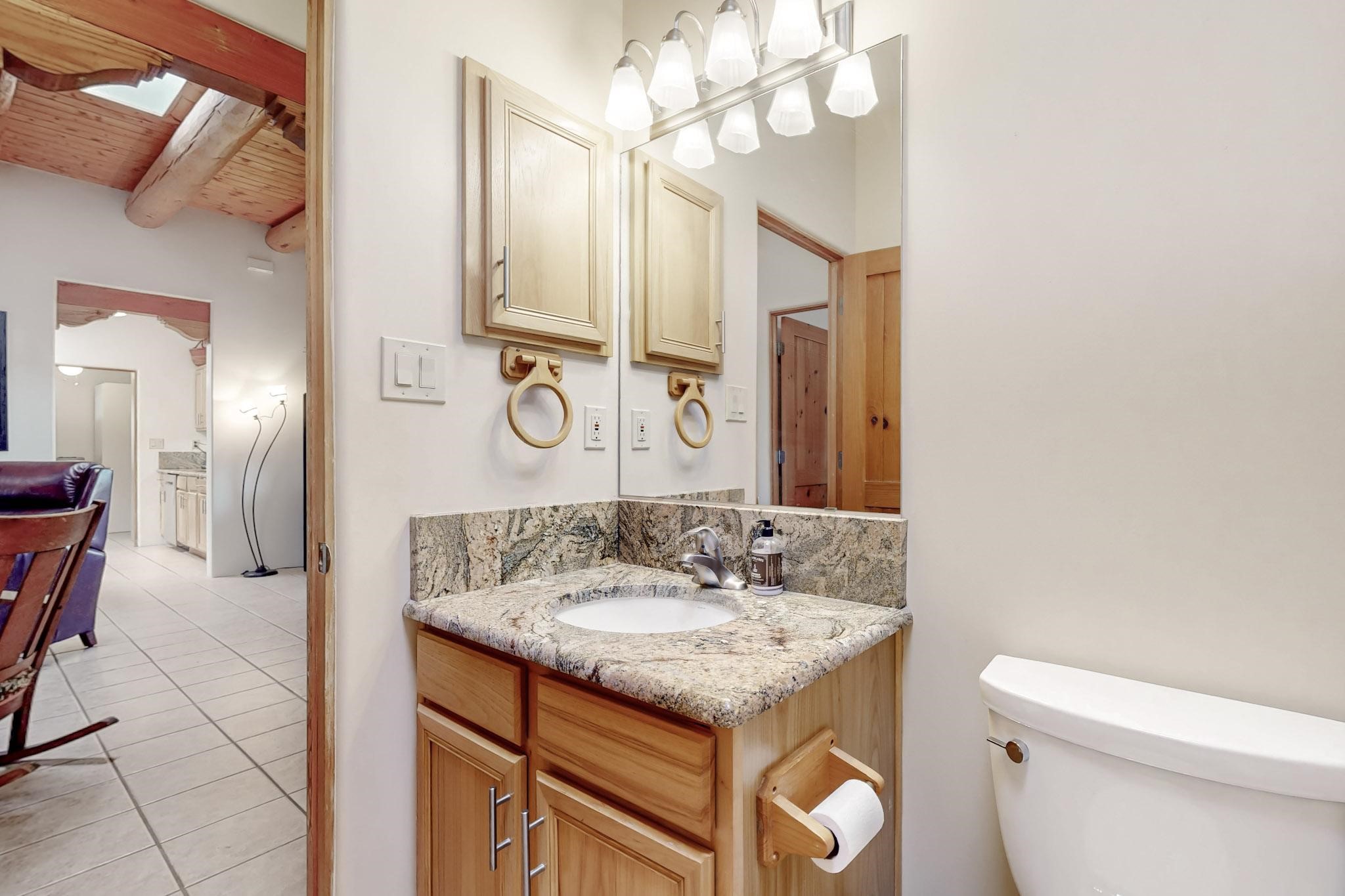A gracious walled courtyard entry leads to this delightfully light, open plan popular design built by Casas de Suenos. High viga ceilings, tile floors, large Low E windows and a corner kiva fireplace in the living room. The spacious kitchen and dining area with patio doors to the sunset portal are ideal for entertaining. There is an extra playroom or large den and private owners suite totally separate from the guest wing. 3 minisplits have been installed as back up heating and airconditioning. New vinyl flooring has been installed in the main and guest bedrooms and the home has been re painted throughout. 220 has been added in the oversized garage for charging. The home sits on a large 2.1acre corner lot close to the Rail Trail and in the middle of Eldorado with easy access to all the amenities, local shopping and only minutes into Santa Fe