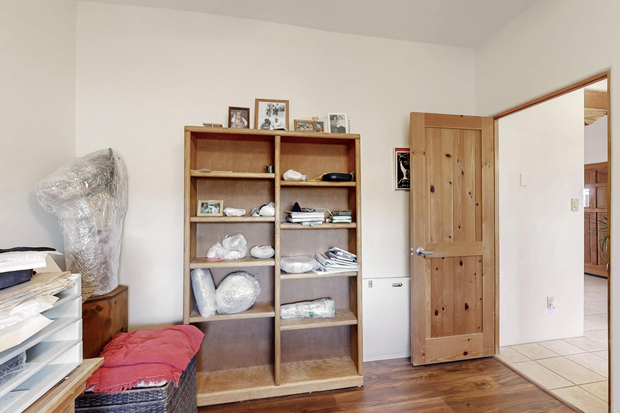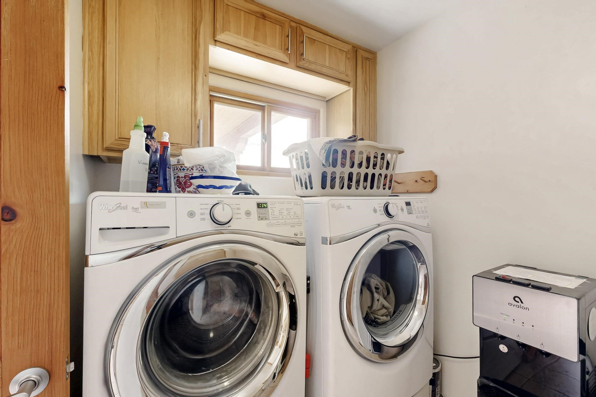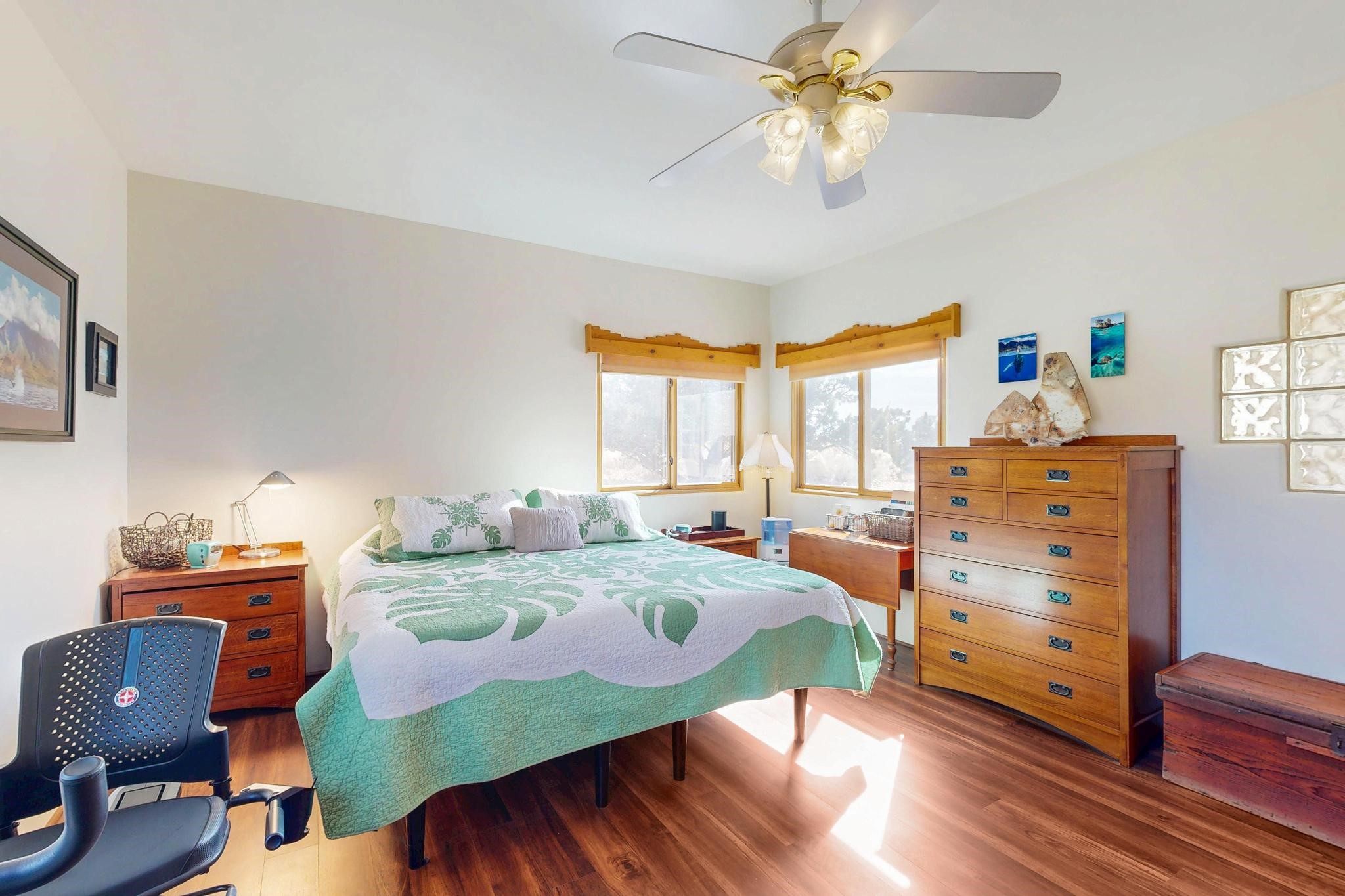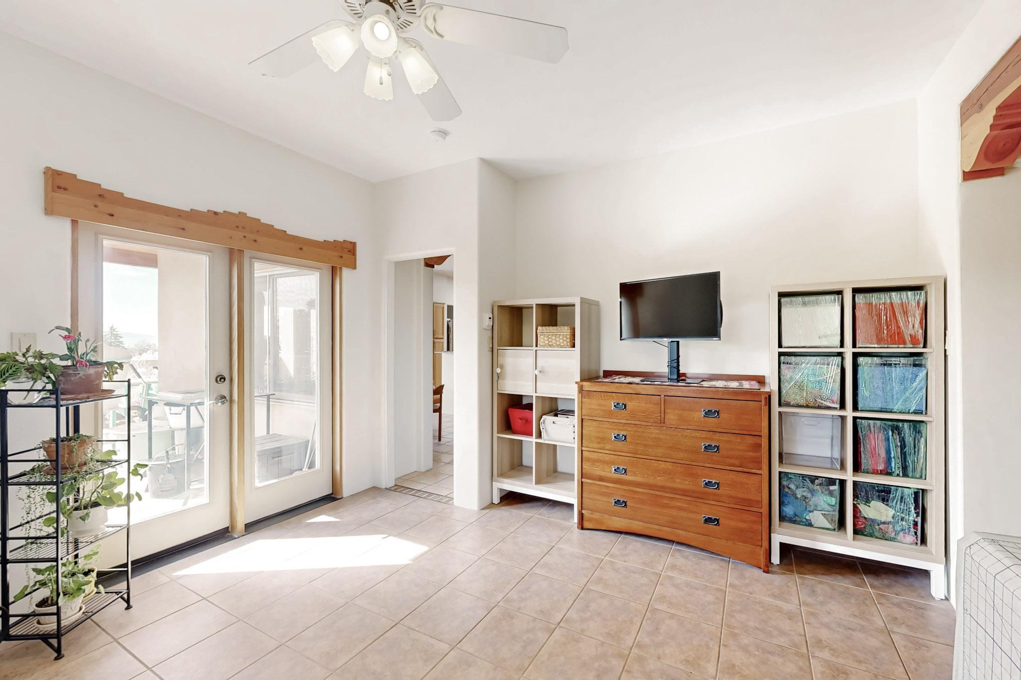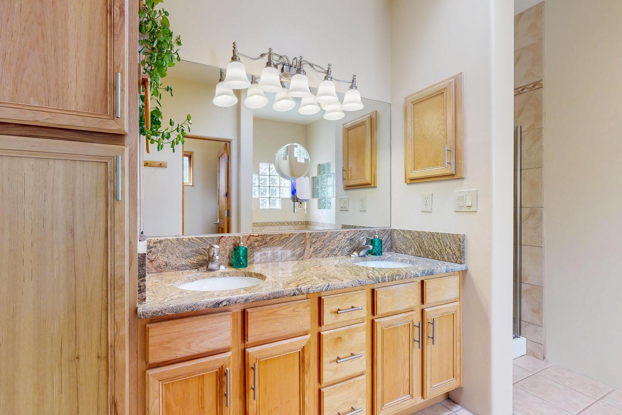 A gracious walled courtyard entry leads to this delightfully light, open plan popular design built by Casas de Suenos. High viga ceilings, tile floors, large Low E windows and a corner kiva fireplace in the living room. The spacious kitchen and dining area with patio doors to the sunset portal are ideal for entertaining. There is an extra playroom or large den and private owners suite totally separate from the guest wing. 3 minisplits have been installed as back up heating and airconditioning. New vinyl flooring has been installed in the main and guest bedrooms and the home has been re painted throughout. 220 has been added in the oversized garage for charging. The home sits on a large 2.1acre corner lot close to the Rail Trail and in the middle of Eldorado with easy access to all the amenities, local shopping and only minutes into Santa Fe