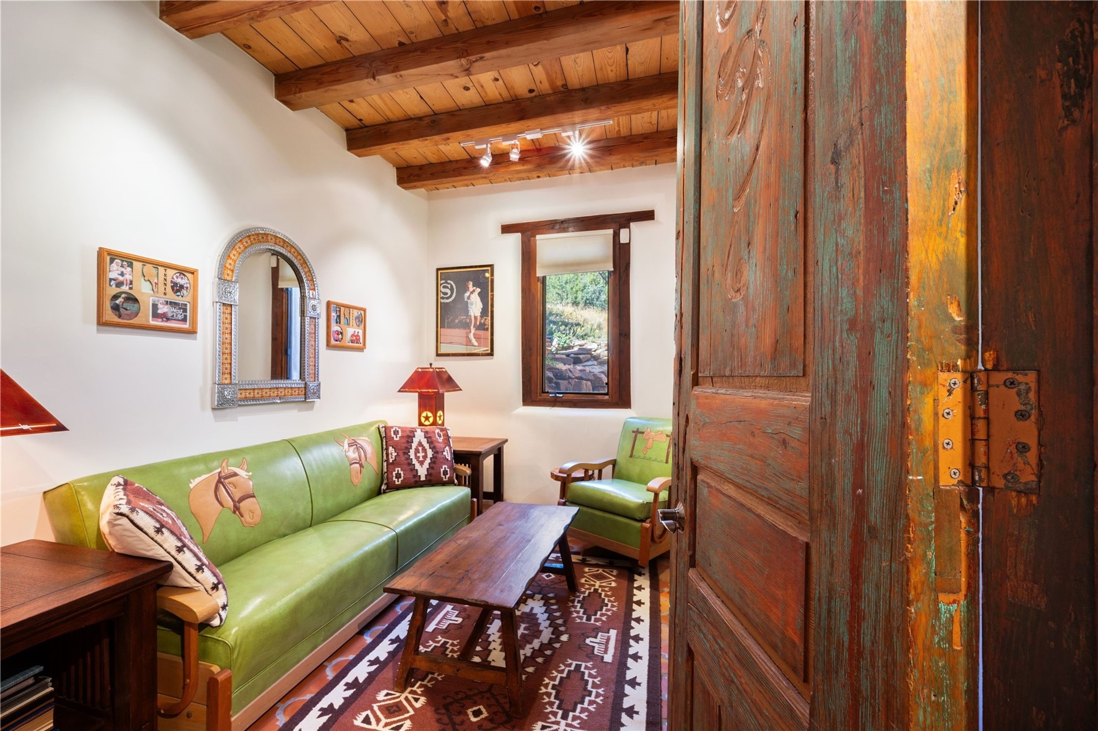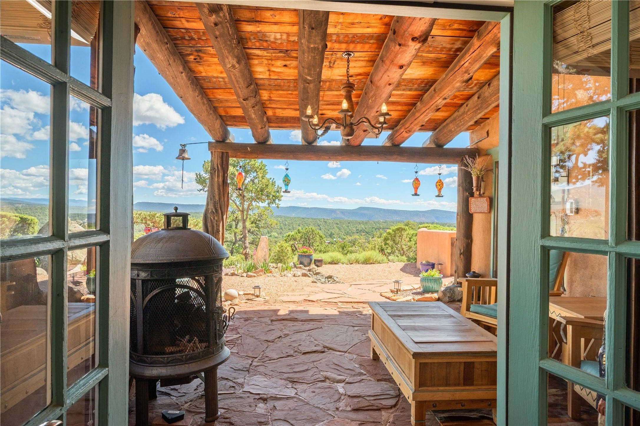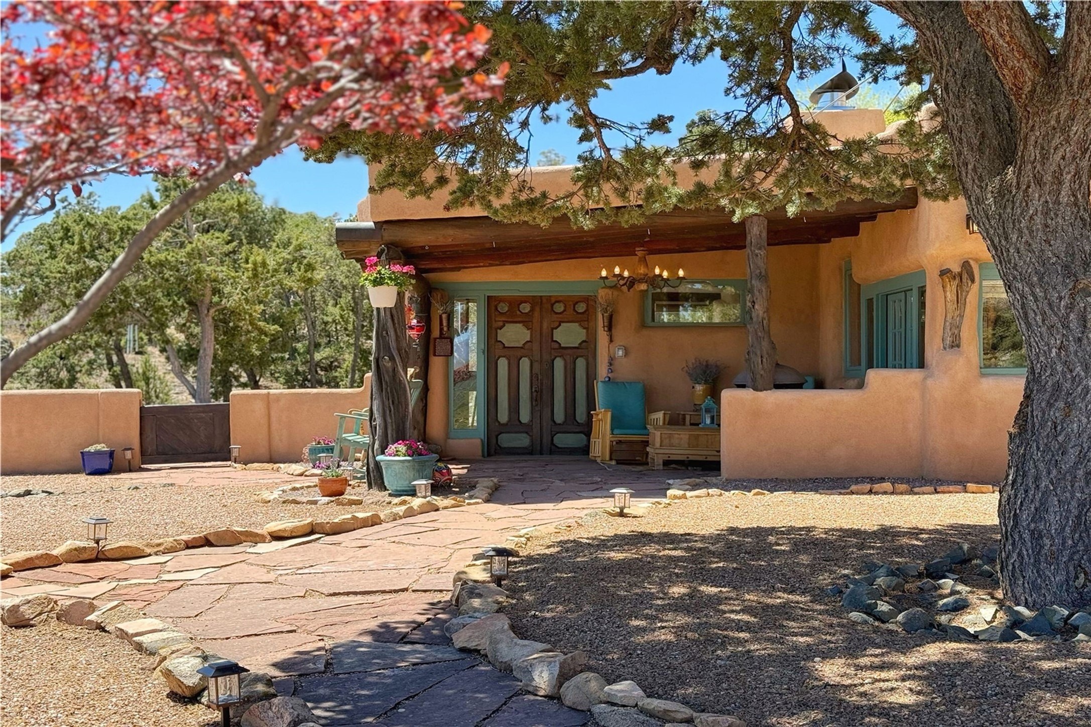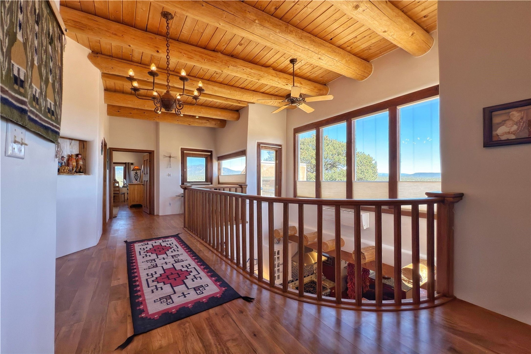 Discover a rare one-of-a-kind Hacienda w/ Studio on 6+ acres boasting dramatic rock outcroppings, sweeping views of Apache Ridge, Rowe Mesa and the Sangre de Cristos in a private pristine setting, just 20 minutes from the Santa Fe Plaza. Perched on a hillside to capture the breathtaking surroundings, this custom-built adobe Pueblo-style gem offers incredible craftsmanship, rounded architecture and unparalleled custom artisan touches. Soaring ceilings w/massive wood vigas throughout, exquisite Saltillo tile, cherry, hardwood and brick floors, rounded art walls curved arches, heavy antique carved doors, a walnut staircase, built-in bancos, recessed nichos, multiple portals and skylights abound. The current owners have thoughtfully renovated the house to add a sense of grand luxury. An added 2-car garage w/custom cabinetry includes an attached studio w/private entry. Follow the path to a small hobbit house-like hideaway to enjoy the exhilarating mountain air and views. Another path leads to a 2-3 stall barn/workshop.The floorplan moves effortlessly between indoor and outdoor living to showcase the arresting views and superb landscaping. The primary suite boasts a private deck, adjoiningsitting room w/curved window walls, custom closets, one cedar lined, a spa-like bath w/giant jetted soaking tub and private courtyard. The kitchen highlights rich cherryvcabinetry, wood-burning stove and opens to a spacious dining room w/patio. Rounded architecture flows seamlessly into the living room w/panoramic bays of passive-solar windows, bancos, a large Kiva wood-burning fireplace, and main portal access.Other spaces include an office, spacious media/family room, two additional bedrooms, one w/private entry and patio, a mudroom, plus a versatile flex room, ideal for an overflowbedroom. This home is truly an architectural wonder to experience. With its incredible craftsmanship, artisan details and never-ending vistas, 8 Hampton Road marries luxury w/privacy and historic charm.