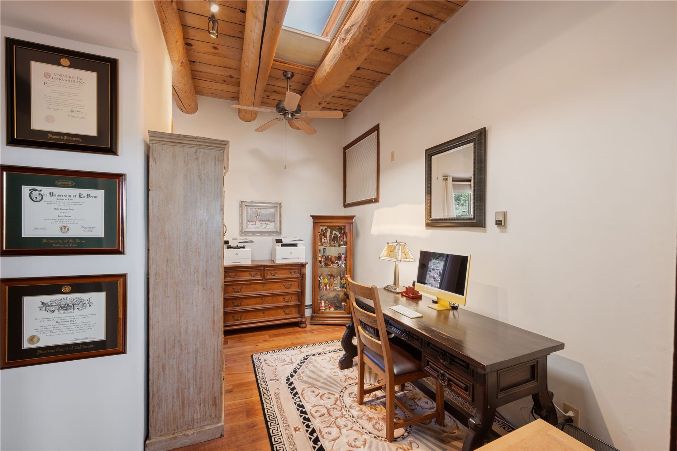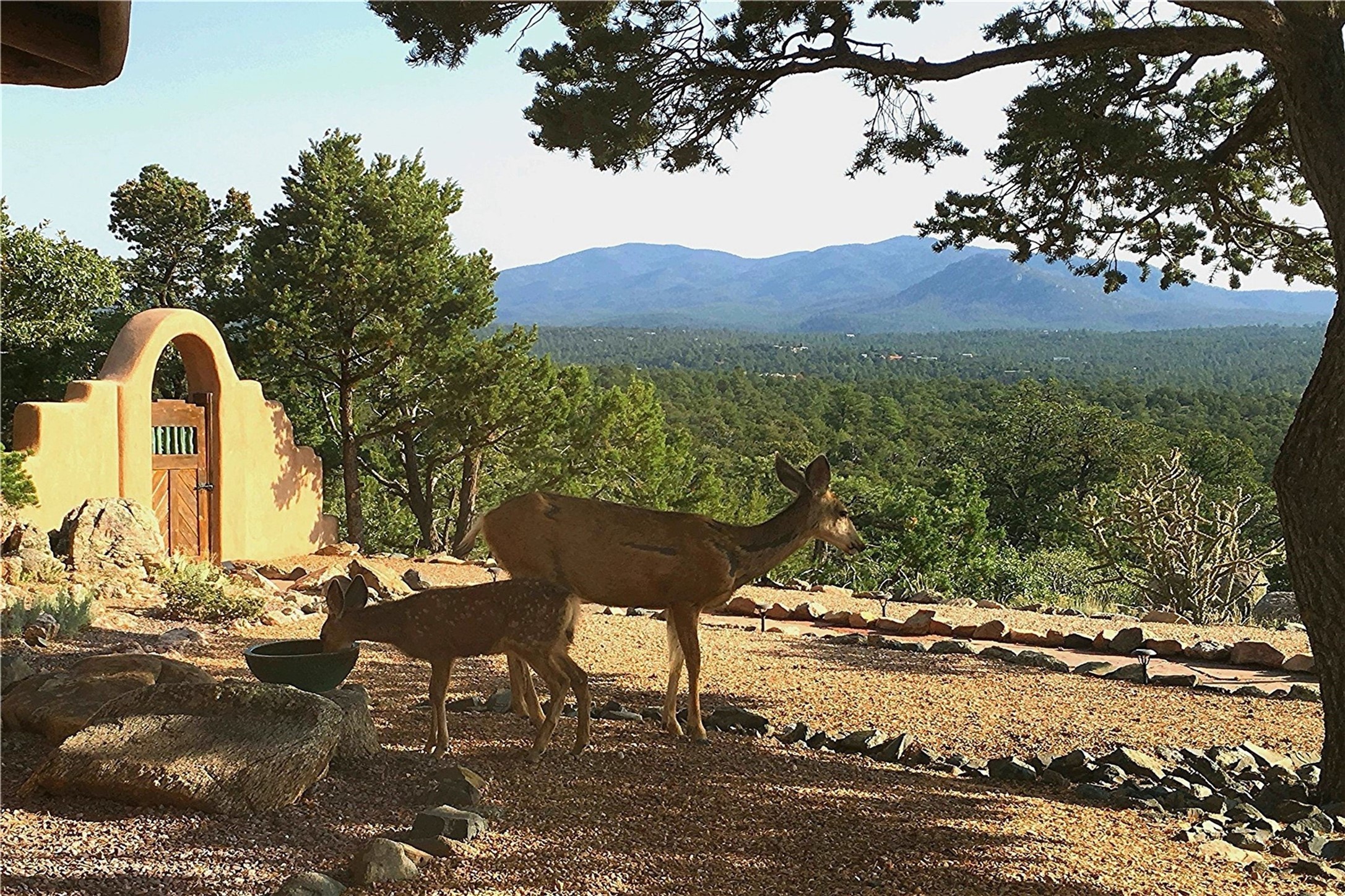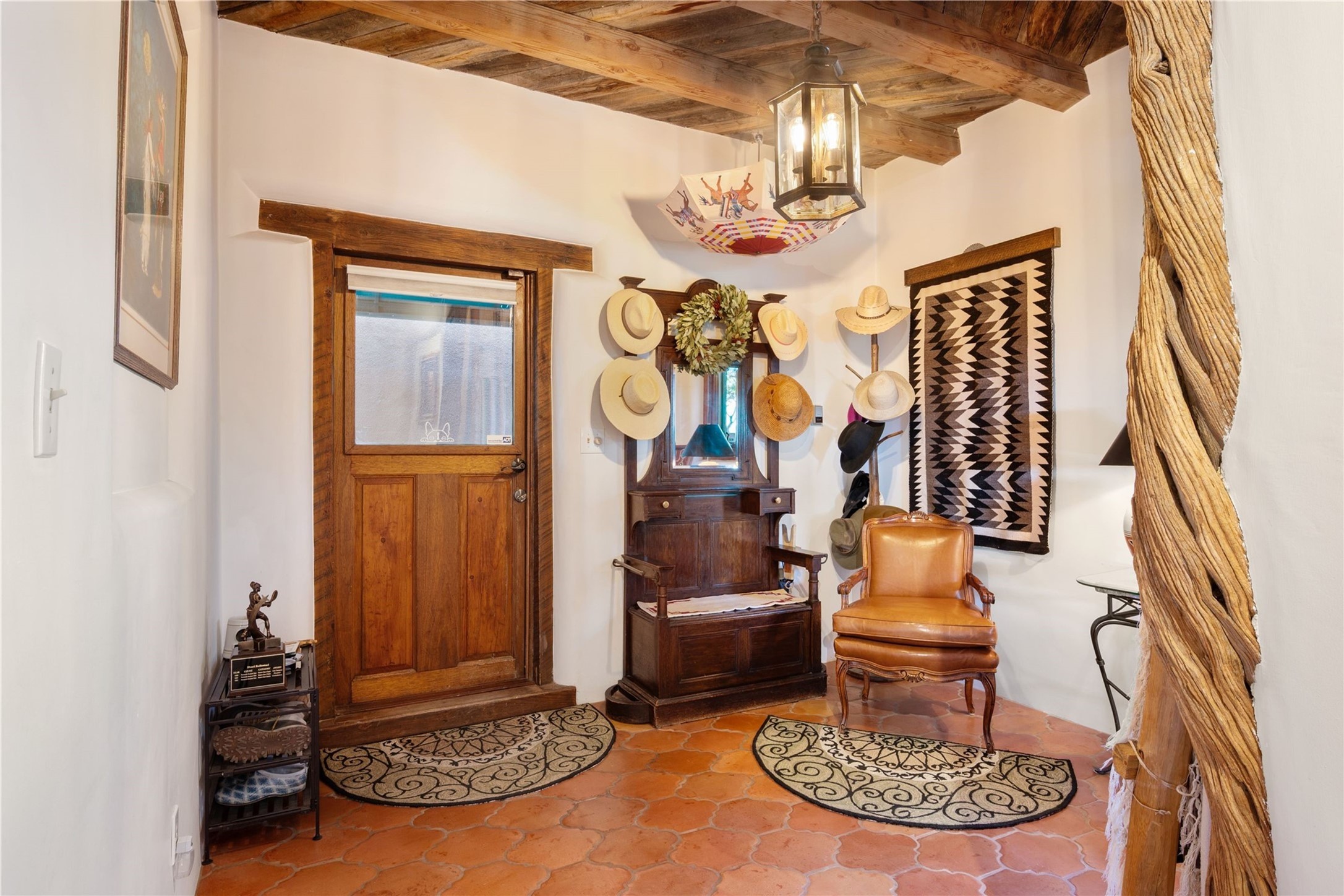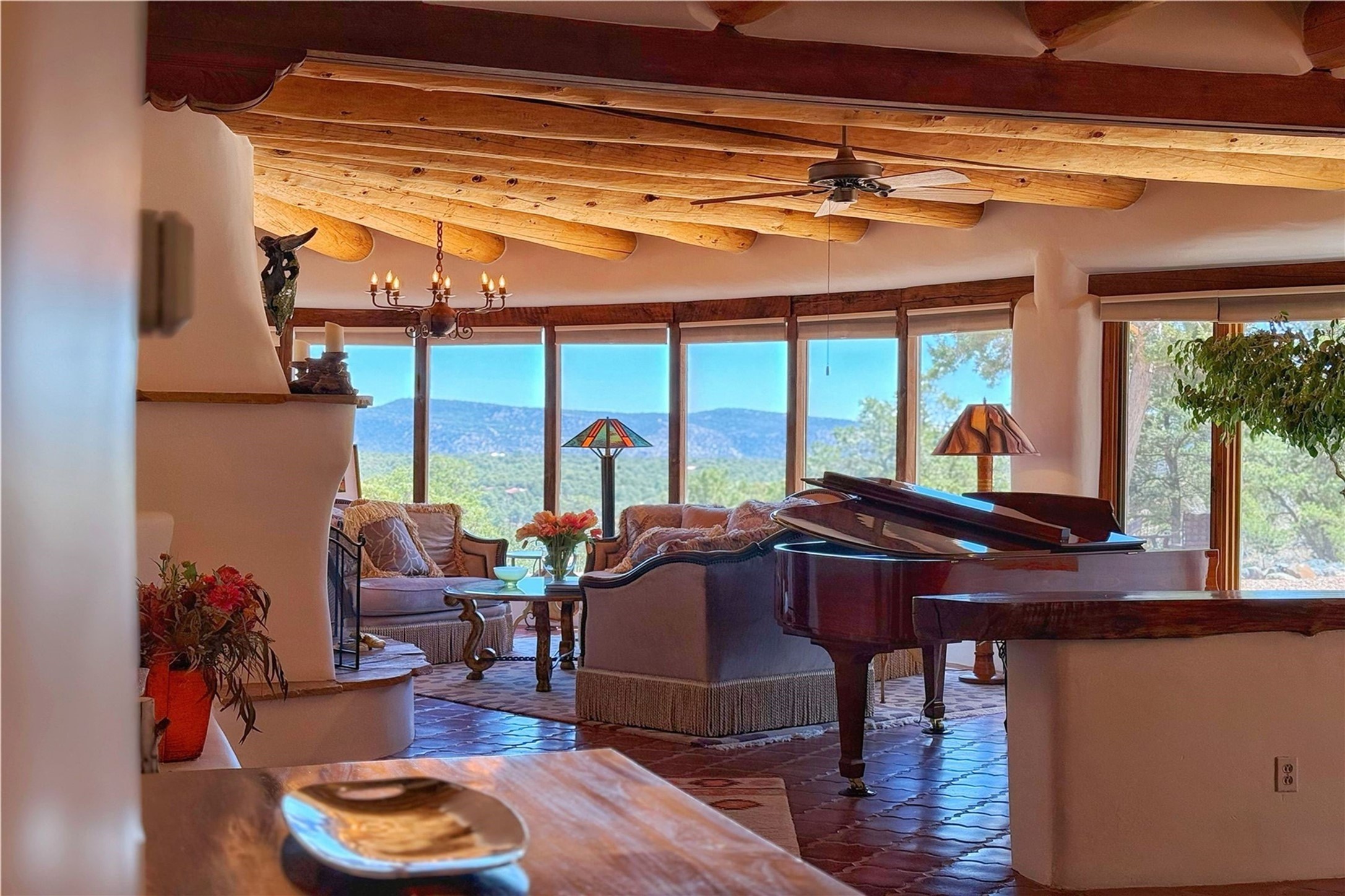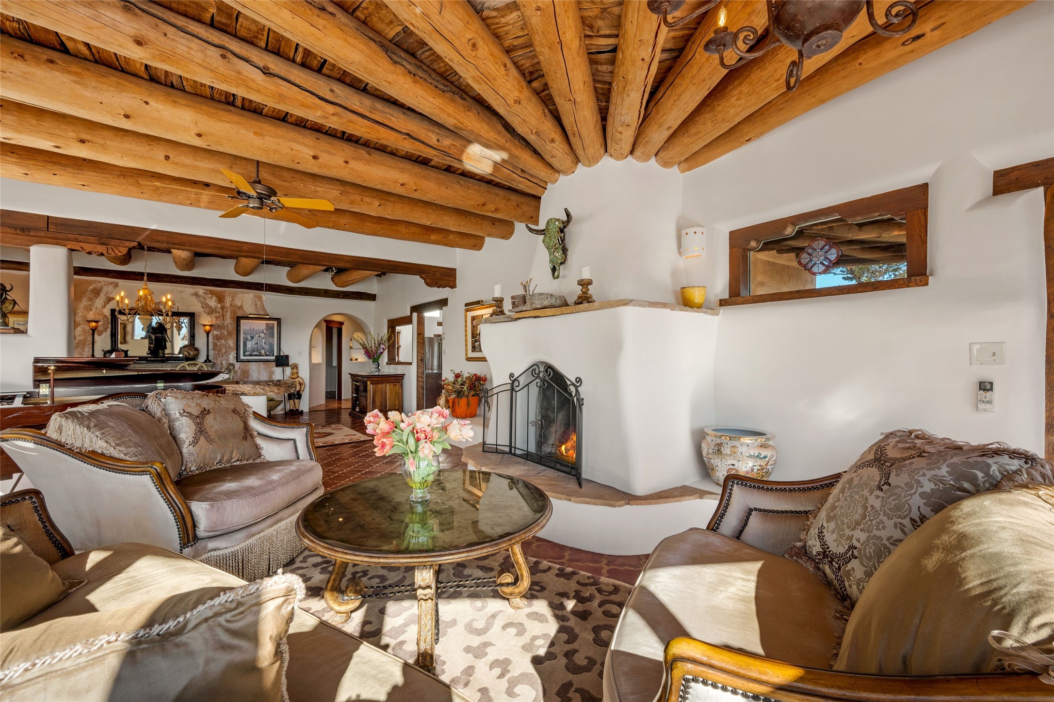Discover a rare one-of-a-kind Hacienda w/ Studio on 6+ acres boasting dramatic rock outcroppings, sweeping views of Apache Ridge, Rowe Mesa and the Sangre de Cristos in a private pristine setting, just 20 minutes from the Santa Fe Plaza. Perched on a hillside to capture the breathtaking surroundings, this custom-built adobe Pueblo-style gem offers incredible craftsmanship, rounded architecture and unparalleled custom artisan touches. Soaring ceilings w/massive wood vigas throughout, exquisite Saltillo tile, cherry, hardwood and brick floors, rounded art walls curved arches, heavy antique carved doors, a walnut staircase, built-in bancos, recessed nichos, multiple portals and skylights abound. The current owners have thoughtfully renovated the house to add a sense of grand luxury. An added 2-car garage w/custom cabinetry includes an attached studio w/private entry. Follow the path to a small hobbit house-like hideaway to enjoy the exhilarating mountain air and views. Another path leads to a 2-3 stall barn/workshop.The floorplan moves effortlessly between indoor and outdoor living to showcase the arresting views and superb landscaping. The primary suite boasts a private deck, adjoiningsitting room w/curved window walls, custom closets, one cedar lined, a spa-like bath w/giant jetted soaking tub and private courtyard. The kitchen highlights rich cherryvcabinetry, wood-burning stove and opens to a spacious dining room w/patio. Rounded architecture flows seamlessly into the living room w/panoramic bays of passive-solar windows, bancos, a large Kiva wood-burning fireplace, and main portal access.Other spaces include an office, spacious media/family room, two additional bedrooms, one w/private entry and patio, a mudroom, plus a versatile flex room, ideal for an overflowbedroom. This home is truly an architectural wonder to experience. With its incredible craftsmanship, artisan details and never-ending vistas, 8 Hampton Road marries luxury w/privacy and historic charm.
