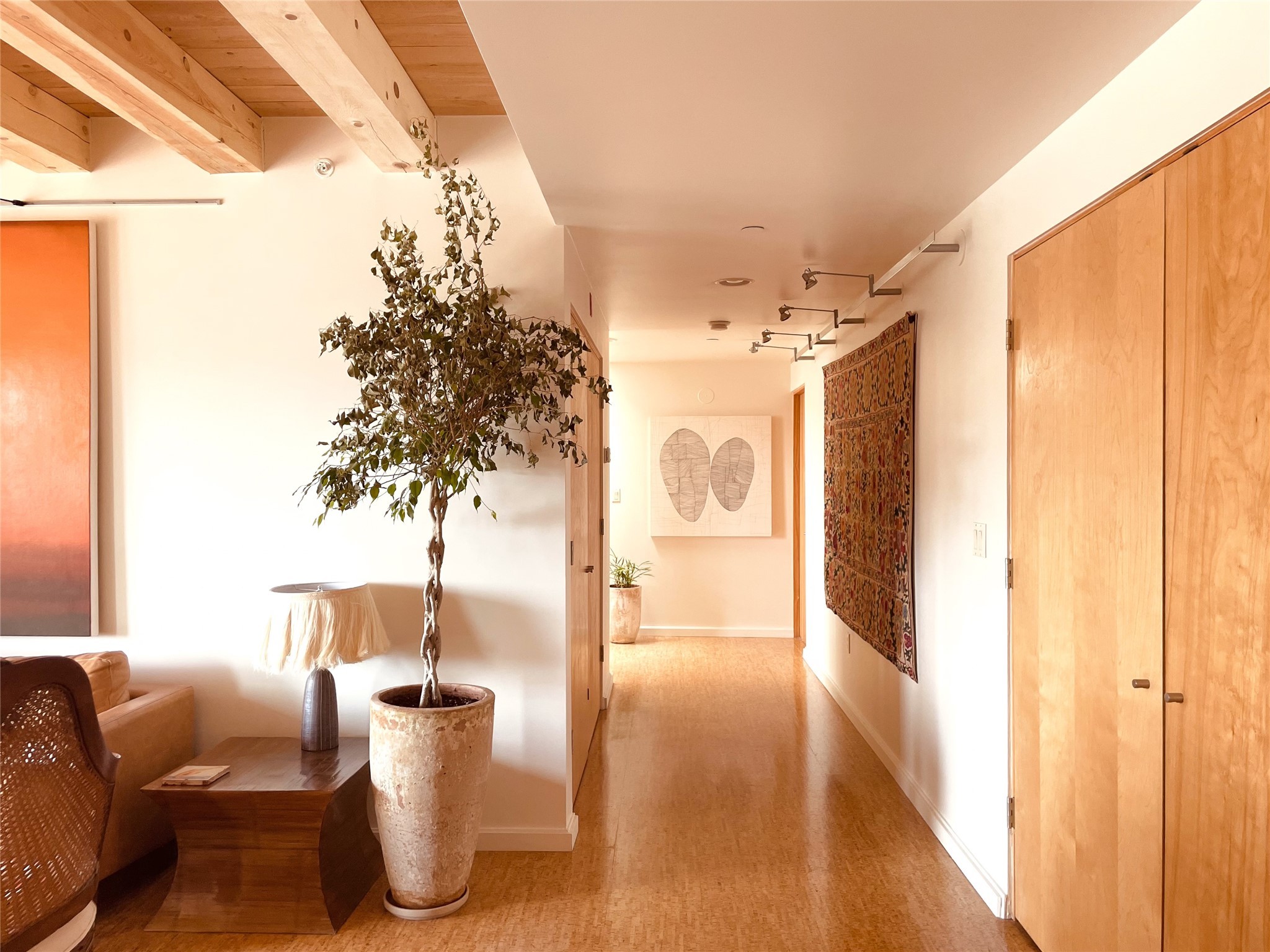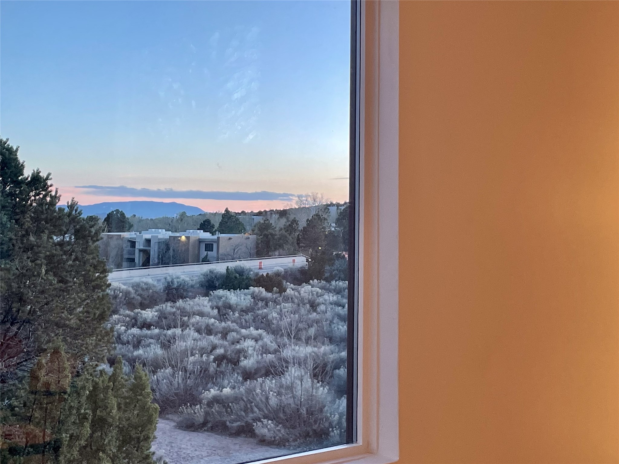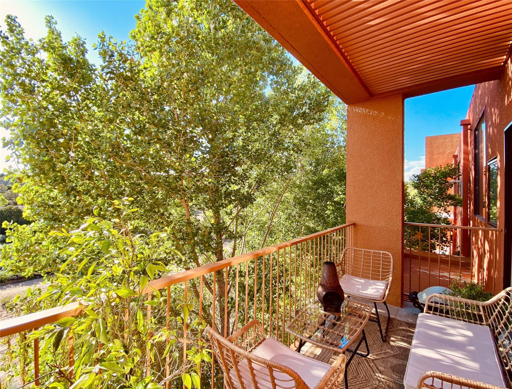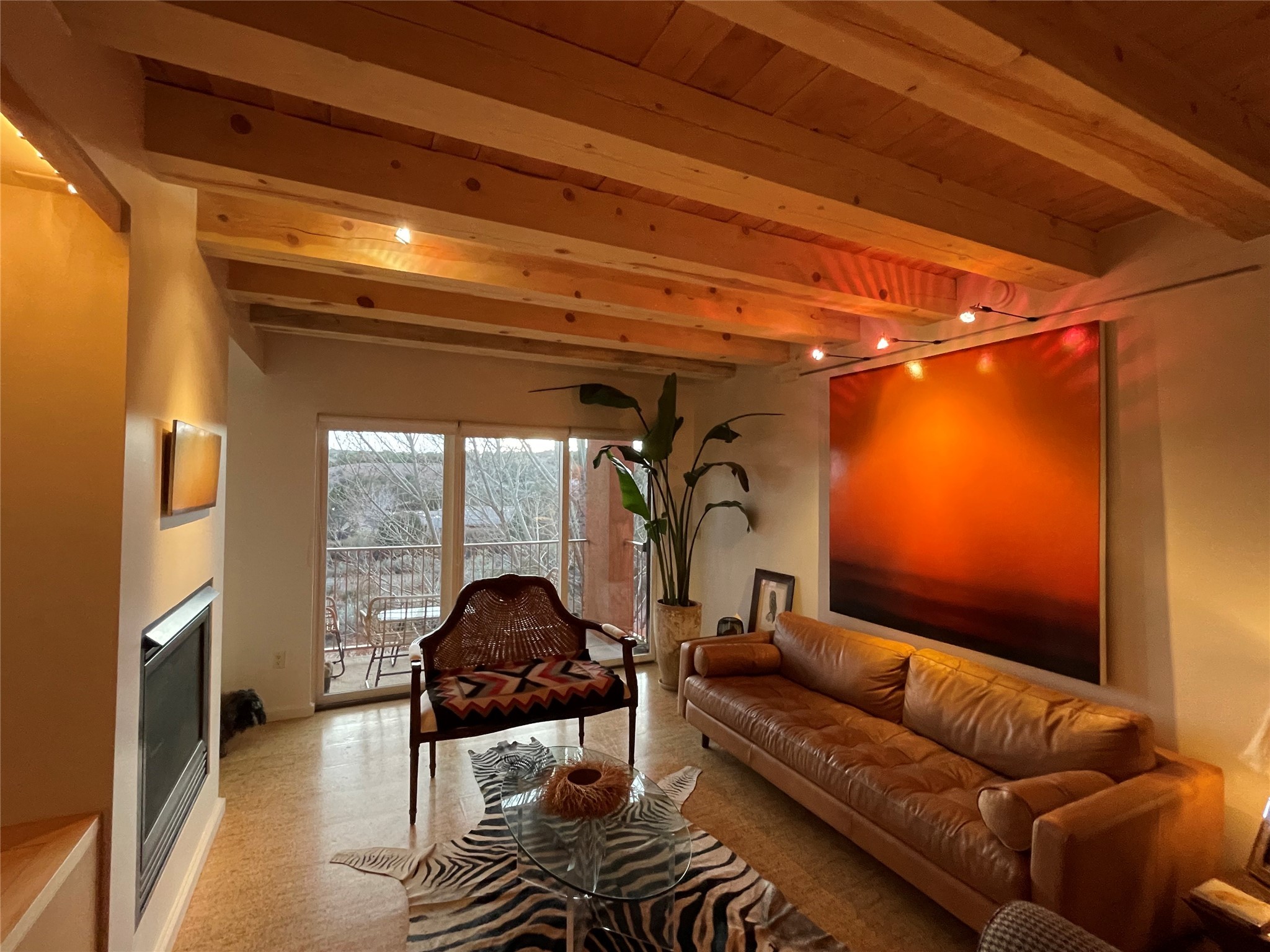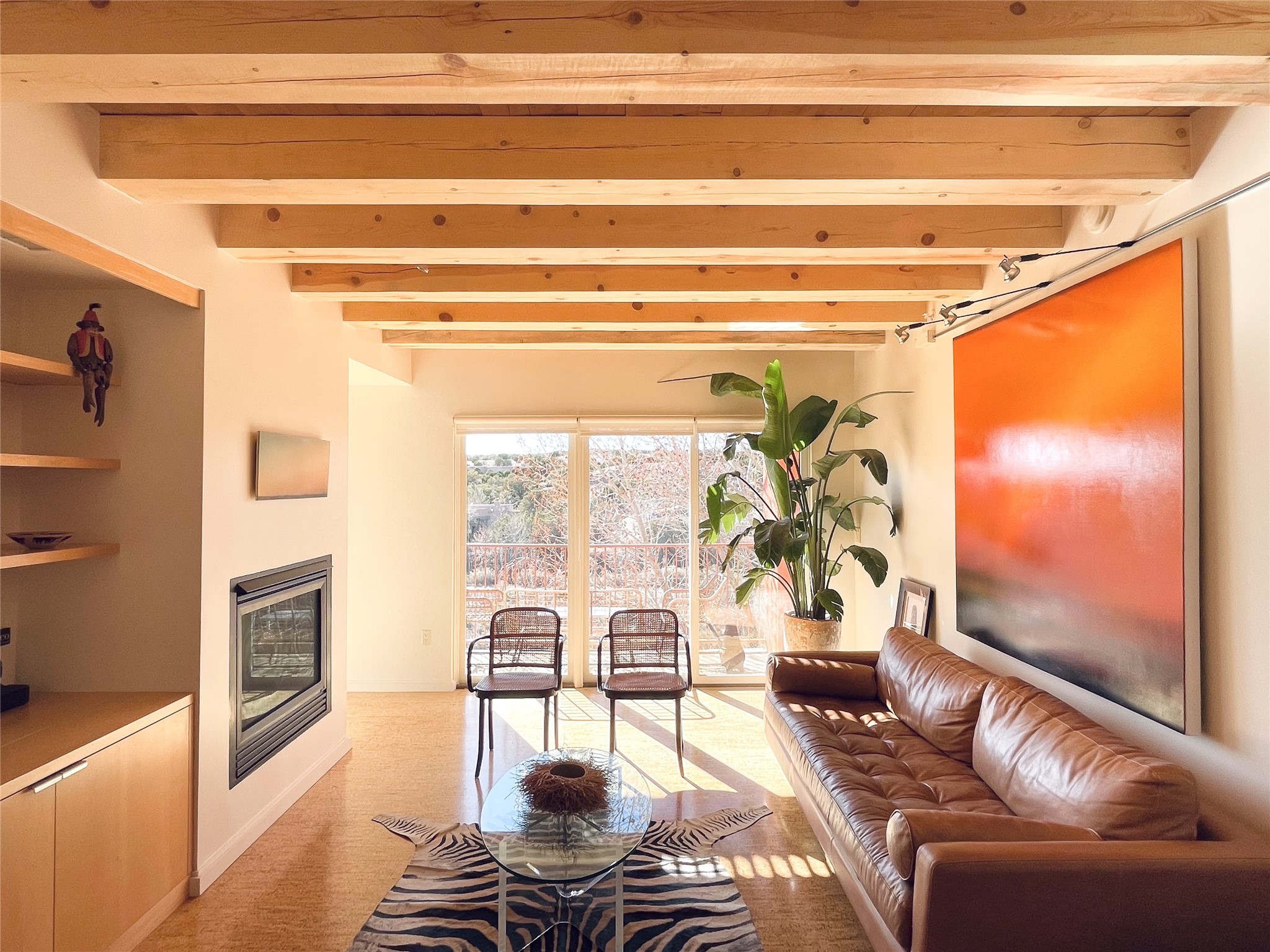 Beautiful light filled apartment on the top floor with unobstructed corner views of a large arroyo with mountains beyond. This apartment has enjoyed 2 extensive remodels resulting in the following upgrades: cork floors and cherry hardwood floors throughout; custom illuminated shoji screen cabinetry in the guest bedroom and study; custom bookshelves in the study and living room; custom pop-up TV cabinet in the living room adjacent to fireplace; smooth drywall finish (level 5) with eggshell walls and velvet ceiling finish offering elegant reflections of light; beamed heavy timber ceilings in living room and master bedroom using 8"x8" pine beams with decking above; adjustable track lighting above artwork in living room and hallway; new windows in dining room and guest bedrooms; new roller blind window coverings (not all installed for photos); newly refurbished front door, and newly stained outdoor deck. Situated in the zocalo apartment complex designed by architect Ricardo Legoretta, this home offers proximity to downtown Santa Fe along with excellent communal facilities (including 2 gyms, a clubhouse, and a seasonal outdoor lap pool). Enjoy this turn-key modern apartment with beautiful natural light, expansive views of the New Mexico skies and mountains, and rustic beamed ceilings offering a cosy atmosphere for cold winter nights.