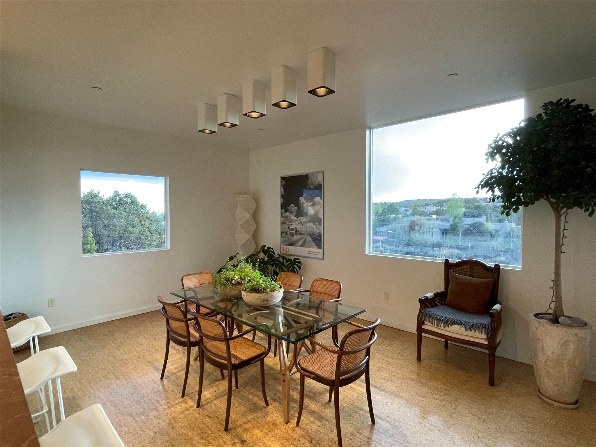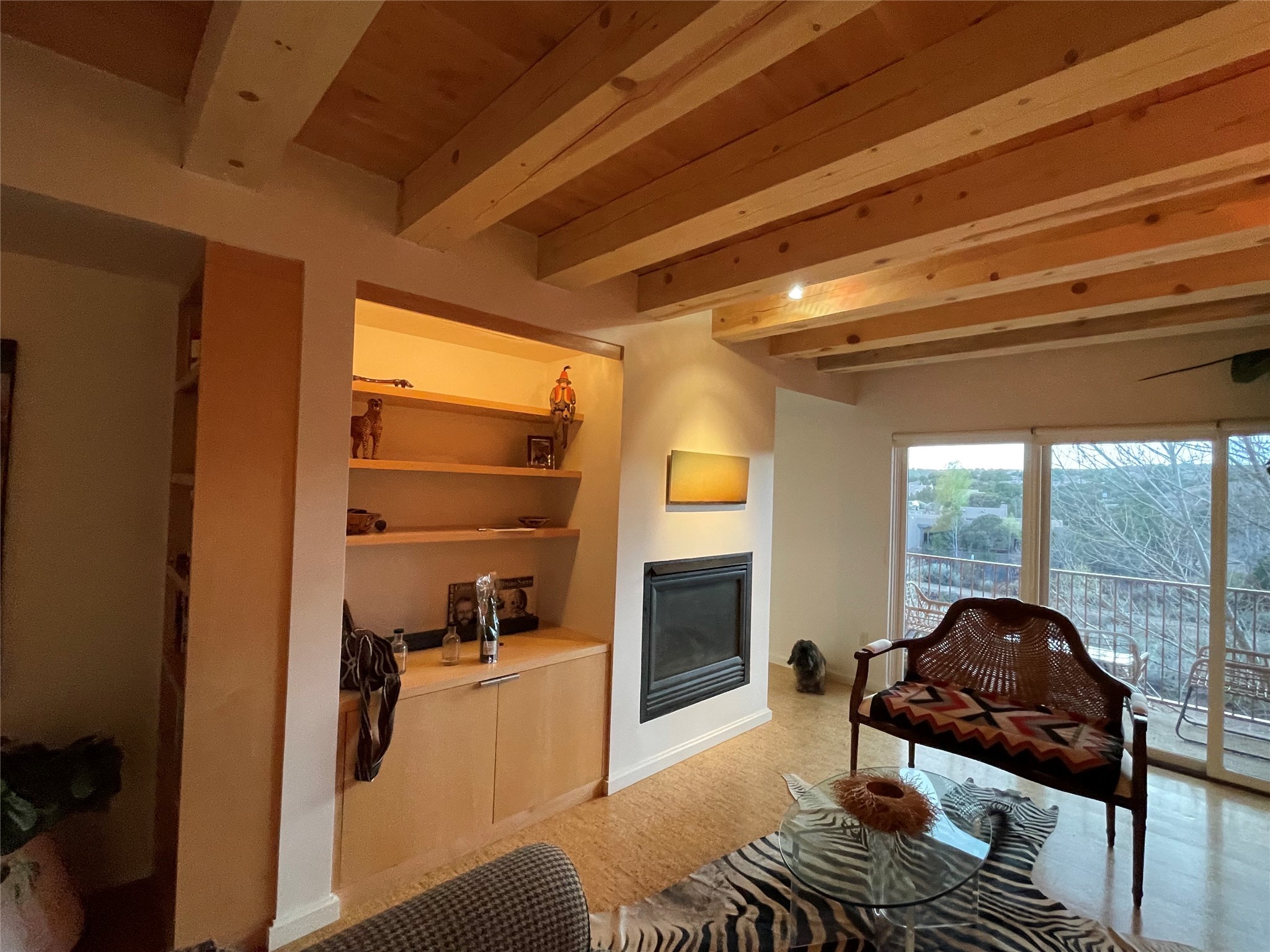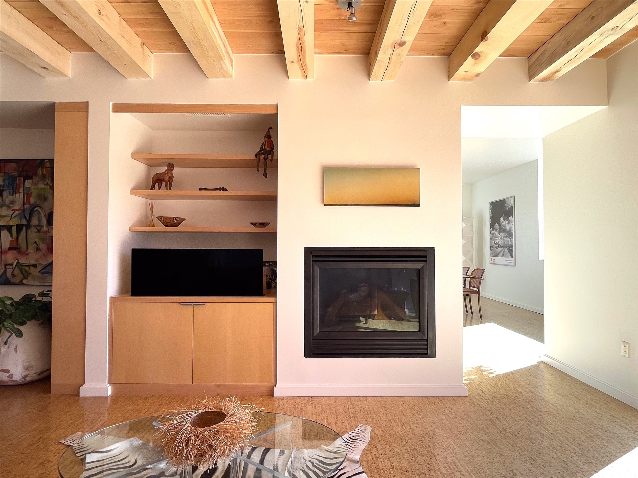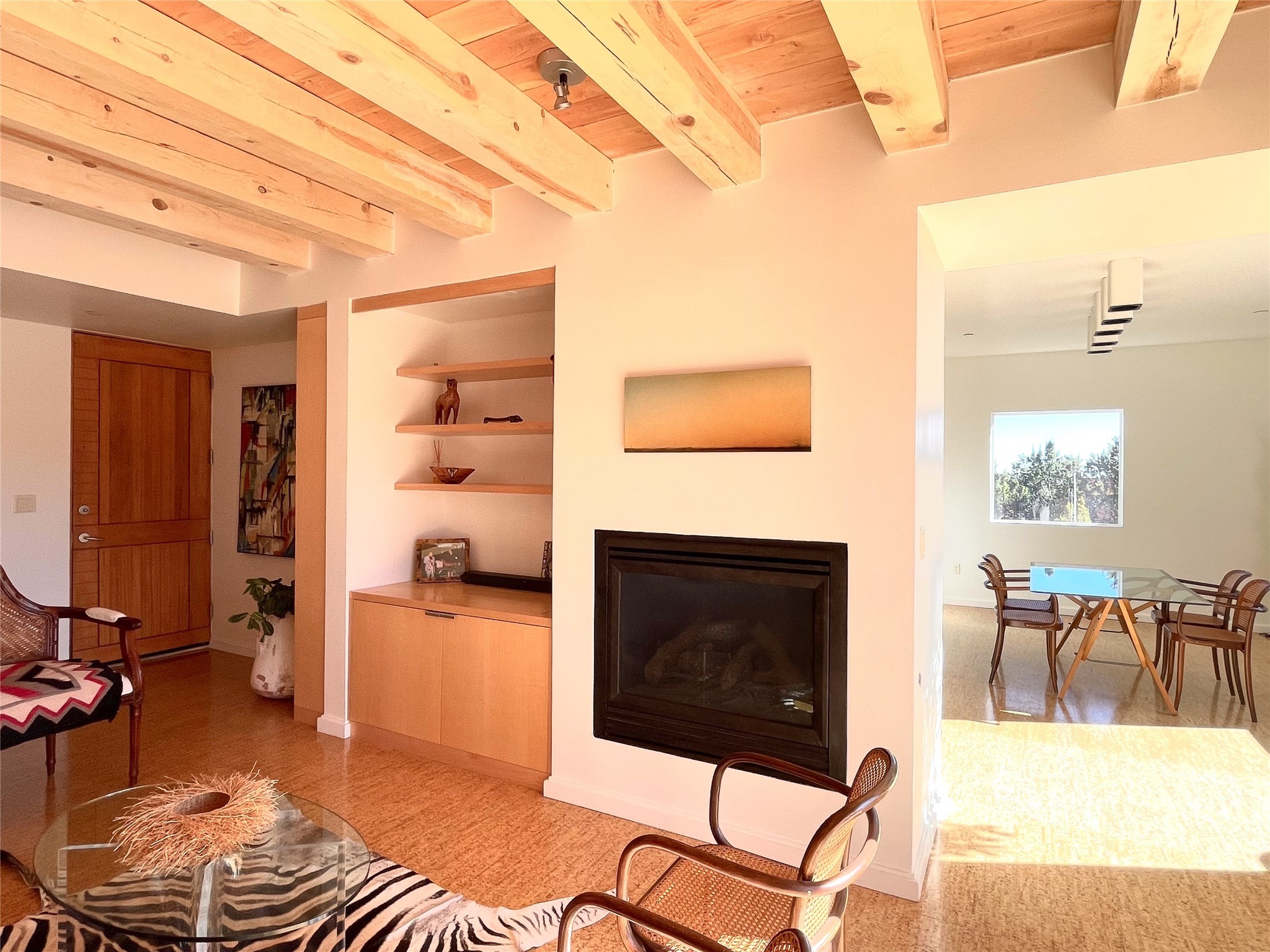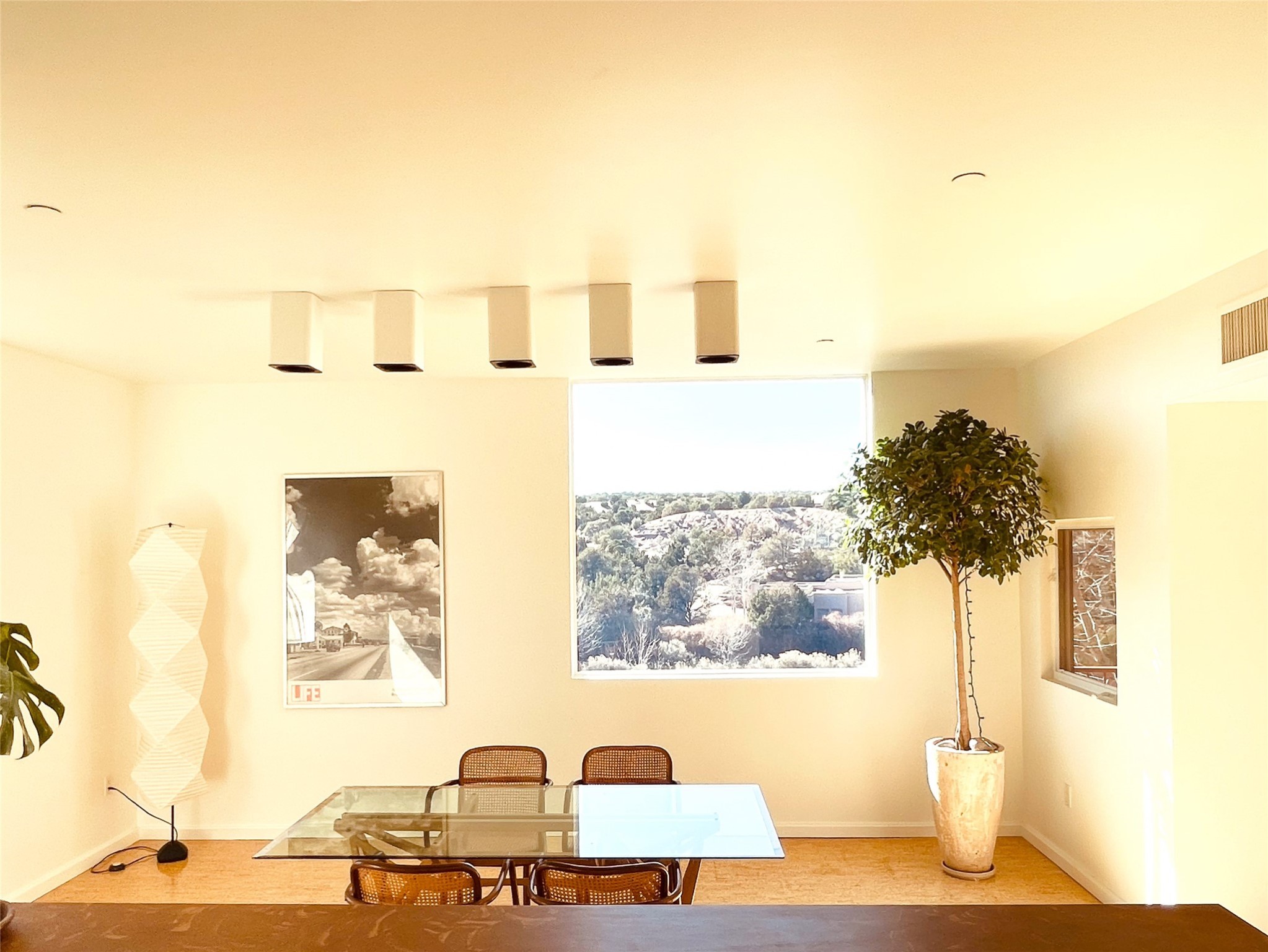 Beautiful light filled apartment on the top floor with unobstructed corner views of a large arroyo with mountains beyond. This apartment has enjoyed 2 extensive remodels resulting in the following upgrades: cork floors and cherry hardwood floors throughout; custom illuminated shoji screen cabinetry in the guest bedroom and study; custom bookshelves in the study and living room; custom pop-up TV cabinet in the living room adjacent to fireplace; smooth drywall finish (level 5) with eggshell walls and velvet ceiling finish offering elegant reflections of light; beamed heavy timber ceilings in living room and master bedroom using 8"x8" pine beams with decking above; adjustable track lighting above artwork in living room and hallway; new windows in dining room and guest bedrooms; new roller blind window coverings (not all installed for photos); newly refurbished front door, and newly stained outdoor deck. Situated in the zocalo apartment complex designed by architect Ricardo Legoretta, this home offers proximity to downtown Santa Fe along with excellent communal facilities (including 2 gyms, a clubhouse, and a seasonal outdoor lap pool). Enjoy this turn-key modern apartment with beautiful natural light, expansive views of the New Mexico skies and mountains, and rustic beamed ceilings offering a cosy atmosphere for cold winter nights.