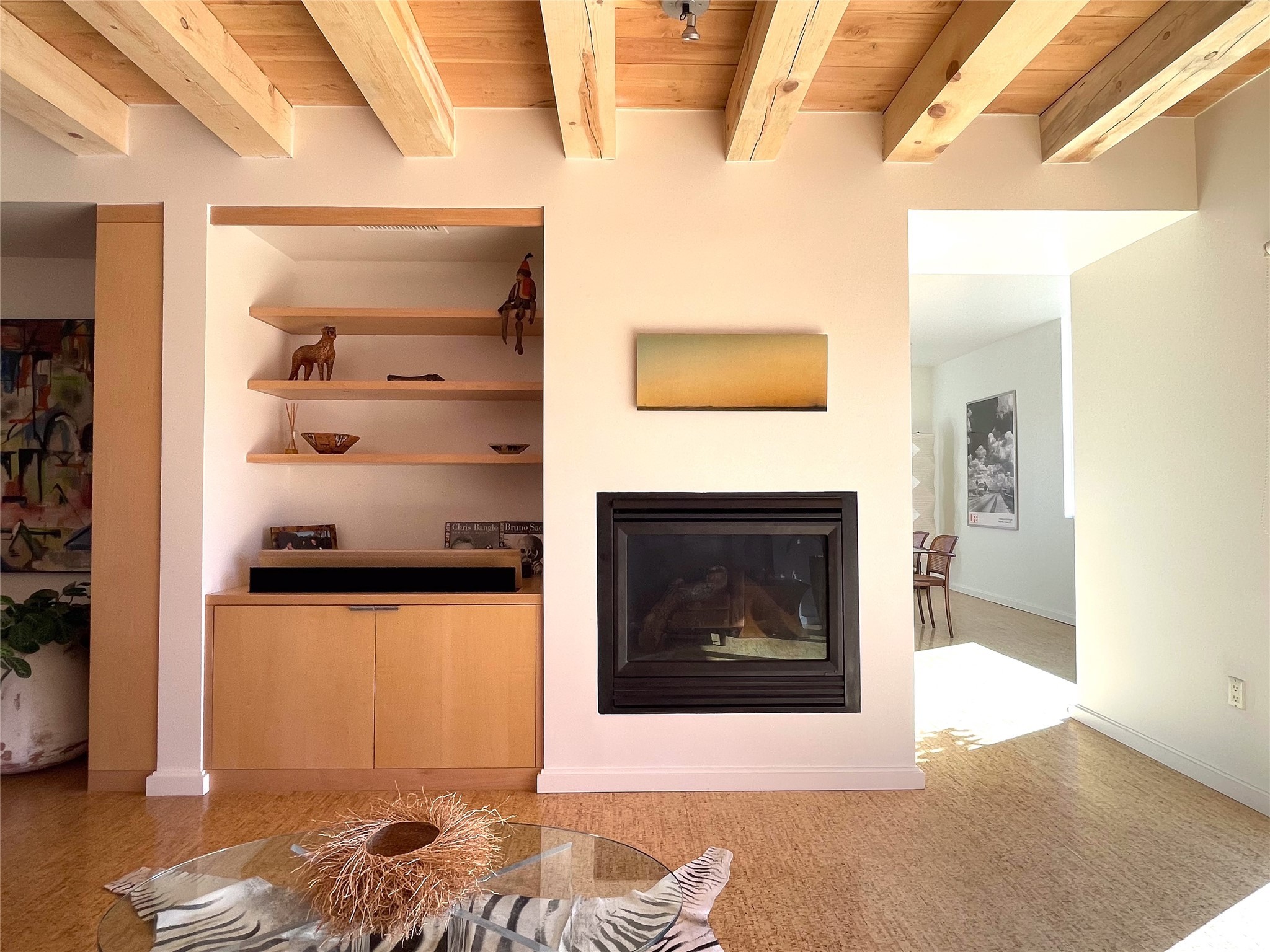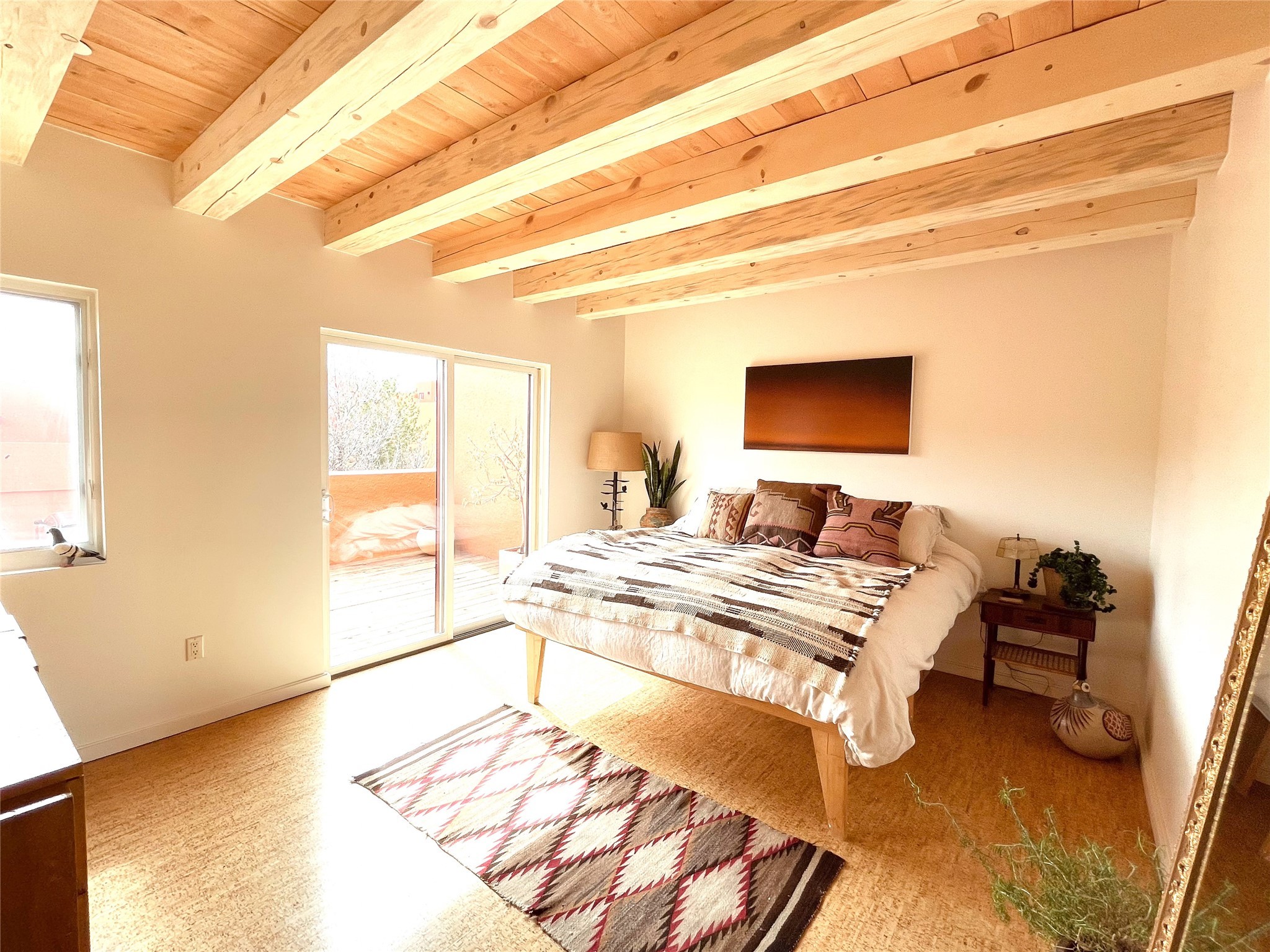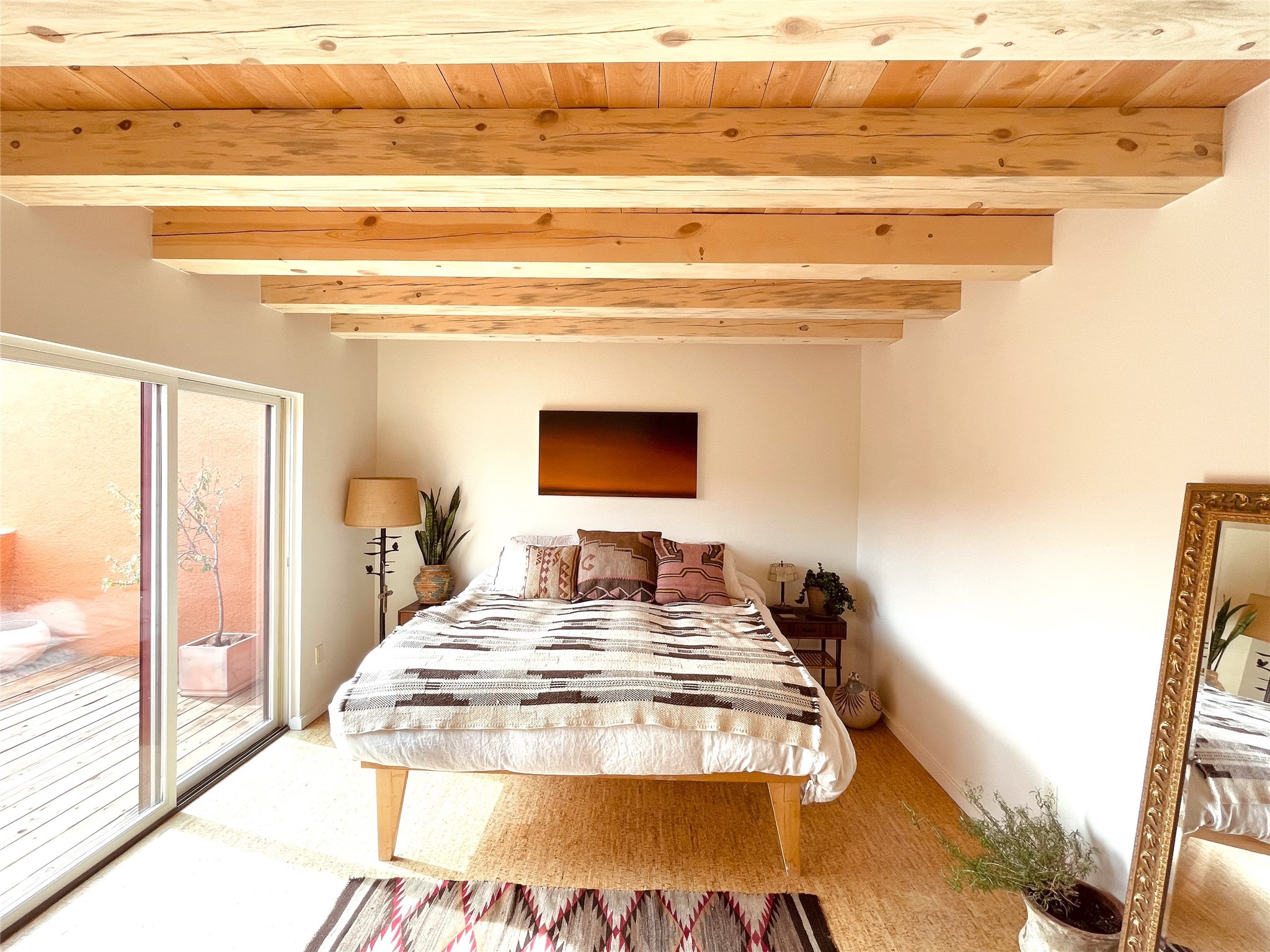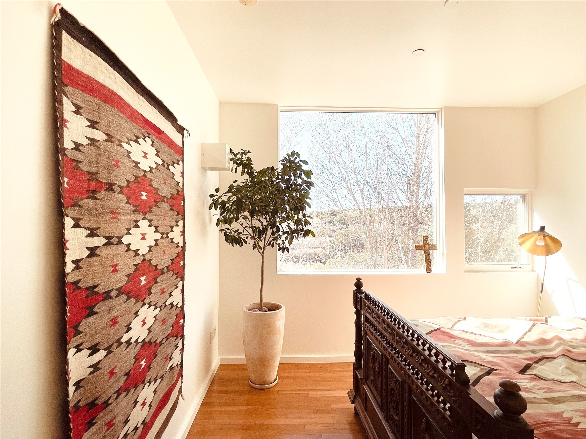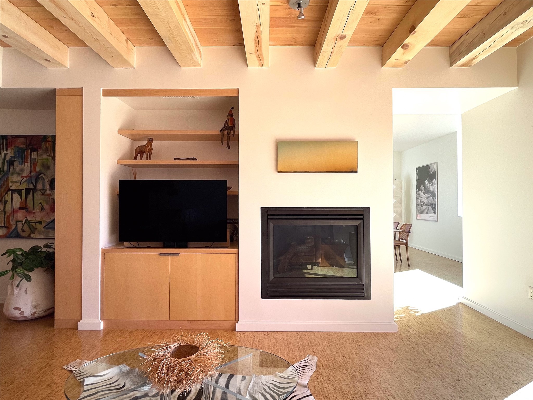 Beautiful light filled apartment on the top floor with unobstructed corner views of a large arroyo with mountains beyond. This apartment has enjoyed 2 extensive remodels resulting in the following upgrades: cork floors and cherry hardwood floors throughout; custom illuminated shoji screen cabinetry in the guest bedroom and study; custom bookshelves in the study and living room; custom pop-up TV cabinet in the living room adjacent to fireplace; smooth drywall finish (level 5) with eggshell walls and velvet ceiling finish offering elegant reflections of light; beamed heavy timber ceilings in living room and master bedroom using 8"x8" pine beams with decking above; adjustable track lighting above artwork in living room and hallway; new windows in dining room and guest bedrooms; new roller blind window coverings (not all installed for photos); newly refurbished front door, and newly stained outdoor deck. Situated in the zocalo apartment complex designed by architect Ricardo Legoretta, this home offers proximity to downtown Santa Fe along with excellent communal facilities (including 2 gyms, a clubhouse, and a seasonal outdoor lap pool). Enjoy this turn-key modern apartment with beautiful natural light, expansive views of the New Mexico skies and mountains, and rustic beamed ceilings offering a cosy atmosphere for cold winter nights.