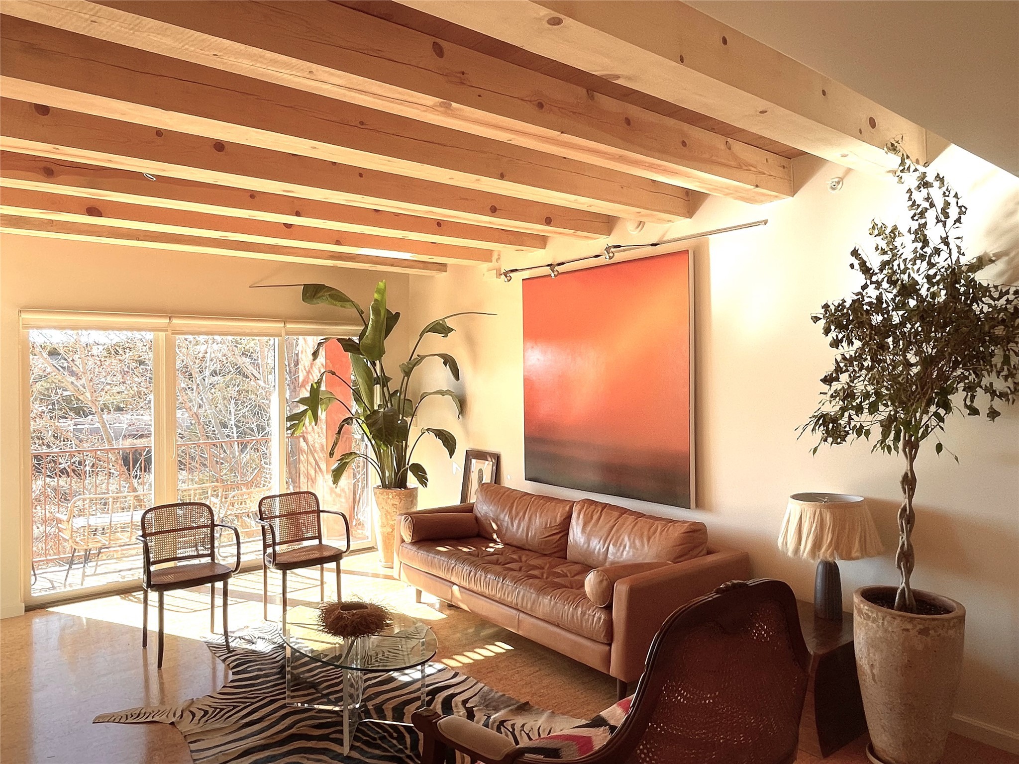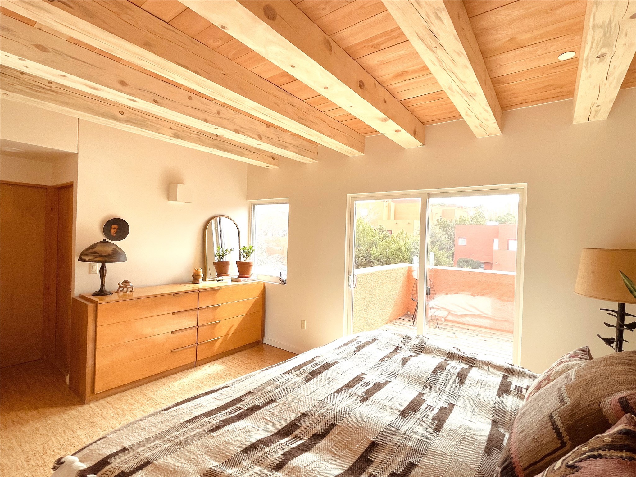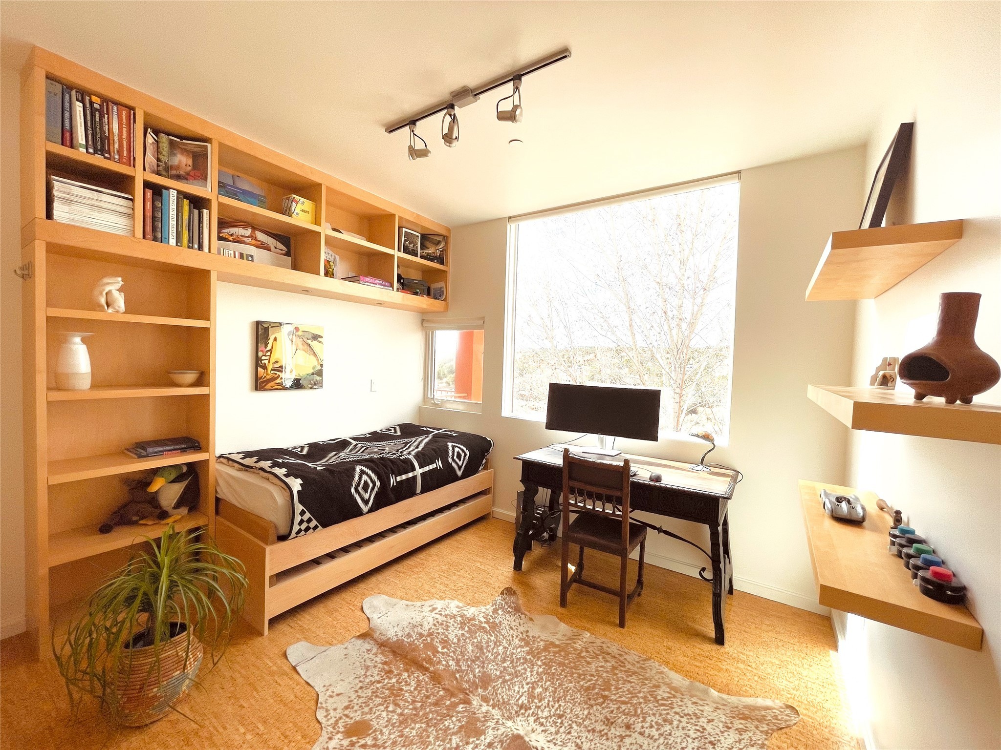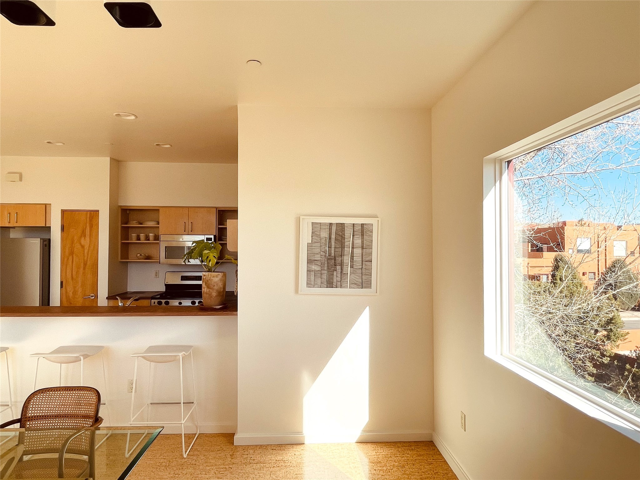 Beautiful light filled apartment on the top floor with unobstructed corner views of a large arroyo with mountains beyond. This apartment has enjoyed 2 extensive remodels resulting in the following upgrades: cork floors and cherry hardwood floors throughout; custom illuminated shoji screen cabinetry in the guest bedroom and study; custom bookshelves in the study and living room; custom pop-up TV cabinet in the living room adjacent to fireplace; smooth drywall finish (level 5) with eggshell walls and velvet ceiling finish offering elegant reflections of light; beamed heavy timber ceilings in living room and master bedroom using 8"x8" pine beams with decking above; adjustable track lighting above artwork in living room and hallway; new windows in dining room and guest bedrooms; new roller blind window coverings (not all installed for photos); newly refurbished front door, and newly stained outdoor deck. Situated in the zocalo apartment complex designed by architect Ricardo Legoretta, this home offers proximity to downtown Santa Fe along with excellent communal facilities (including 2 gyms, a clubhouse, and a seasonal outdoor lap pool). Enjoy this turn-key modern apartment with beautiful natural light, expansive views of the New Mexico skies and mountains, and rustic beamed ceilings offering a cosy atmosphere for cold winter nights.