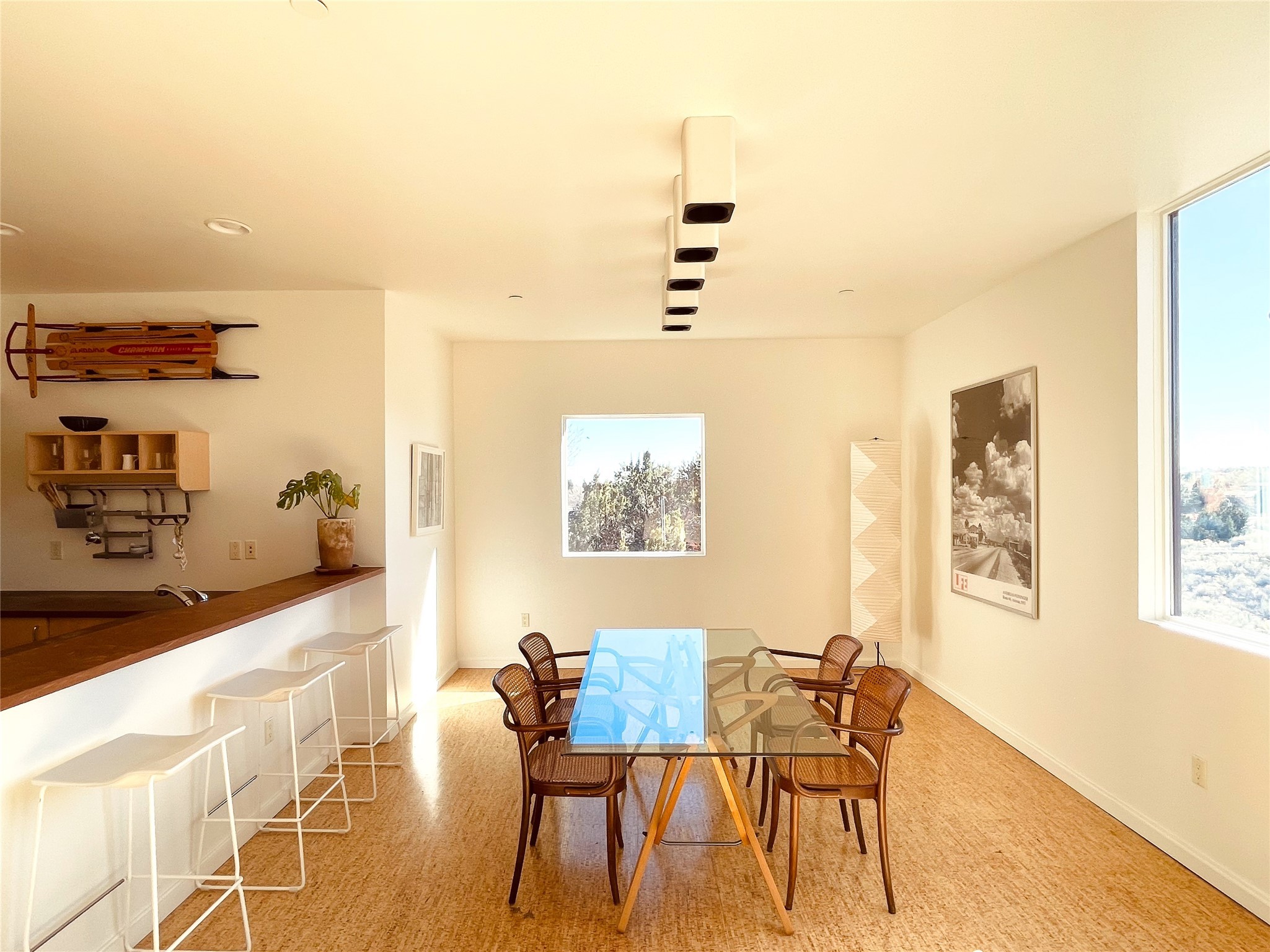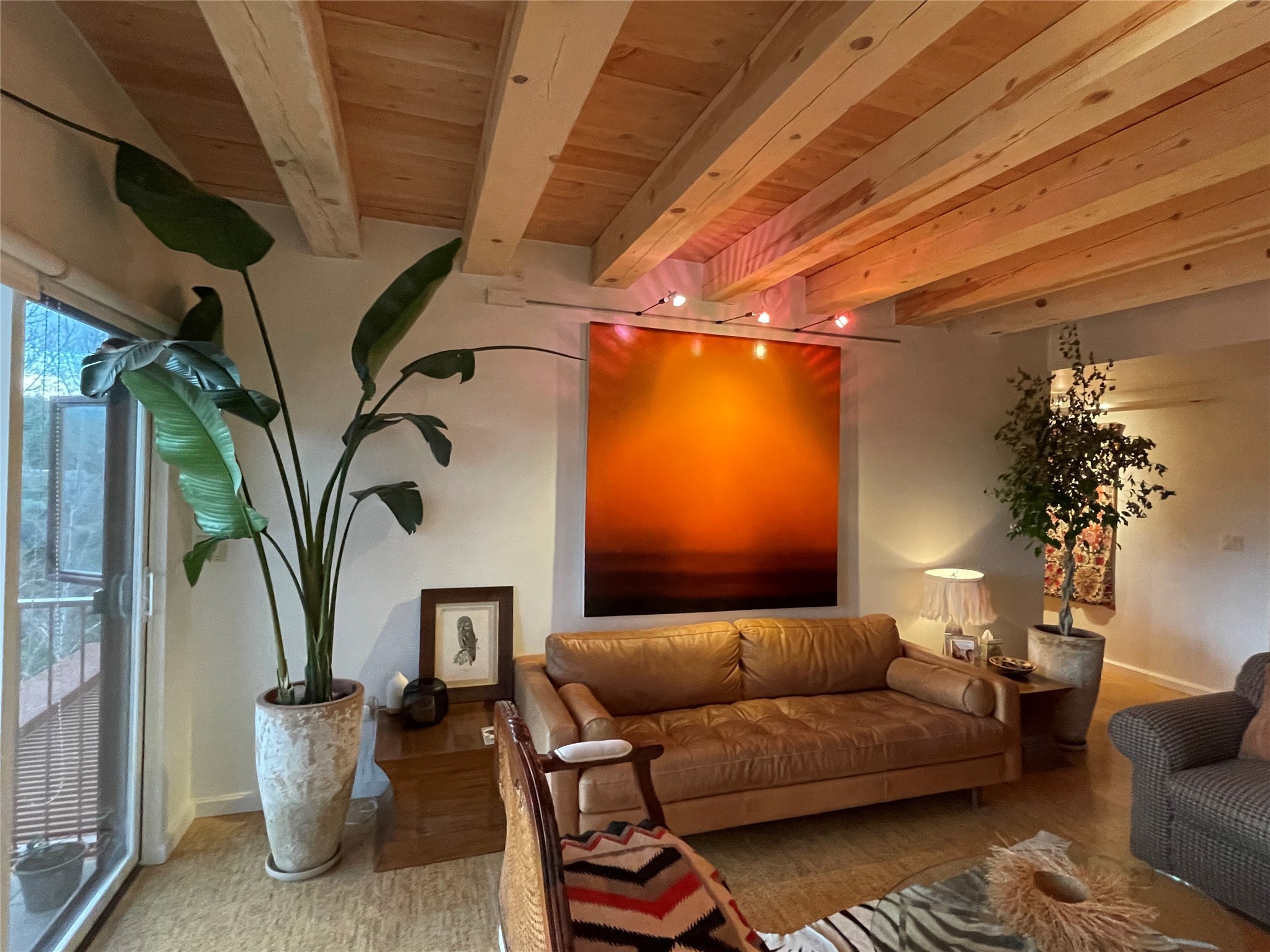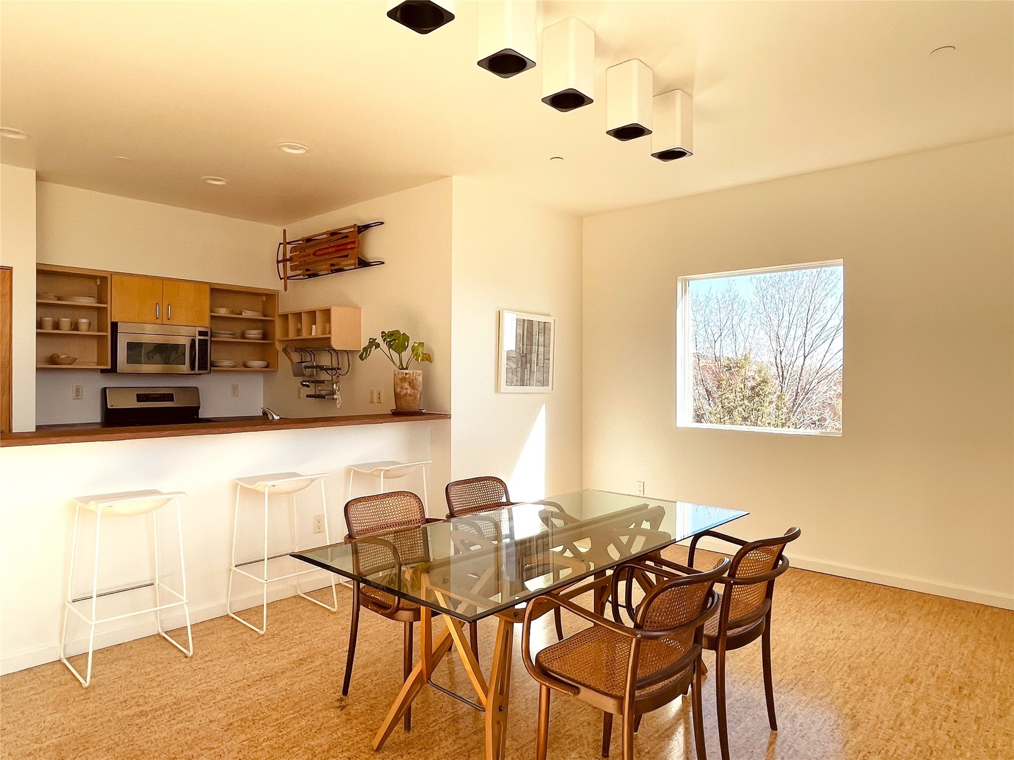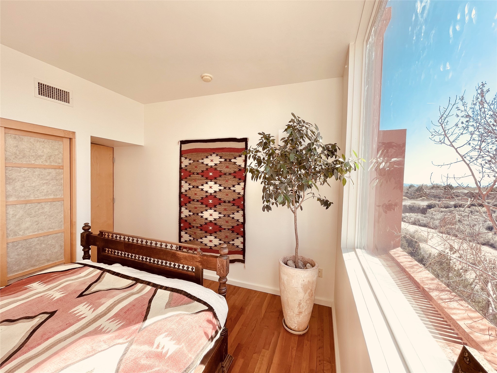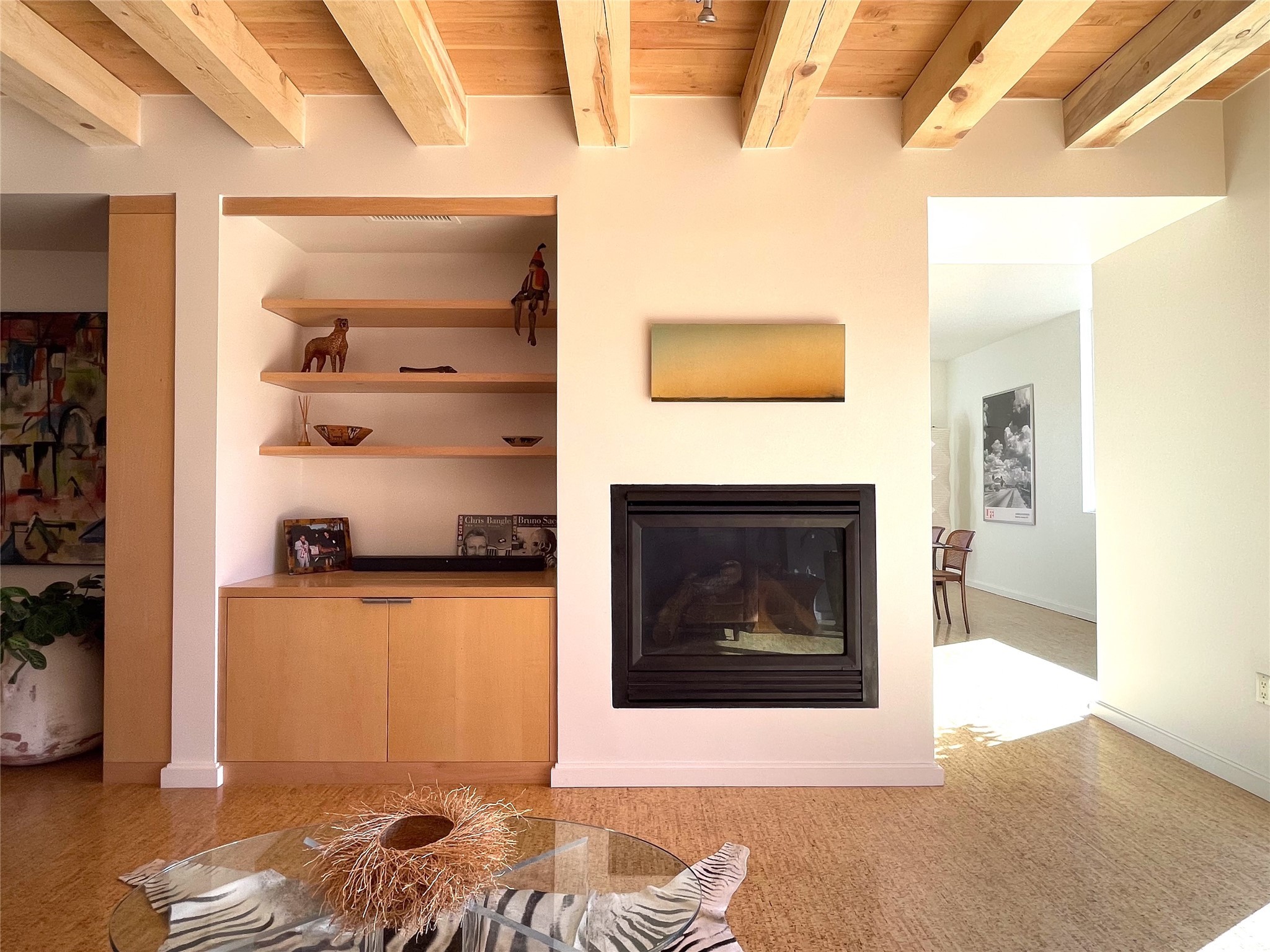 Beautiful light filled apartment on the top floor with unobstructed corner views of a large arroyo with mountains beyond. This apartment has enjoyed 2 extensive remodels resulting in the following upgrades: cork floors and cherry hardwood floors throughout; custom illuminated shoji screen cabinetry in the guest bedroom and study; custom bookshelves in the study and living room; custom pop-up TV cabinet in the living room adjacent to fireplace; smooth drywall finish (level 5) with eggshell walls and velvet ceiling finish offering elegant reflections of light; beamed heavy timber ceilings in living room and master bedroom using 8"x8" pine beams with decking above; adjustable track lighting above artwork in living room and hallway; new windows in dining room and guest bedrooms; new roller blind window coverings (not all installed for photos); newly refurbished front door, and newly stained outdoor deck. Situated in the zocalo apartment complex designed by architect Ricardo Legoretta, this home offers proximity to downtown Santa Fe along with excellent communal facilities (including 2 gyms, a clubhouse, and a seasonal outdoor lap pool). Enjoy this turn-key modern apartment with beautiful natural light, expansive views of the New Mexico skies and mountains, and rustic beamed ceilings offering a cosy atmosphere for cold winter nights.