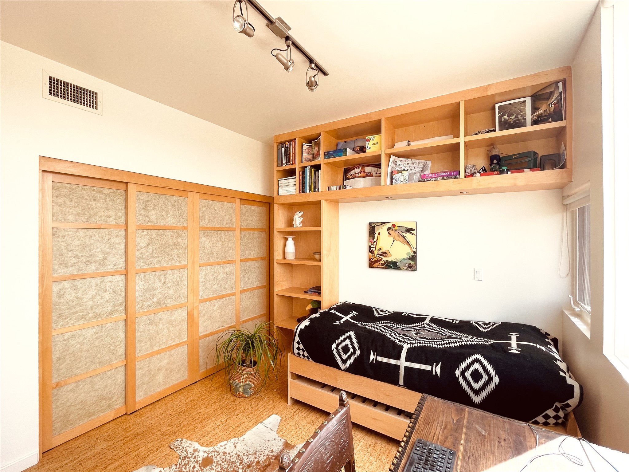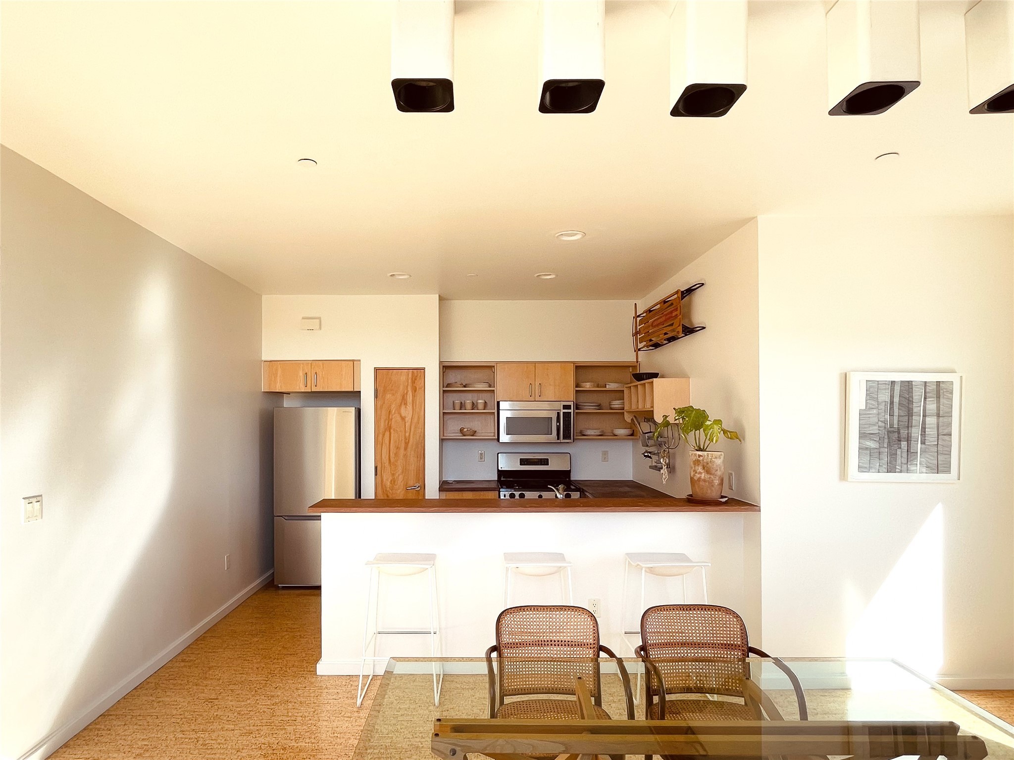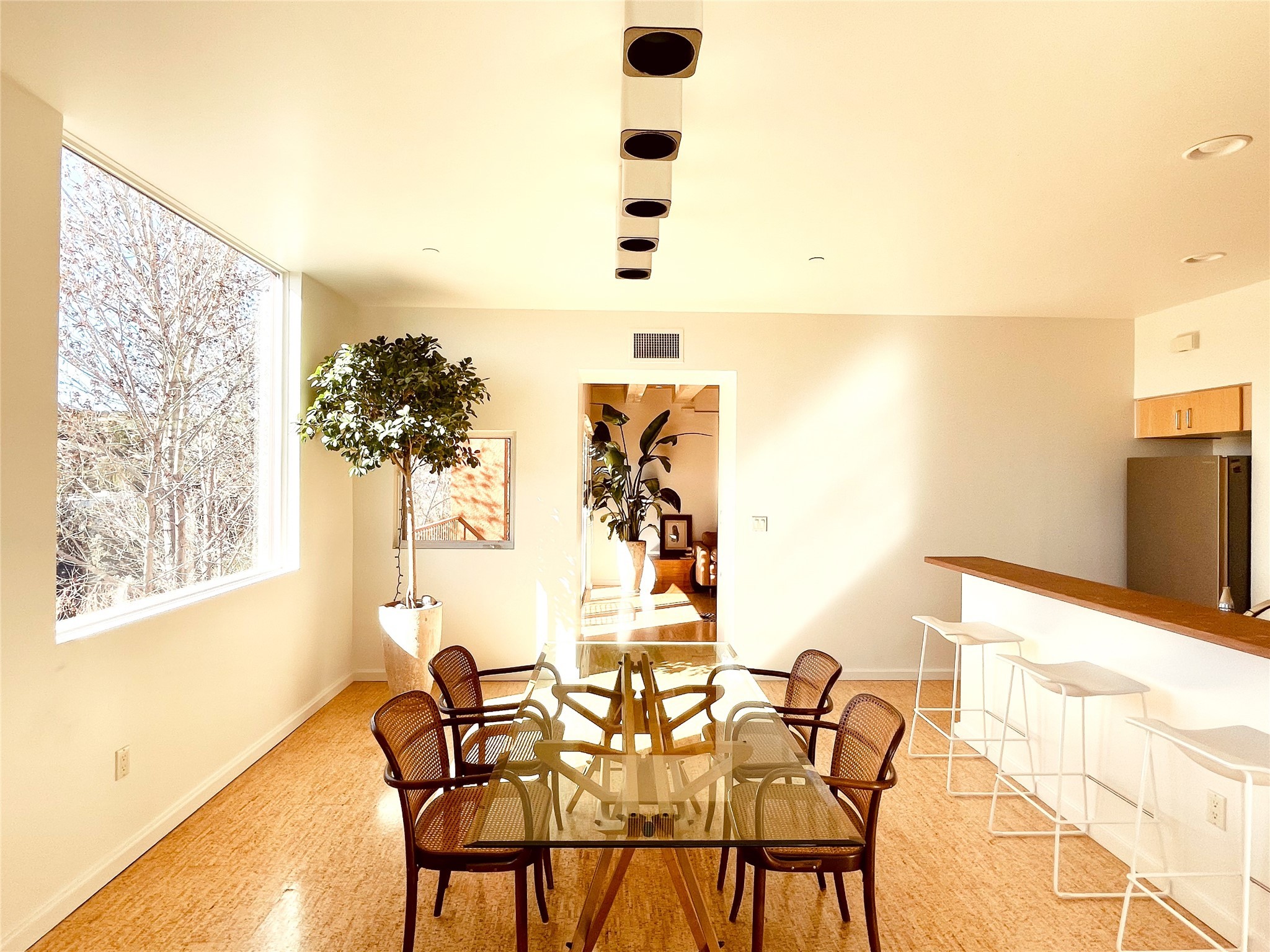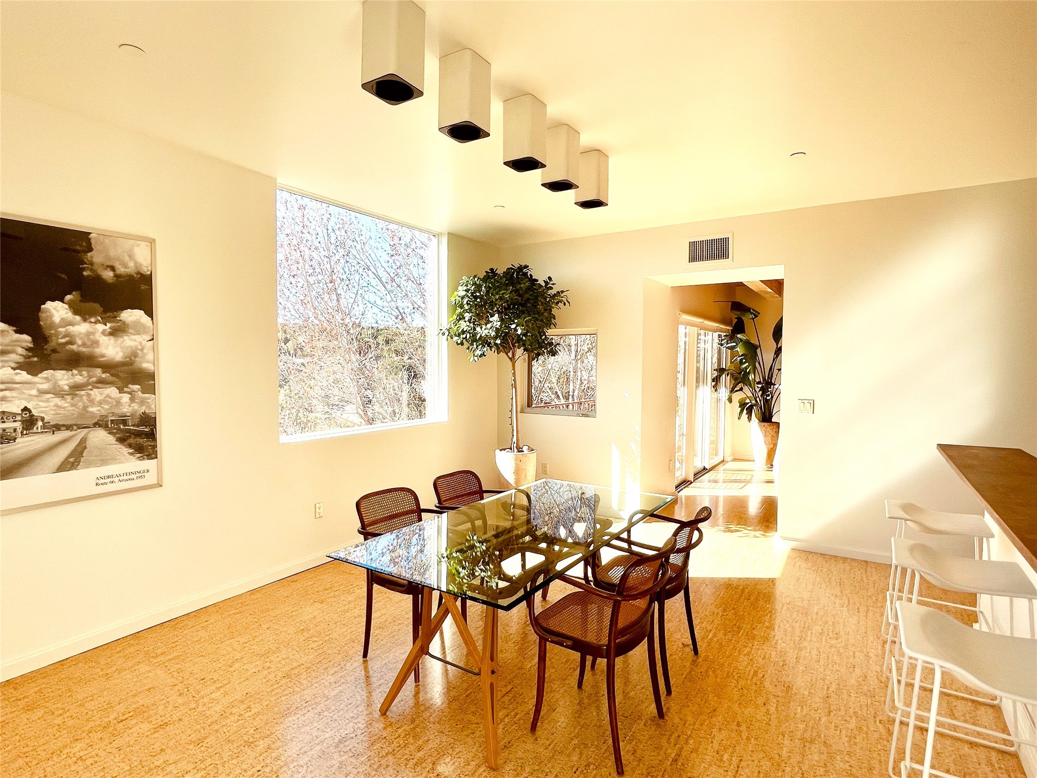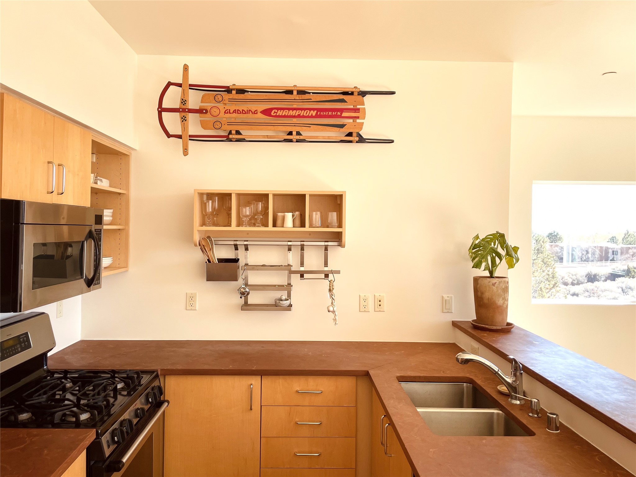 Beautiful light filled apartment on the top floor with unobstructed corner views of a large arroyo with mountains beyond. This apartment has enjoyed 2 extensive remodels resulting in the following upgrades: cork floors and cherry hardwood floors throughout; custom illuminated shoji screen cabinetry in the guest bedroom and study; custom bookshelves in the study and living room; custom pop-up TV cabinet in the living room adjacent to fireplace; smooth drywall finish (level 5) with eggshell walls and velvet ceiling finish offering elegant reflections of light; beamed heavy timber ceilings in living room and master bedroom using 8"x8" pine beams with decking above; adjustable track lighting above artwork in living room and hallway; new windows in dining room and guest bedrooms; new roller blind window coverings (not all installed for photos); newly refurbished front door, and newly stained outdoor deck. Situated in the zocalo apartment complex designed by architect Ricardo Legoretta, this home offers proximity to downtown Santa Fe along with excellent communal facilities (including 2 gyms, a clubhouse, and a seasonal outdoor lap pool). Enjoy this turn-key modern apartment with beautiful natural light, expansive views of the New Mexico skies and mountains, and rustic beamed ceilings offering a cosy atmosphere for cold winter nights.