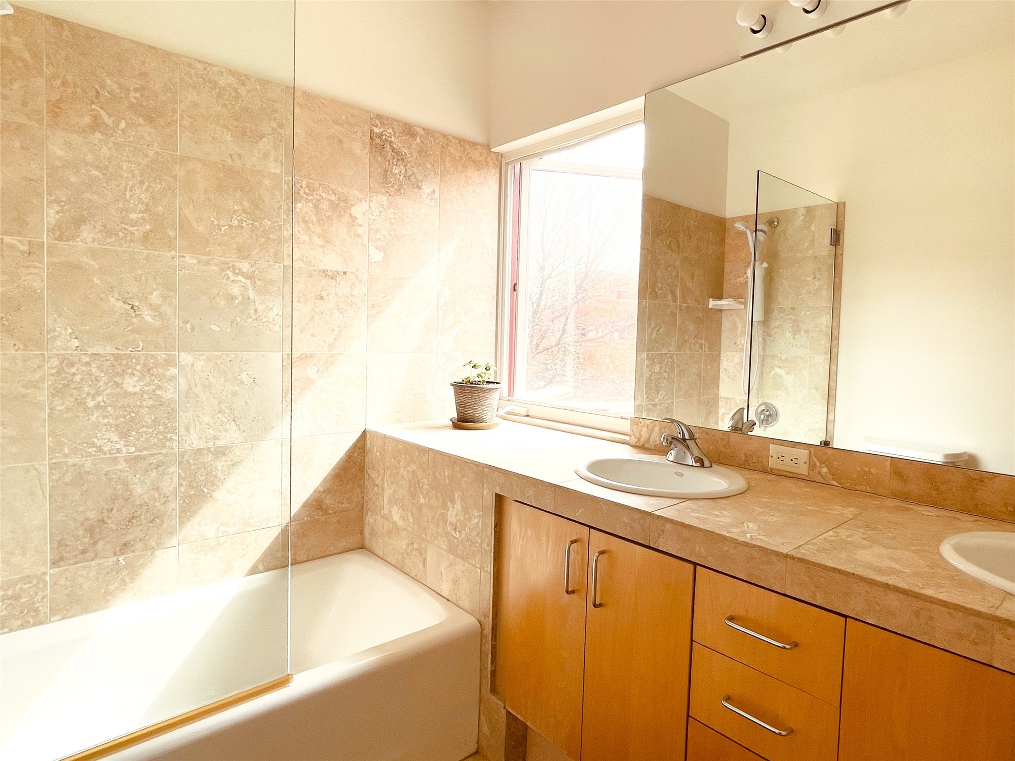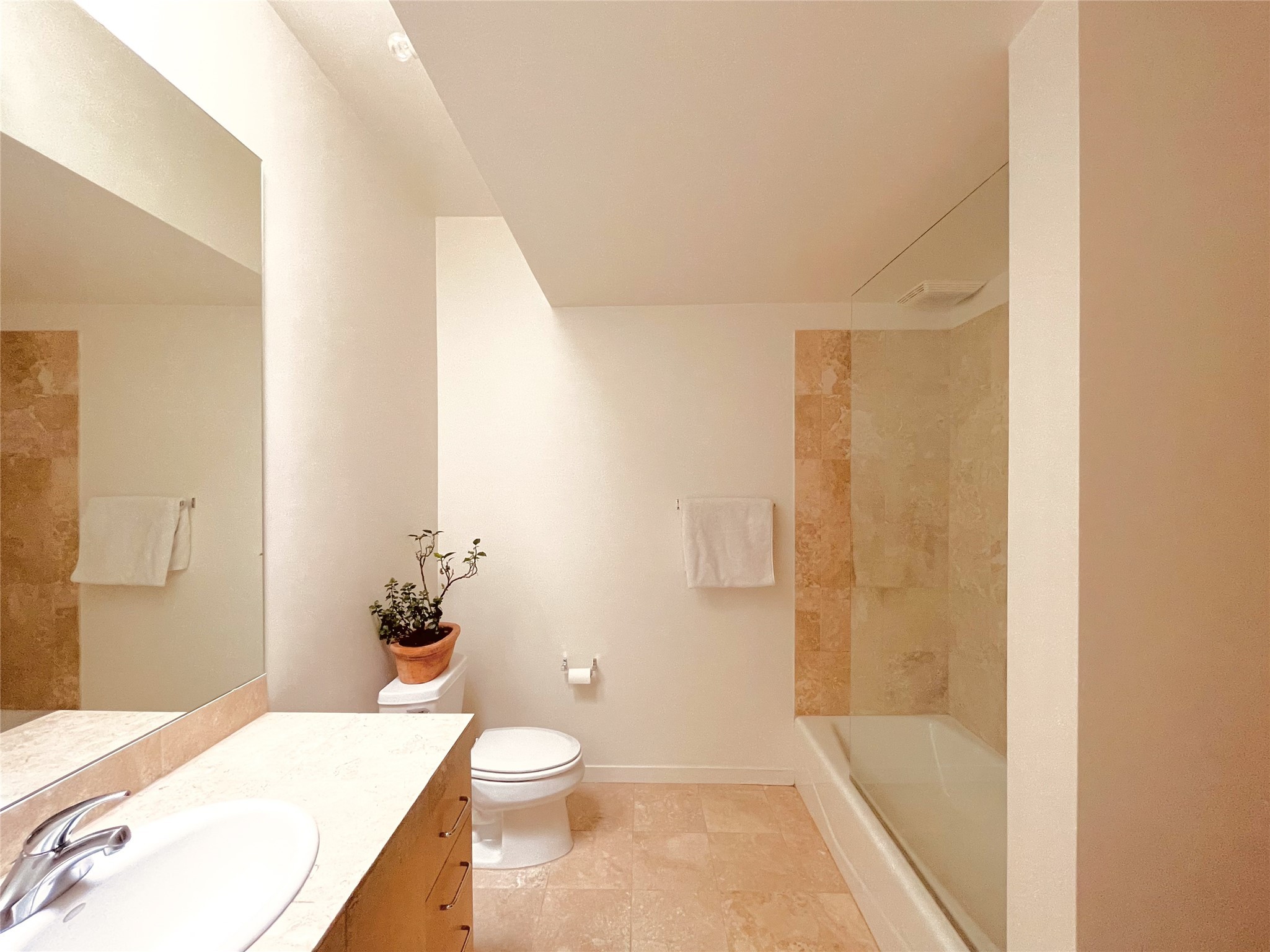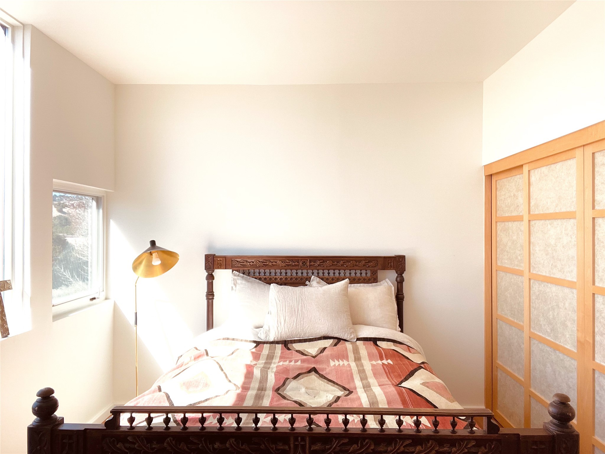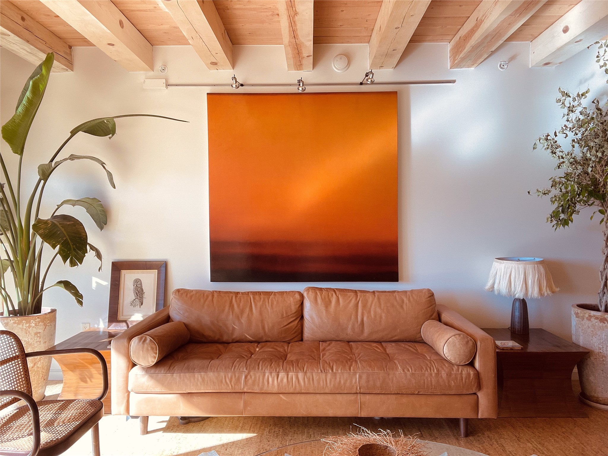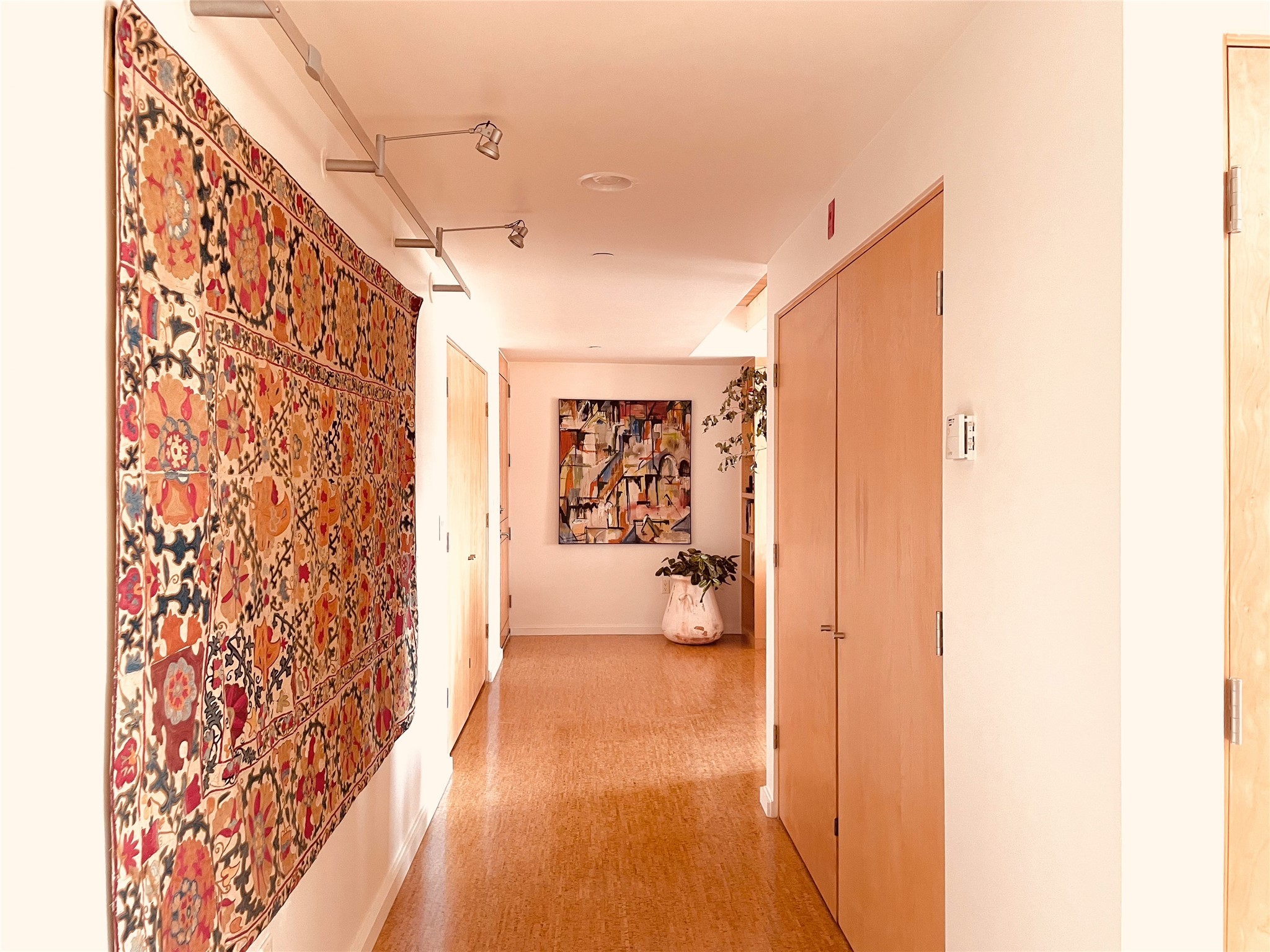 Beautiful light filled apartment on the top floor with unobstructed corner views of a large arroyo with mountains beyond. This apartment has enjoyed 2 extensive remodels resulting in the following upgrades: cork floors and cherry hardwood floors throughout; custom illuminated shoji screen cabinetry in the guest bedroom and study; custom bookshelves in the study and living room; custom pop-up TV cabinet in the living room adjacent to fireplace; smooth drywall finish (level 5) with eggshell walls and velvet ceiling finish offering elegant reflections of light; beamed heavy timber ceilings in living room and master bedroom using 8"x8" pine beams with decking above; adjustable track lighting above artwork in living room and hallway; new windows in dining room and guest bedrooms; new roller blind window coverings (not all installed for photos); newly refurbished front door, and newly stained outdoor deck. Situated in the zocalo apartment complex designed by architect Ricardo Legoretta, this home offers proximity to downtown Santa Fe along with excellent communal facilities (including 2 gyms, a clubhouse, and a seasonal outdoor lap pool). Enjoy this turn-key modern apartment with beautiful natural light, expansive views of the New Mexico skies and mountains, and rustic beamed ceilings offering a cosy atmosphere for cold winter nights.
