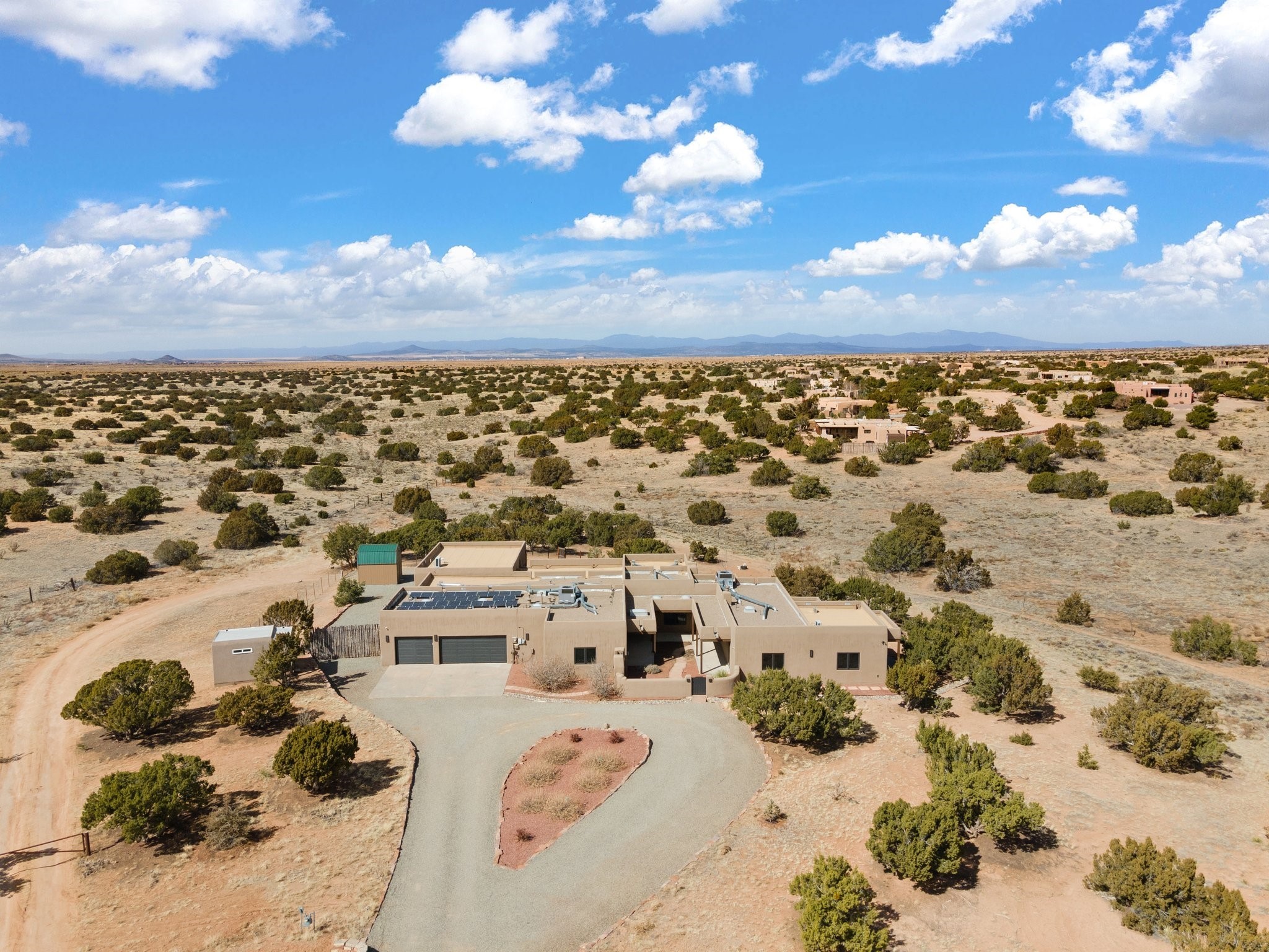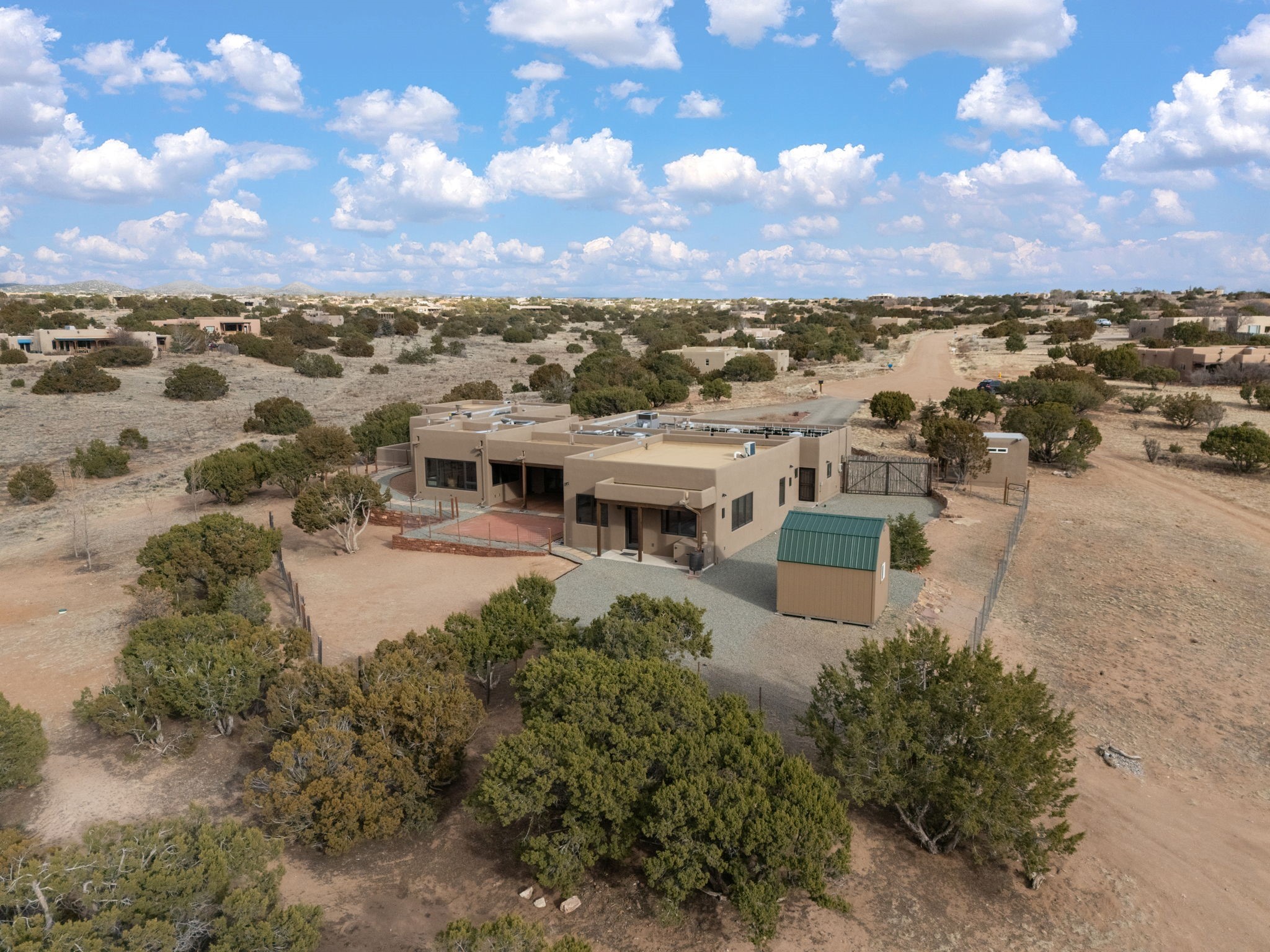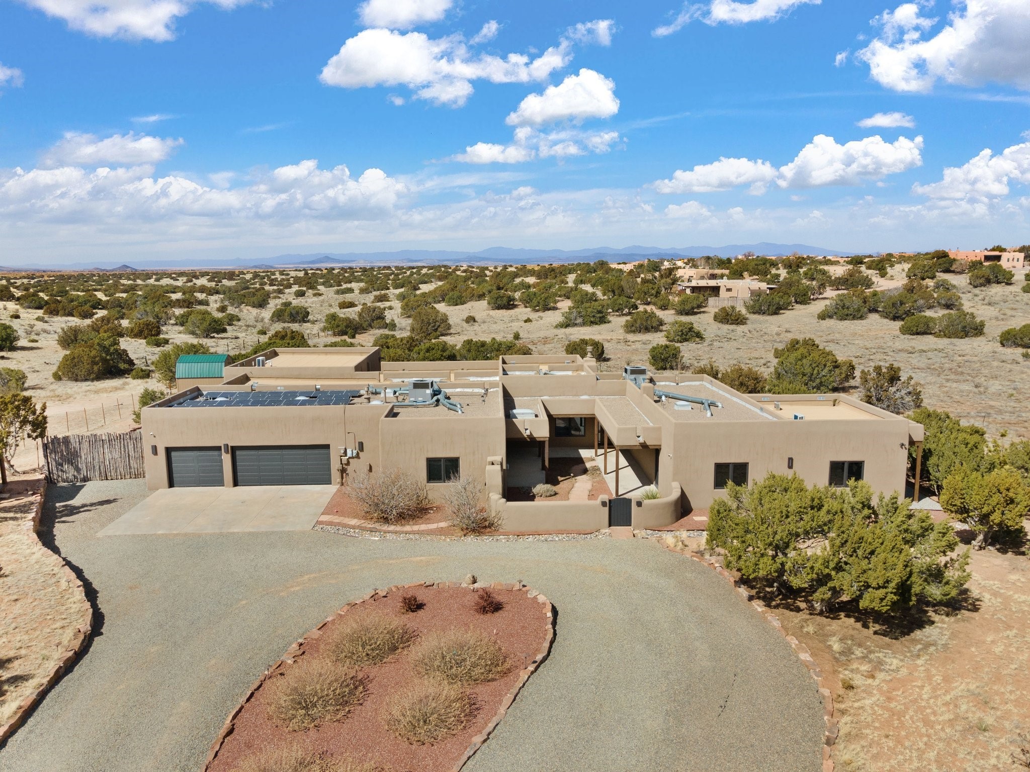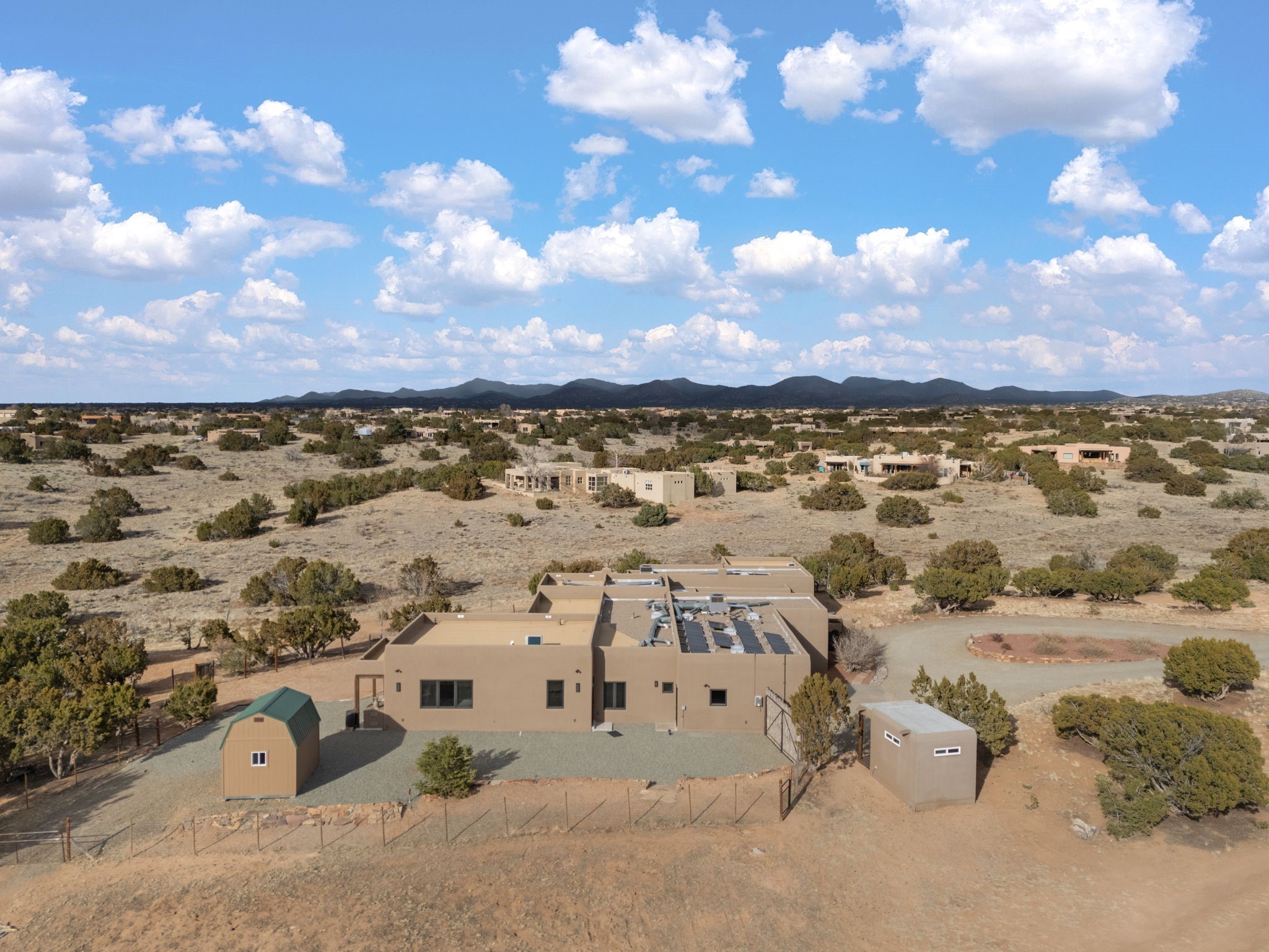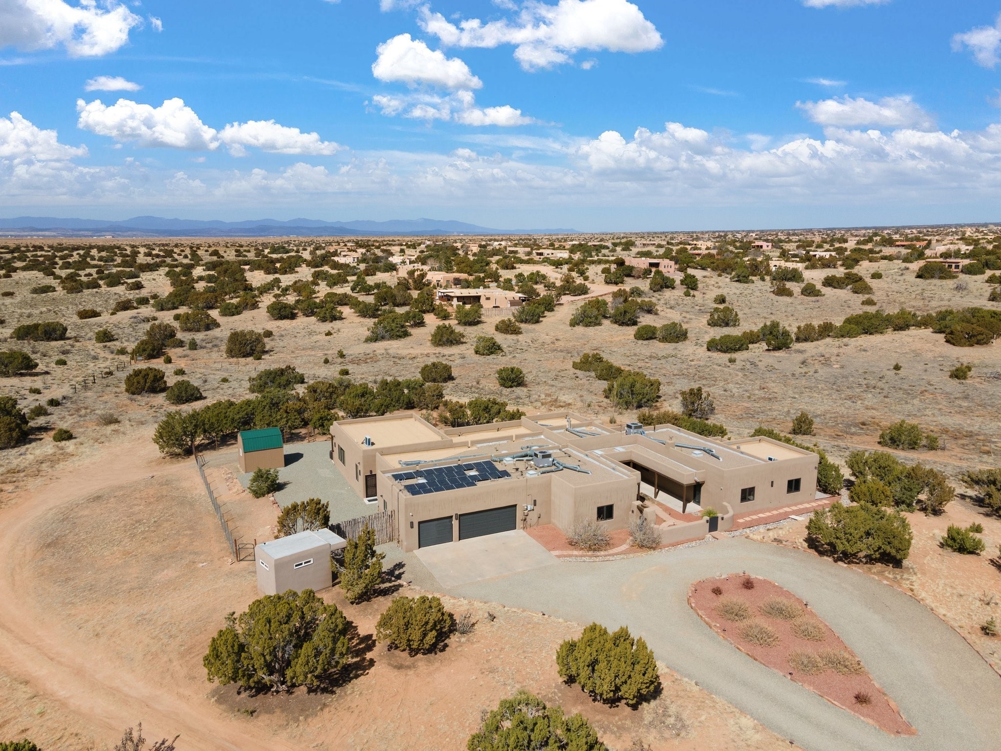 SPECTACULAR ELDORADO ESTATE! Spa living in this extraordinary property with end of the road privacy, mountain views sited on a greenbelt. An endless pool and hot tub have their own room with rain showerhead and room for exercise equipment. In-floor radiant heat with a new HVAC system for back up heating and air conditioning. Generous great room includes dining room and opens to kitchen with Dekton countertops, 2002 stainless appliances, large pantry and an island. Primary wing has library/office with viga ceilings and gas fireplace. Primary bedroom has a private portal and enormous walk-in closet. Primary bath has double sinks, soaking tub and separate shower. Separate guest wing has two bedrooms and a full bath. There is a den/media room off the spa area with a data room for the systems, CAT-6 wifi. Walled front courtyard with covered areas for seating. Fully fenced back yard with large covered portal. California closet systems throughout including kitchen pantry. Solar panels are owned and provide some back up power in the event of an outage.. Large 2.4 acre lot bordering open space with approved RV parking with two areas for hook ups. Proper laundry room with storage and new LG washer/dryer. Approximately 9,000 square feet of fencing. Two sheds, both with electricity. Whole house water filtration. New windows and doors throughout. Three-car finished garage. LIST OF UPGRAGES IN SUPPLEMENTS.