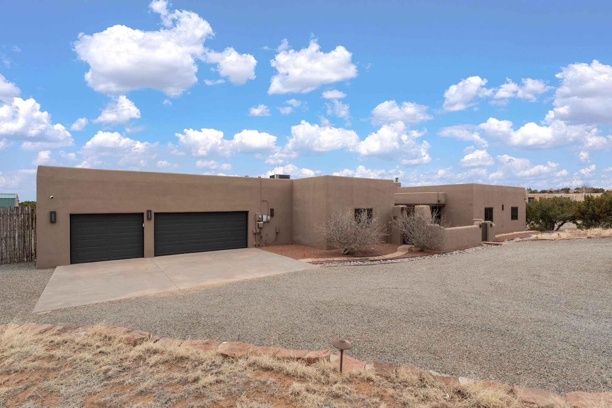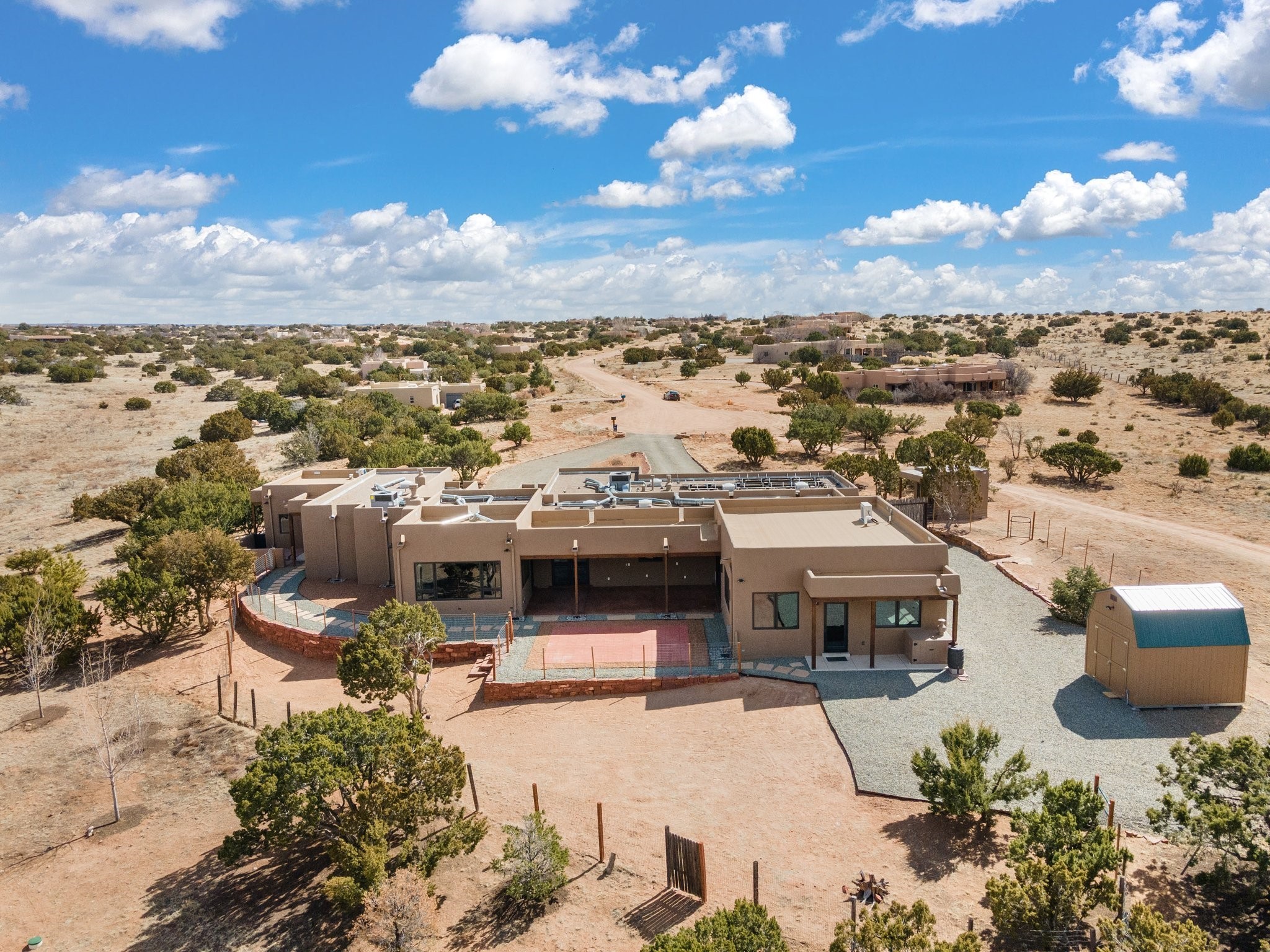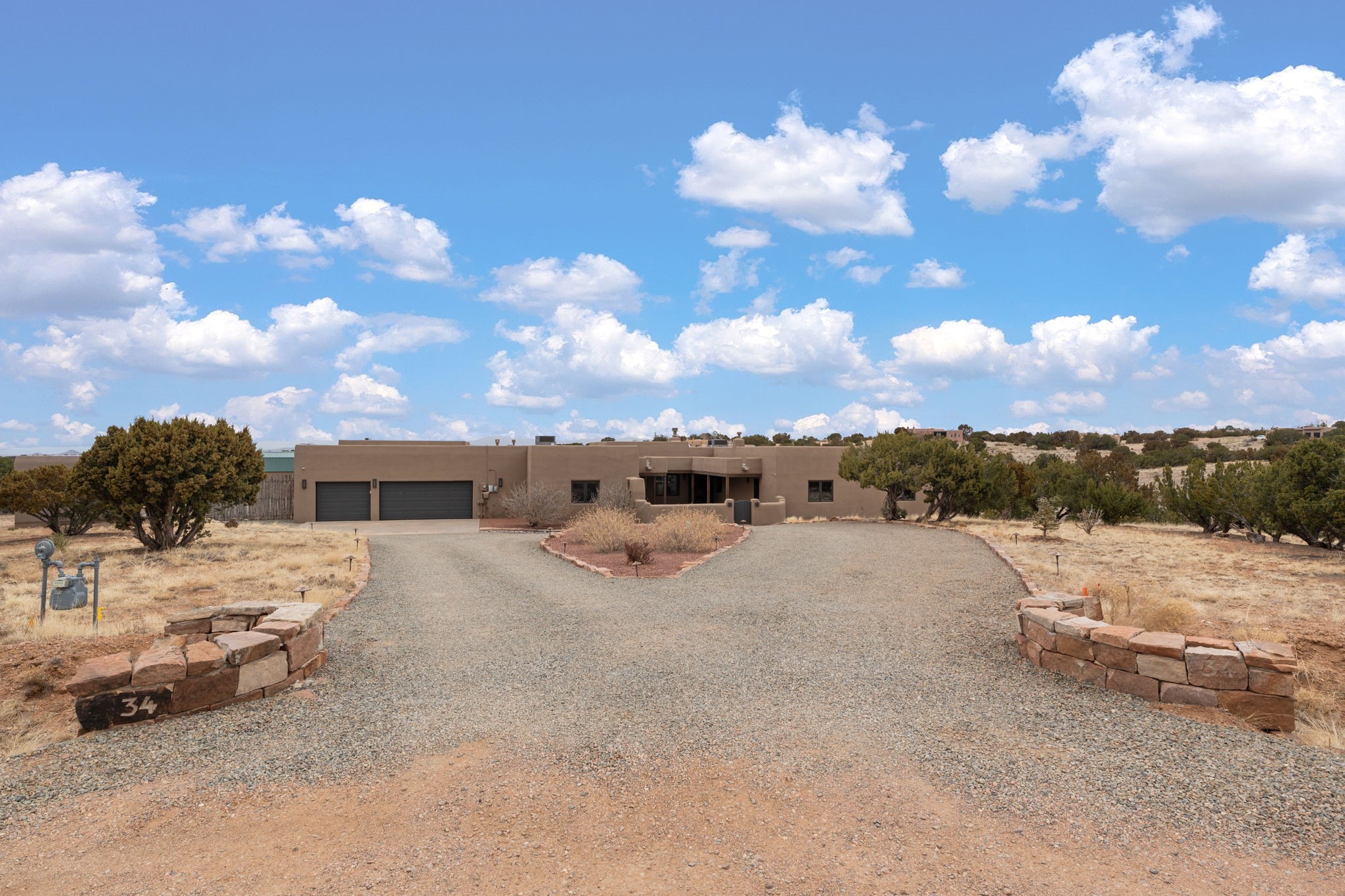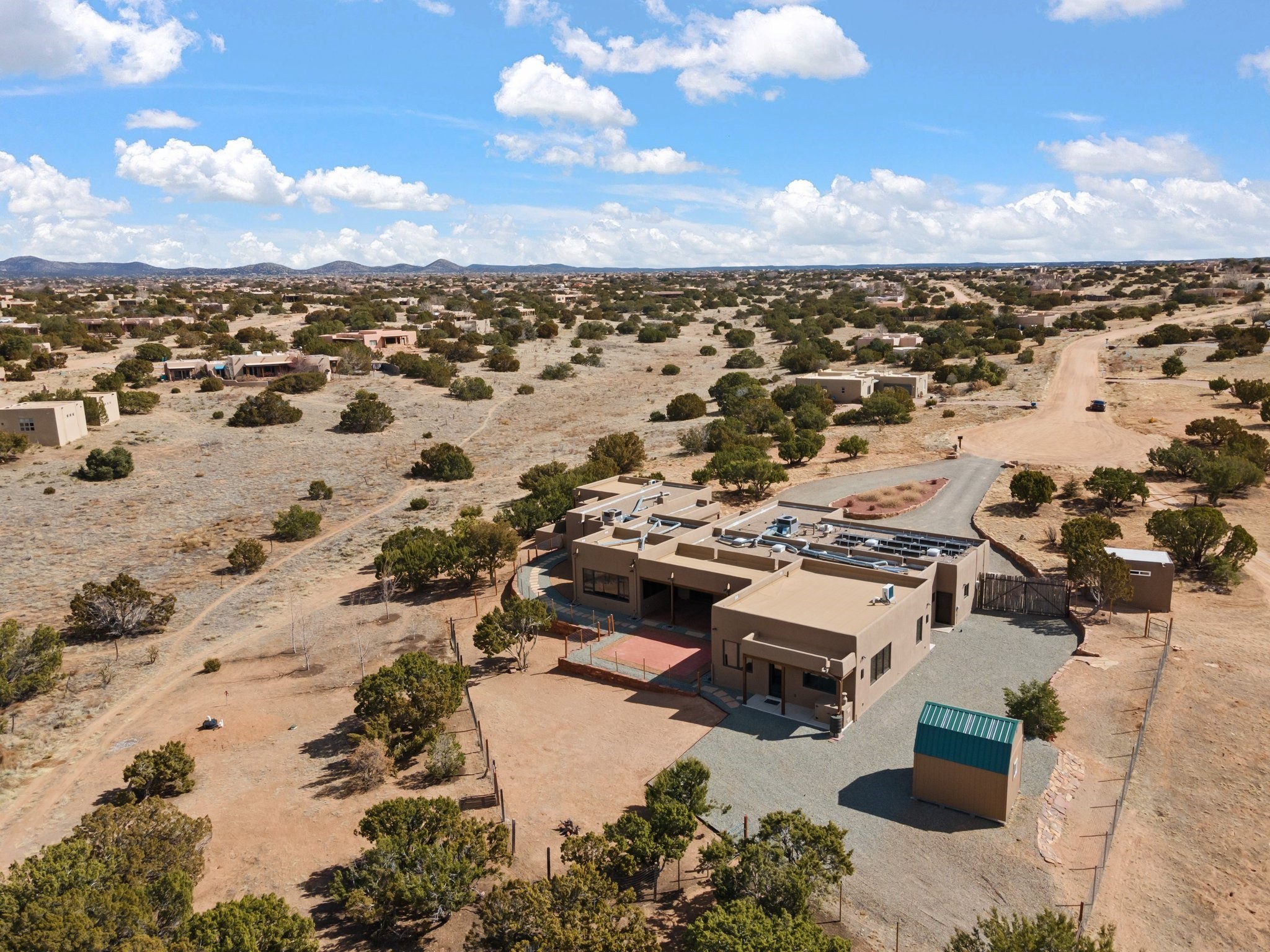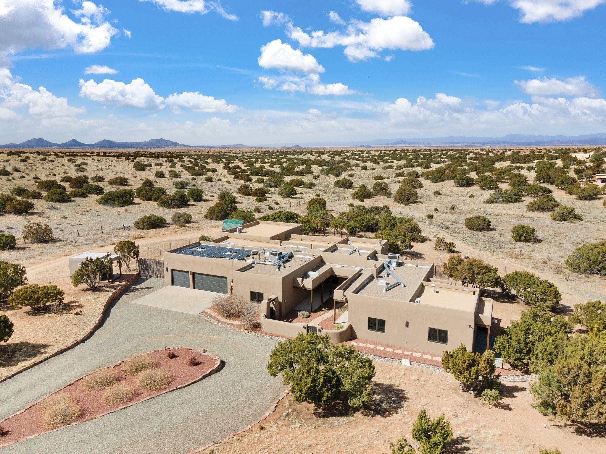 SPECTACULAR ELDORADO ESTATE! Spa living in this extraordinary property with end of the road privacy, mountain views sited on a greenbelt. An endless pool and hot tub have their own room with rain showerhead and room for exercise equipment. In-floor radiant heat with a new HVAC system for back up heating and air conditioning. Generous great room includes dining room and opens to kitchen with Dekton countertops, 2002 stainless appliances, large pantry and an island. Primary wing has library/office with viga ceilings and gas fireplace. Primary bedroom has a private portal and enormous walk-in closet. Primary bath has double sinks, soaking tub and separate shower. Separate guest wing has two bedrooms and a full bath. There is a den/media room off the spa area with a data room for the systems, CAT-6 wifi. Walled front courtyard with covered areas for seating. Fully fenced back yard with large covered portal. California closet systems throughout including kitchen pantry. Solar panels are owned and provide some back up power in the event of an outage.. Large 2.4 acre lot bordering open space with approved RV parking with two areas for hook ups. Proper laundry room with storage and new LG washer/dryer. Approximately 9,000 square feet of fencing. Two sheds, both with electricity. Whole house water filtration. New windows and doors throughout. Three-car finished garage. LIST OF UPGRAGES IN SUPPLEMENTS.