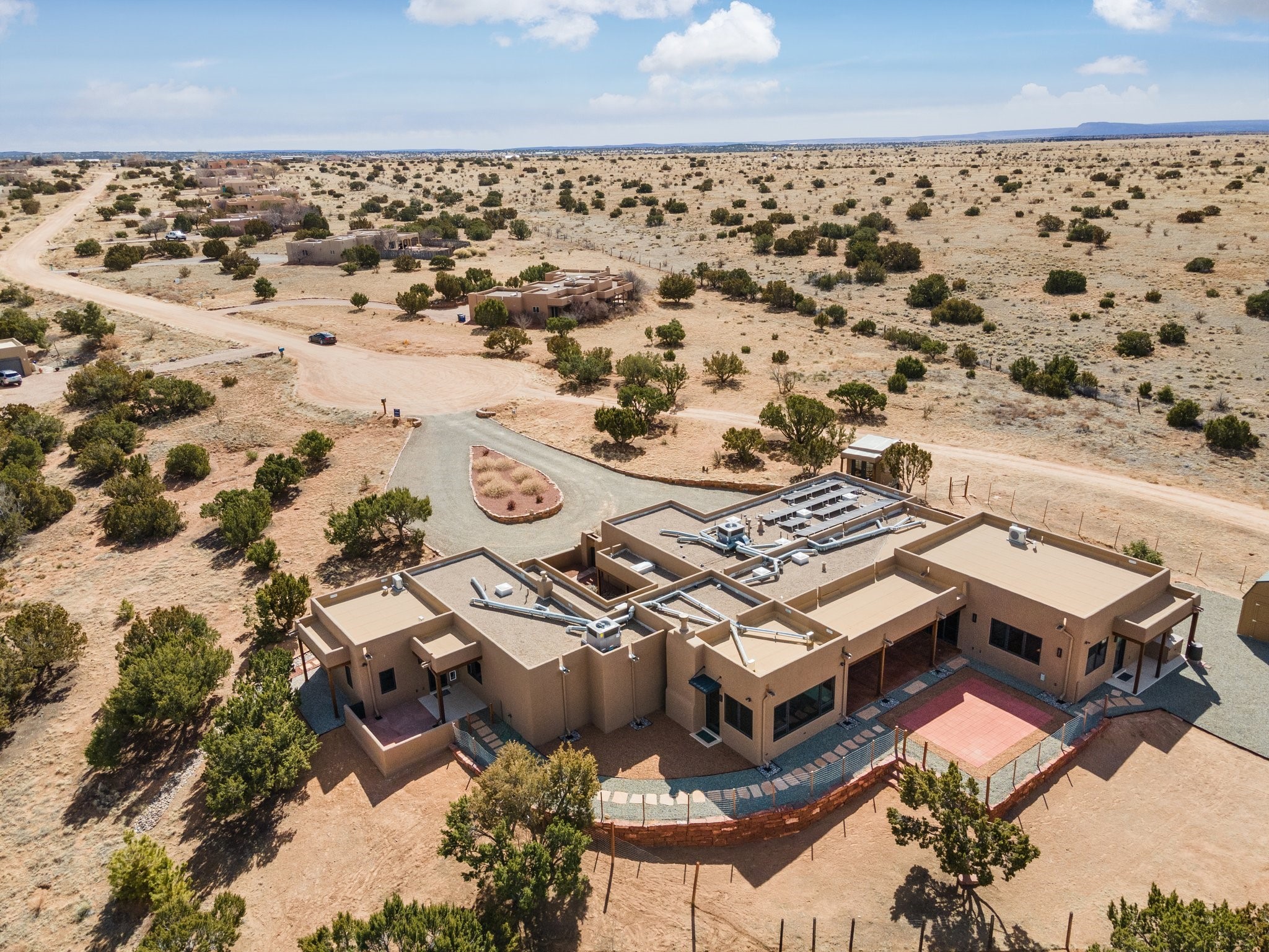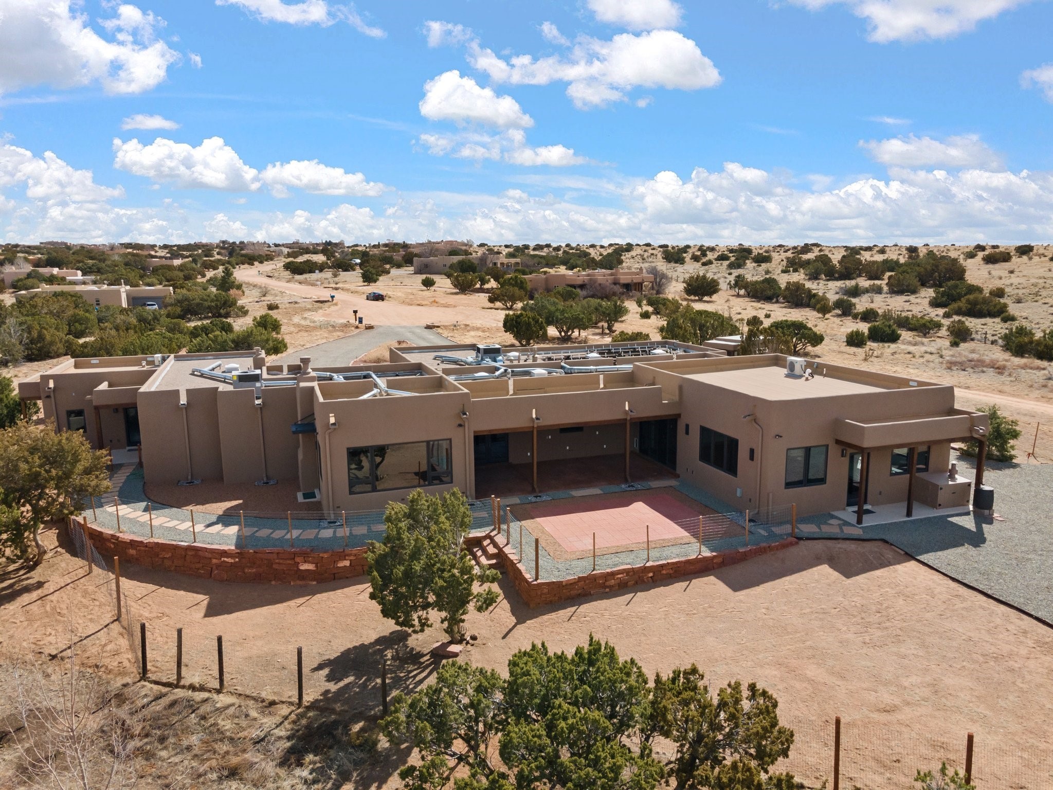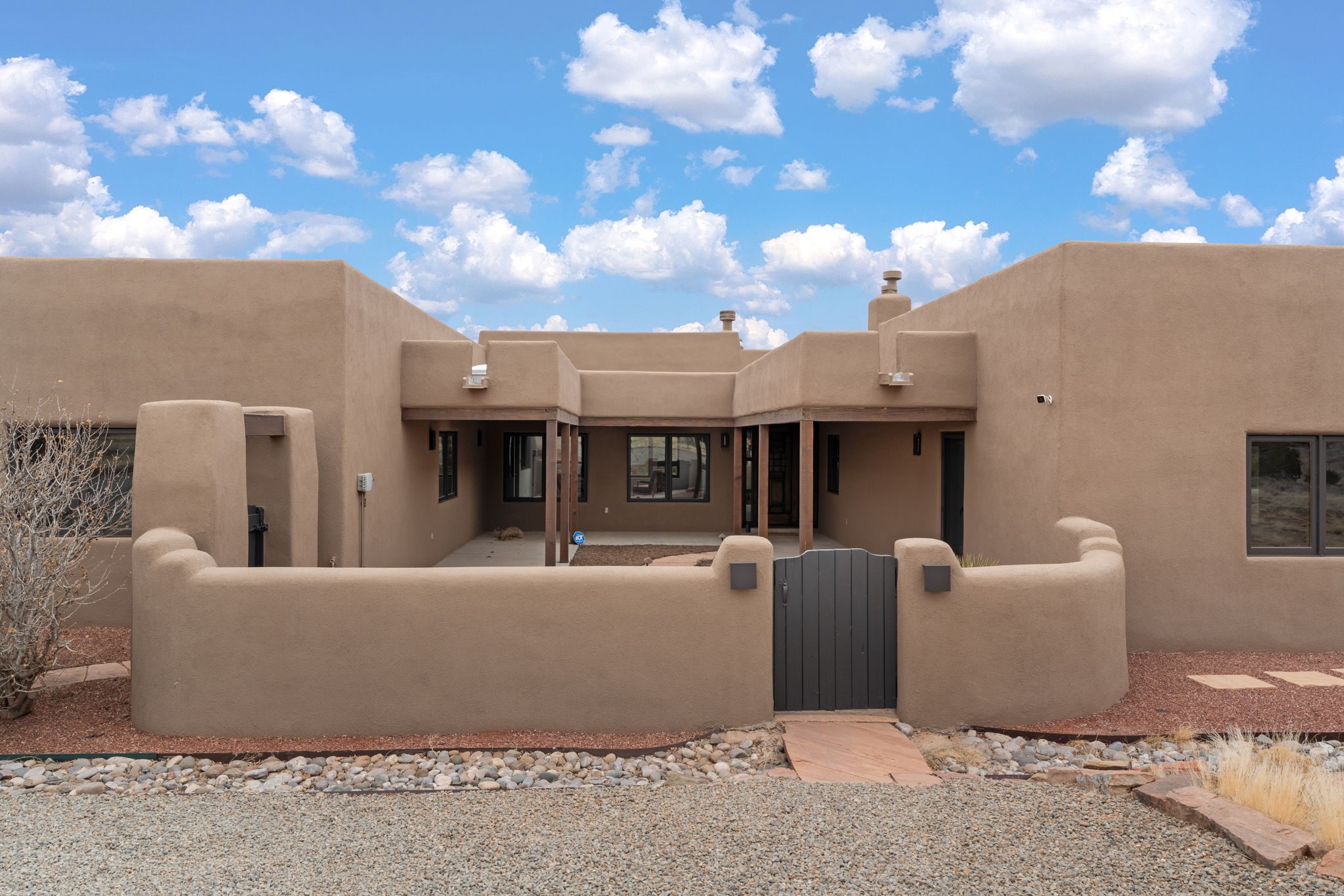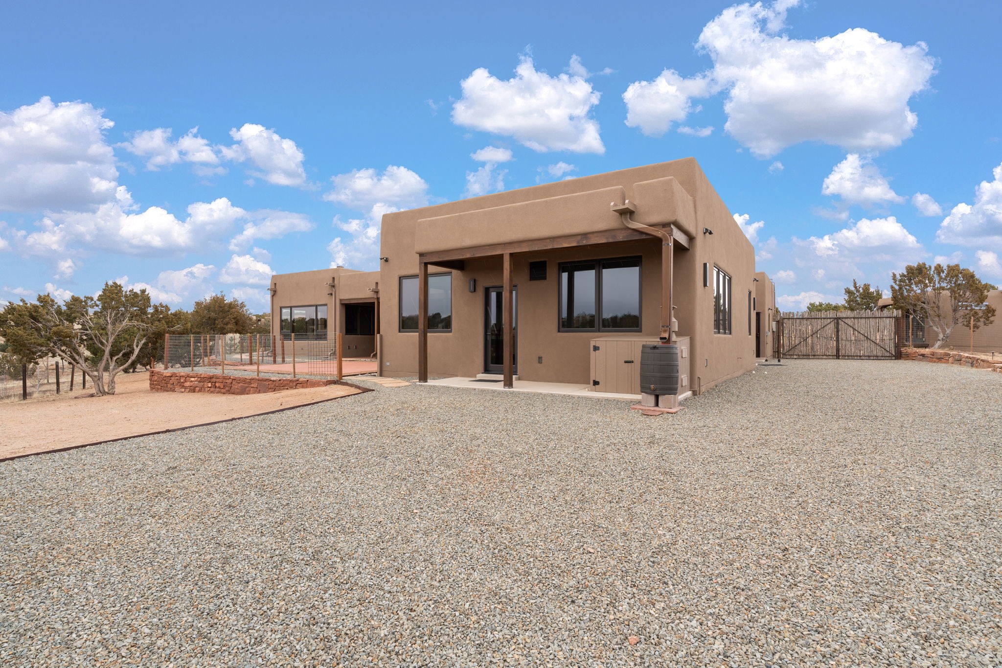 SPECTACULAR ELDORADO ESTATE! Spa living in this extraordinary property with end of the road privacy, mountain views sited on a greenbelt. An endless pool and hot tub have their own room with rain showerhead and room for exercise equipment. In-floor radiant heat with a new HVAC system for back up heating and air conditioning. Generous great room includes dining room and opens to kitchen with Dekton countertops, 2002 stainless appliances, large pantry and an island. Primary wing has library/office with viga ceilings and gas fireplace. Primary bedroom has a private portal and enormous walk-in closet. Primary bath has double sinks, soaking tub and separate shower. Separate guest wing has two bedrooms and a full bath. There is a den/media room off the spa area with a data room for the systems, CAT-6 wifi. Walled front courtyard with covered areas for seating. Fully fenced back yard with large covered portal. California closet systems throughout including kitchen pantry. Solar panels are owned and provide some back up power in the event of an outage.. Large 2.4 acre lot bordering open space with approved RV parking with two areas for hook ups. Proper laundry room with storage and new LG washer/dryer. Approximately 9,000 square feet of fencing. Two sheds, both with electricity. Whole house water filtration. New windows and doors throughout. Three-car finished garage. LIST OF UPGRAGES IN SUPPLEMENTS.
