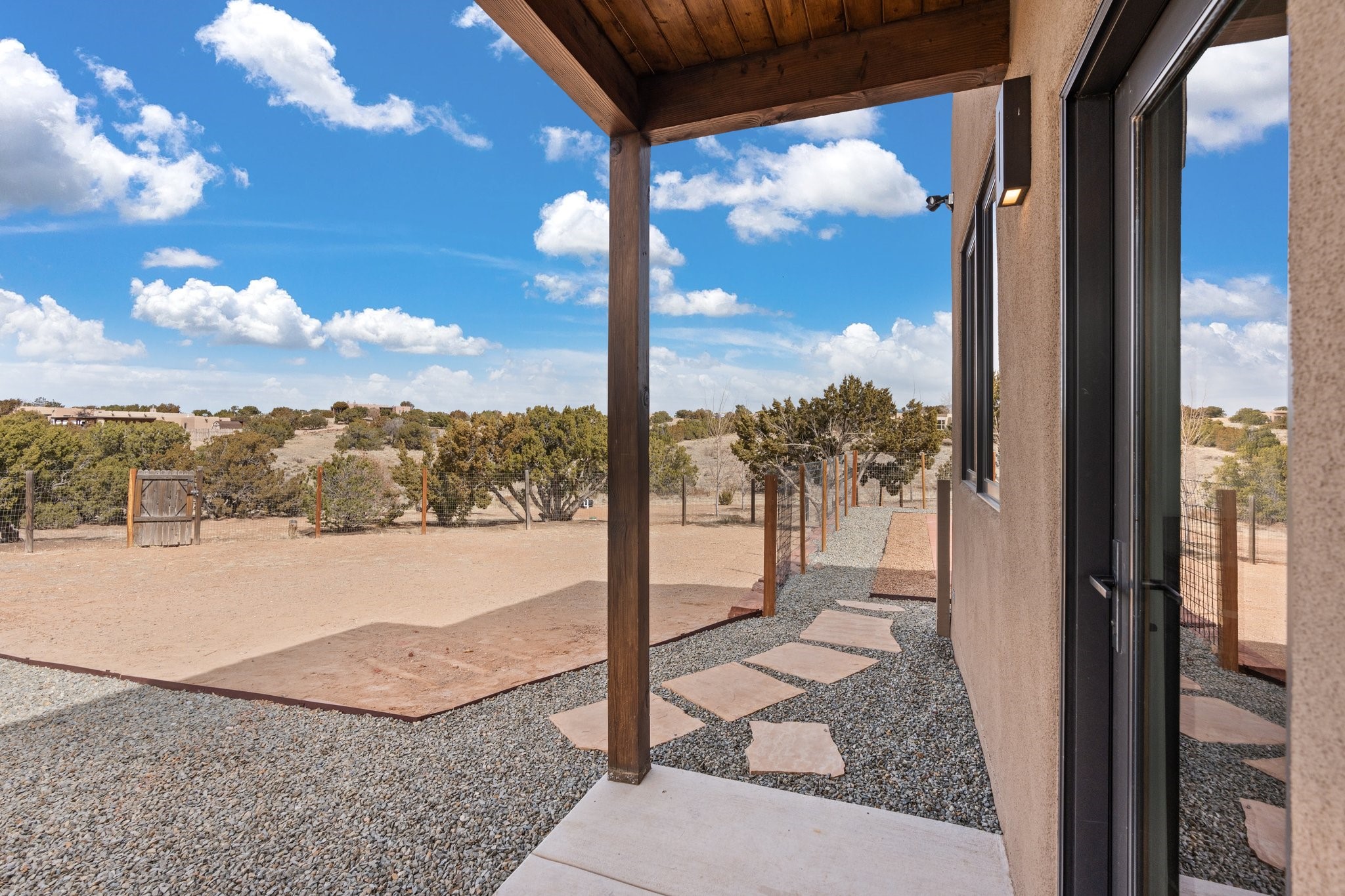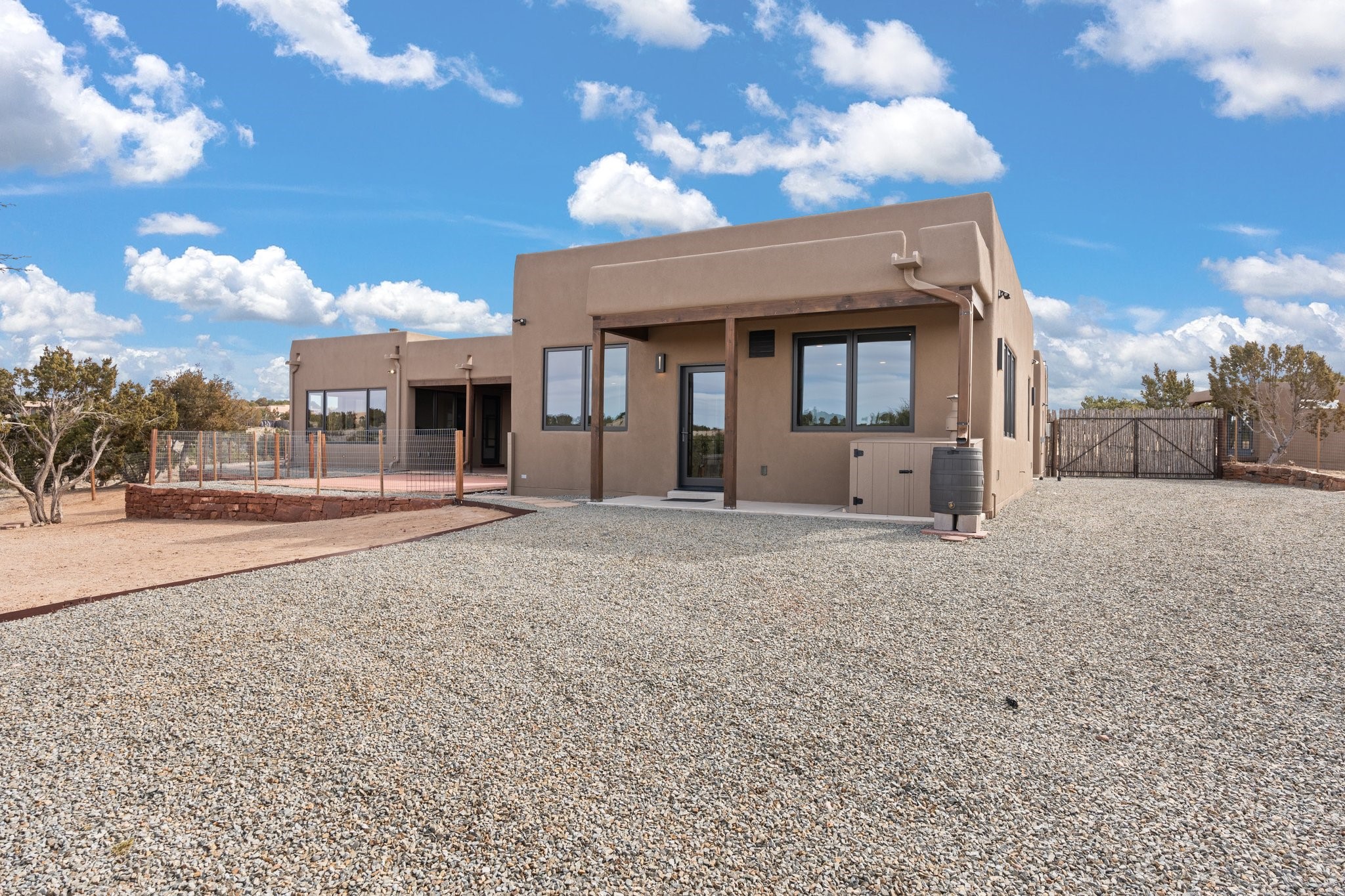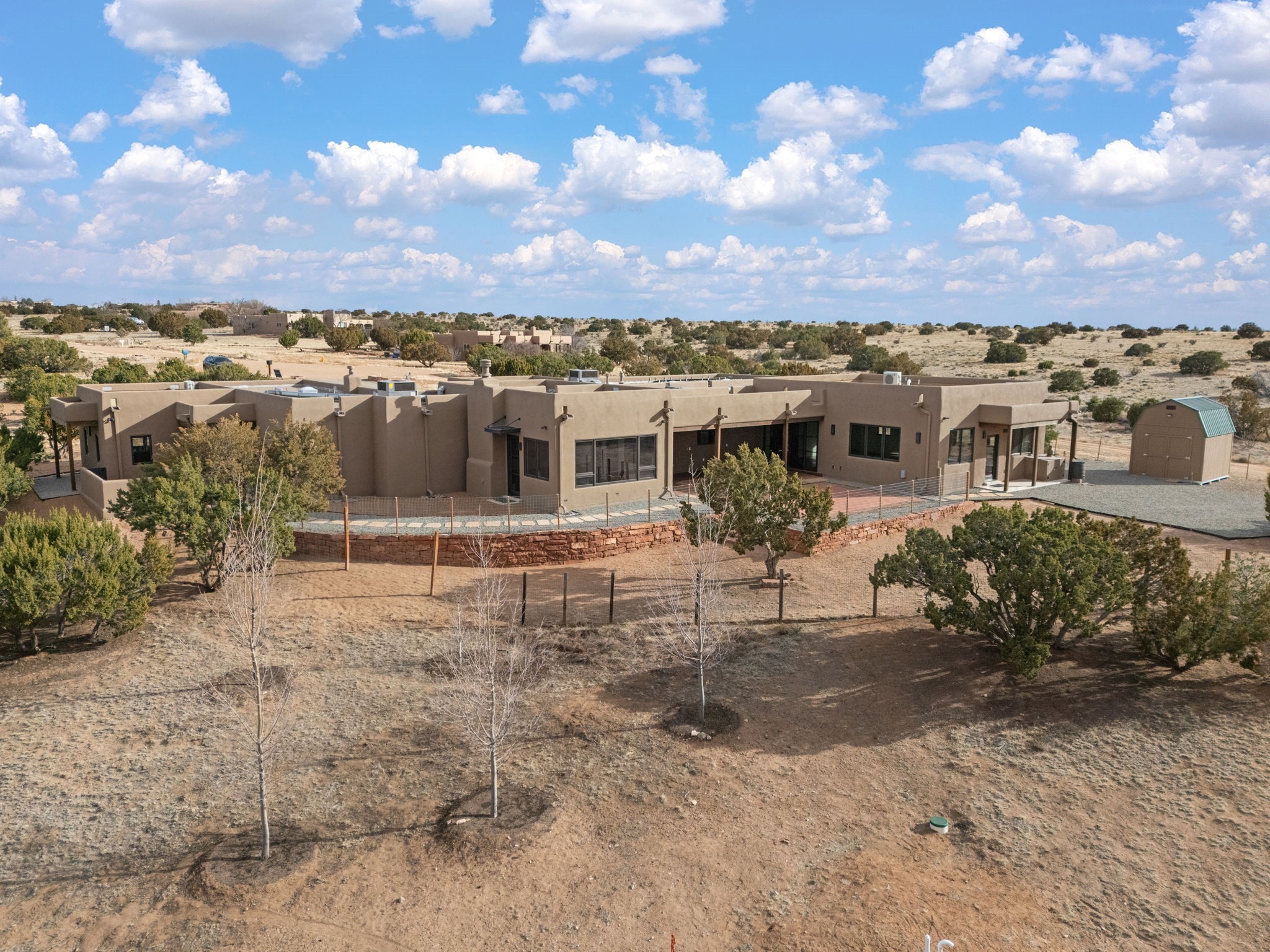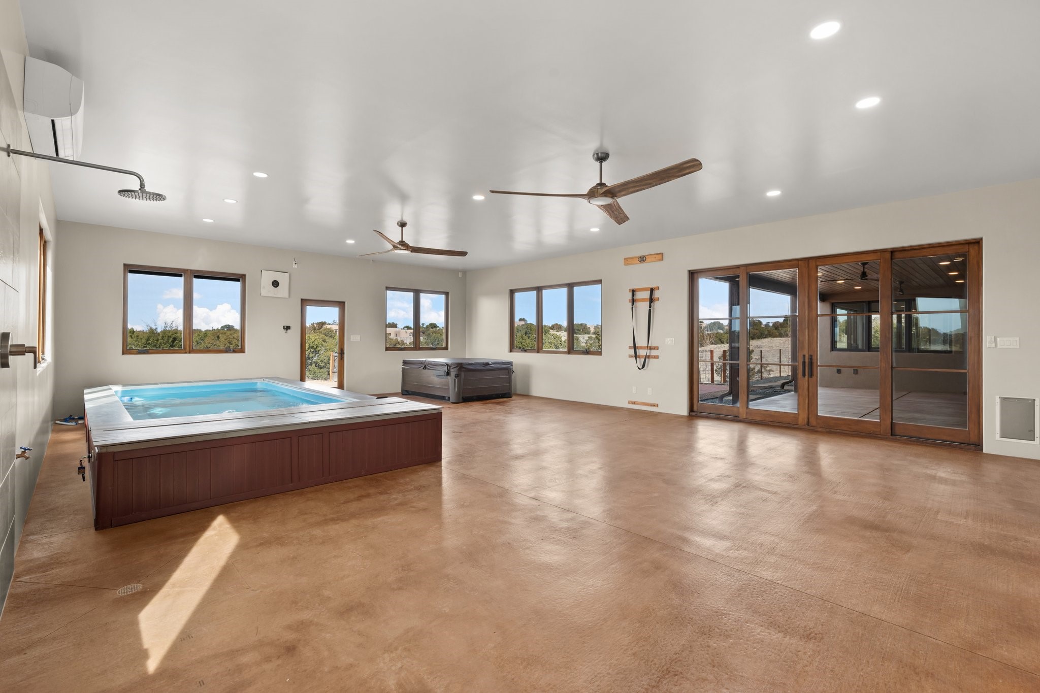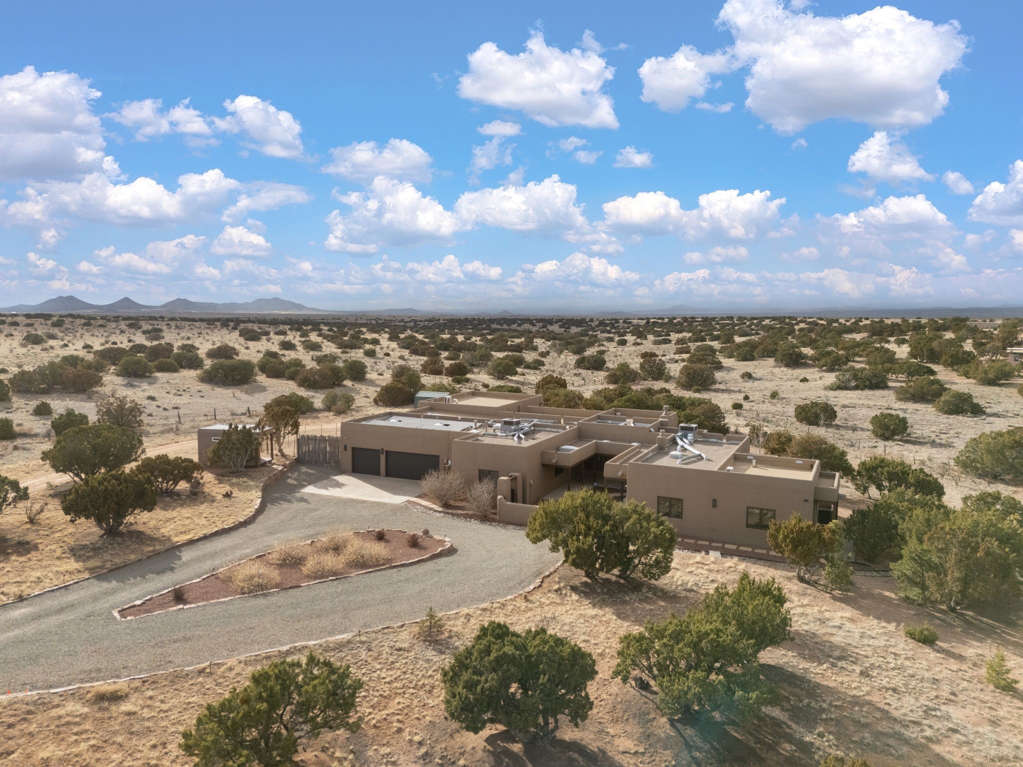 SPECTACULAR ELDORADO ESTATE! Spa living in this extraordinary property with end of the road privacy, mountain views sited on a greenbelt. An endless pool and hot tub have their own room with rain showerhead and room for exercise equipment. In-floor radiant heat with a new HVAC system for back up heating and air conditioning. Generous great room includes dining room and opens to kitchen with Dekton countertops, 2002 stainless appliances, large pantry and an island. Primary wing has library/office with viga ceilings and gas fireplace. Primary bedroom has a private portal and enormous walk-in closet. Primary bath has double sinks, soaking tub and separate shower. Separate guest wing has two bedrooms and a full bath. There is a den/media room off the spa area with a data room for the systems, CAT-6 wifi. Walled front courtyard with covered areas for seating. Fully fenced back yard with large covered portal. California closet systems throughout including kitchen pantry. Solar panels are owned and provide some back up power in the event of an outage.. Large 2.4 acre lot bordering open space with approved RV parking with two areas for hook ups. Proper laundry room with storage and new LG washer/dryer. Approximately 9,000 square feet of fencing. Two sheds, both with electricity. Whole house water filtration. New windows and doors throughout. Three-car finished garage. LIST OF UPGRAGES IN SUPPLEMENTS.